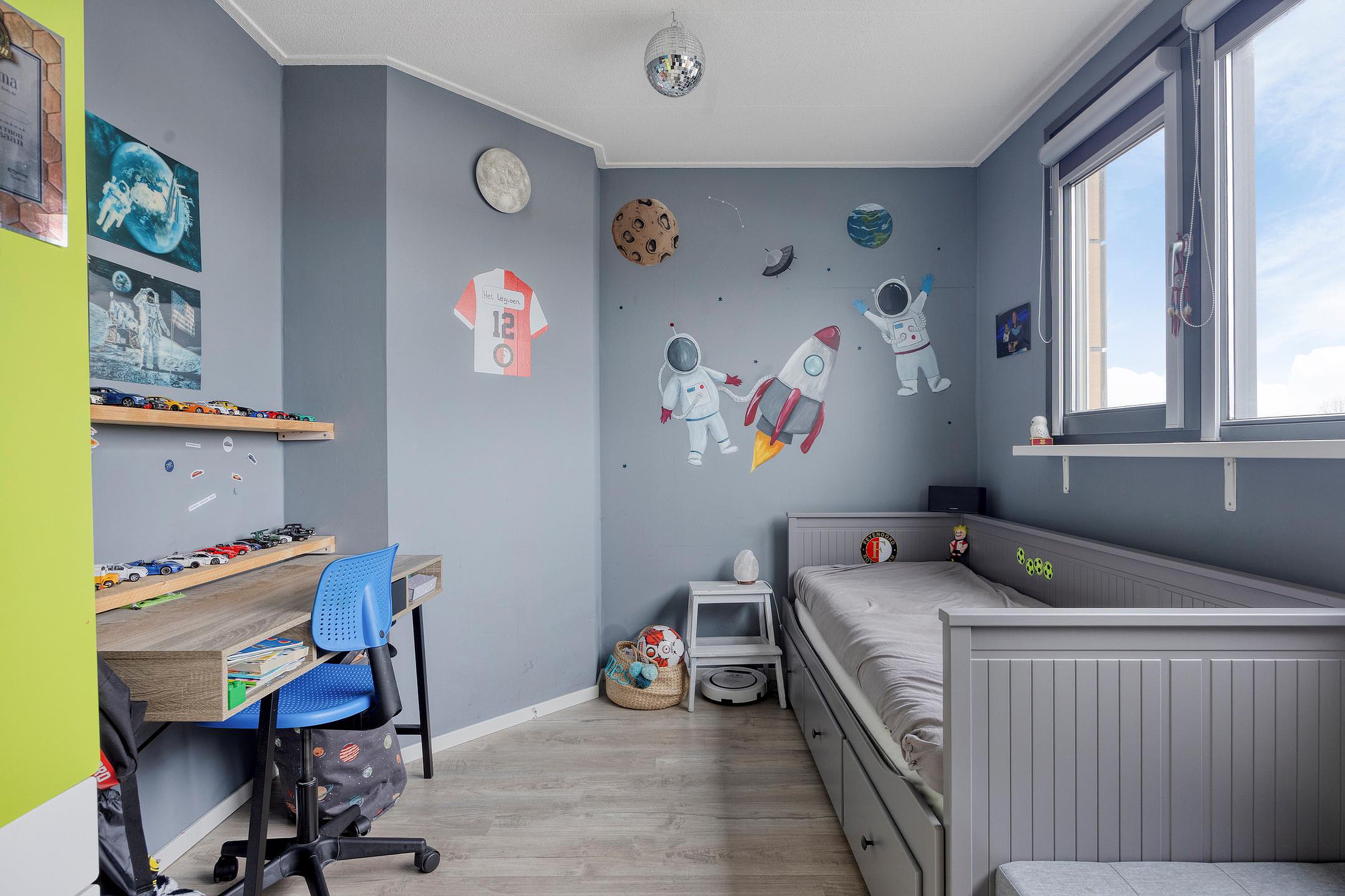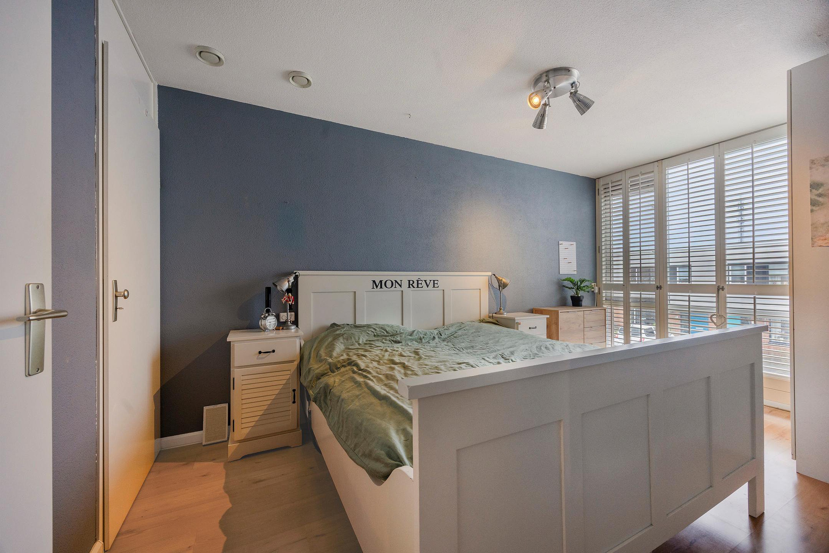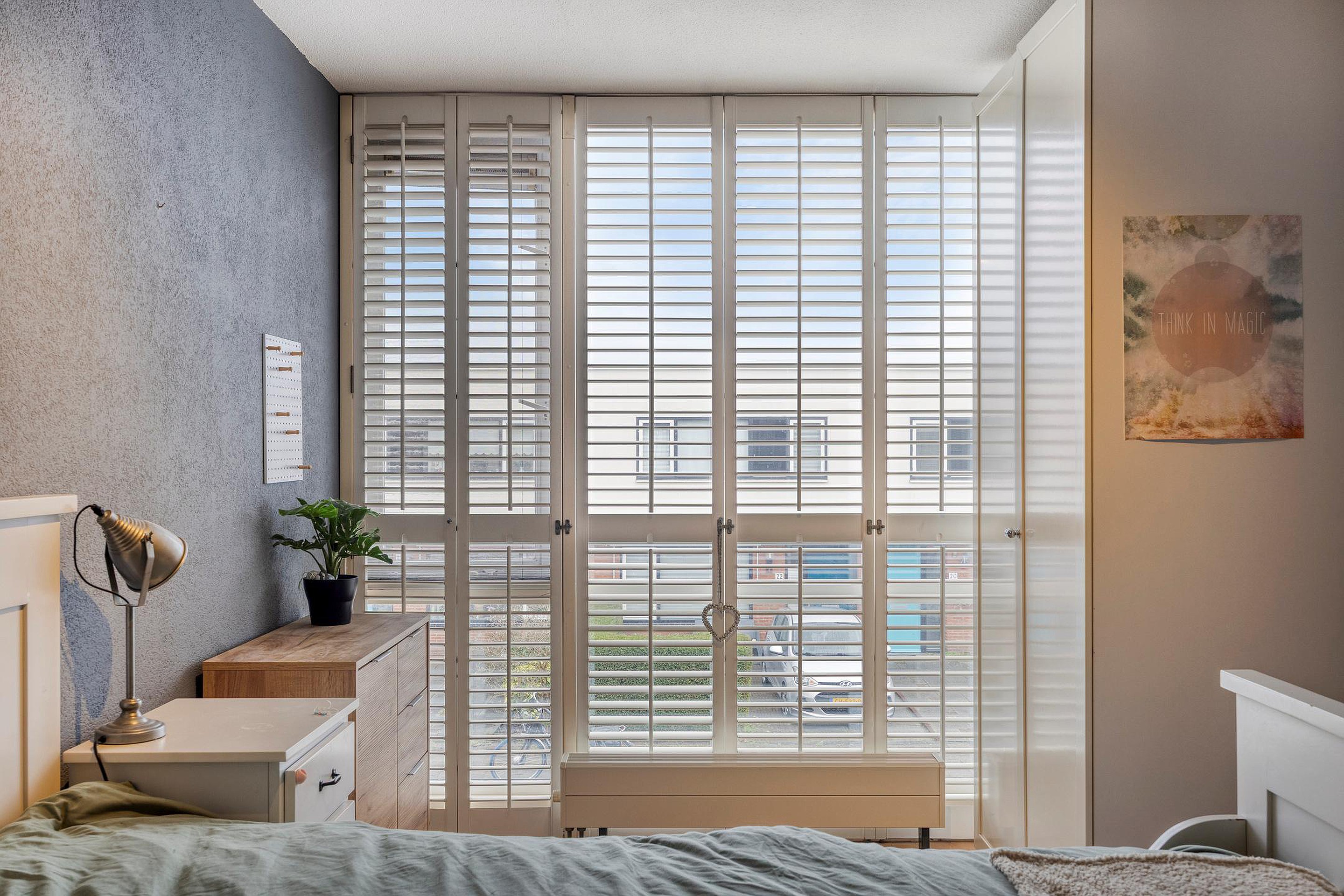 Op de eerste verdieping bevinden zich vier slaapkamers. Aan de voorzijde liggen twee slaapkamers, waarvan één is voorzien van een vaste kast met daarin de cv-ketel (2017), WTW-installatie en mechanische ventilatie. Aan de achterzijde bevinden zich nog twee slaapkamers, beide uitgerust met rolluiken.