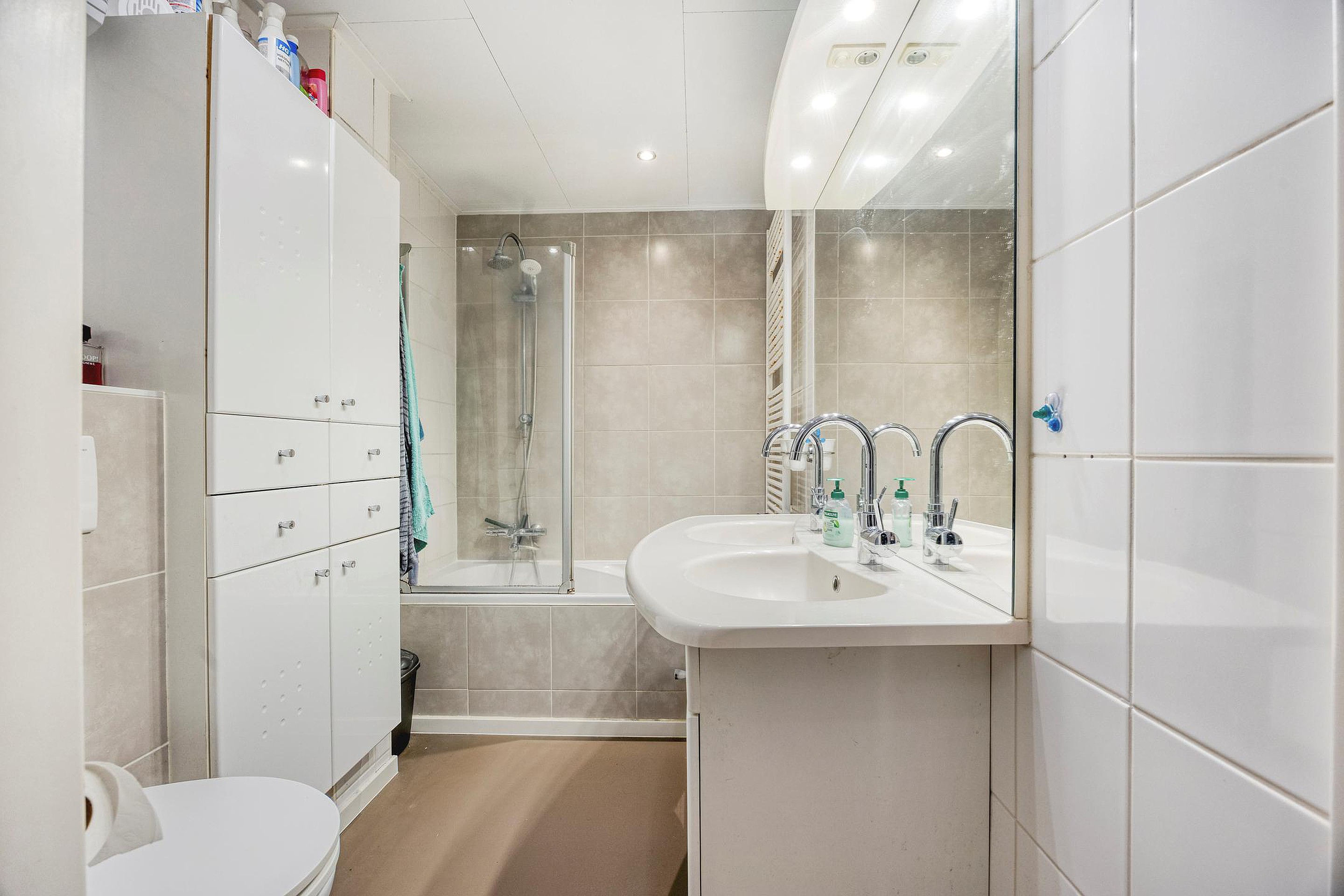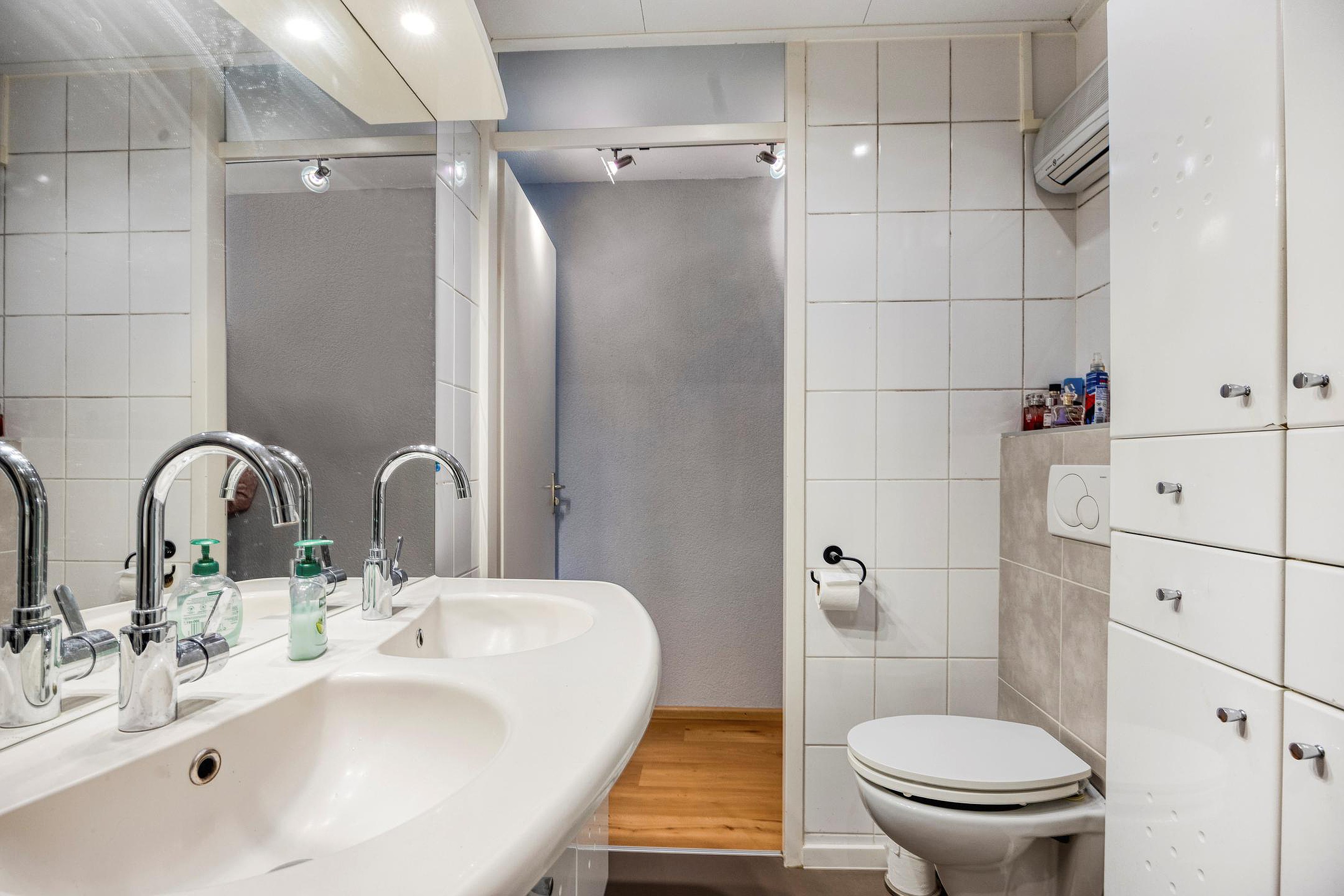 Op de overloop is een vaste kast aanwezig met aansluiting voor de wasmachine en bergruimte. De badkamer is compleet uitgevoerd met een ligbad, dubbele wastafel en toilet.