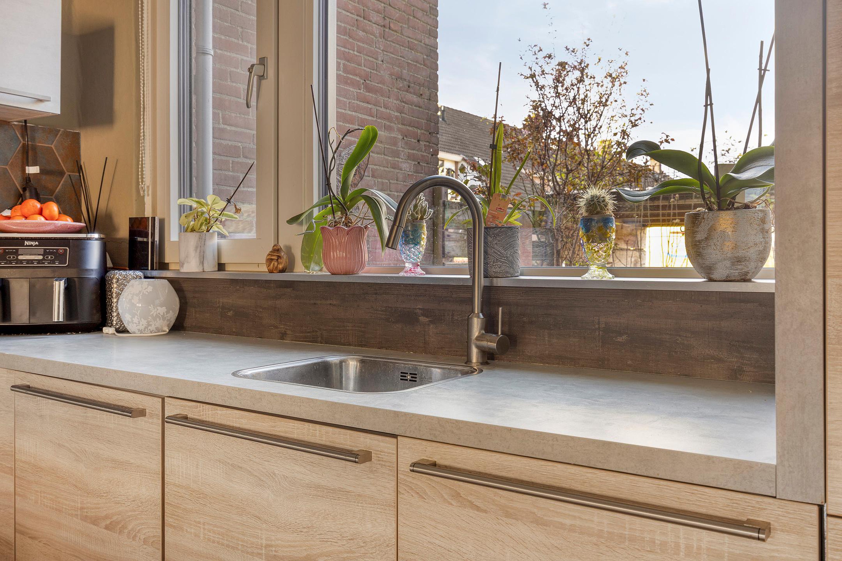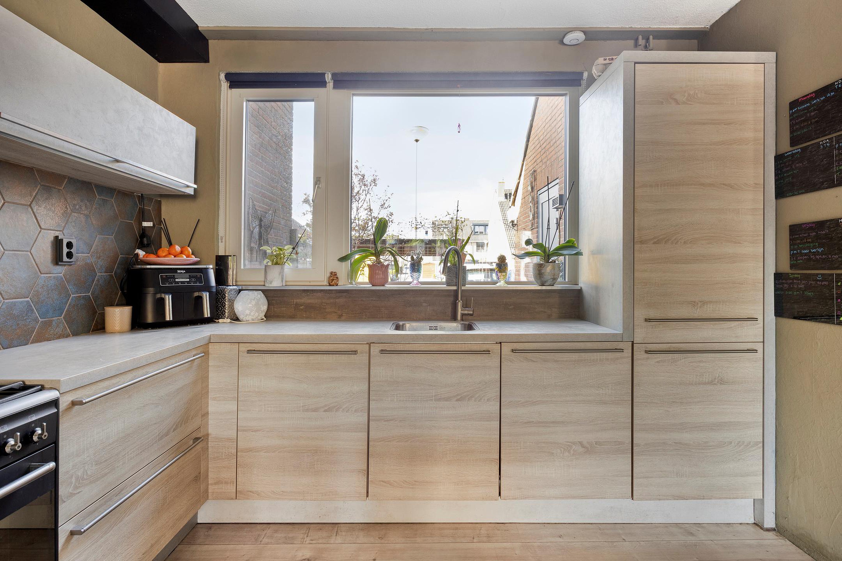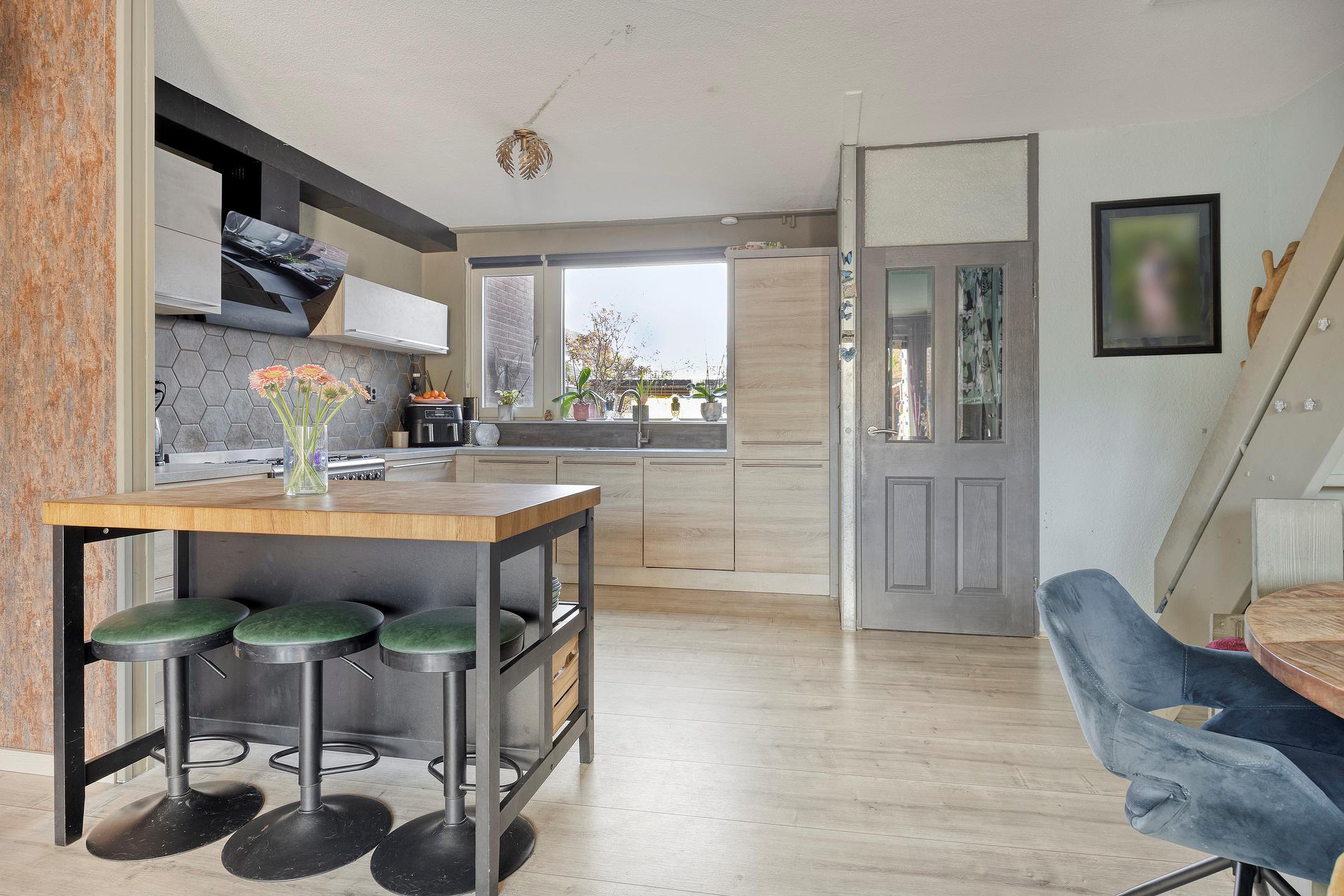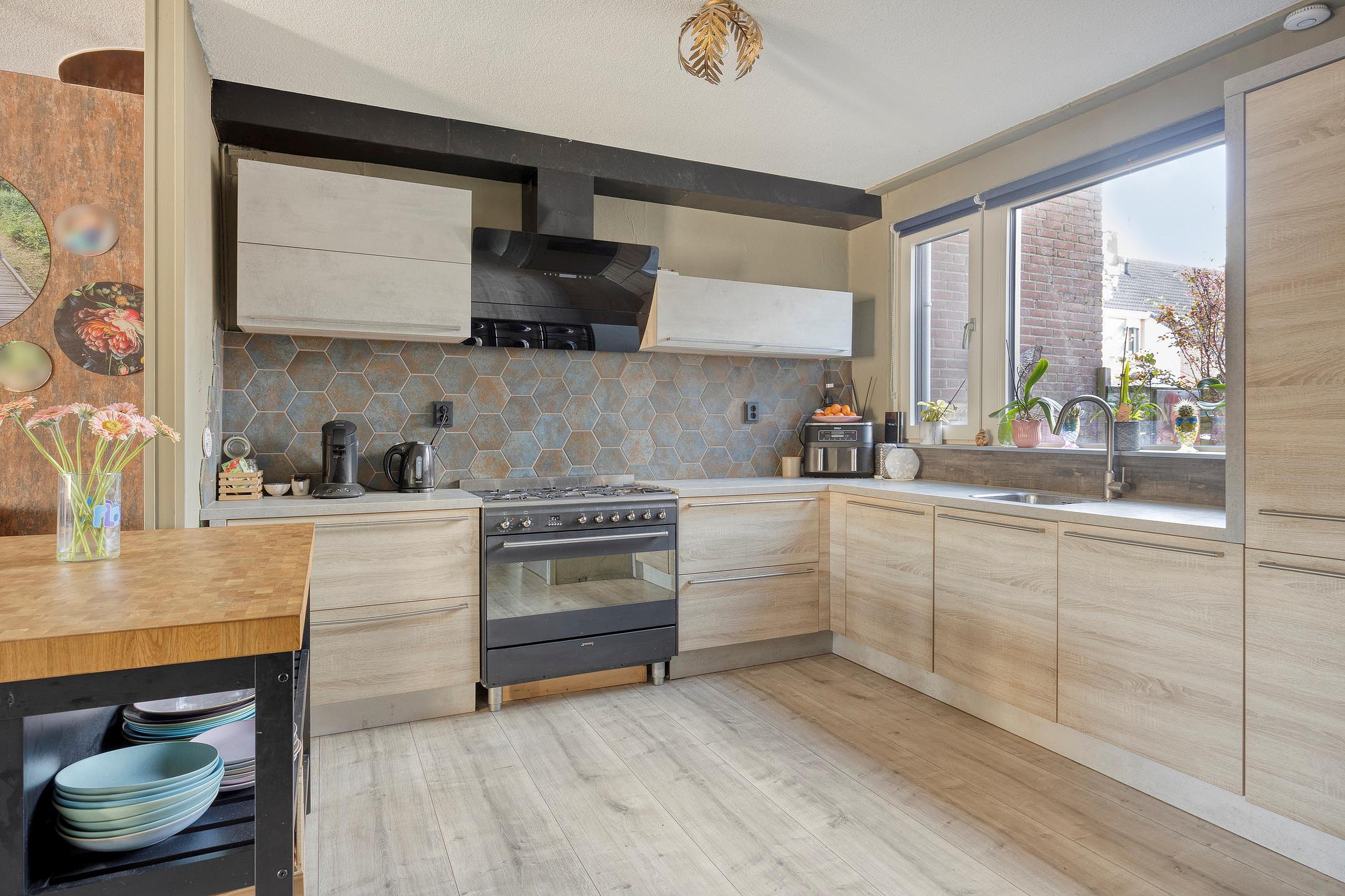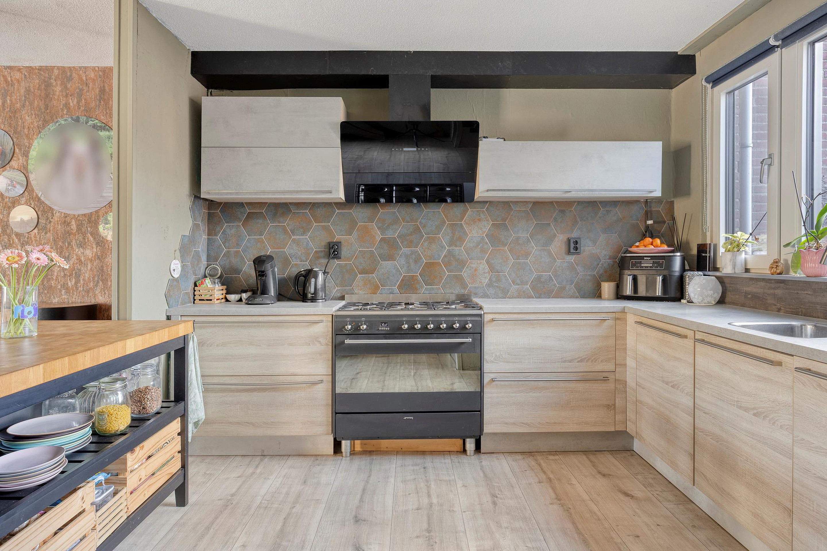 Aan de voorzijde bevindt zich de open keuken met baropstelling, uitgerust met diverse inbouwapparatuur, waaronder een koel-vriescombinatie, vaatwasser, oven, 5-pits gaskookplaat en afzuigkap.