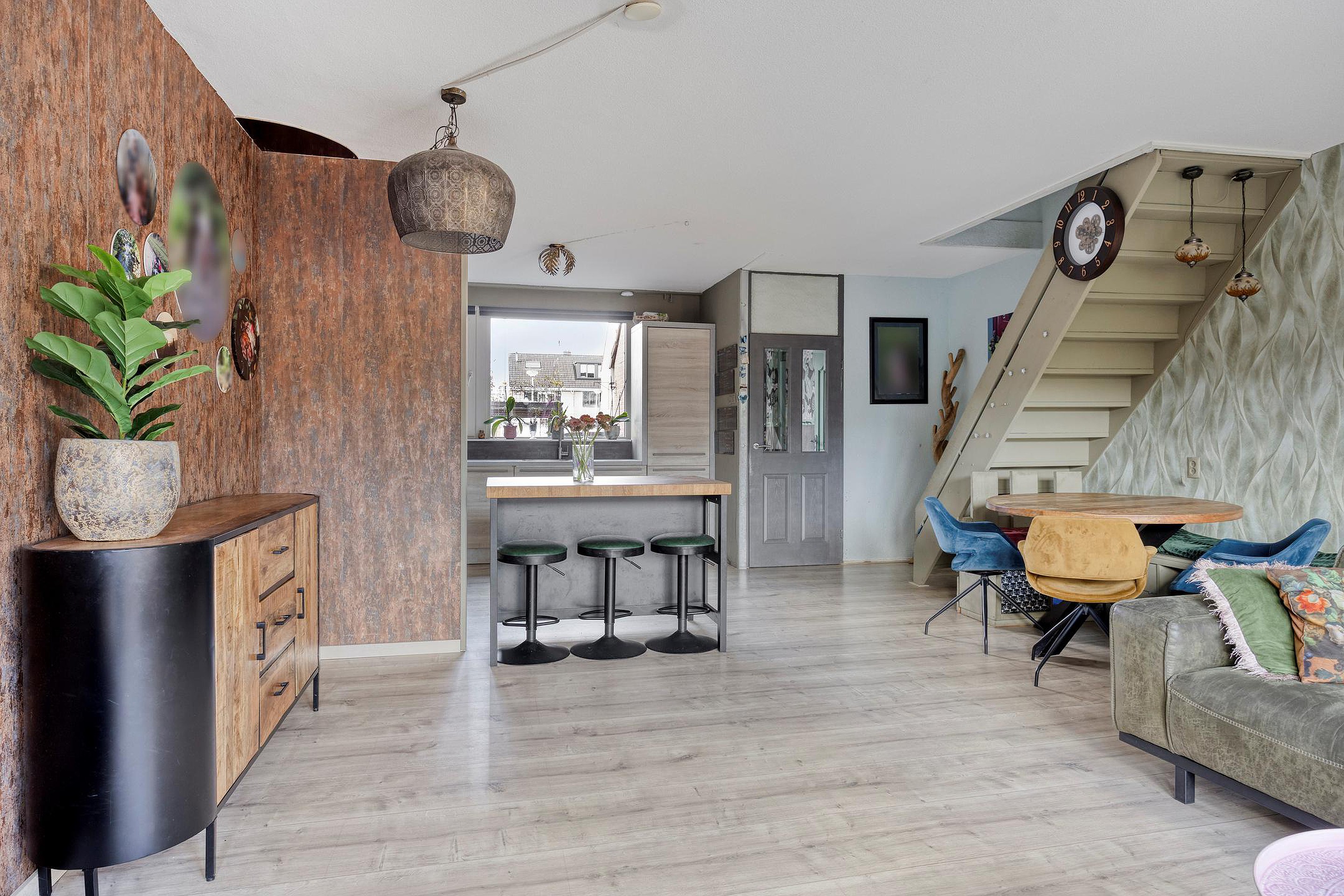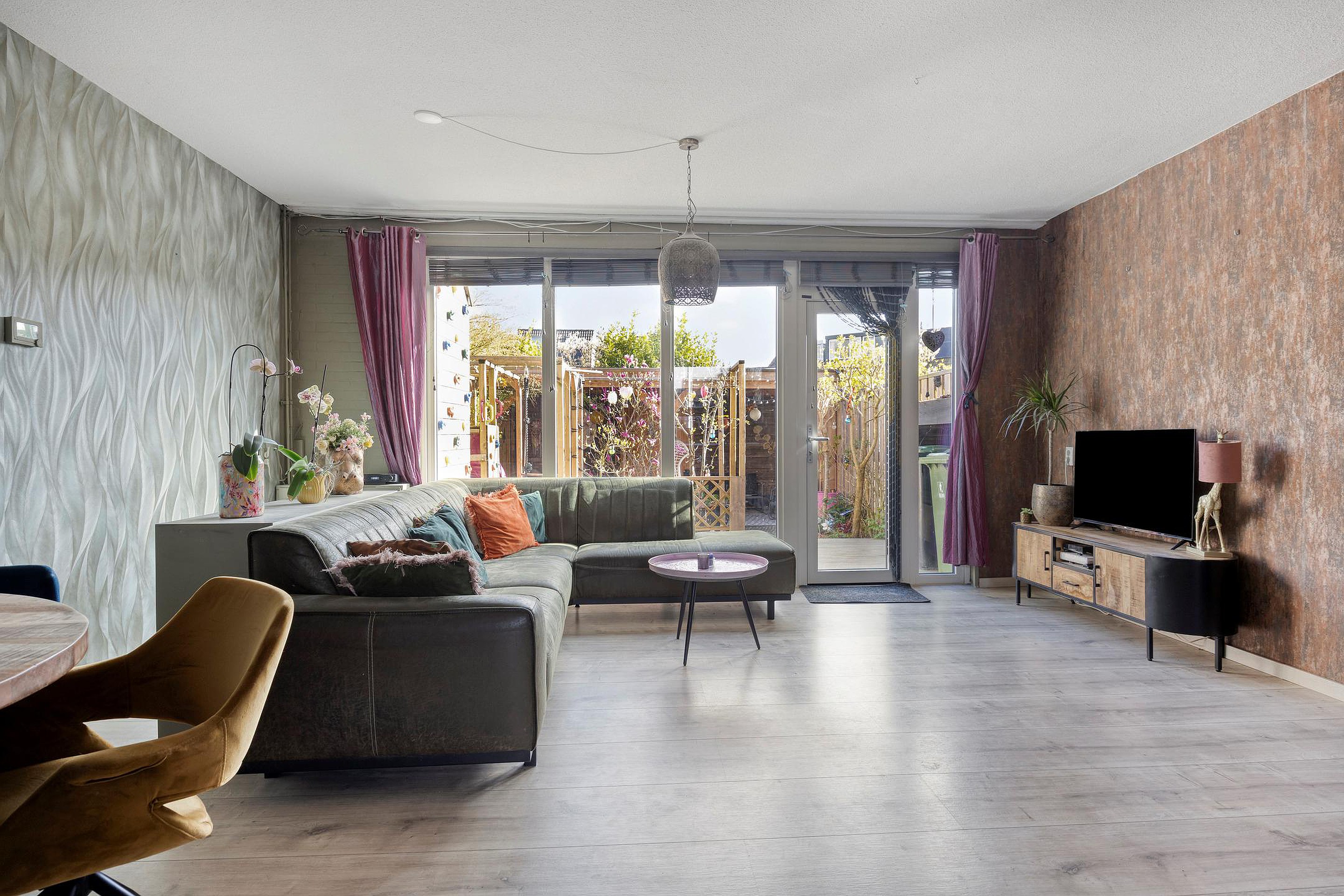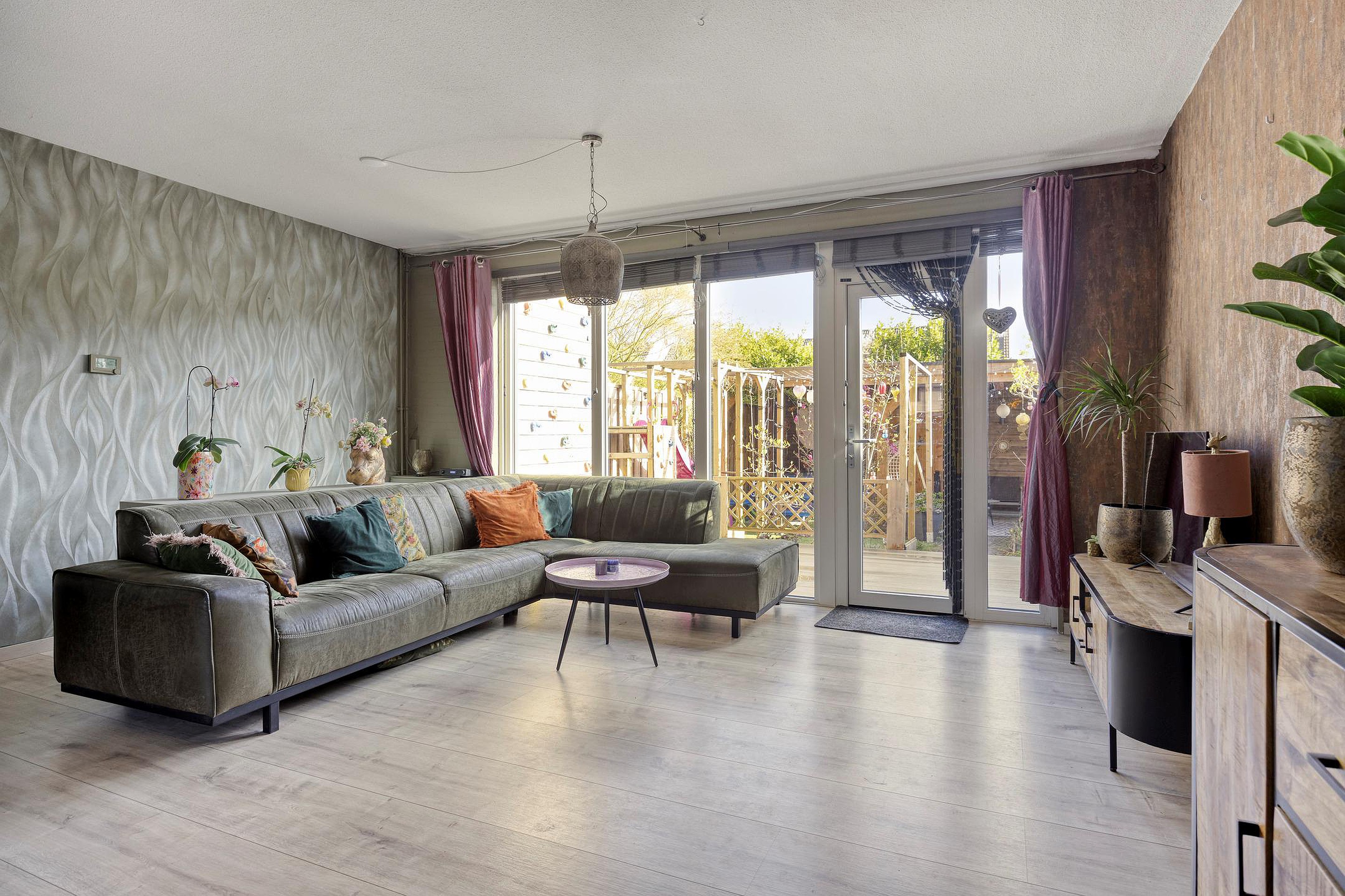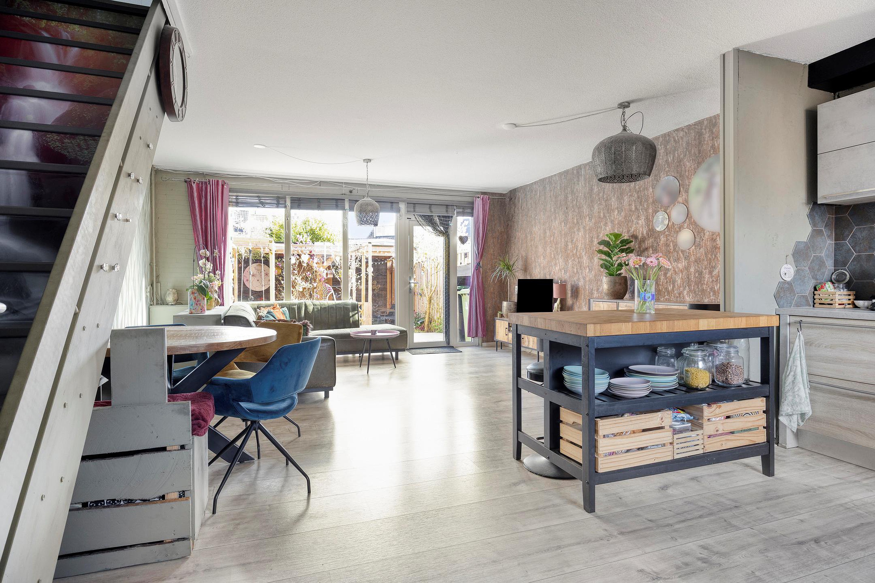 De woonkamer bevindt zich, kenmerkend voor dit type woning, aan de achterzijde, wat zorgt voor een ruime en lichte leefruimte met direct contact met de tuin. De woonkamer is voorzien van een laminaatvloer met comfortabele vloerverwarming en een deur naar de tuin. Dankzij de open doorkijk naar de voorzijde en het vrije zicht aan de achterzijde voelt de ruimte extra licht en ruim aan.