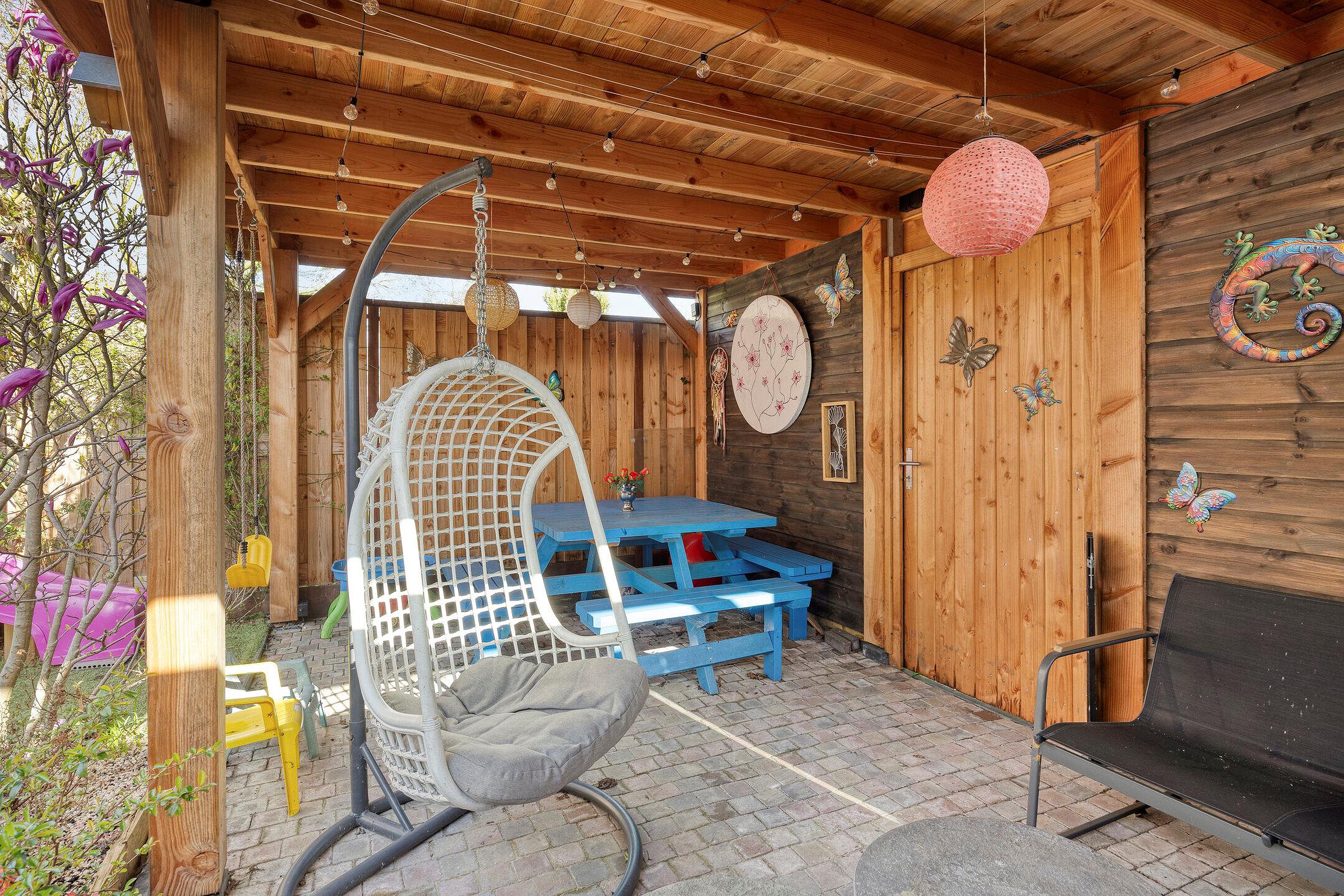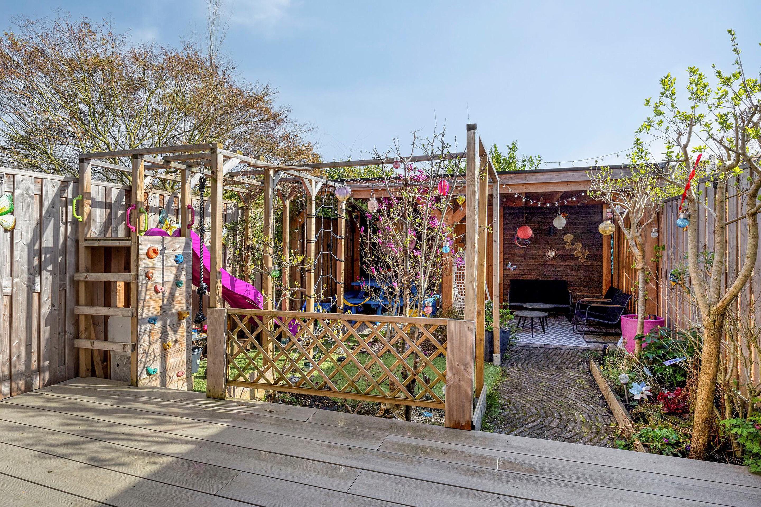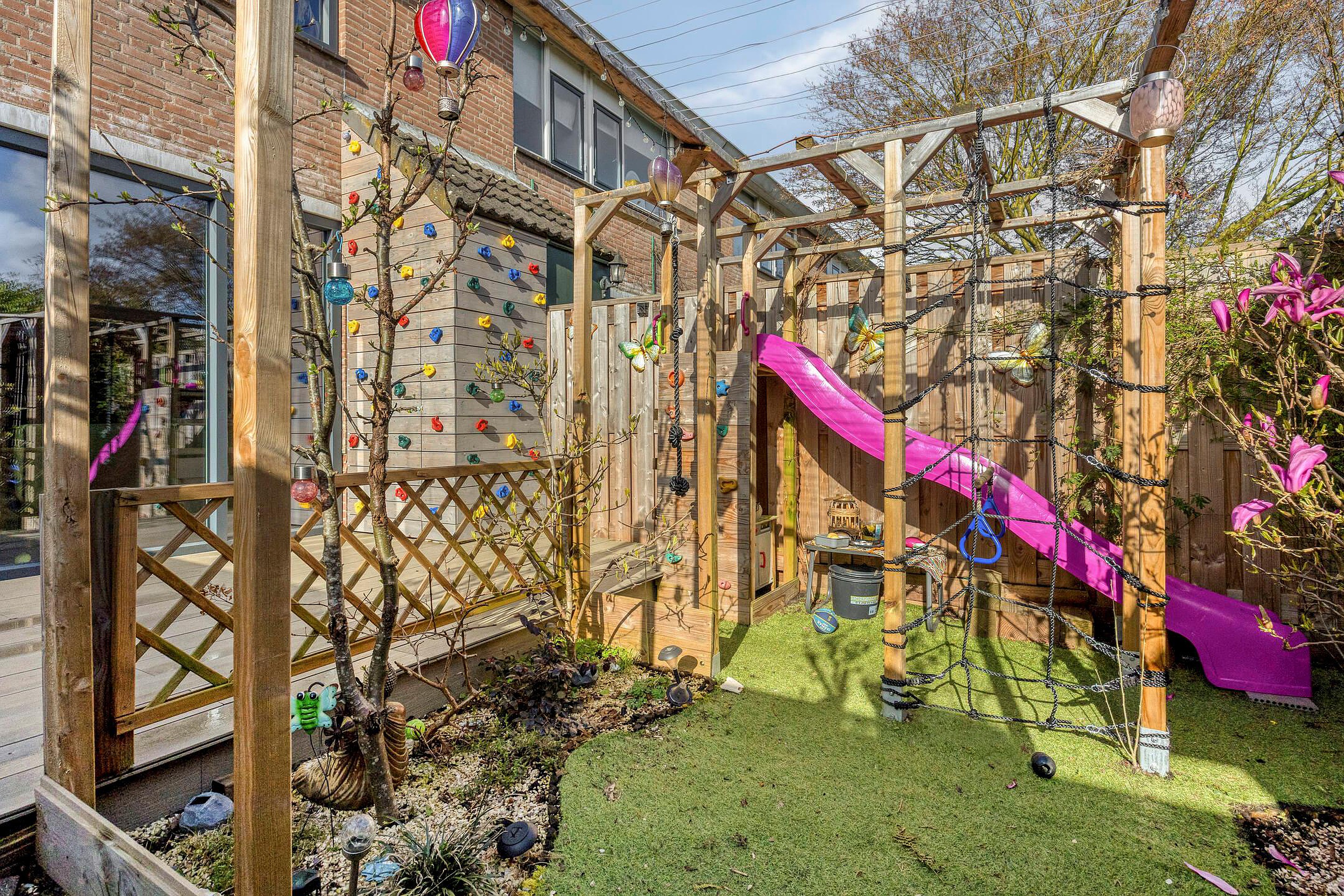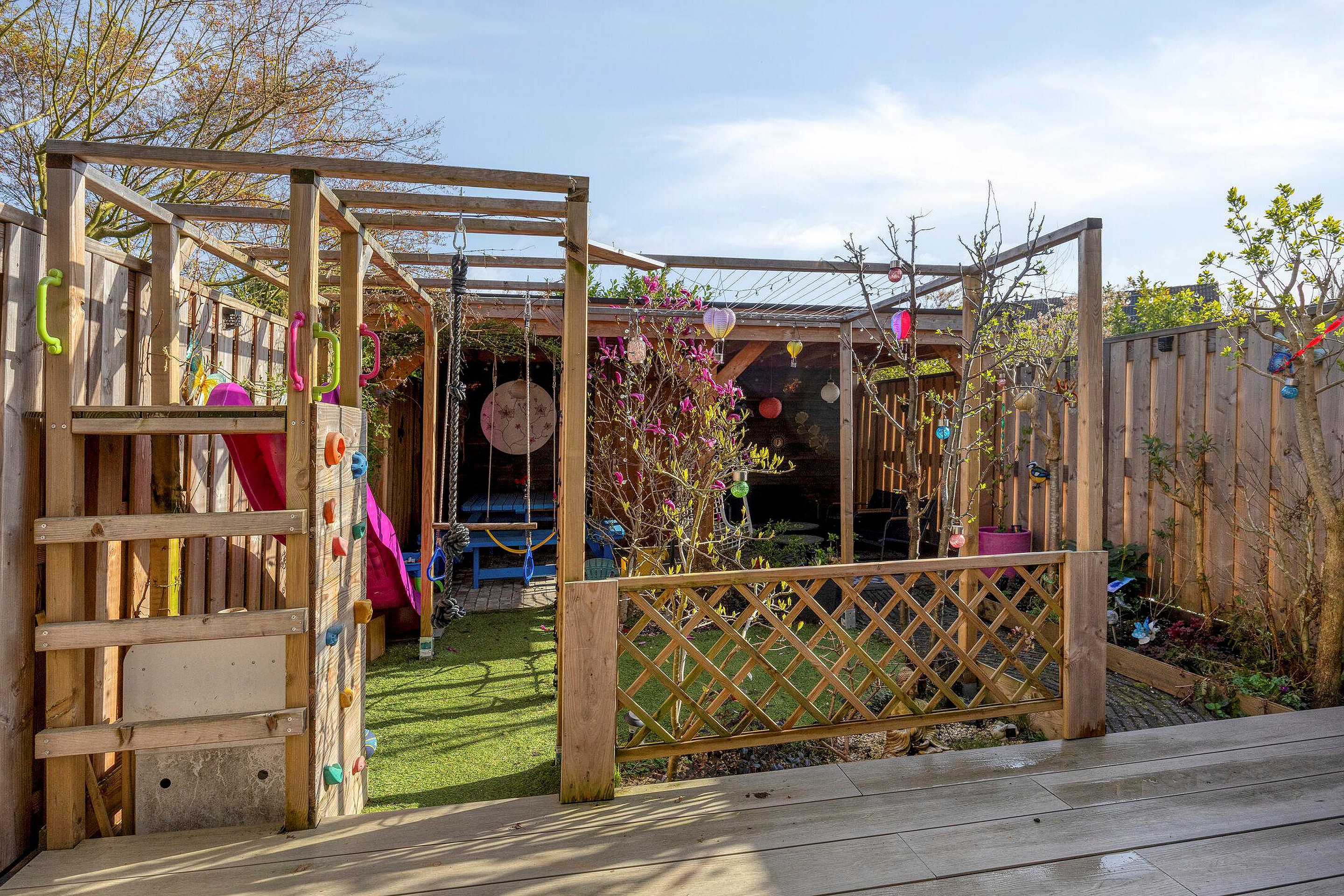 Tuin De achtertuin ligt op het noordoosten en is verzorgd aangelegd. Hier vind je een overkapping waar je beschut kunt zitten, een handige achterom en een speelse klimwand, perfect voor kinderen. Een fijne buitenruimte met diverse mogelijkheden.