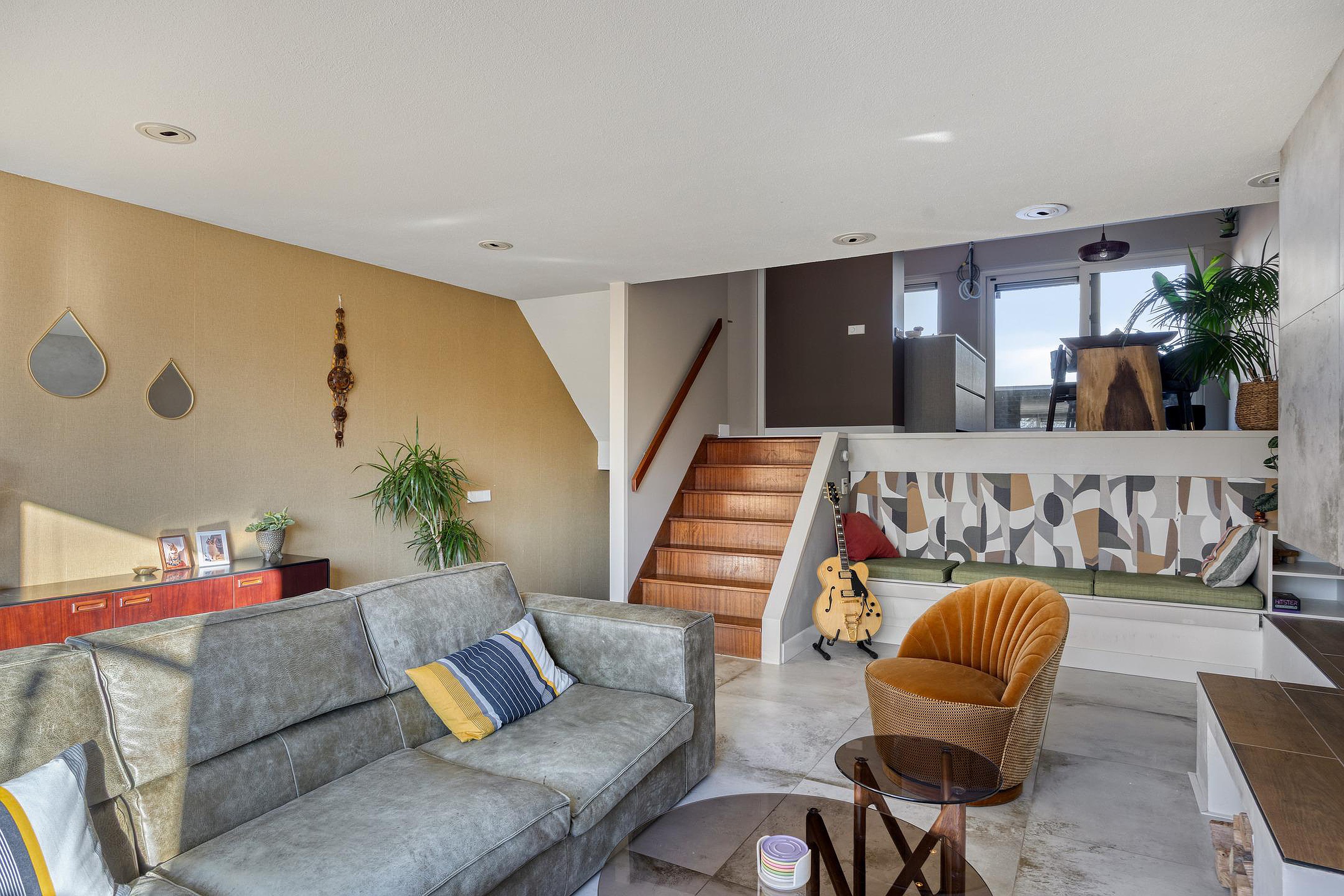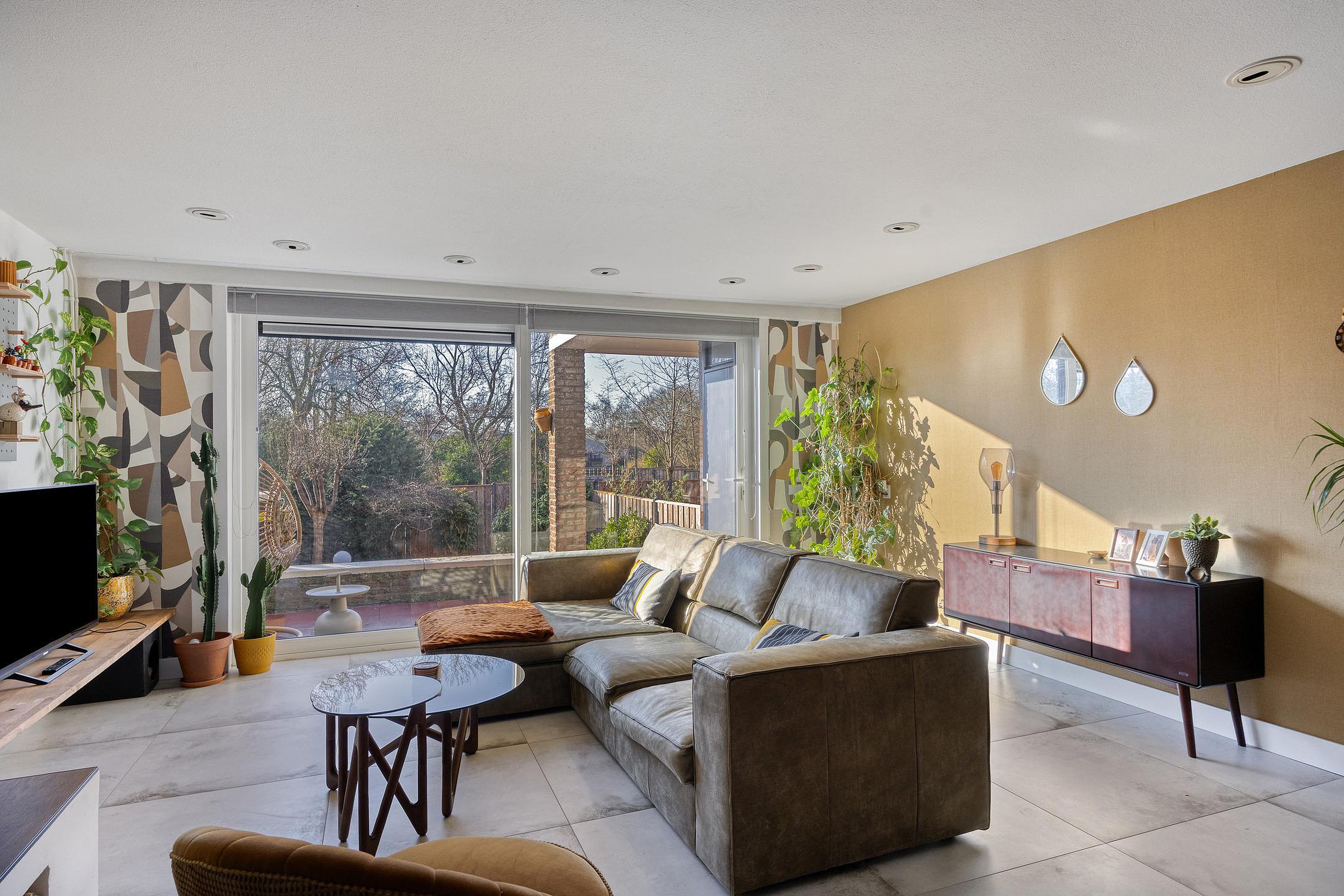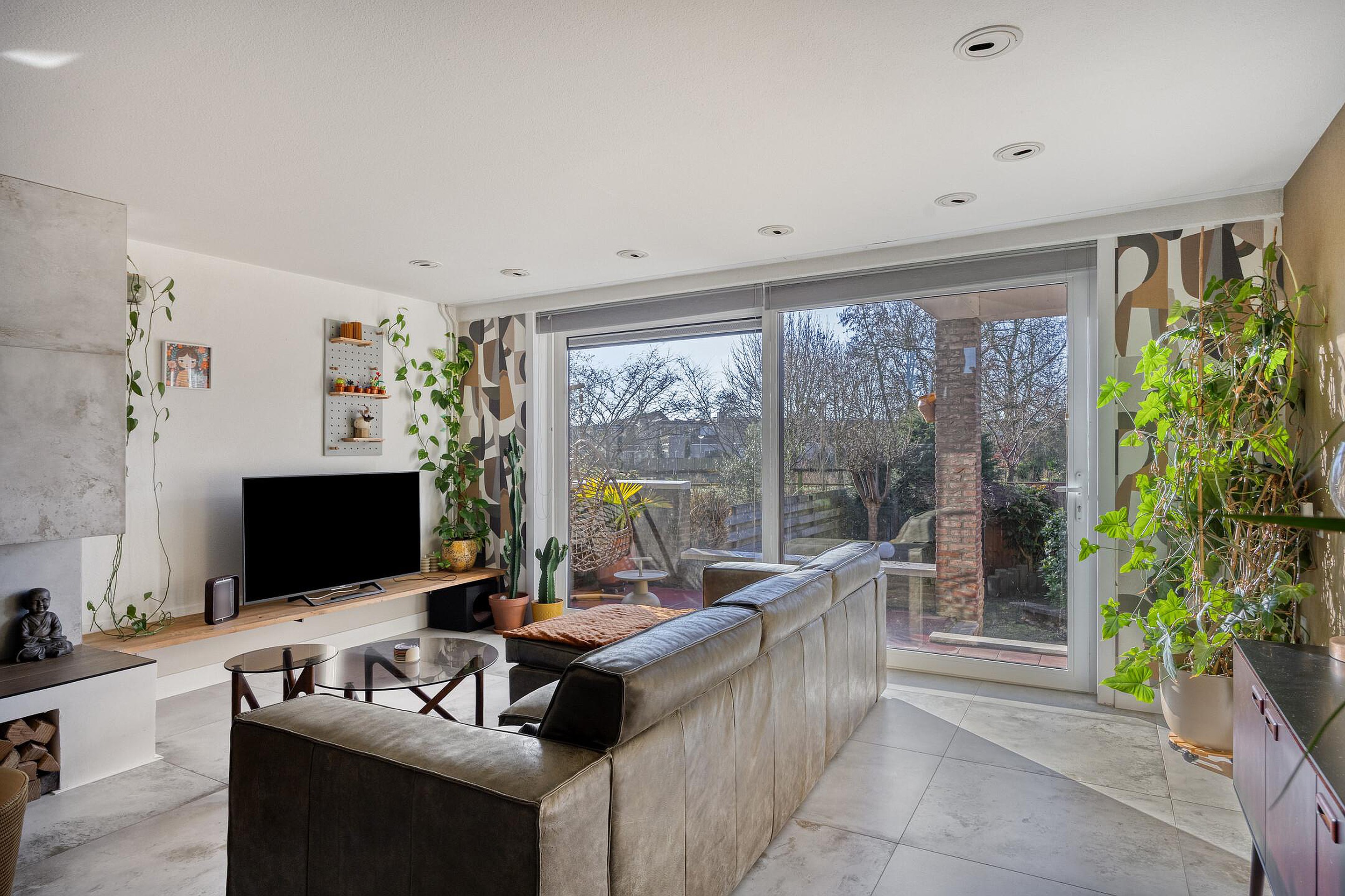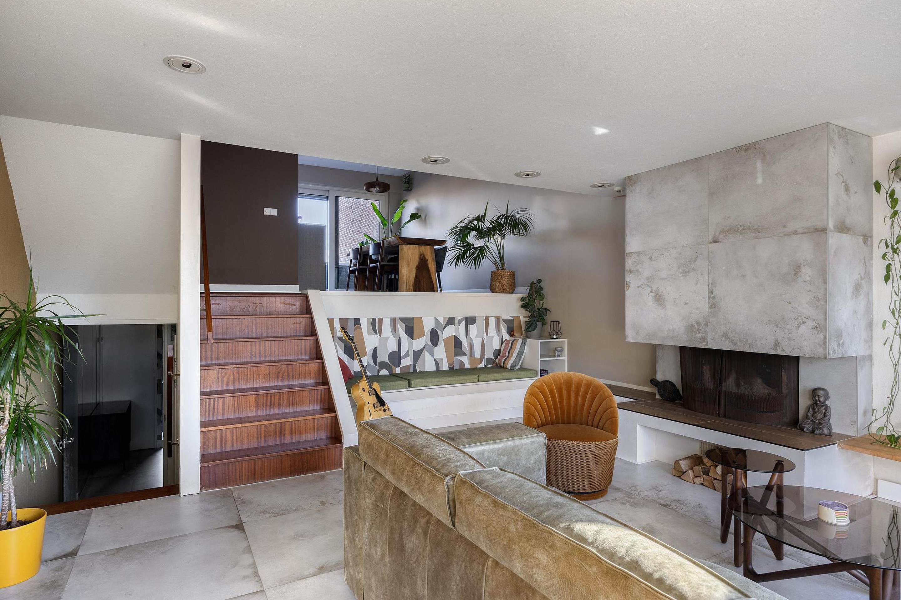 Via een korte trap bereikt u de sfeervolle woonkamer. Hier valt direct het niveauverschil op dat deze woning zijn karakter geeft. Vanuit de woonkamer prachtig vrij zicht op het water en het park. De woonkamer is afgewerkt met een tegelvloer met vloerverwarming, strak gestuukte wanden, sfeervolle open haard en kunststof schuifpui naar de zonnige tuin. De grote schuifpui zorgt voor een prachtige lichtinval en een directe verbinding met buiten.