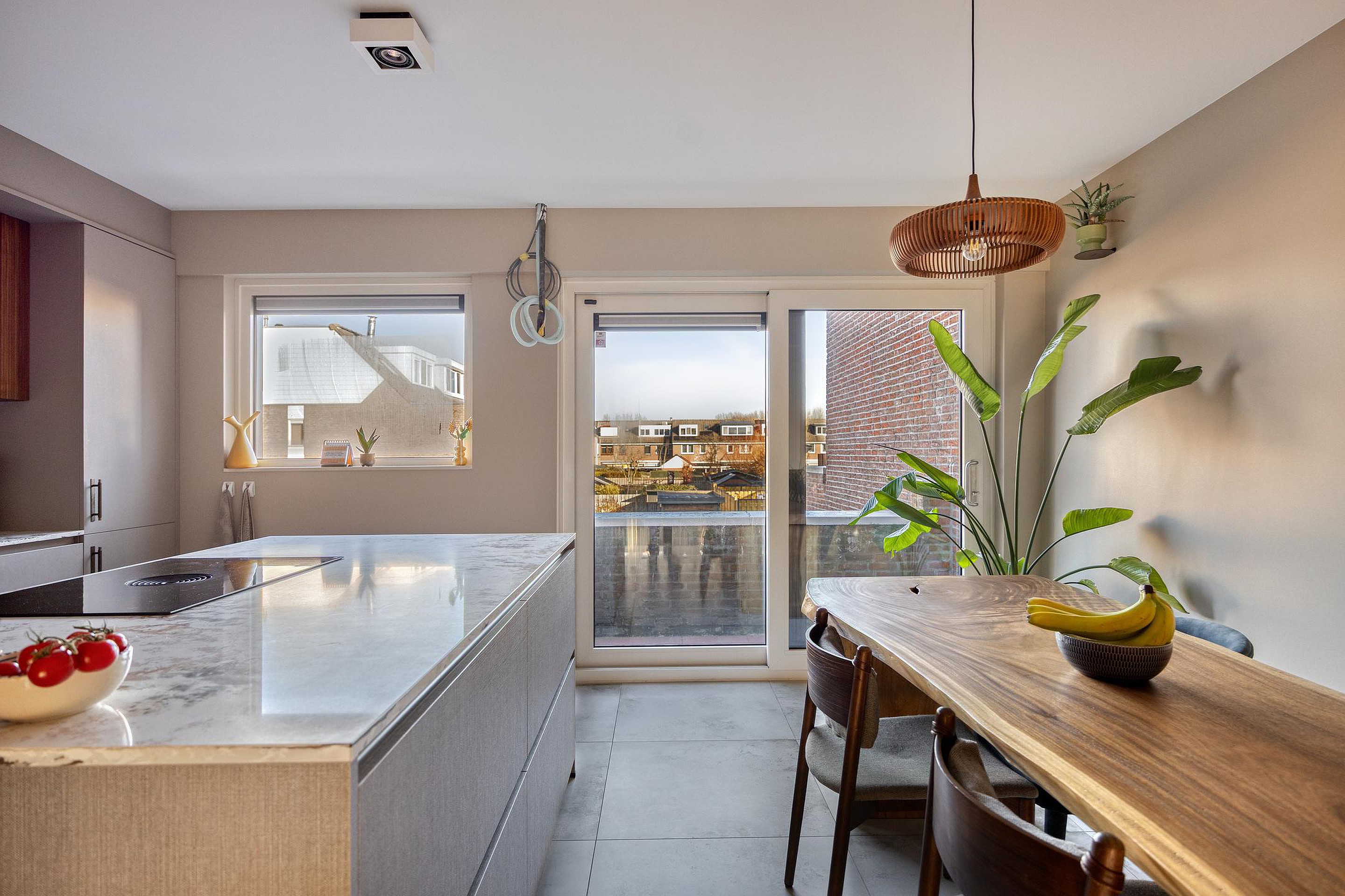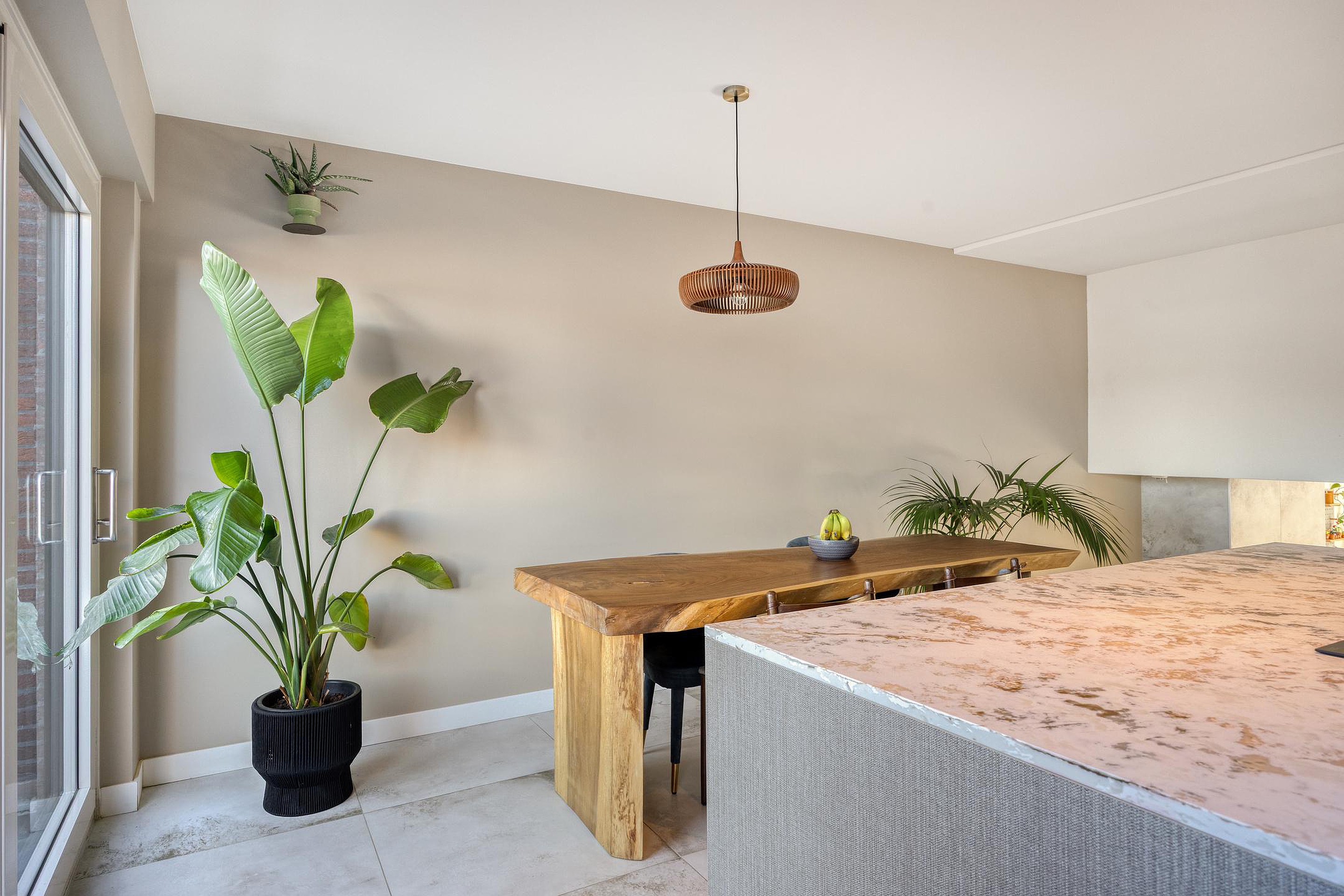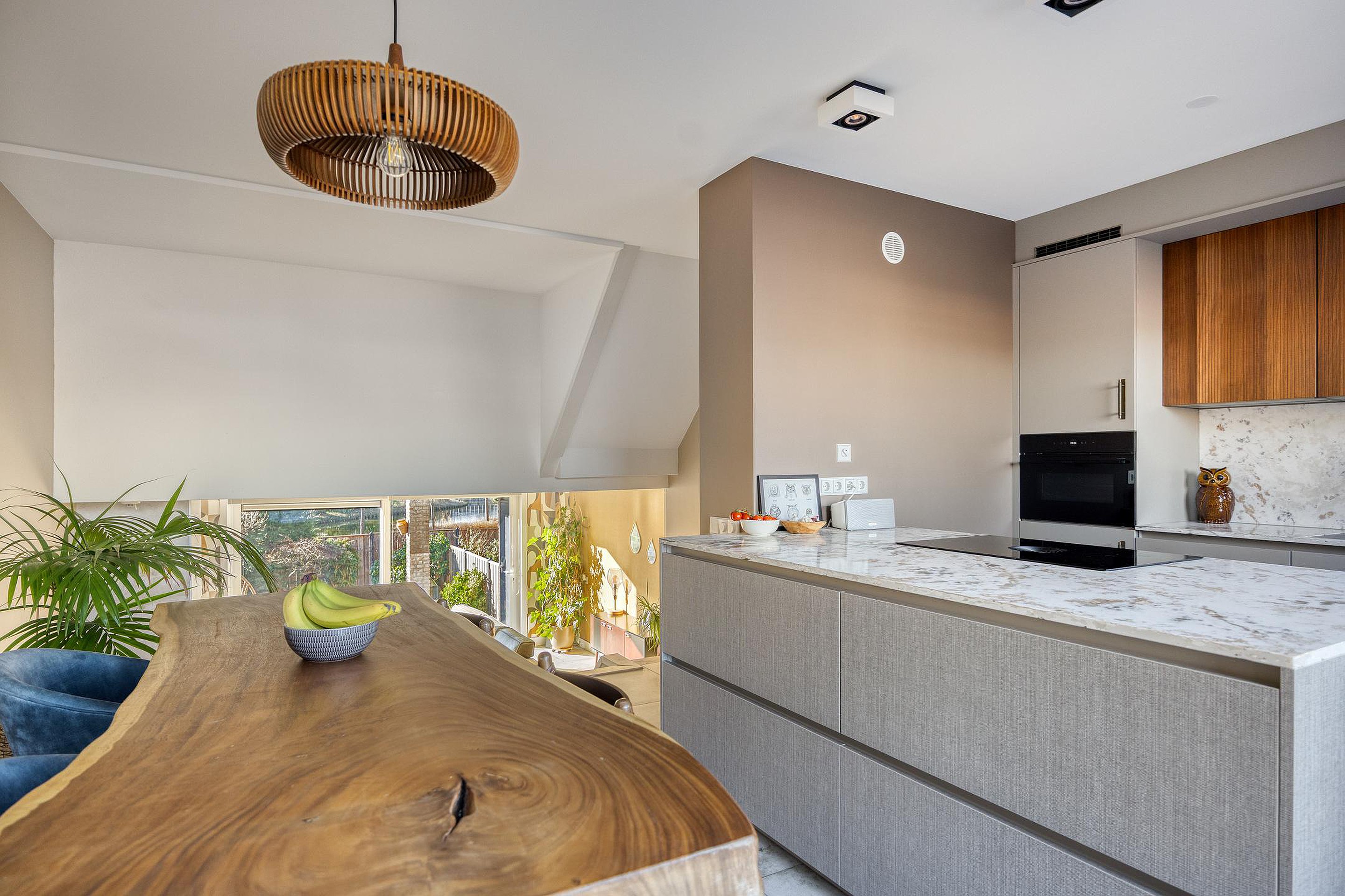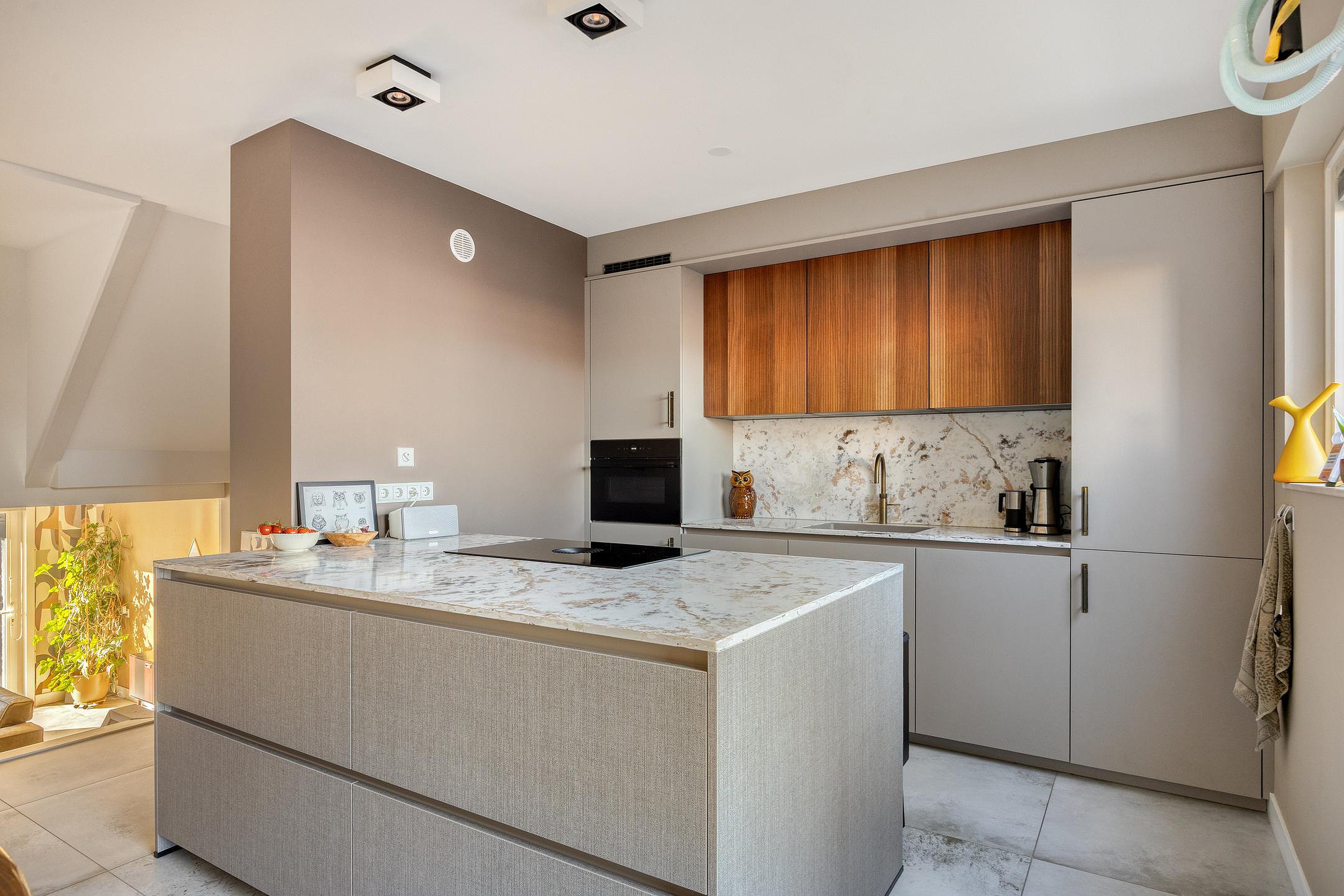 Een halve trap hoger bevindt zich de royale woonkeuken, volledig vernieuwd in 2025. Deze moderne keuken vormt het hart van de woning en is voorzien van een koel-/vriescombinatie, vaatwasser, oven, 4-pits kookeiland met geïntegreerde afzuiging, Quooker. Ook hier liggen tegels met vloerverwarming en zijn de wanden en plafond strak gestuukt. De aansluiting voor een airco is al aanwezig.