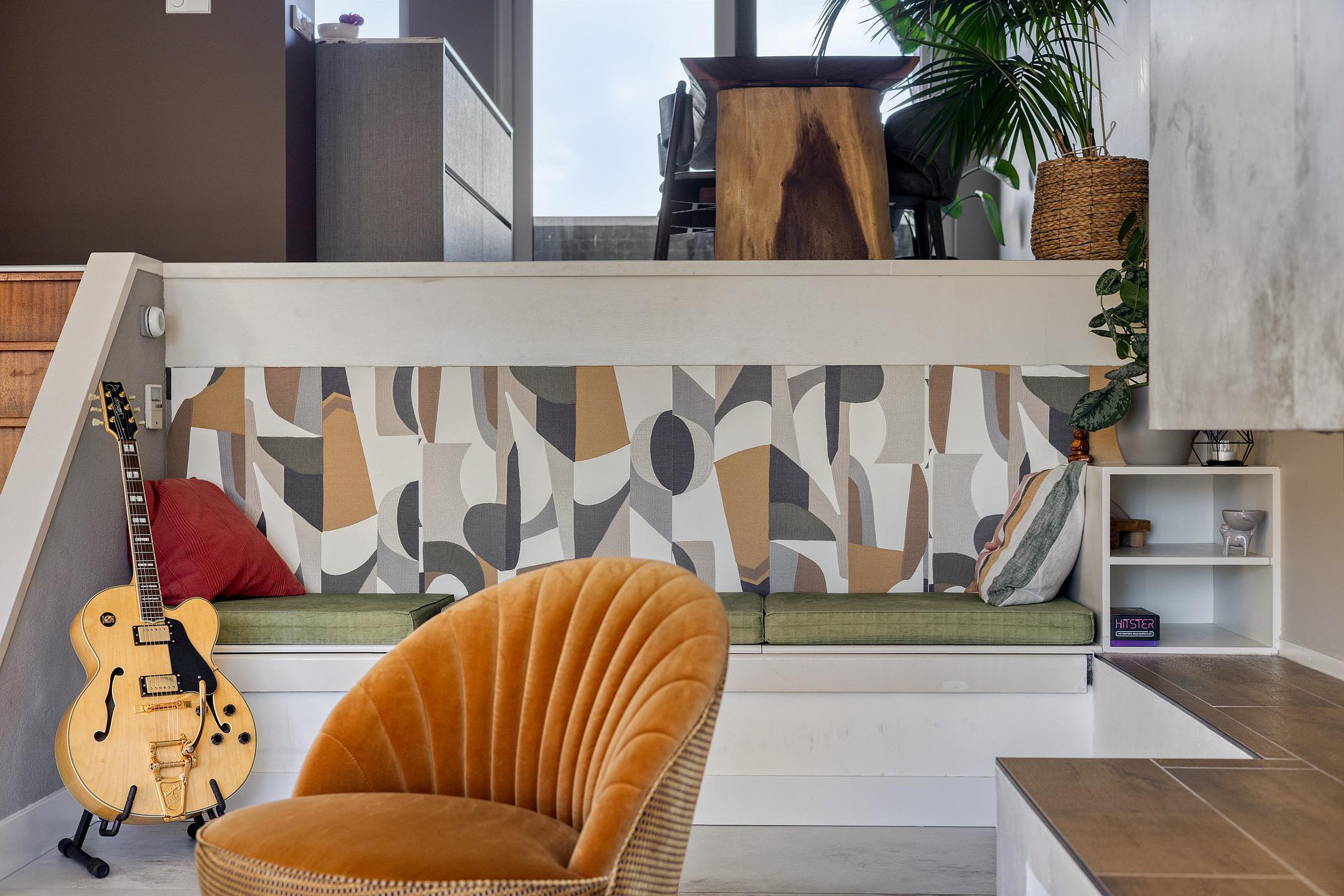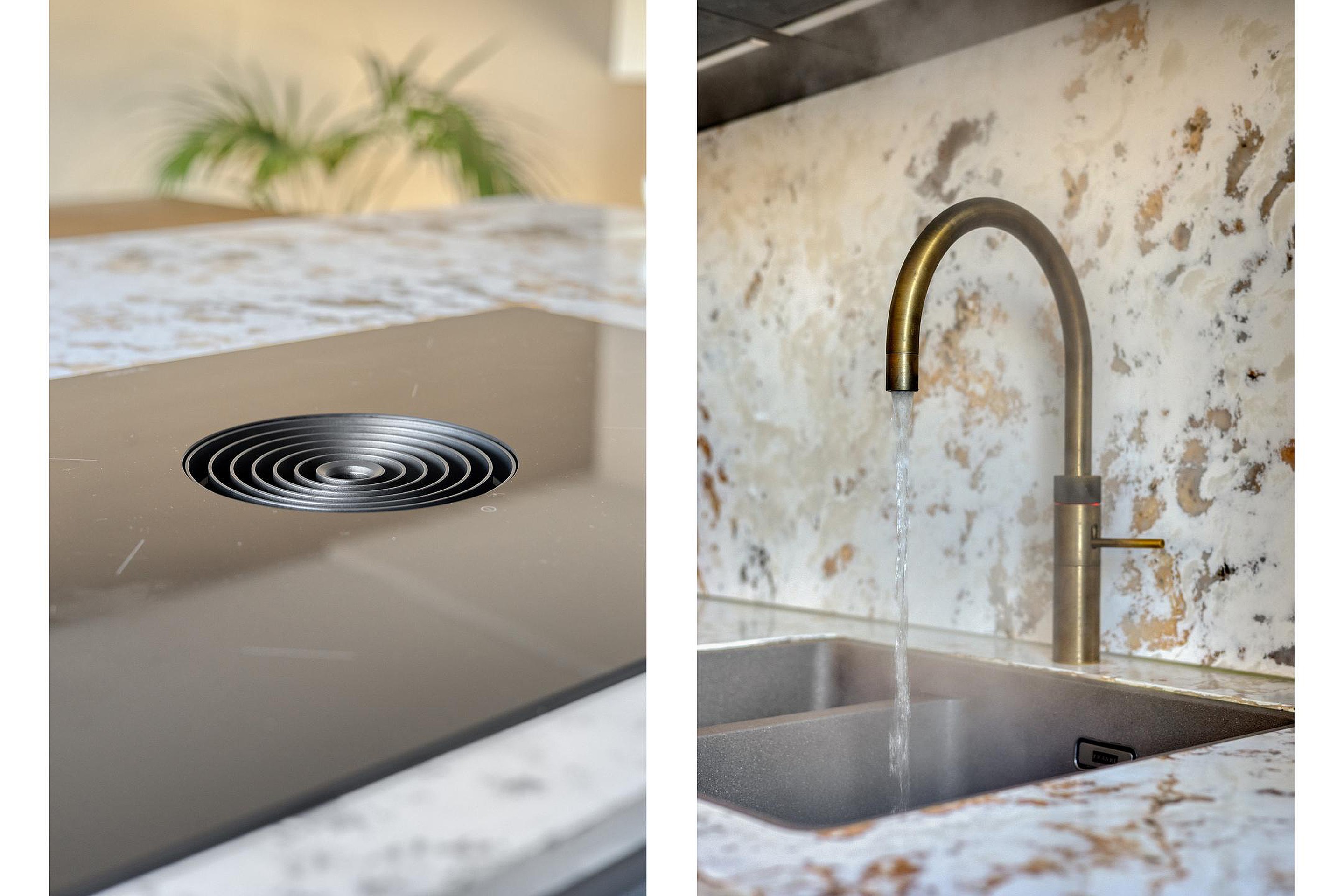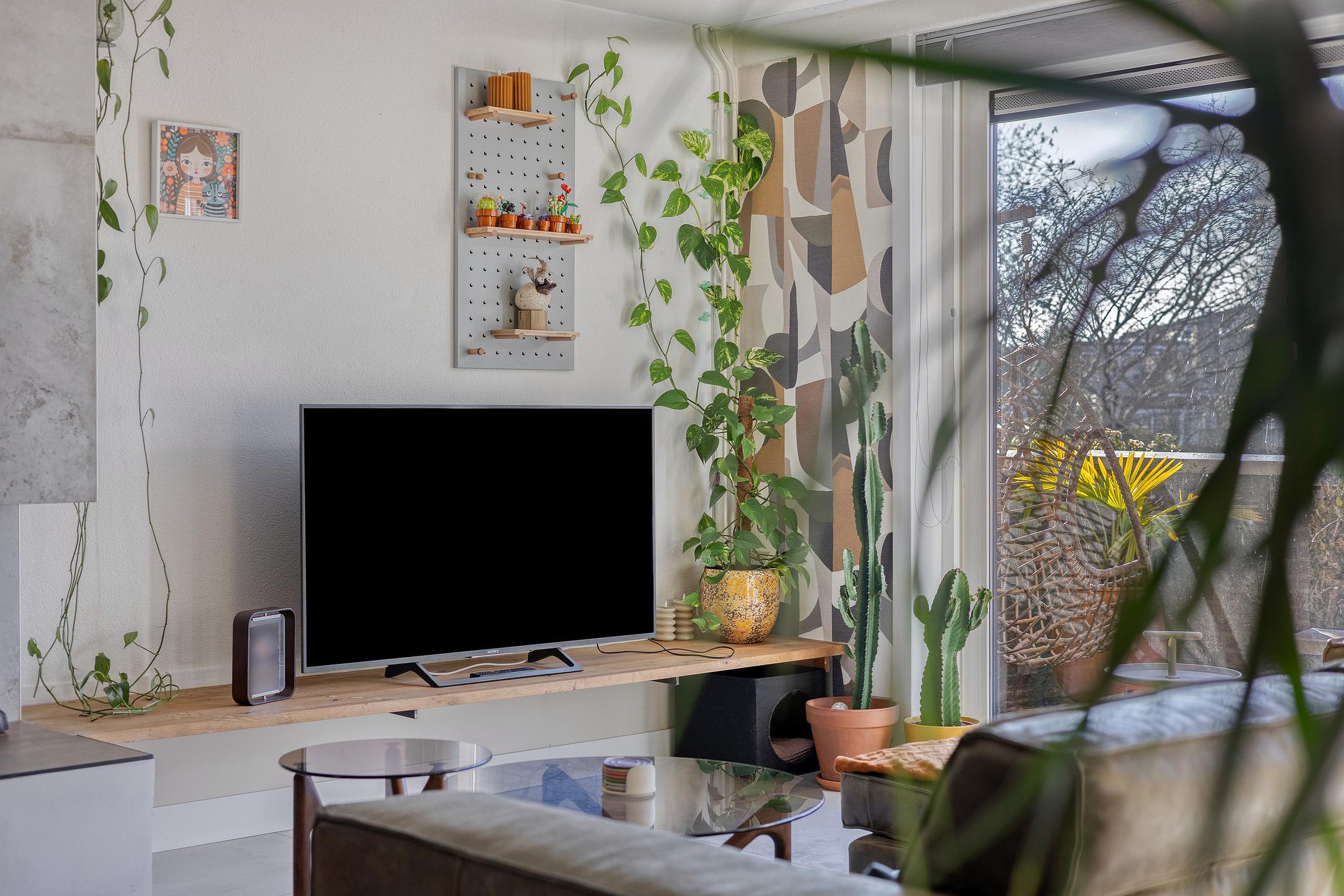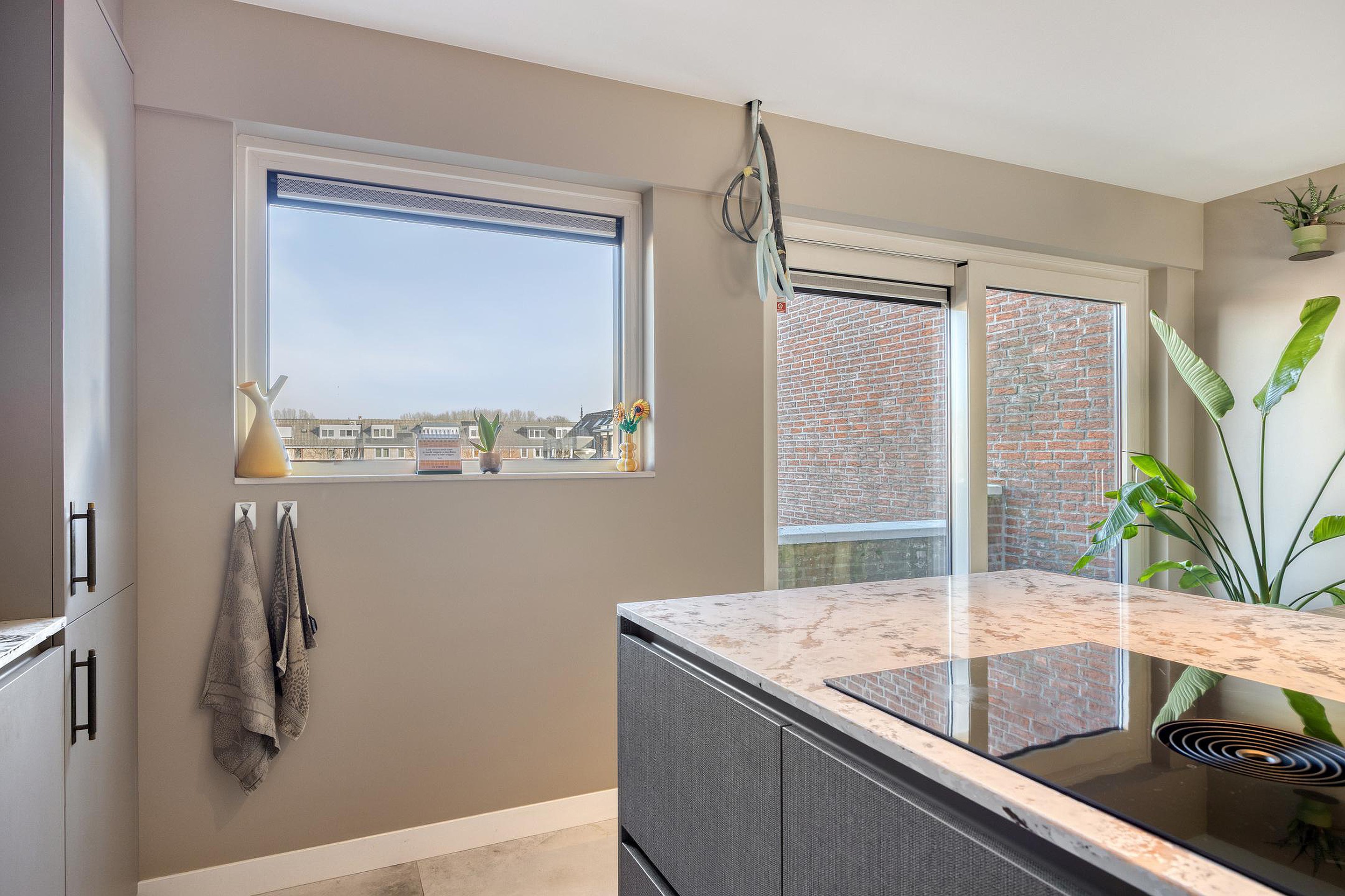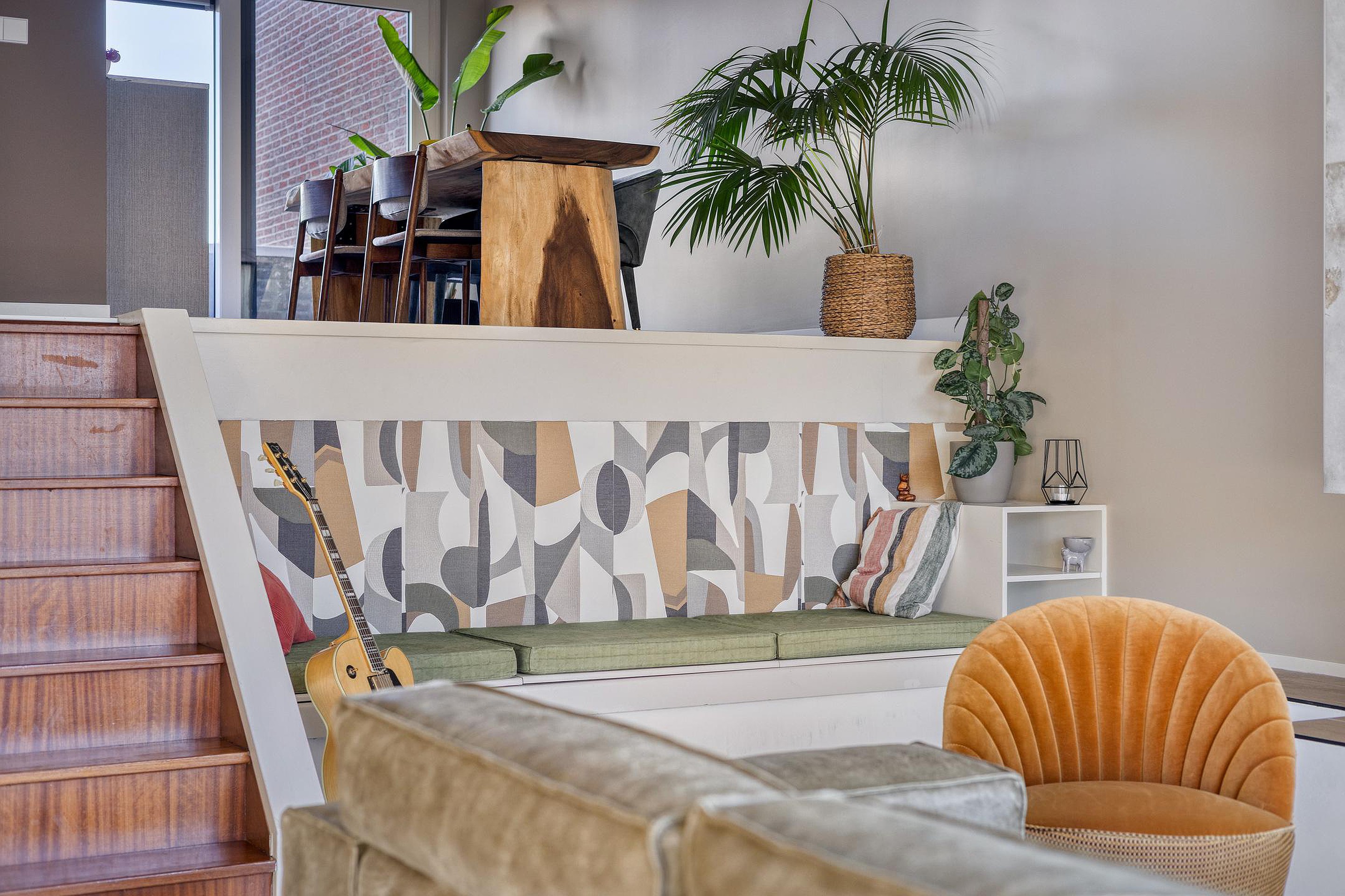 Een halve trap hoger bevindt zich de royale woonkeuken, volledig vernieuwd in 2025. Deze moderne keuken vormt het hart van de woning en is voorzien van een koel-/vriescombinatie, vaatwasser, oven, 4-pits kookeiland met geïntegreerde afzuiging, Quooker. Ook hier liggen tegels met vloerverwarming en zijn de wanden en plafond strak gestuukt. De aansluiting voor een airco is al aanwezig.