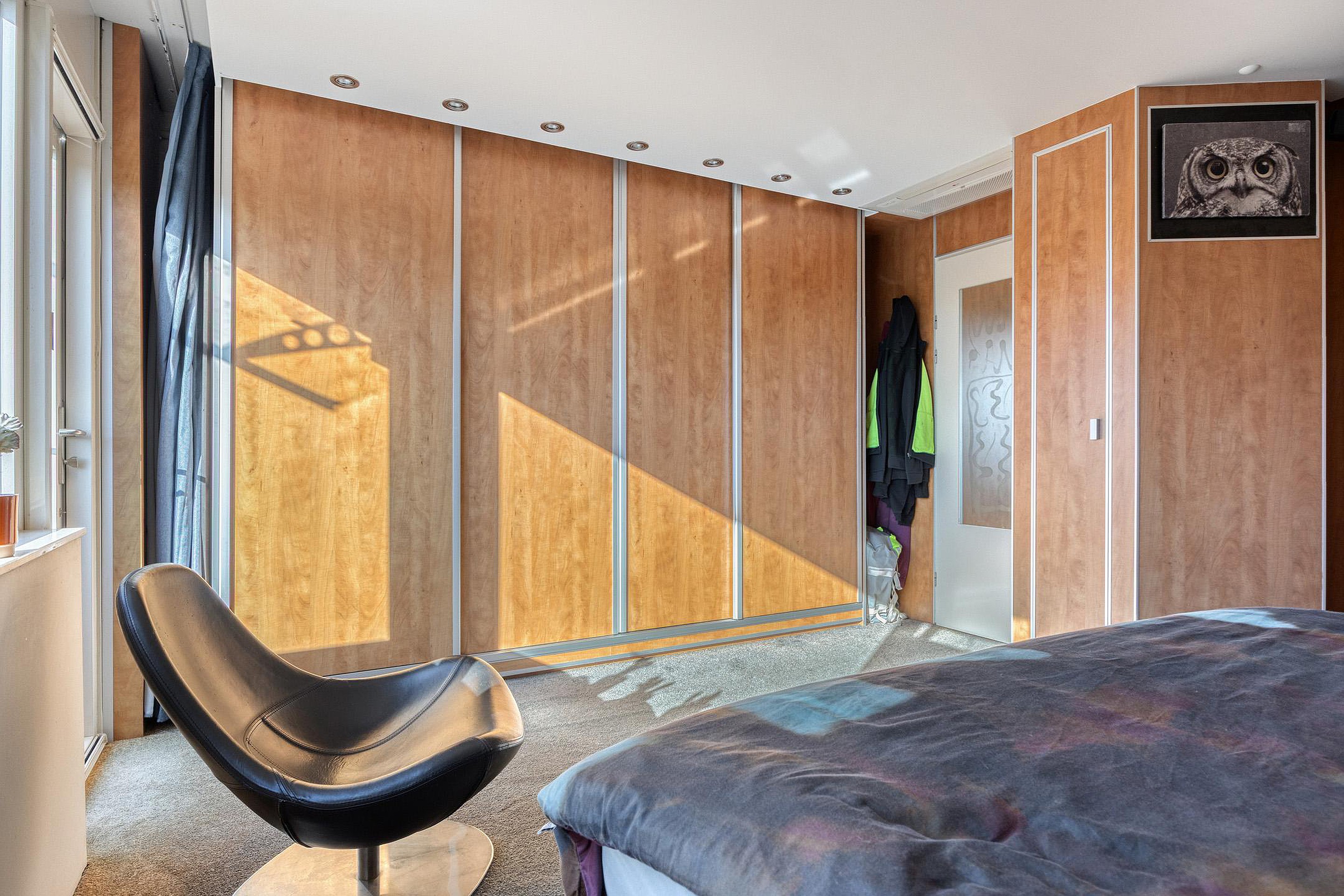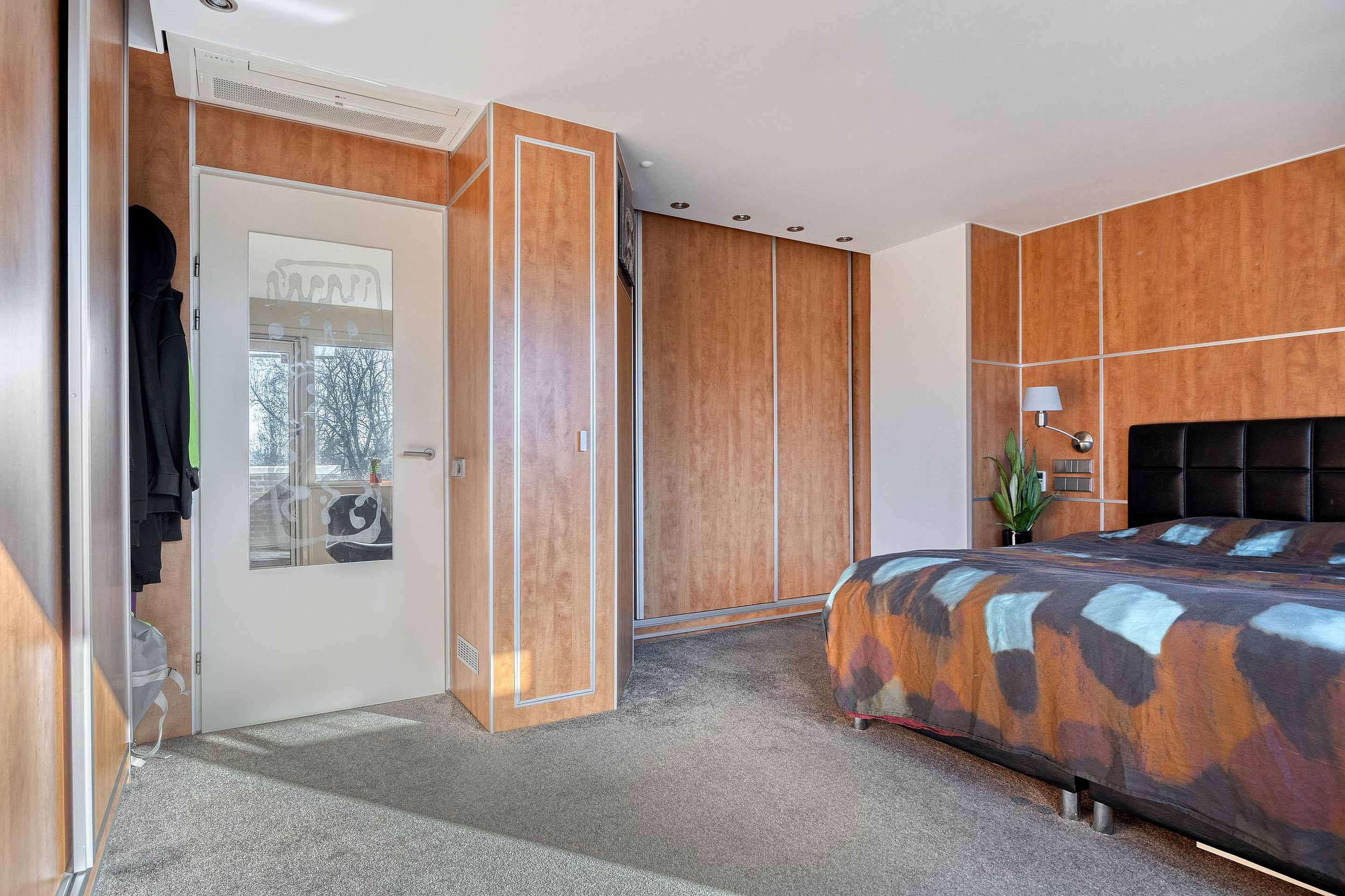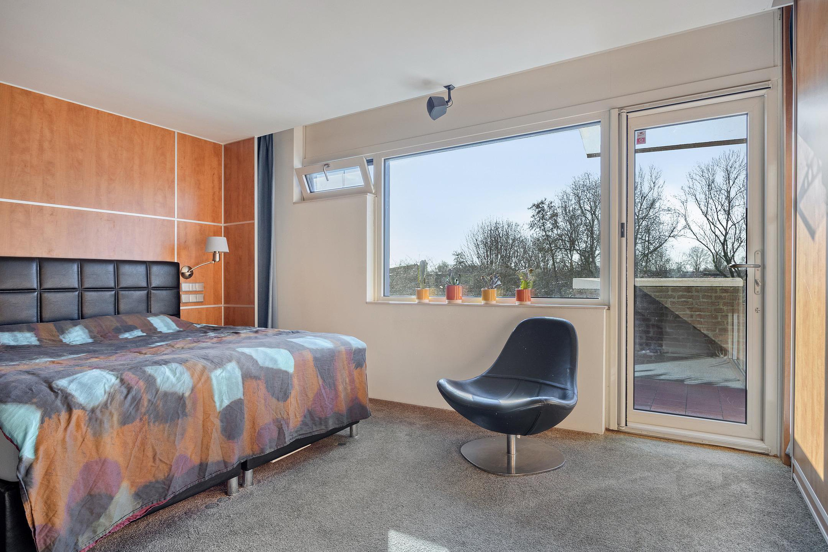 Slaapkamer aan de achterzijde met vaste kast en balkon met uitzicht over de tuin, het water en het park.