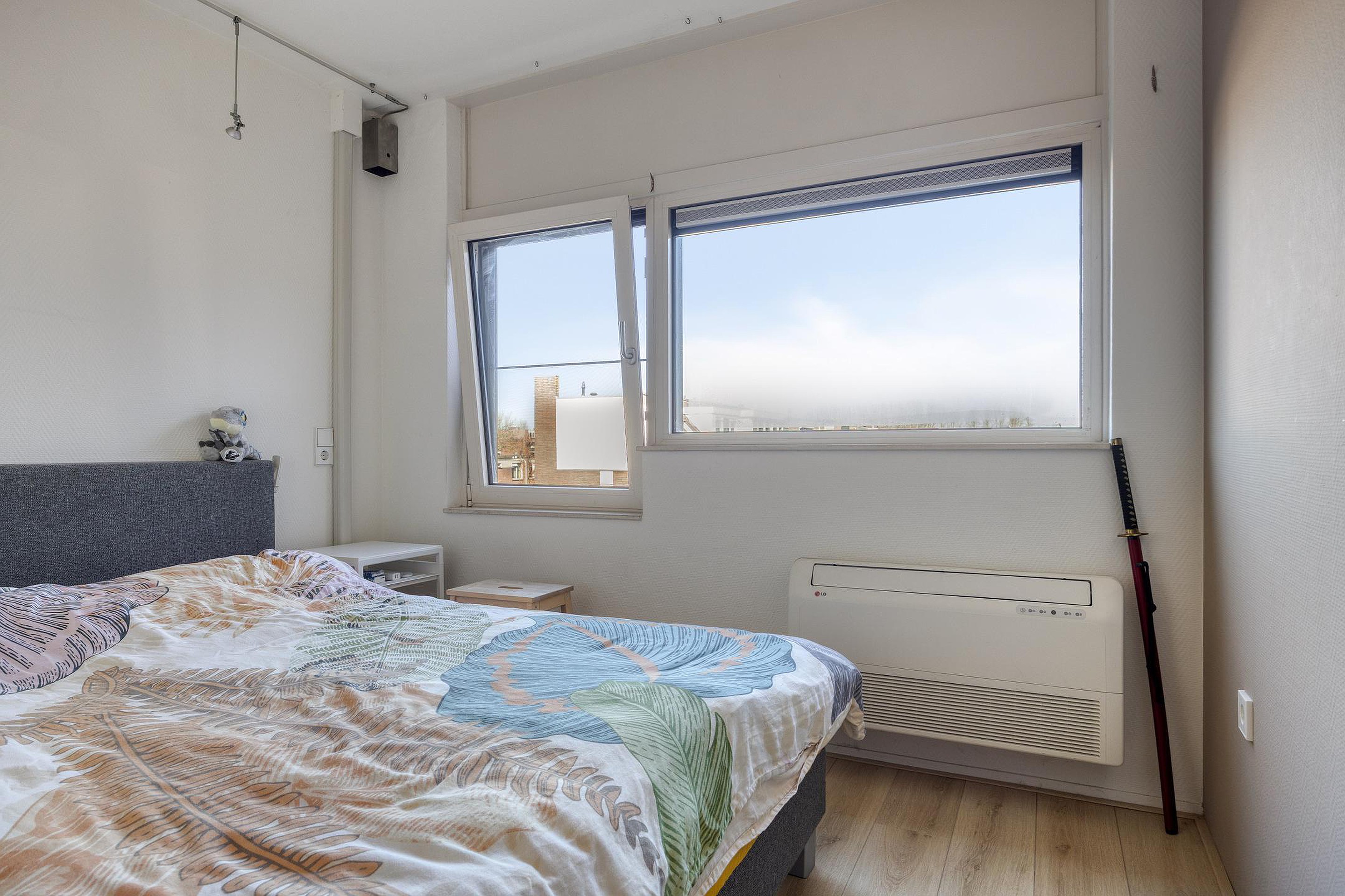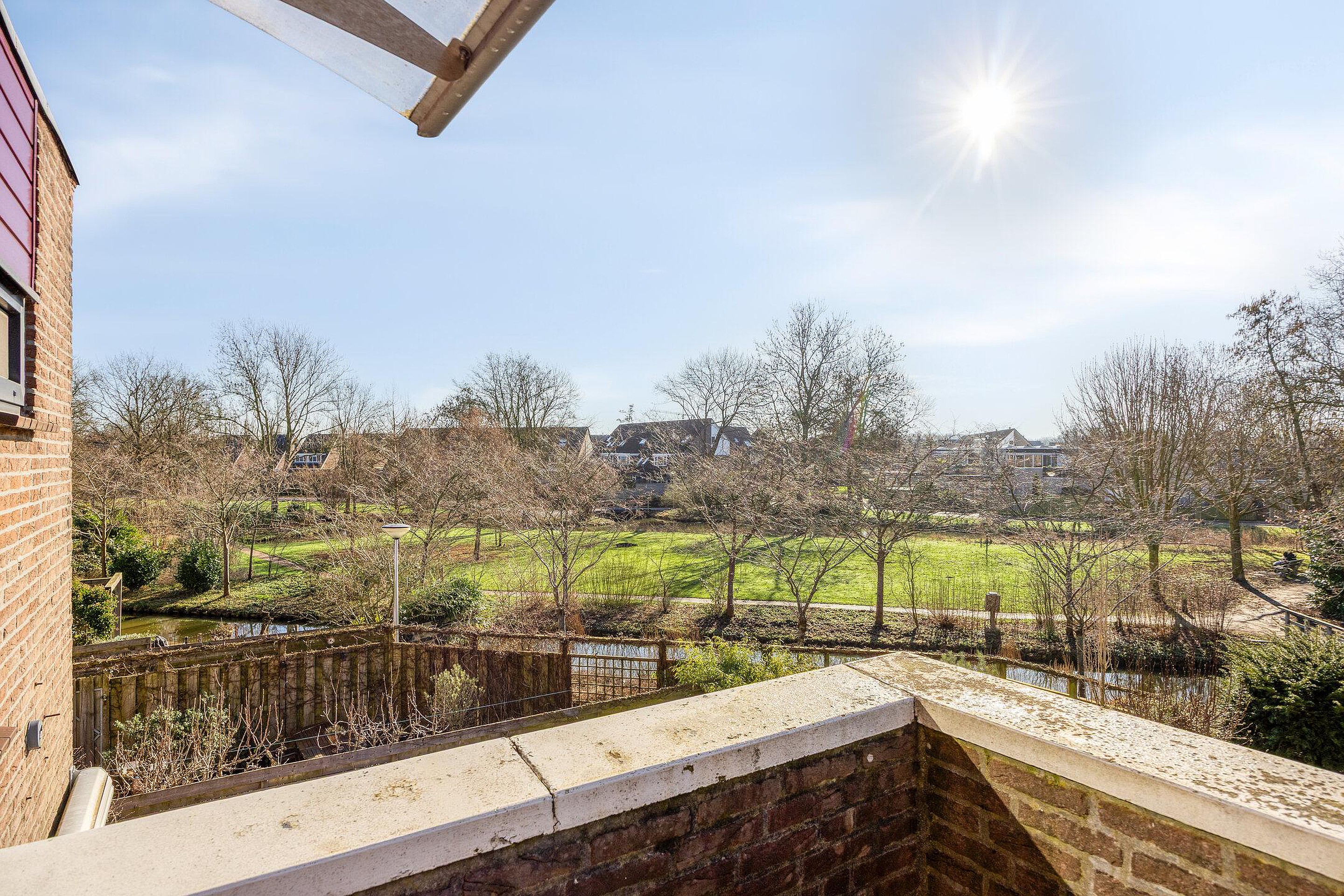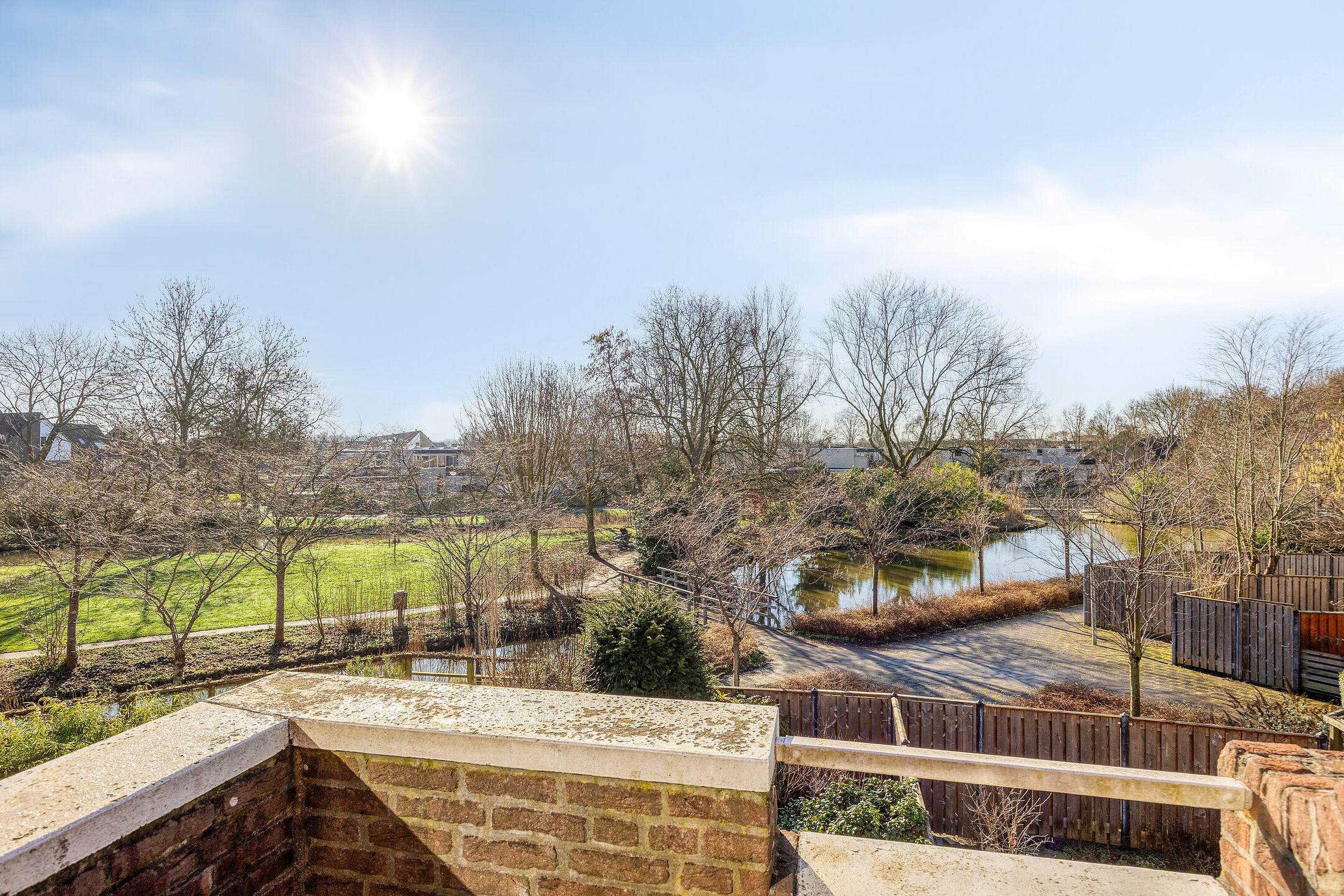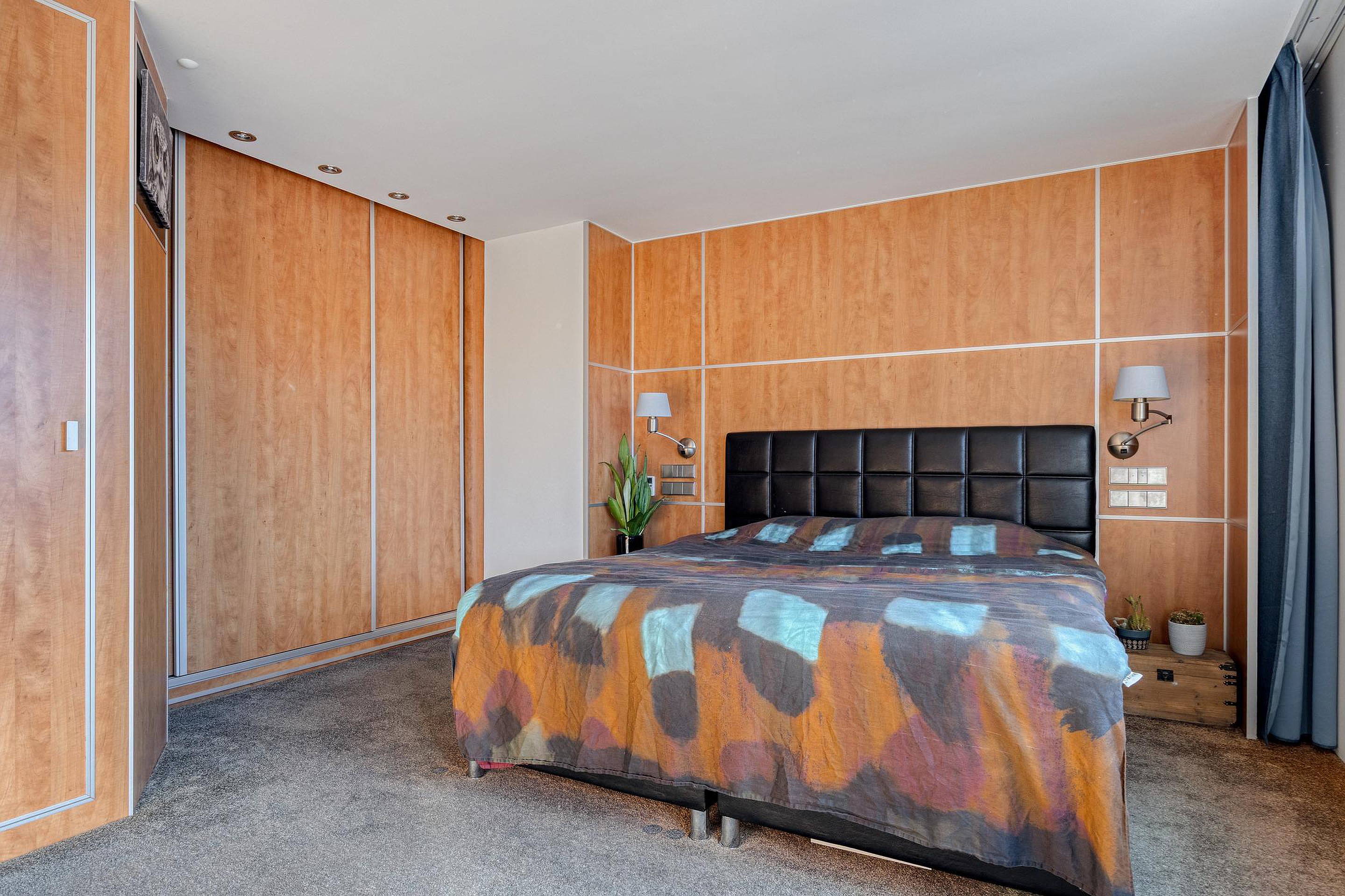Slaapkamer aan de achterzijde met vaste kast en balkon met uitzicht over de tuin, het water en het park.