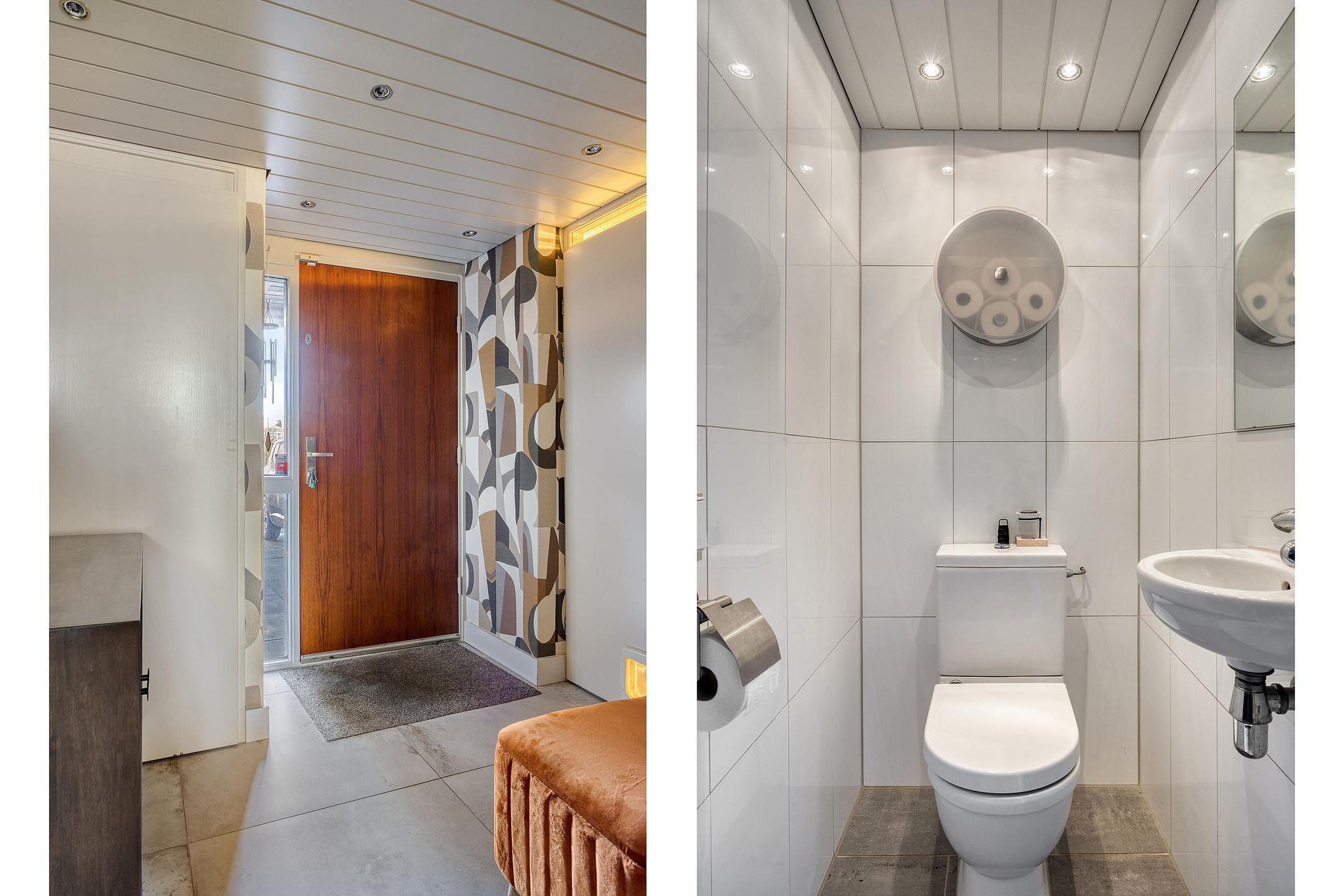 De entree biedt toegang tot de hal met meterkast, modern toilet en de inpandige garage. De garage is multifunctioneel: voorzien van aansluiting voor wasmachine, een vaste kast en een wastafel. Ideaal als bergruimte, hobbyruimte of voor het veilig stallen van auto of fietsen.