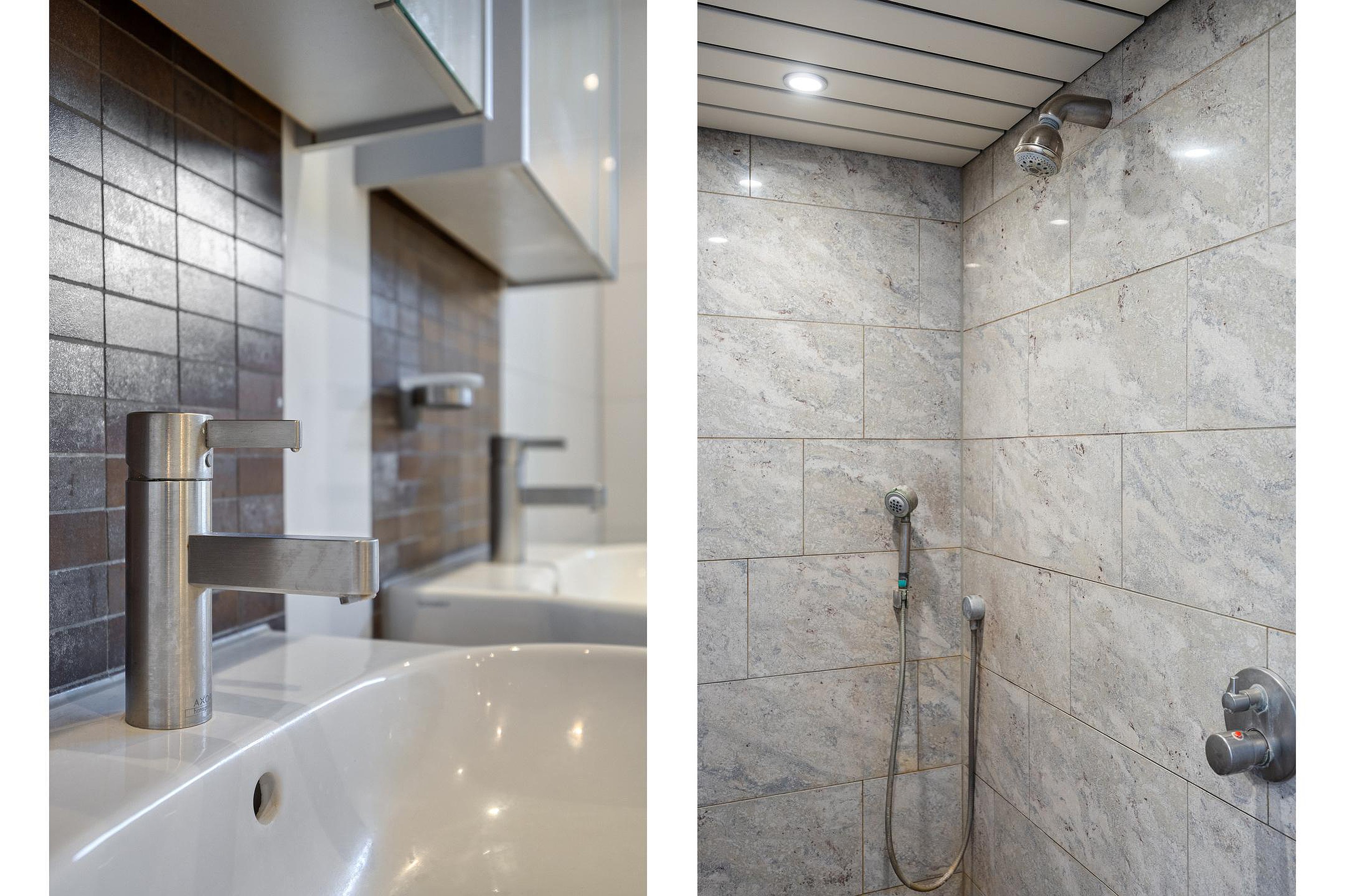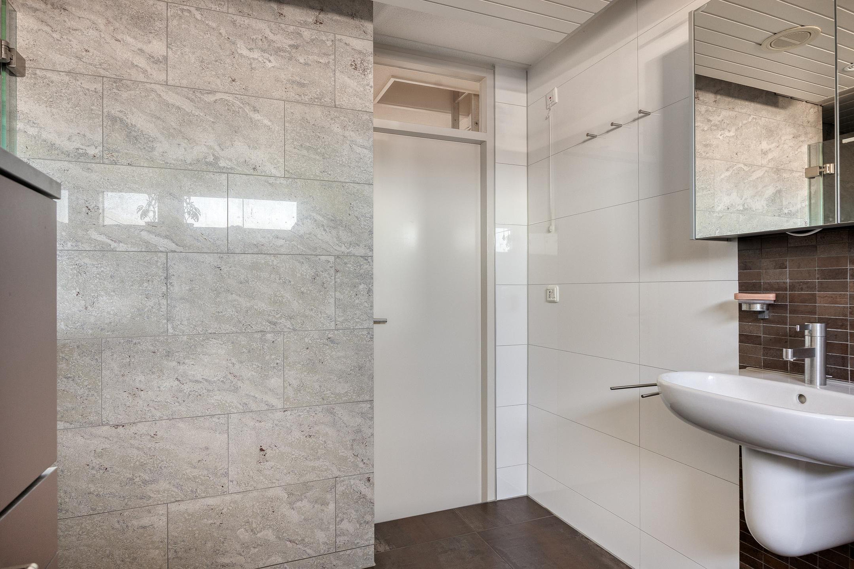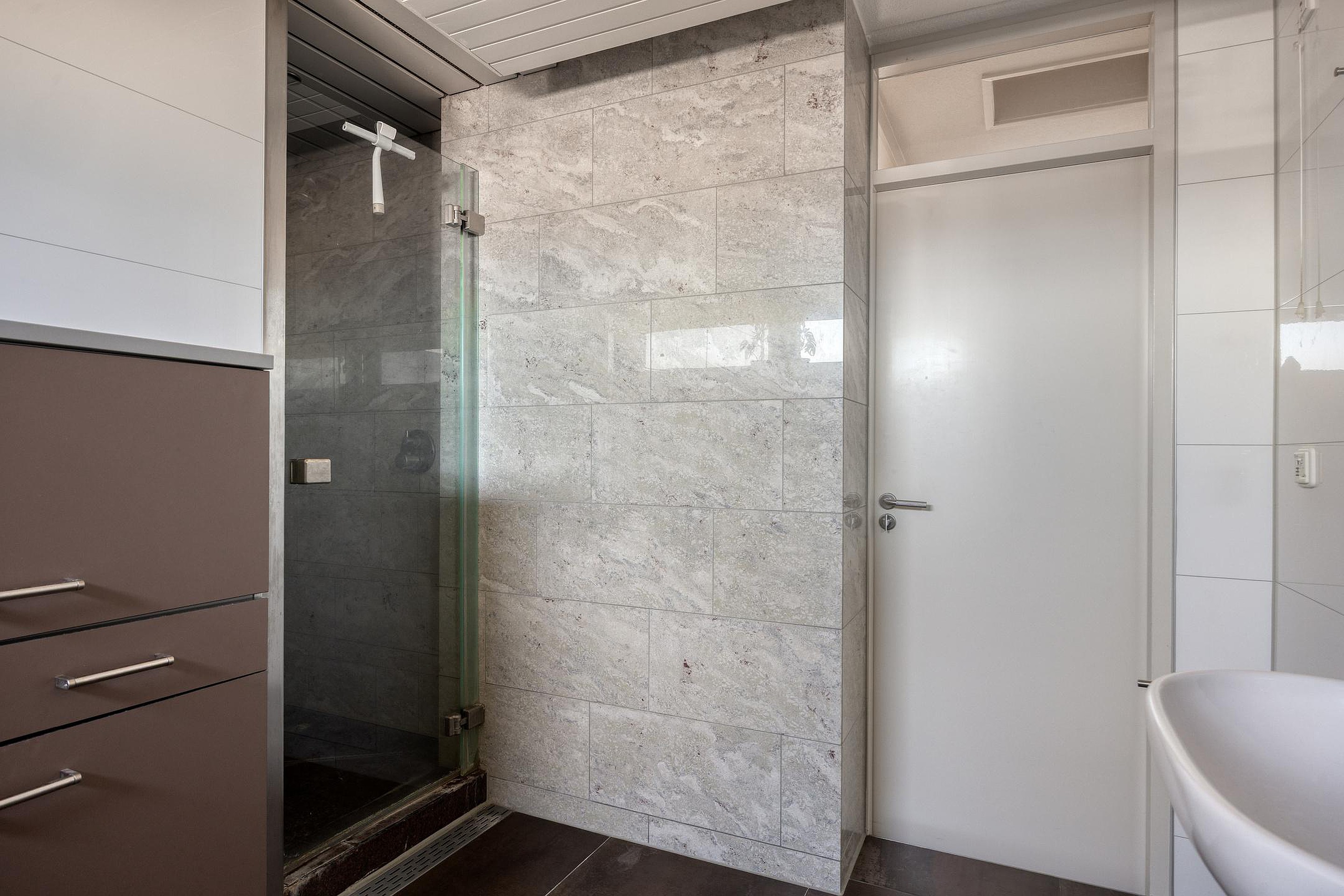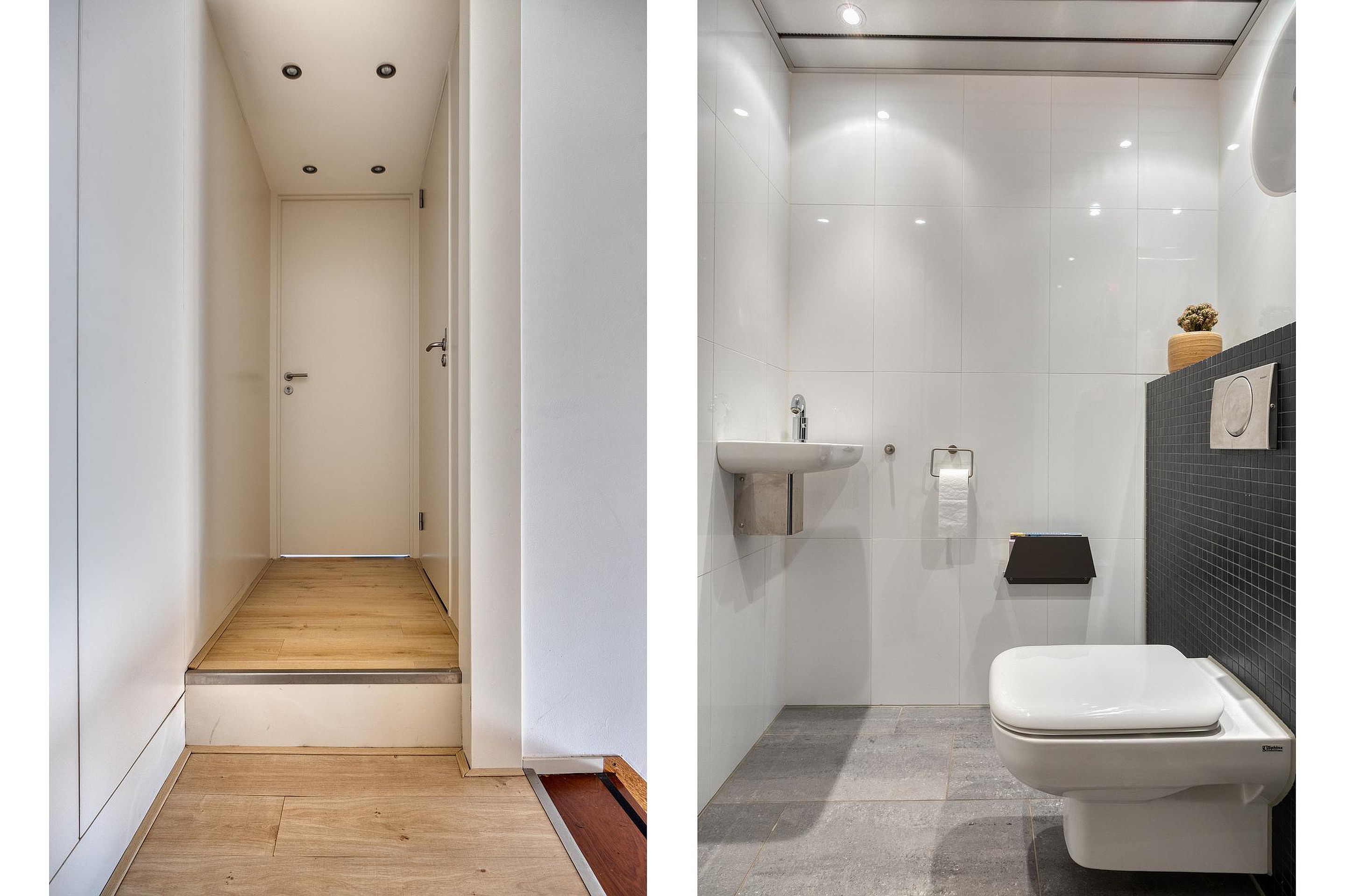 Overloop met separaat ruim toilet en de complete badkamer. De badkamer is ruim opgezet en voorzien van een inloopdouche, ligbad, dubbele wastafel en vloerverwarming. Op dit niveau bevindt zich een tweede slaapkamer met airco en dakraam.