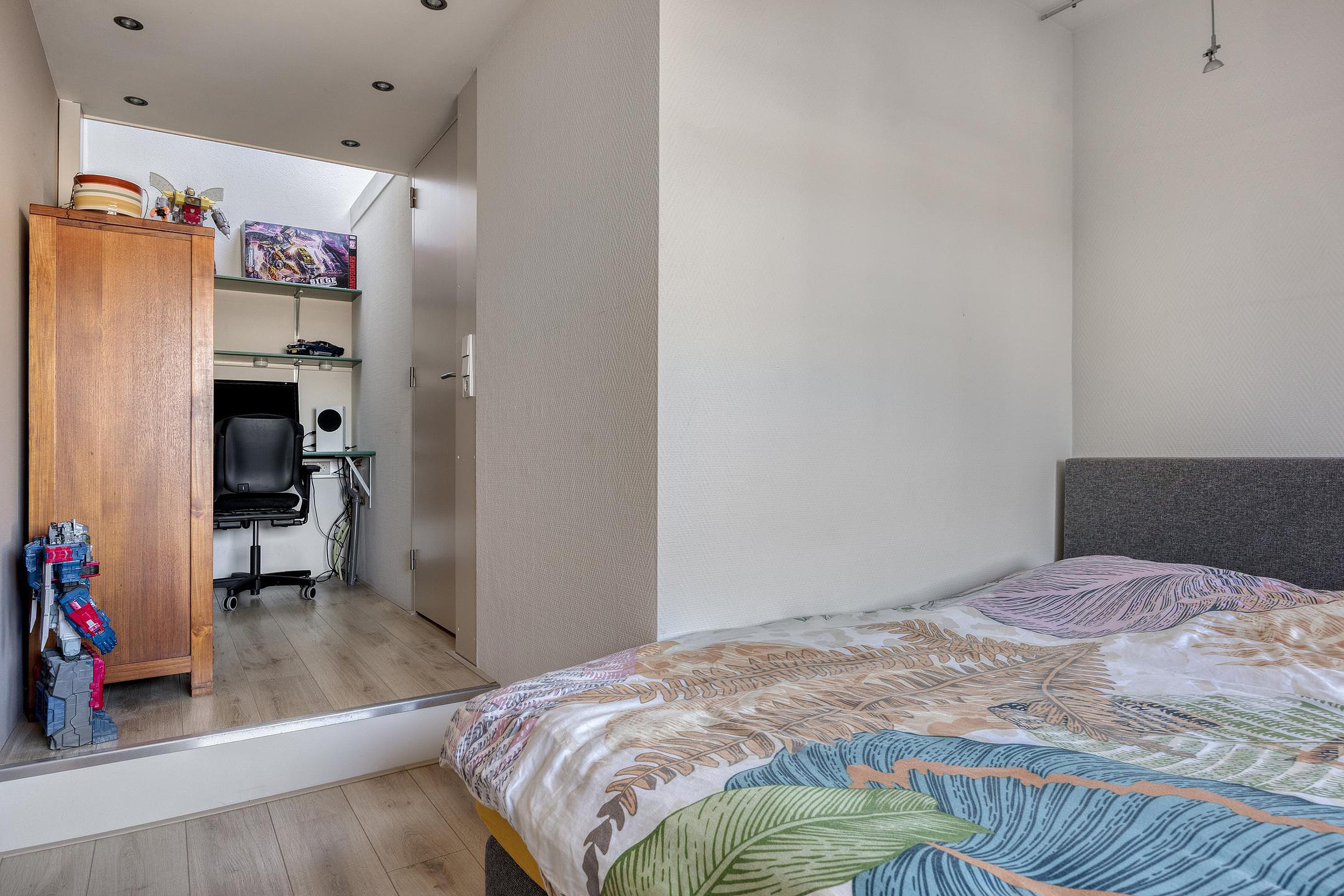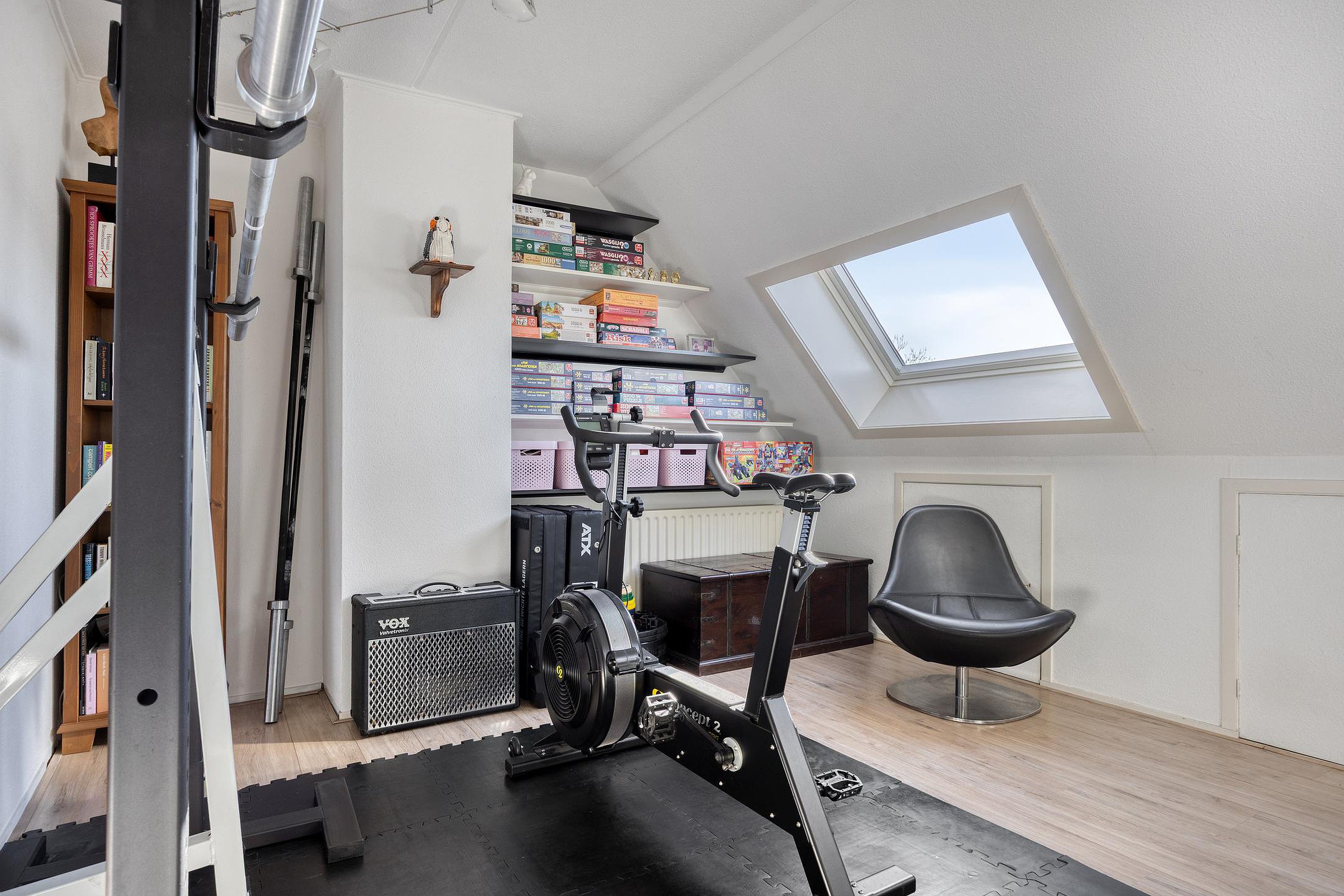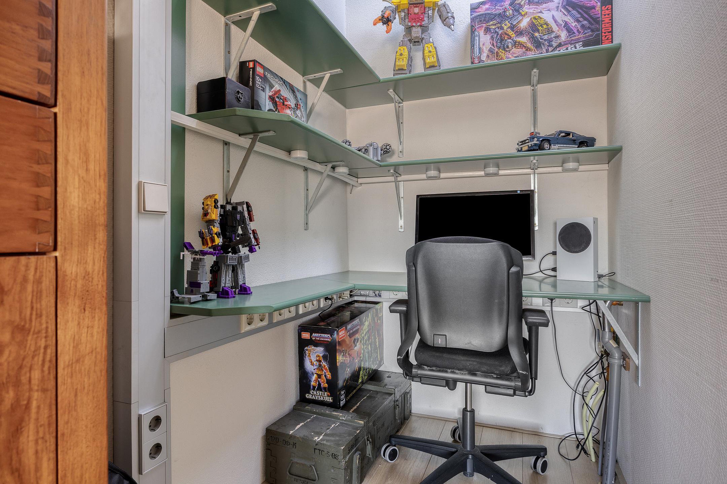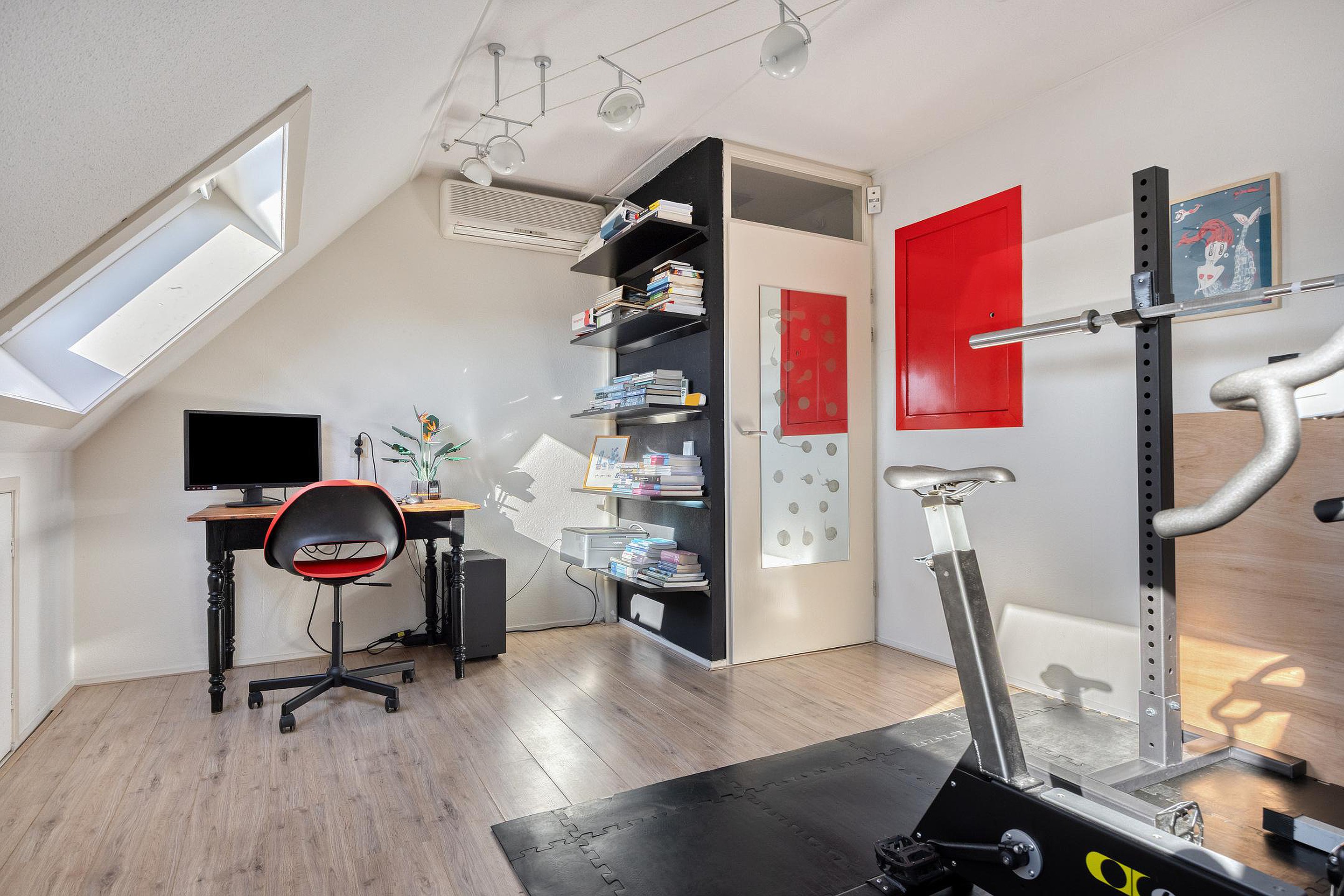 Hier bevindt zich een derde slaapkamer met airco, twee dakramen en praktische bergruimte achter de knieschotten.