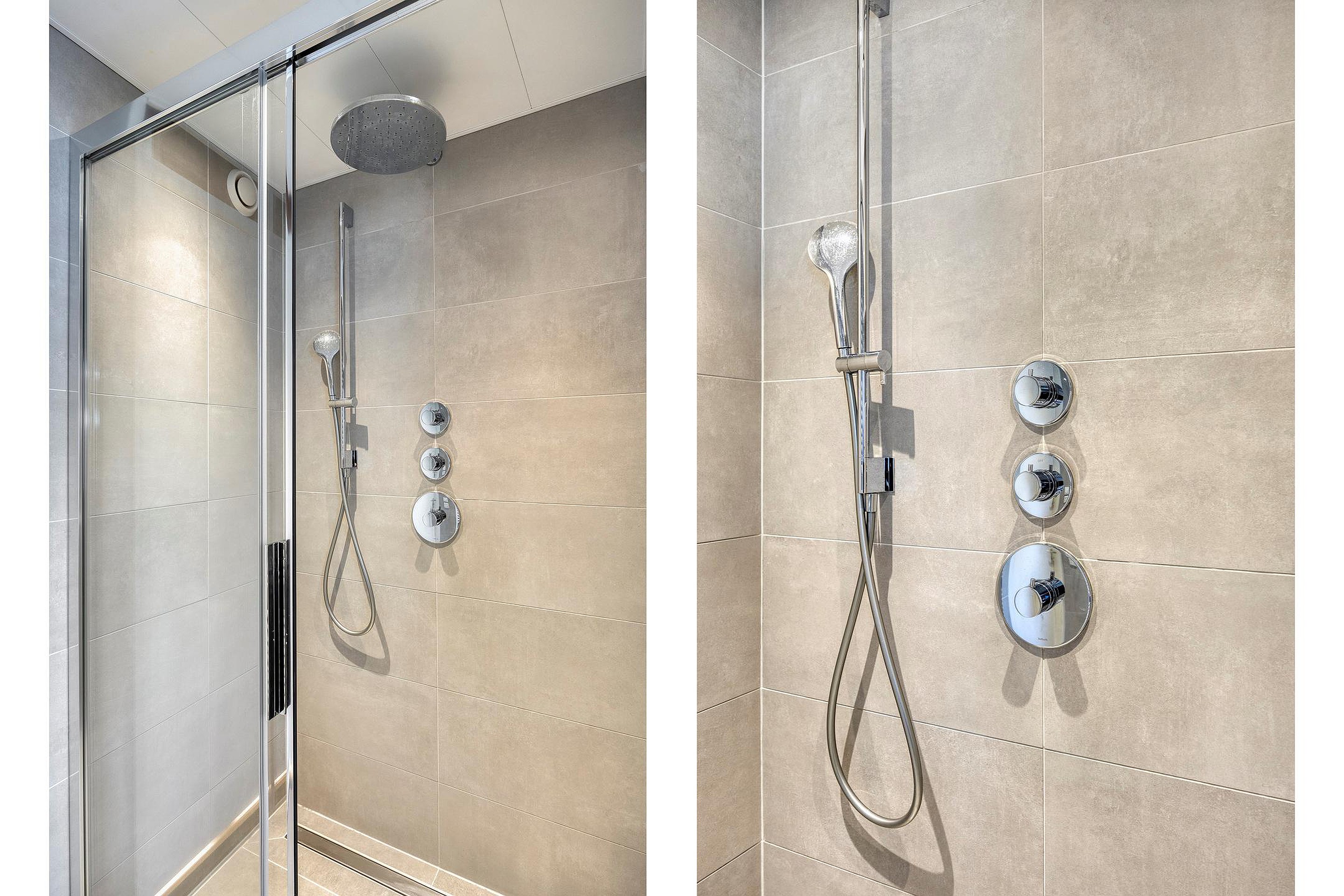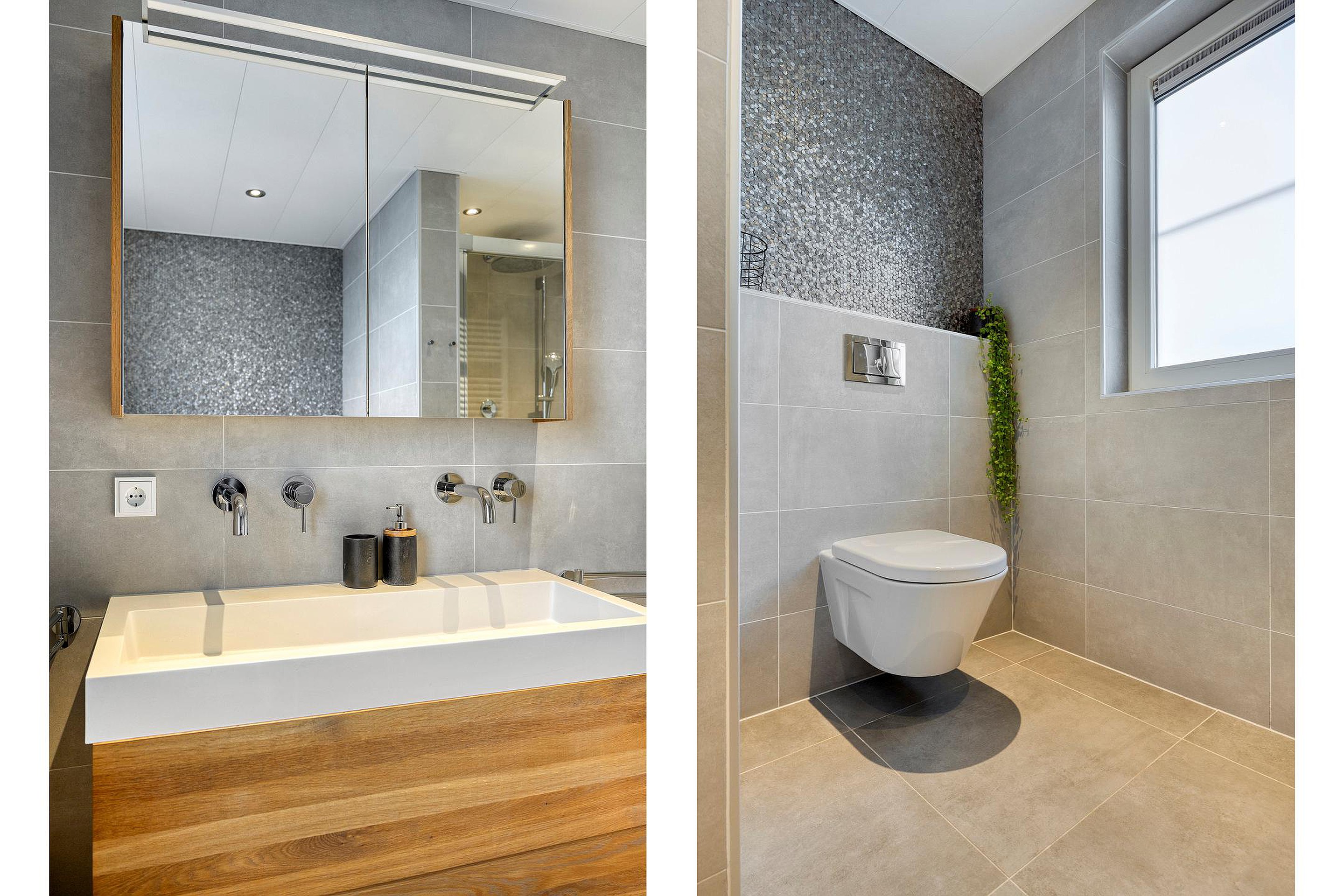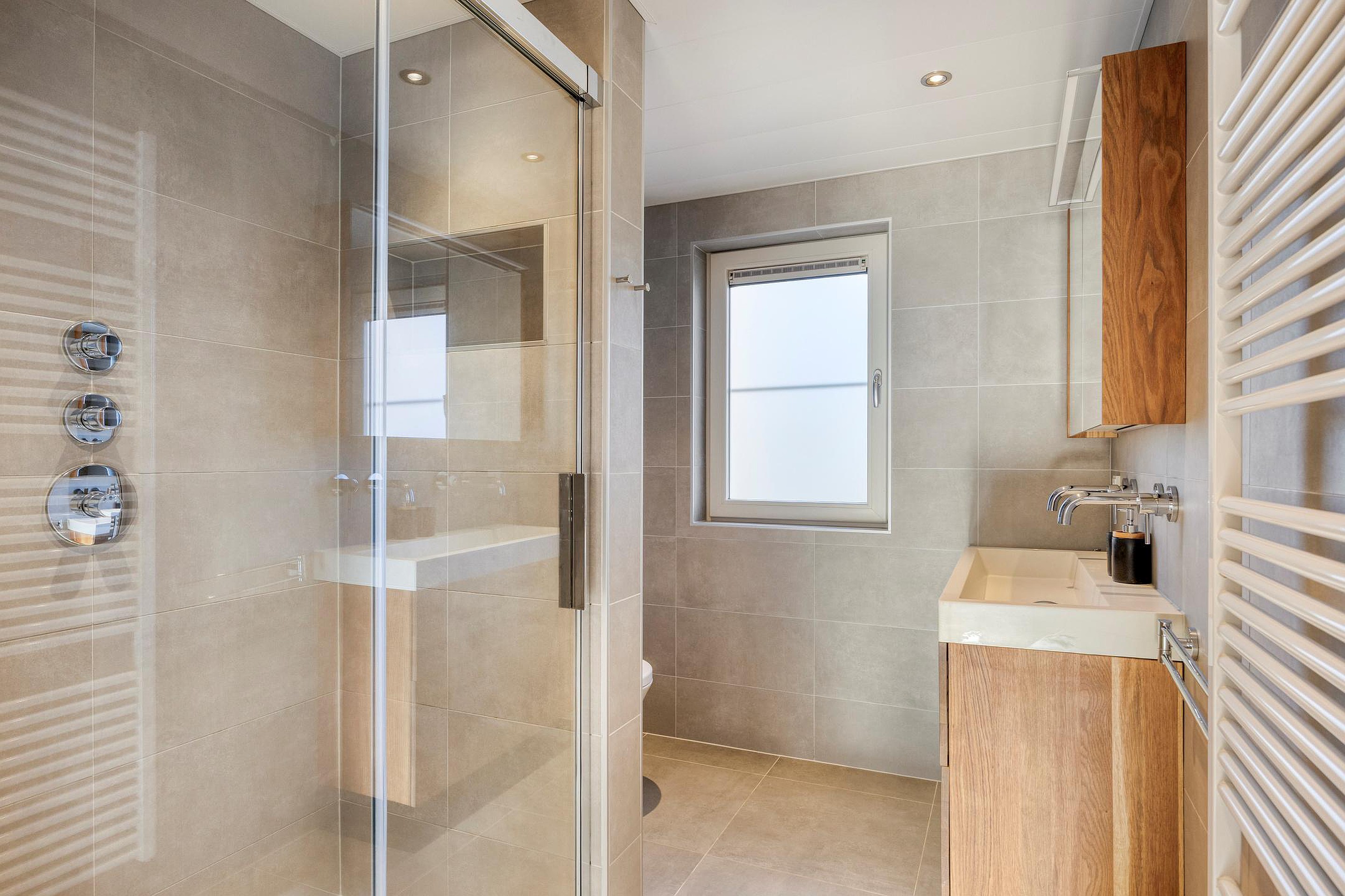 De luxe badkamer (2020) heeft een inloopdouche met handige nis, een modern wastafelmeubel met dubbele kraan en een tweede toilet.
