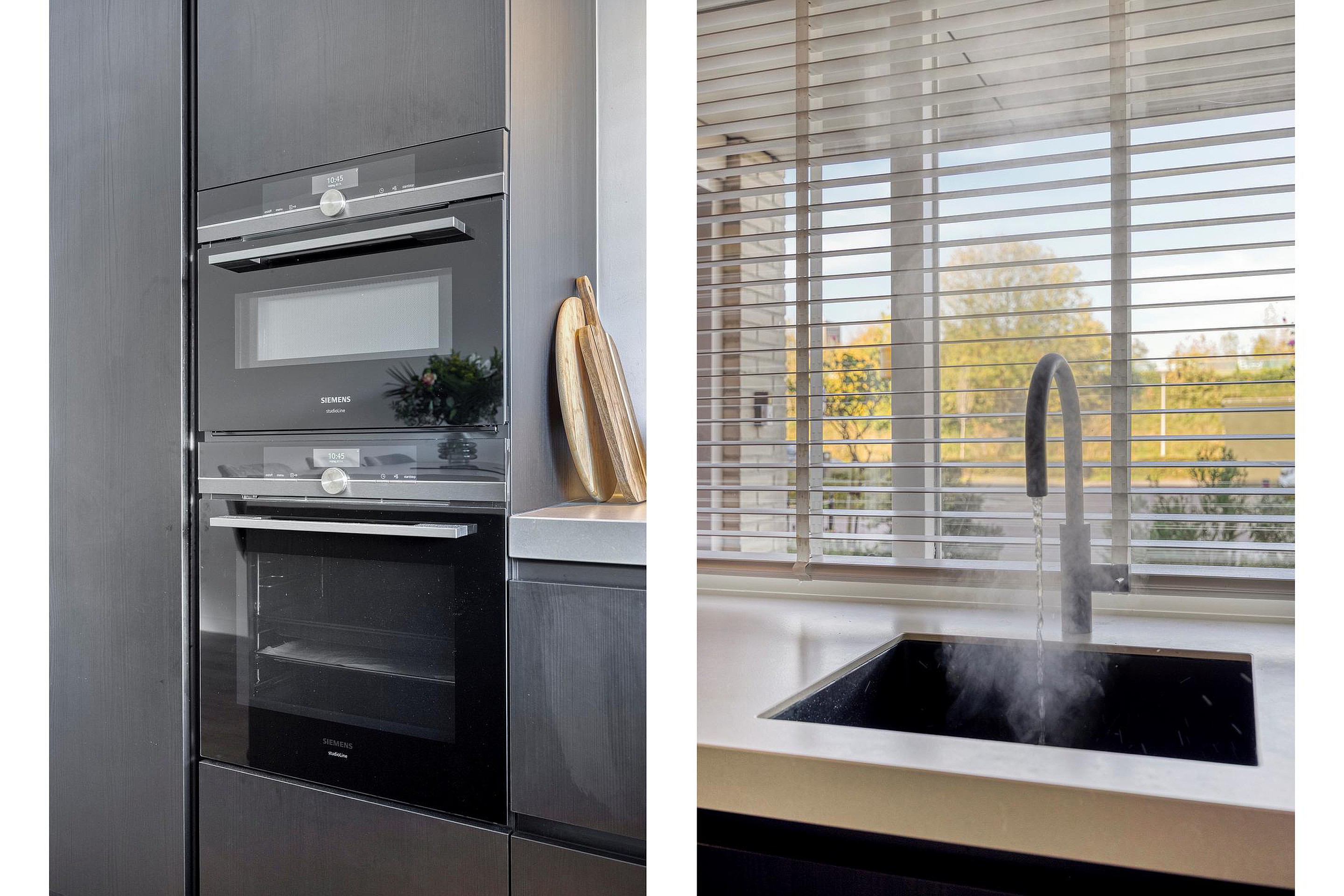 De keuken aan de voorzijde is een echte blikvanger. Deze luxe keuken (2023) is voorzien van een stijlvol kookschiereiland met een inductiekookplaat met geïntegreerd afzuigsysteem, oven, combi-oven/magnetron, koelkast, vriezer, vaatwasser en Quooker. Een droomplek voor iedereen die van koken en gezelligheid houdt.