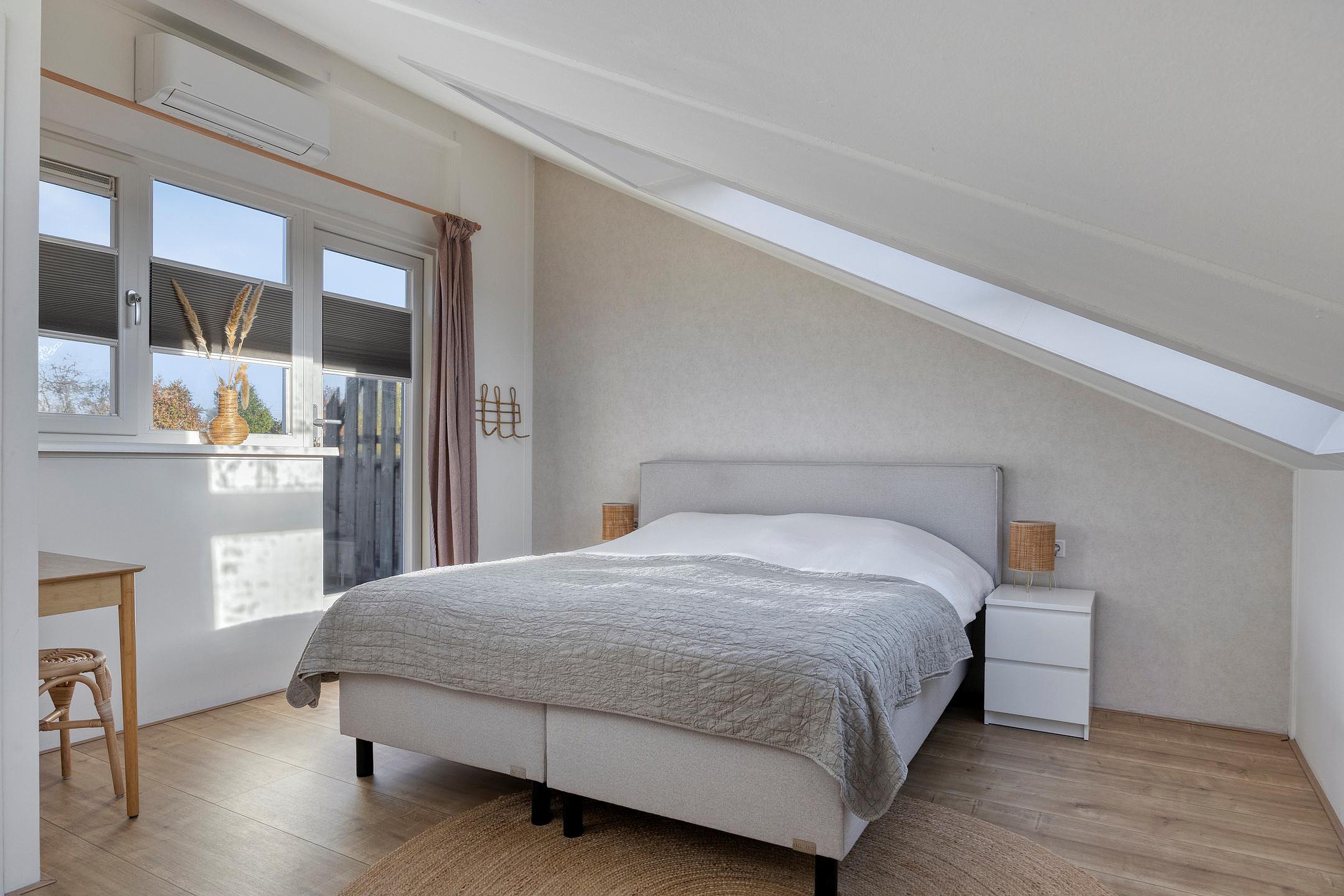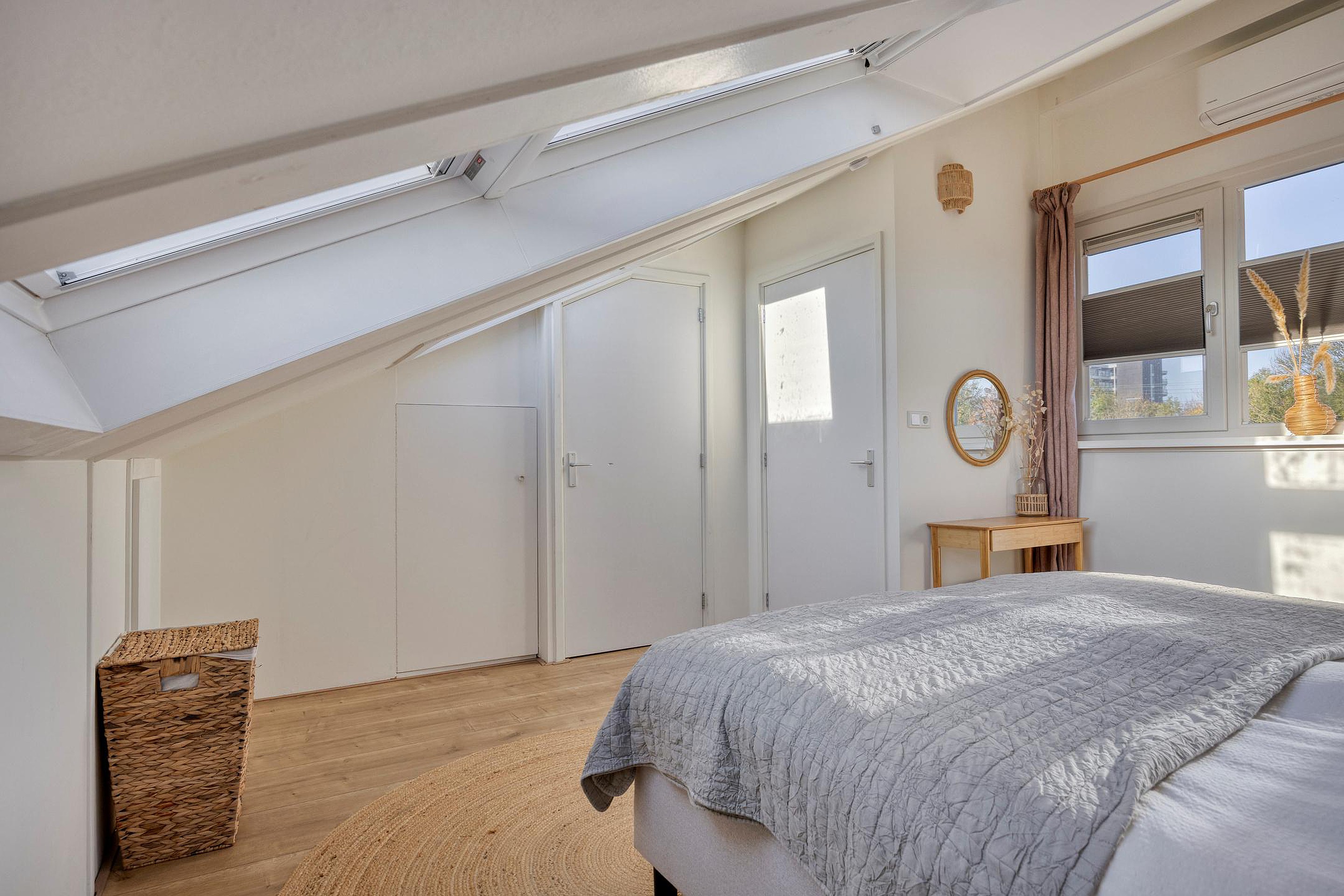 Tweede verdieping De tweede verdieping biedt een verrassende ruime vierde slaapkamer. De kamer is erg licht dankzij de dubbele Velux dakramen (met verduistering) en er is airconditioning aanwezig. De vaste kast beschikt over de aansluiting voor wasmachine en de Cv-installatie (2015). Daarnaast is er volop bergruimte achter de knieschotten.