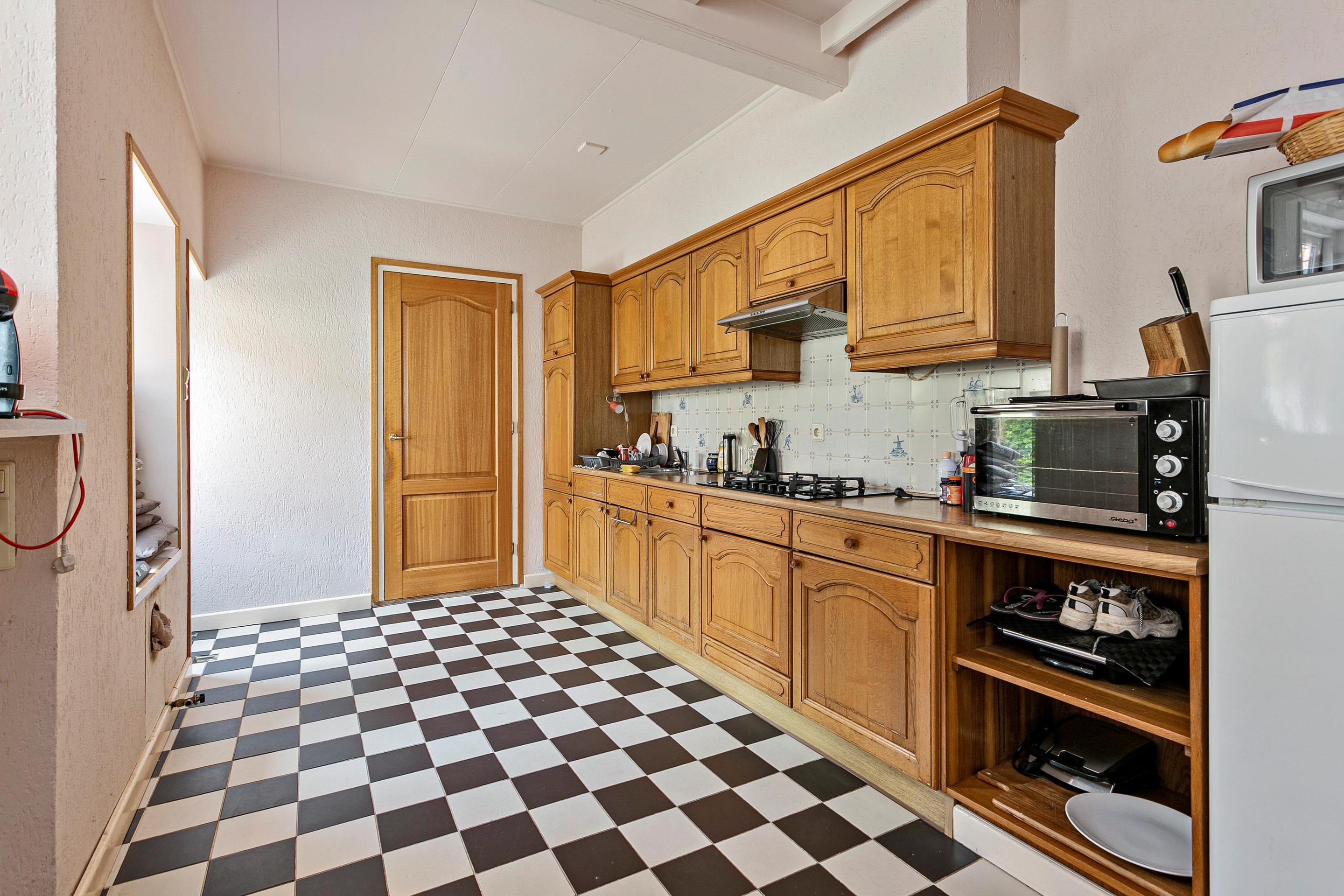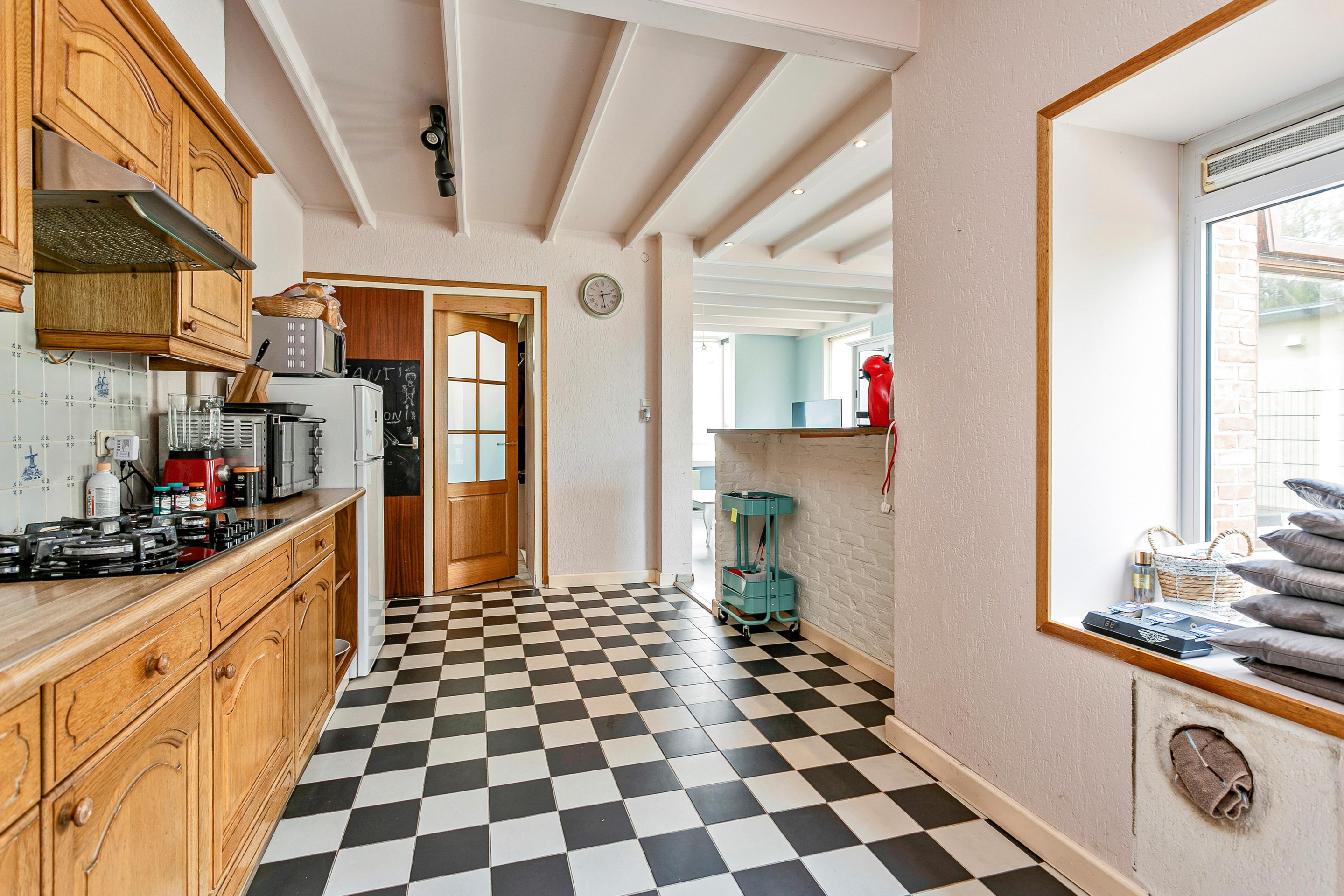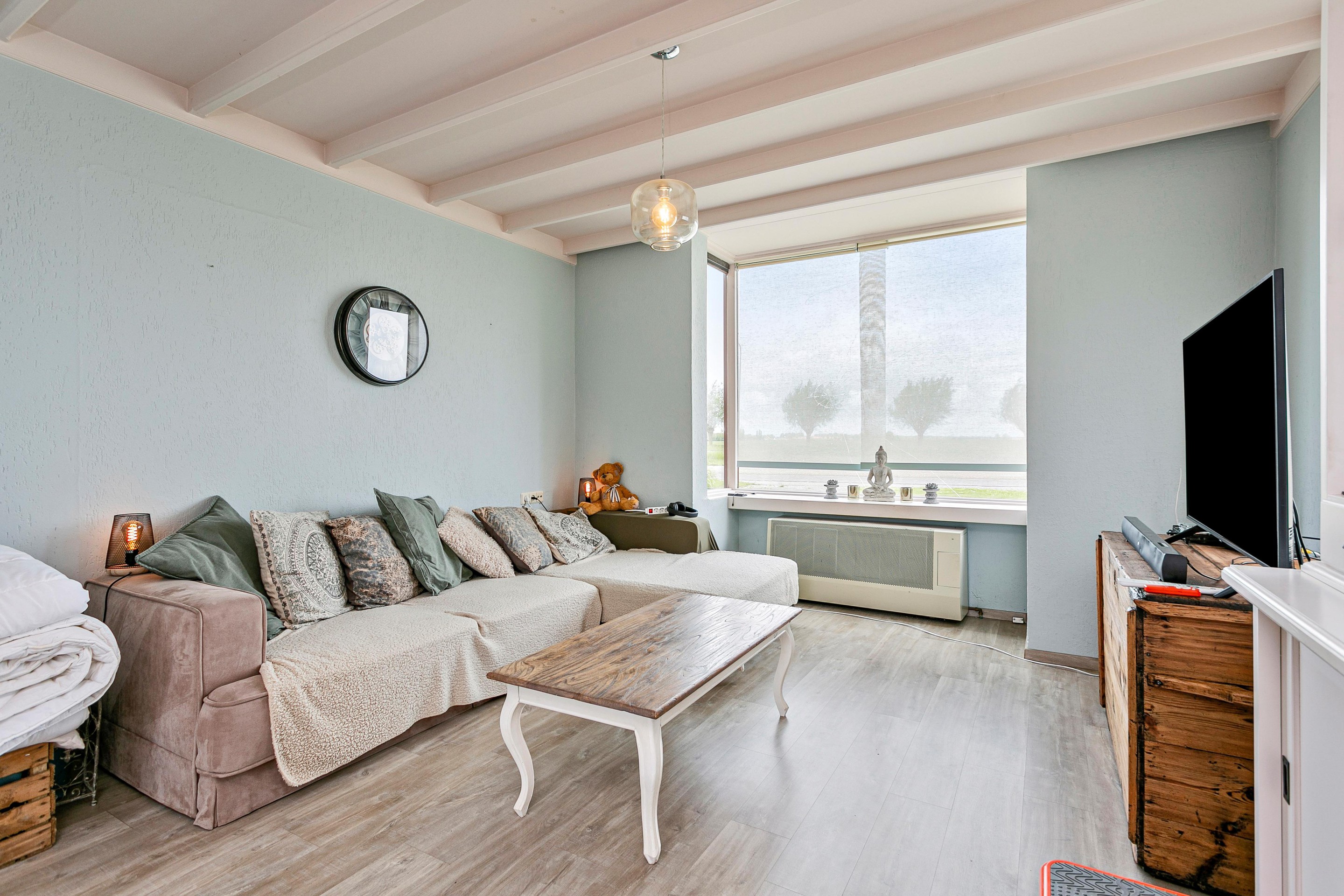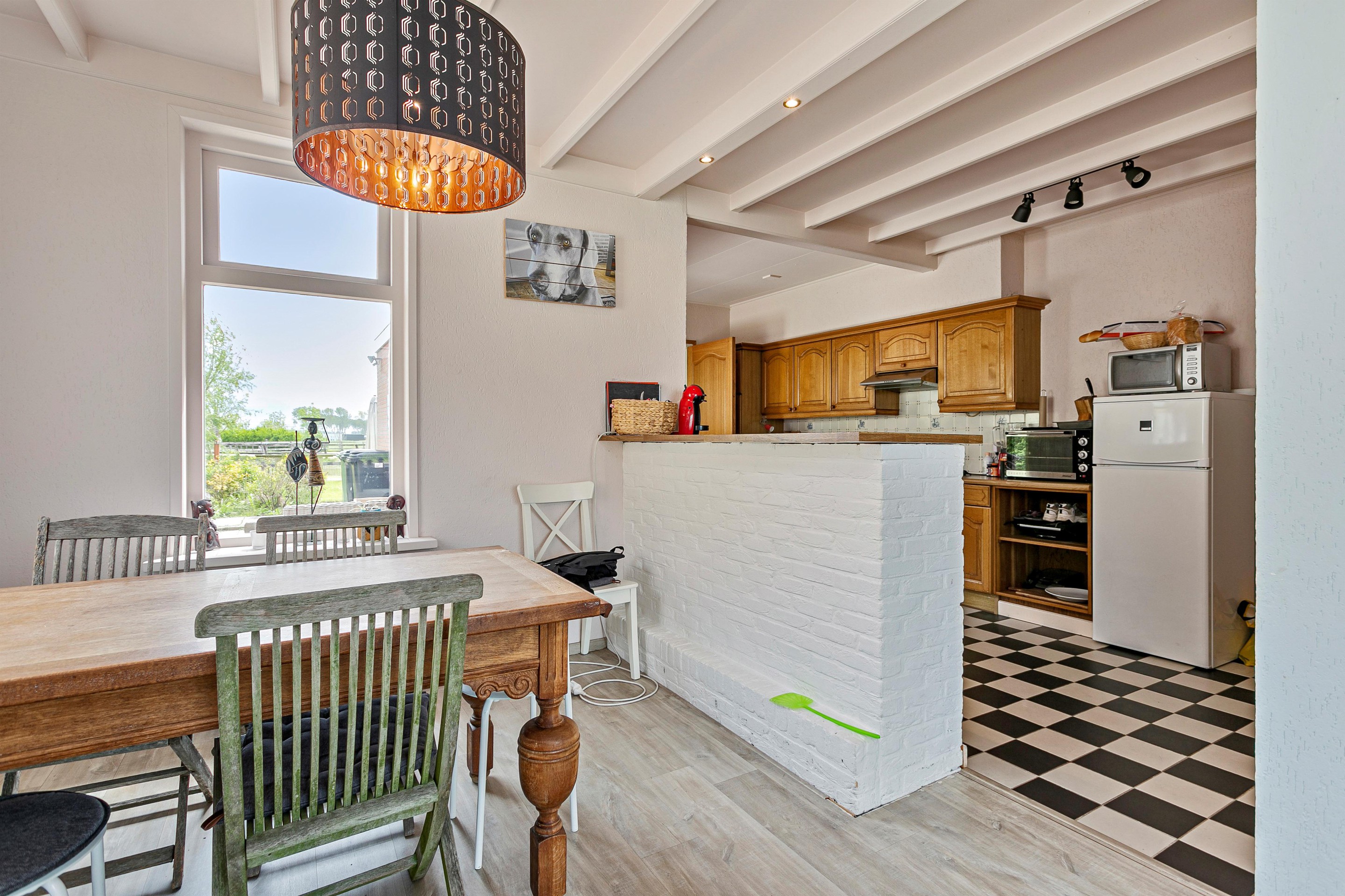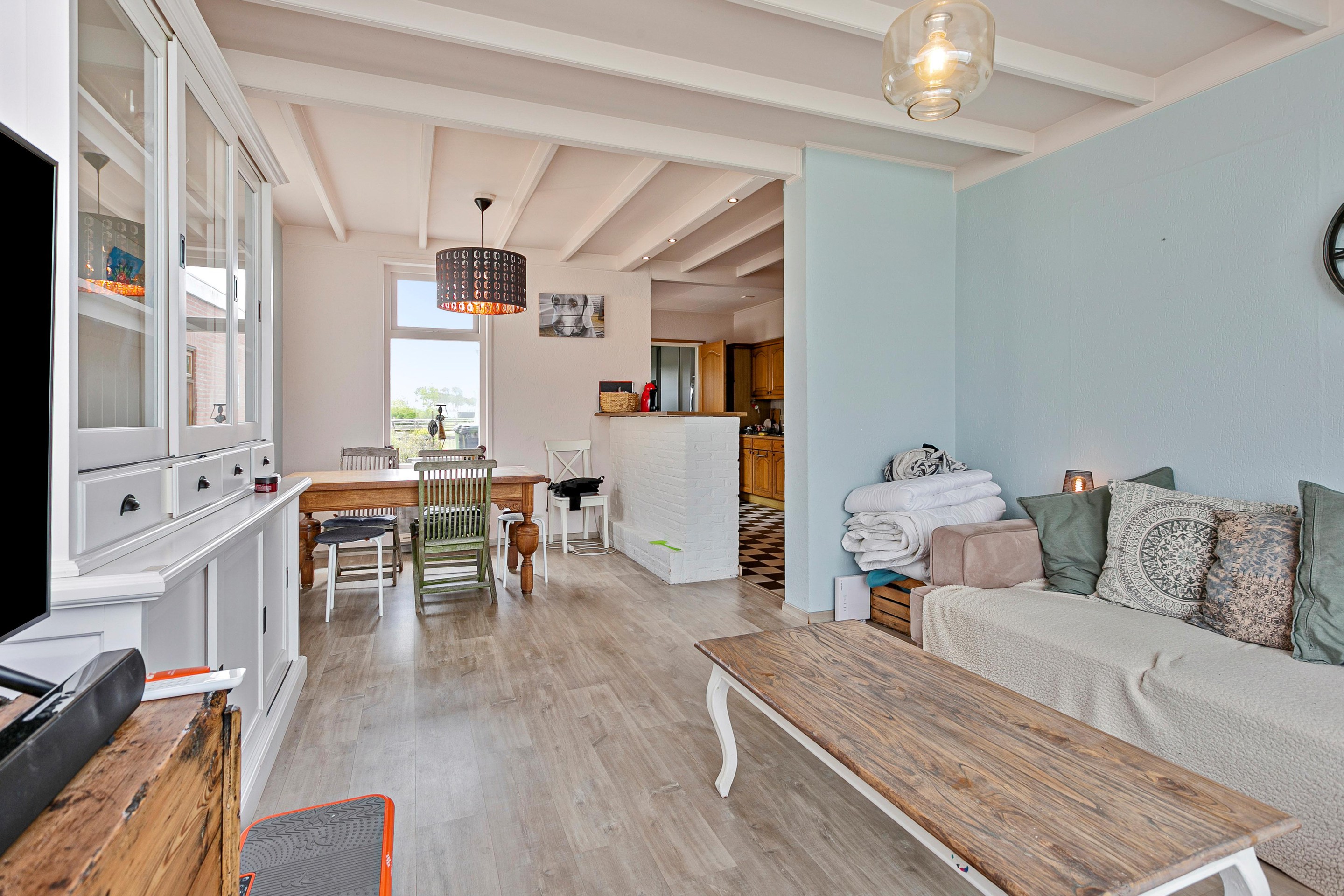 De ruime doorzonwoonkamer is maar liefst 6 meter lang, waardoor er ruimte genoeg is voor een gezellig eethoek. Middels het grote raam aan de achterzijde kijkt u vanaf hier naar de prachtige polders