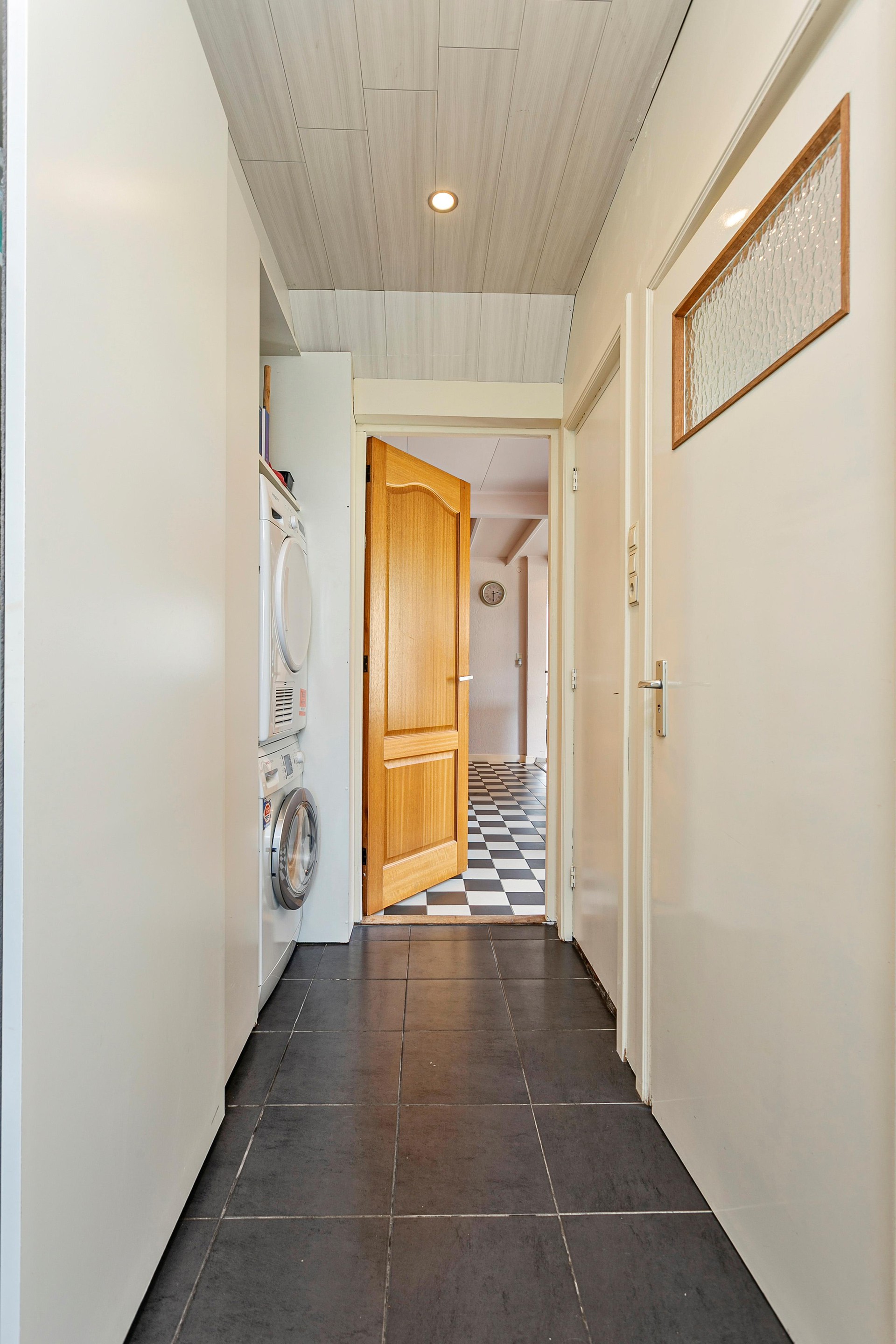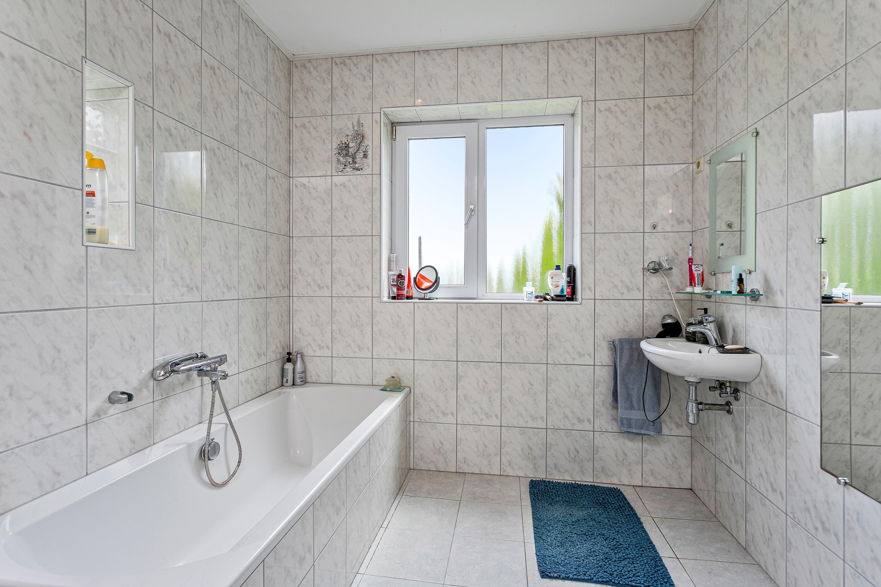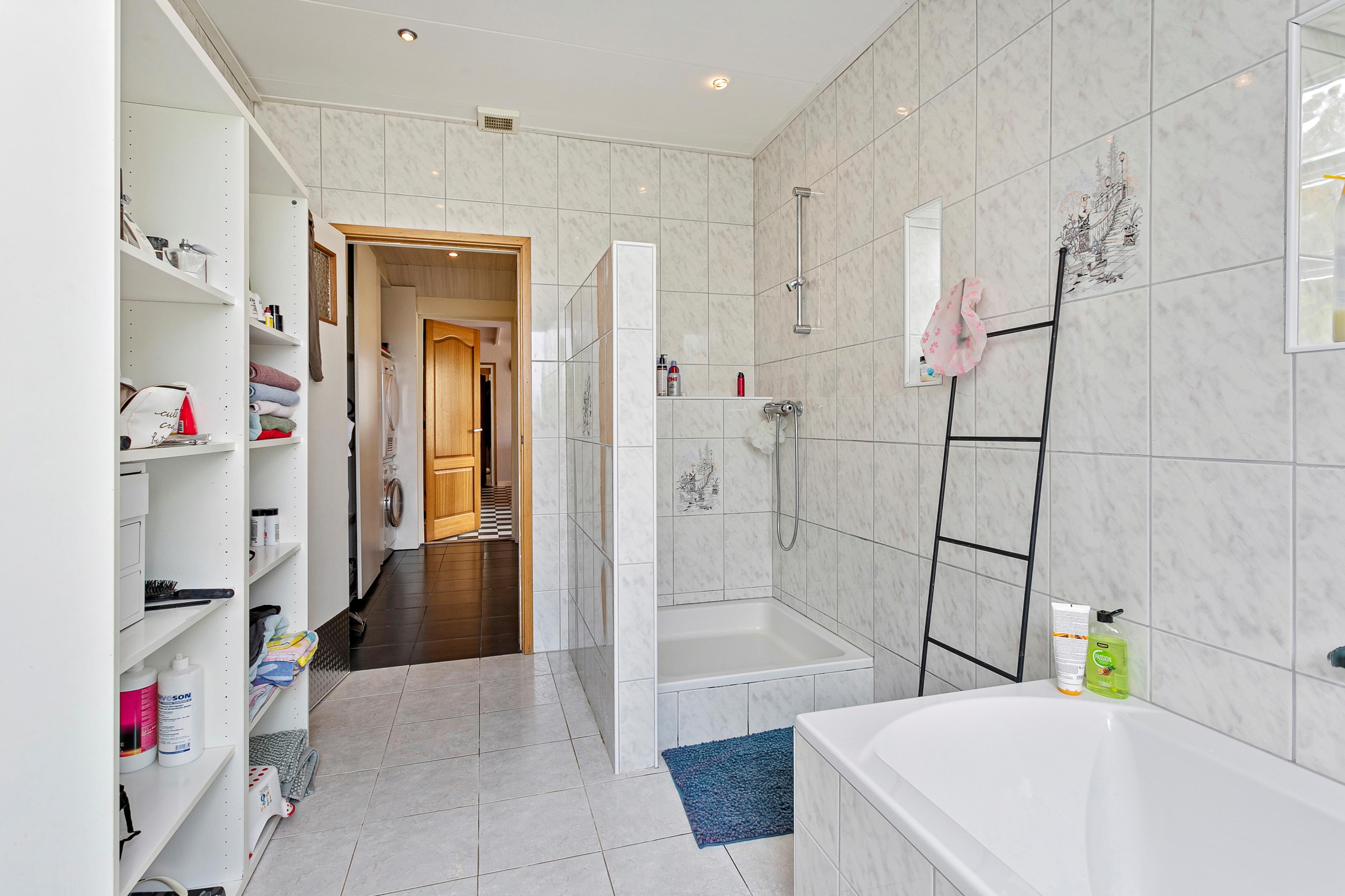 Aansluitend tref je aanbouw die in 2003 gerealiseerd is. In deze aanbouw treft u een hal met berging, toilet en aan het einde van de hal de badkamer. De badkamer is voorzien van een ligbad en een douche. Door de lichte tegels wordt er een open ruimte gecreëerd.