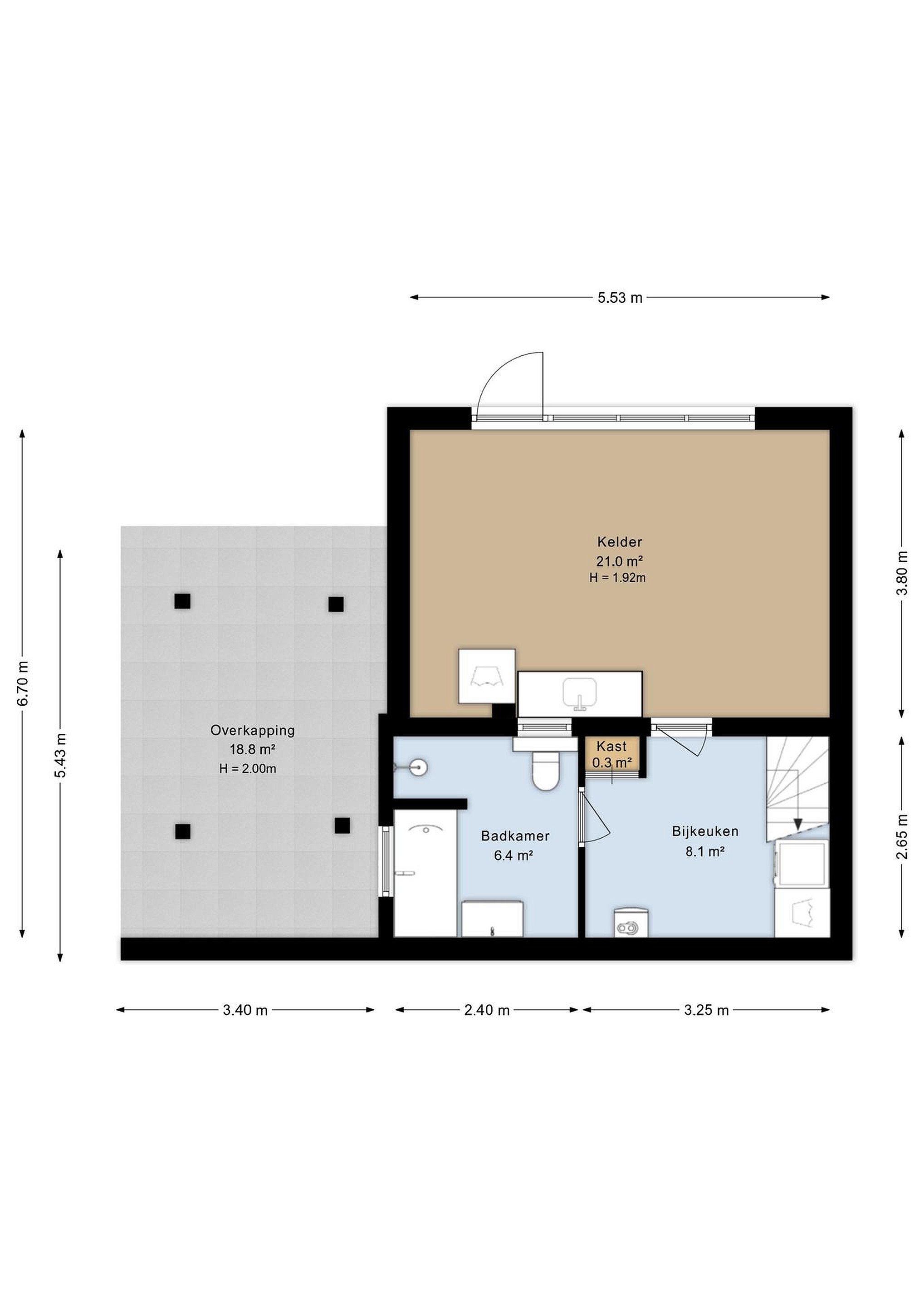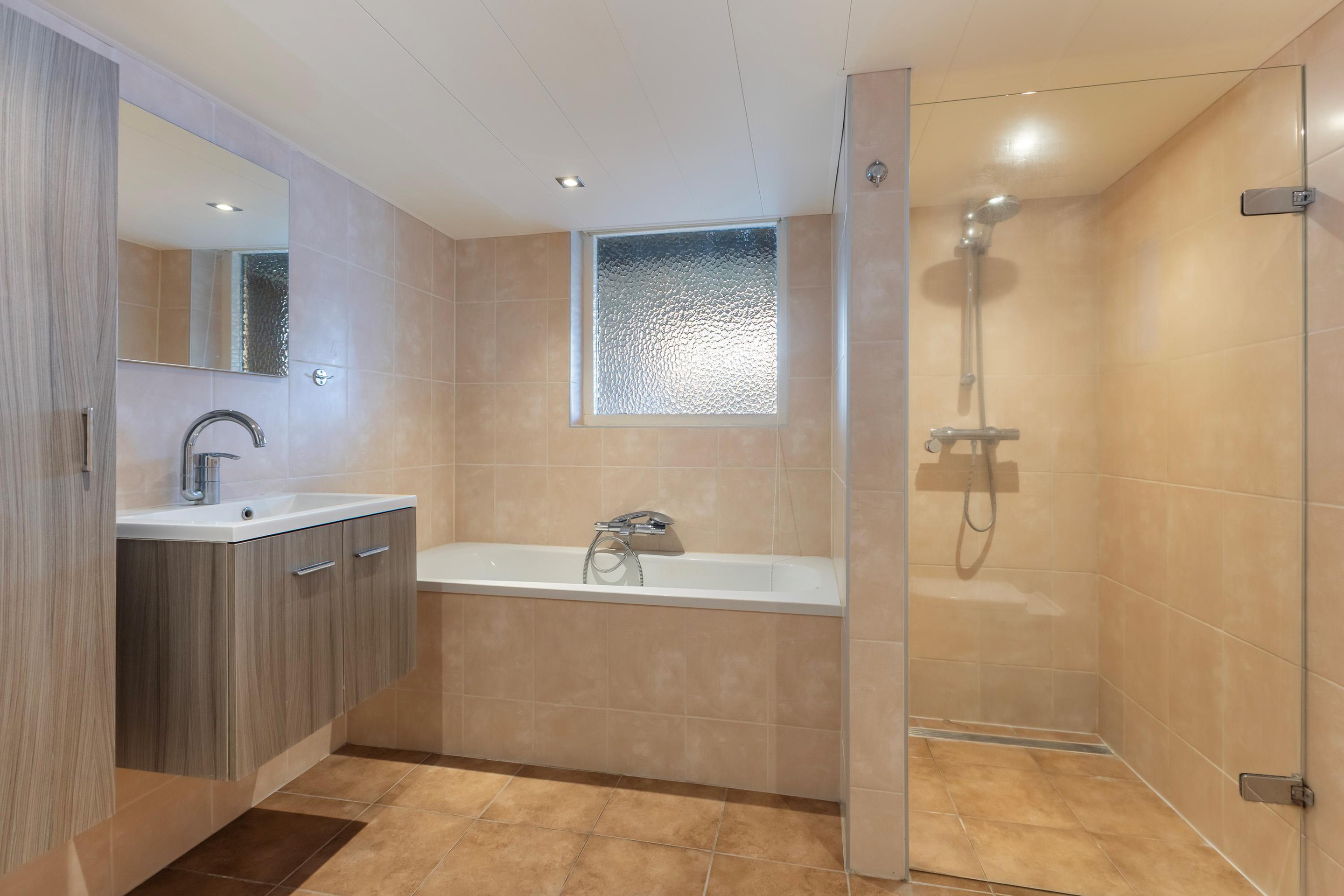 Vanuit de hal is er toegang naar het souterrain. Hier bevindt zich een bijkeuken met witgoedopstelling met toegang tot de badkamer en berging. De ruimte badkamer welke is uitgerust met een ligbad, douche, toilet en wastafel én comfortabele vloerverwarming. De berging geeft direct toegang naar de achtertuin. Deze ruimte is ideaal als provisieruimte, hobbyruimte of extra opslag.