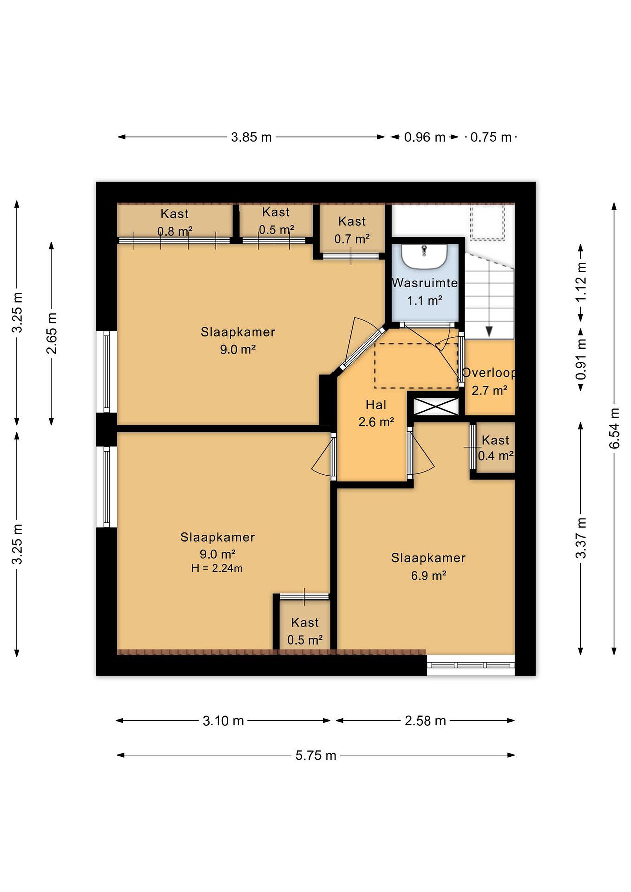 Op de eerste verdieping zijn een overloop, vaste kast en drie slaapkamers aanwezig van circa 9 m2, 9 m2 en 6,9 m2. Daarnaast is er op deze verdieping een separate ruimte met wastafel, wat bijvoorbeeld handig is als extra was- of verzorgingsruimte.