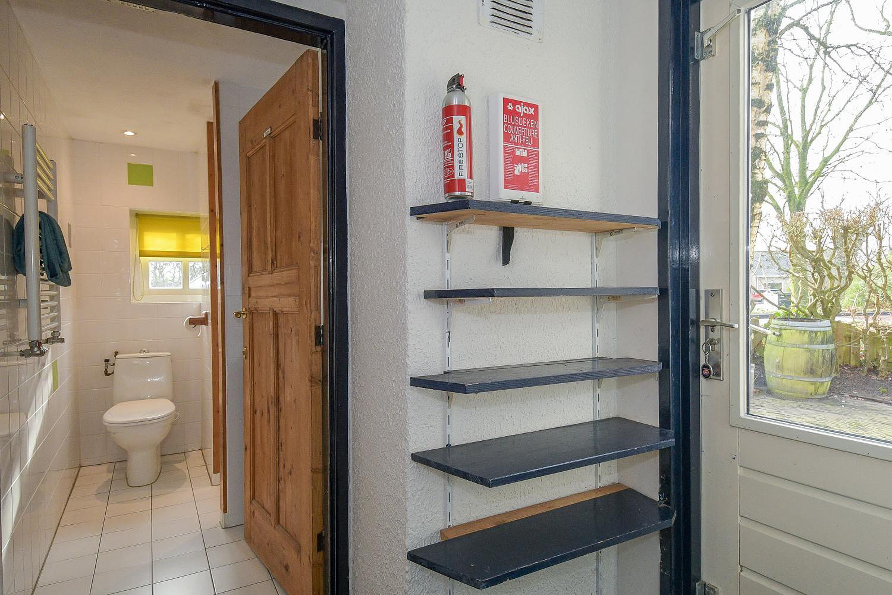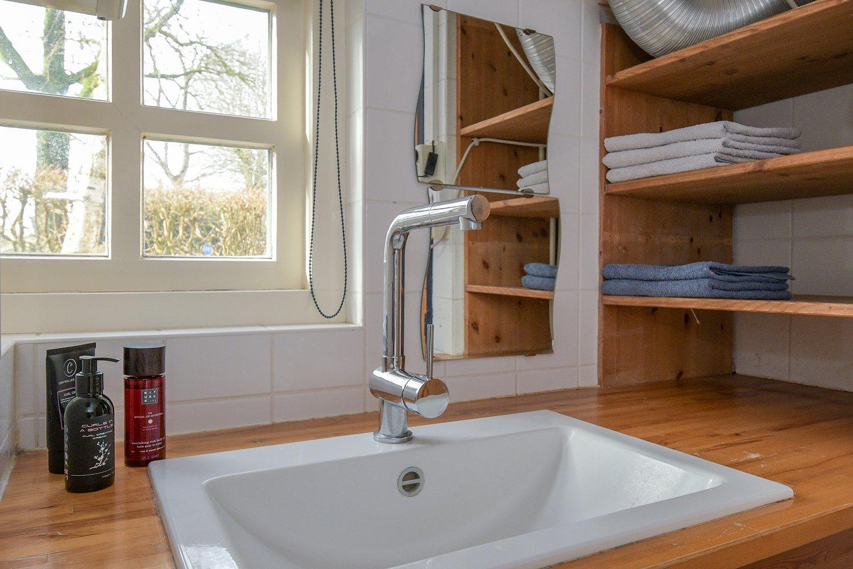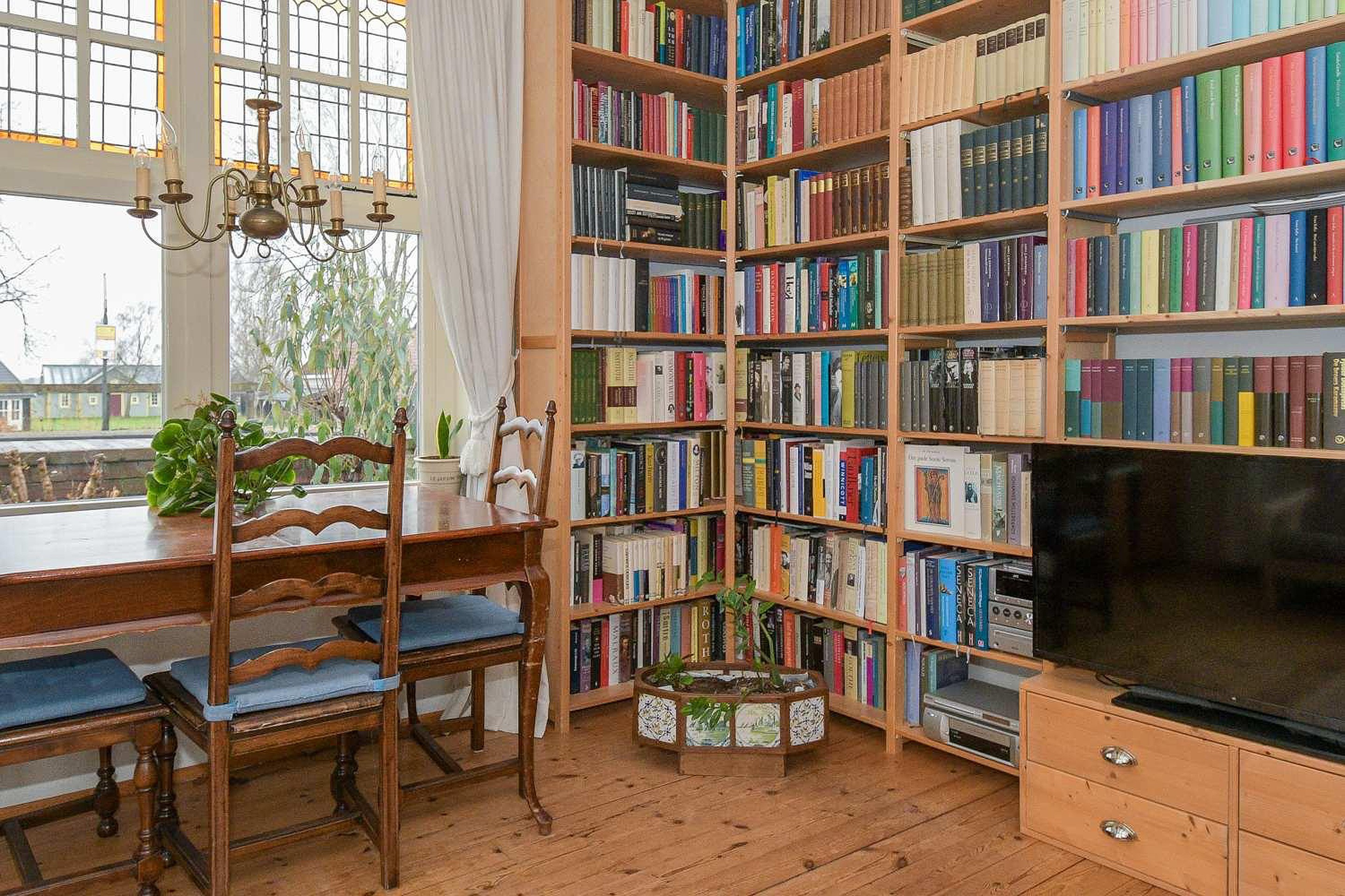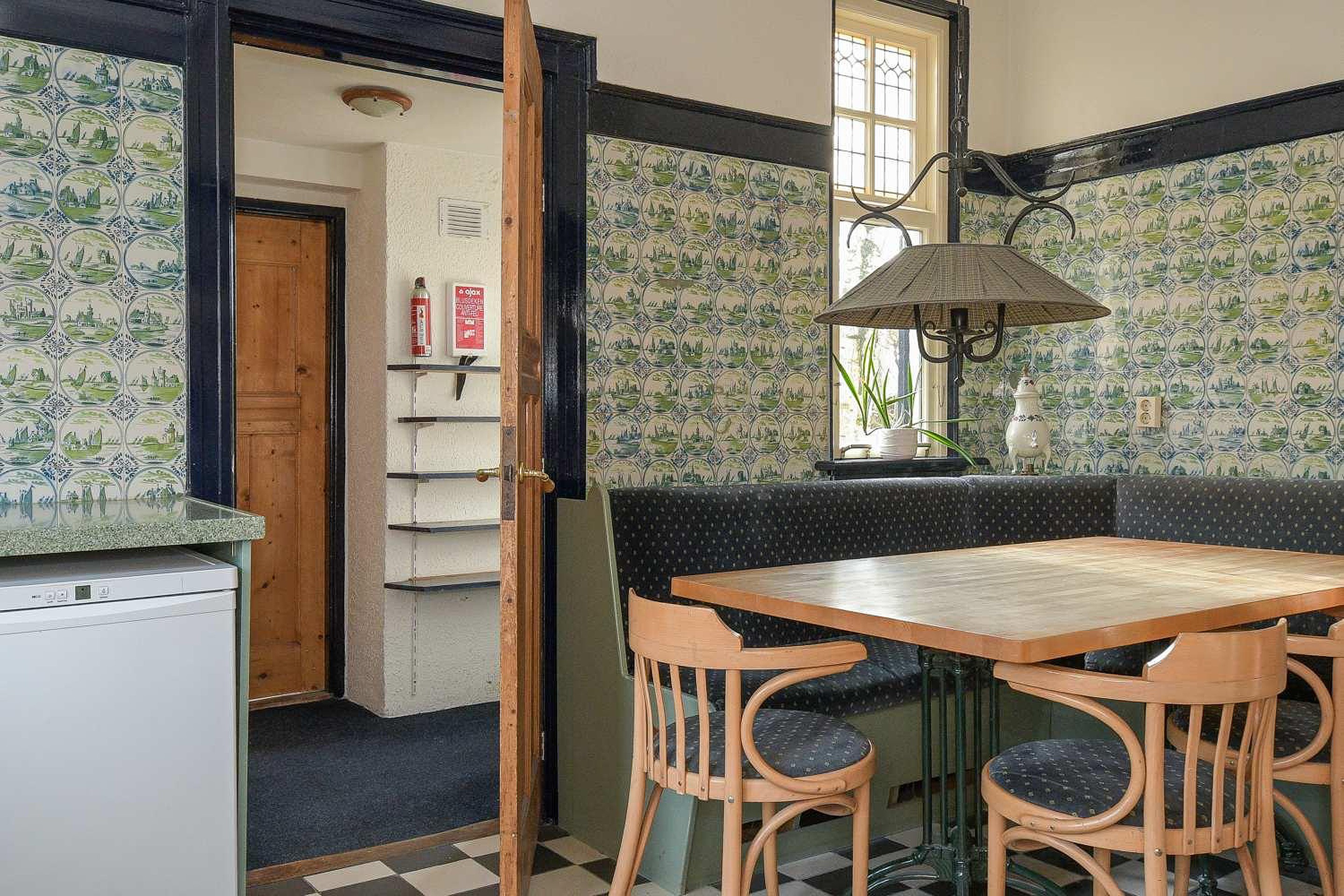 Er zijn twee badkamers met doucheruimte en wastafel, waarvan de één met een extra toilet en de ander met een urinoir. Beide badkamers beschikken over vloerverwarming. De woonkamer heeft een oppervlakte van 34 m2. Het hoge plafond met balken in het zicht, de glas-in-lood ramen en de schouw geven deze leefruimte een fijne sfeer en statige uitstraling. Aan de voorzijde van de woning bevindt zich een extra ruimte die momenteel in gebruik is als kantoor/werkruimte. Hier hield vroeger het polderbestuur van de Groote Veenpolder in Opsterland kantoor. De werkruimte beschikt over een infraroodpaneel.