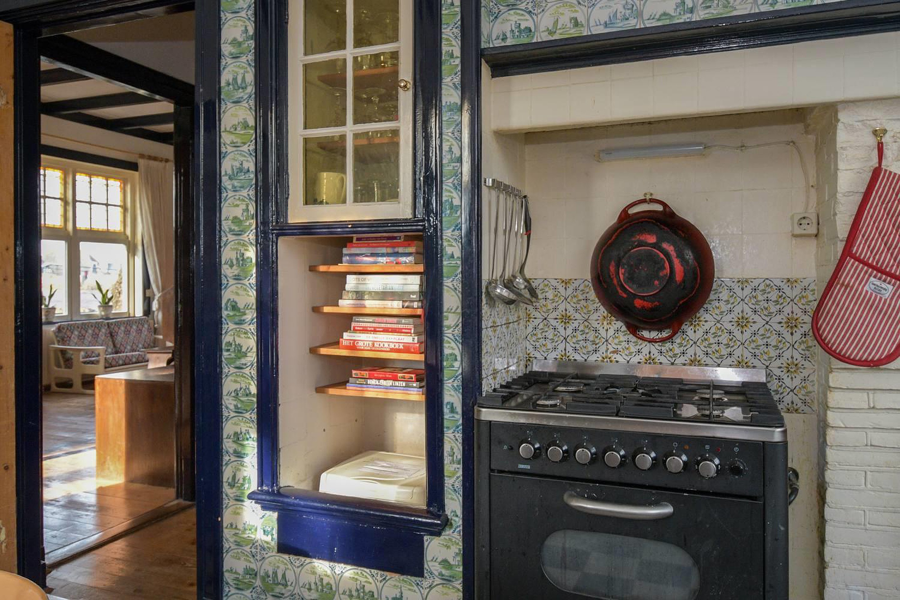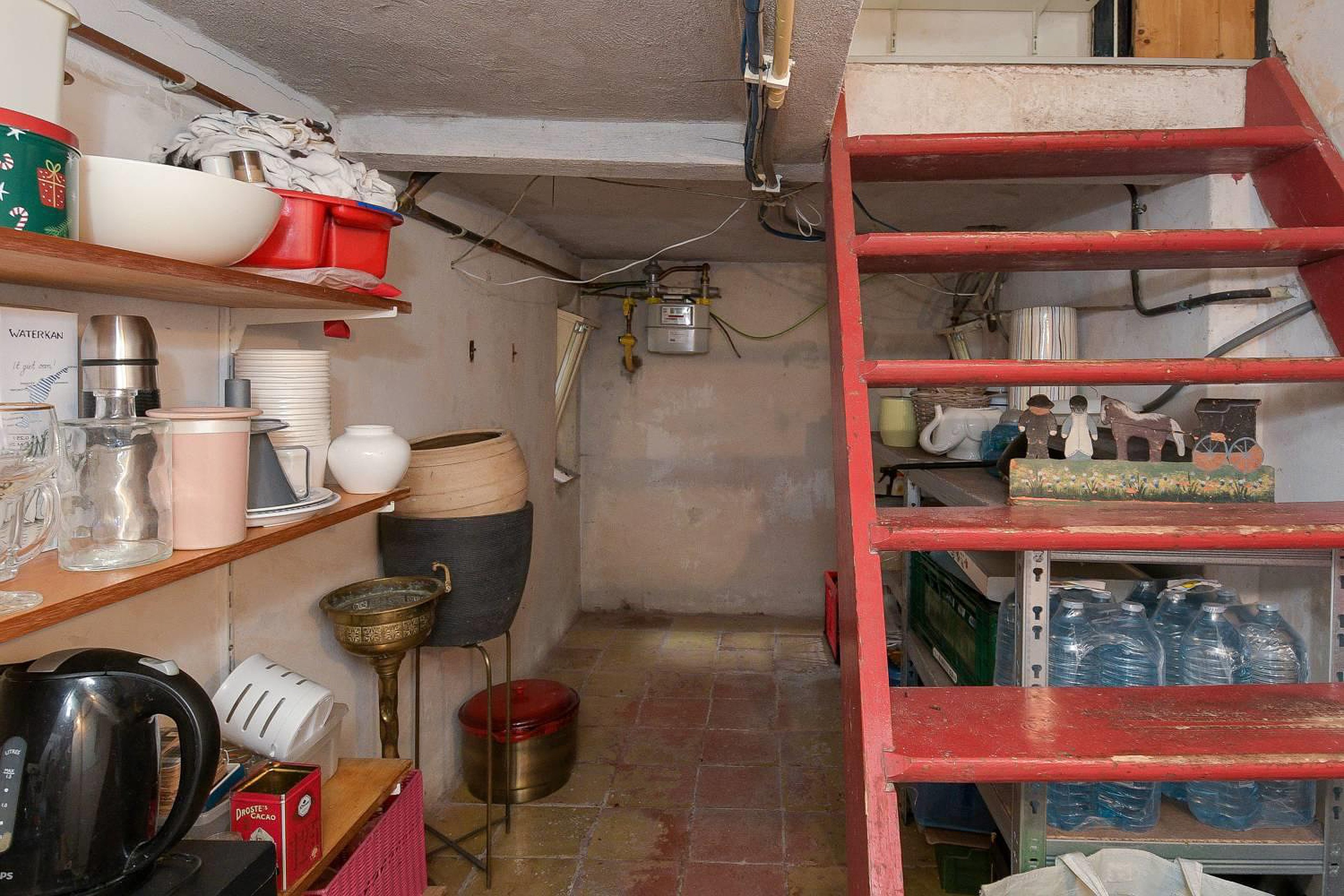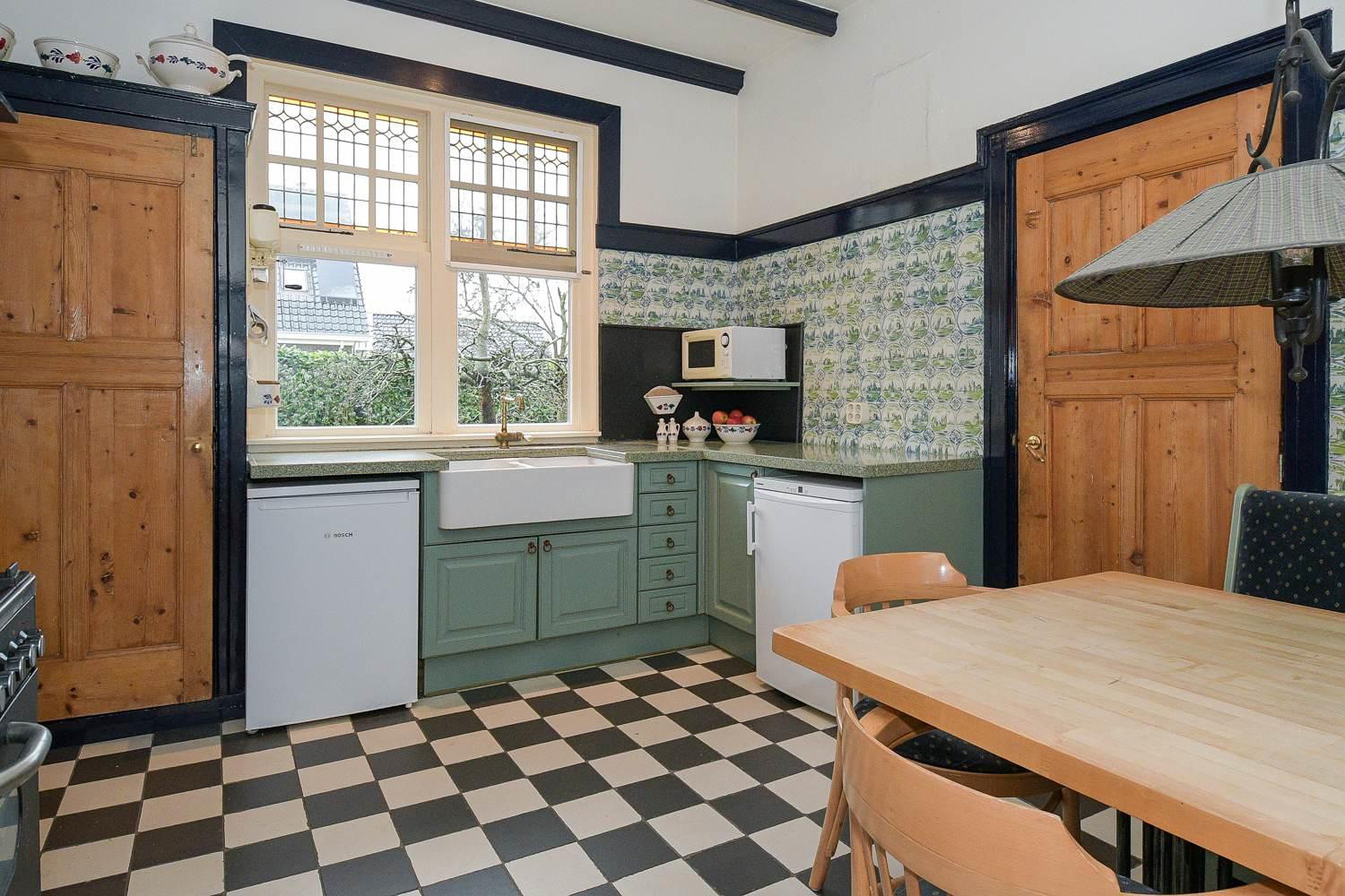 Begane grond Entree, moderne meterkast (2024), saloondeur, hal en trapopgang naar eerste verdieping. Vanuit de hal kom je in de keuken. De keuken ademt de sfeer van weleer. De prachtige tegeltjeswanden en glas-in-loodramen doen nostalgisch aan. De keuken beschikt over vloerverwarming. De keuken met natuurstenen werkblad biedt ruimte aan een diepvries, koelkast en een groot gasfornuis met oven. Toegang tot de diepe, ruime, droge kelder met plavuizen vloer. Via de keuken kom je in de bijkeuken waar zich het toilet bevindt, de witgoedaansluitingen en hybride warmtepomp met HR CV ketel.