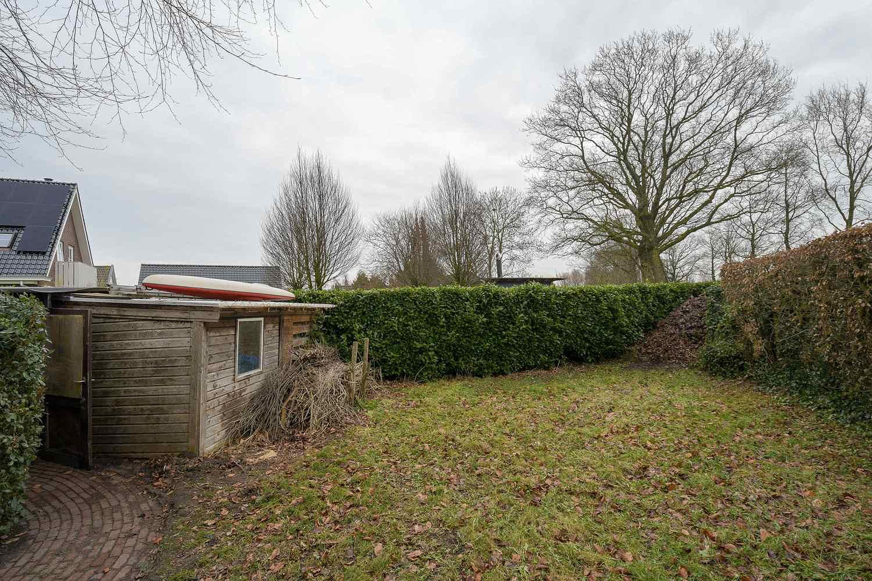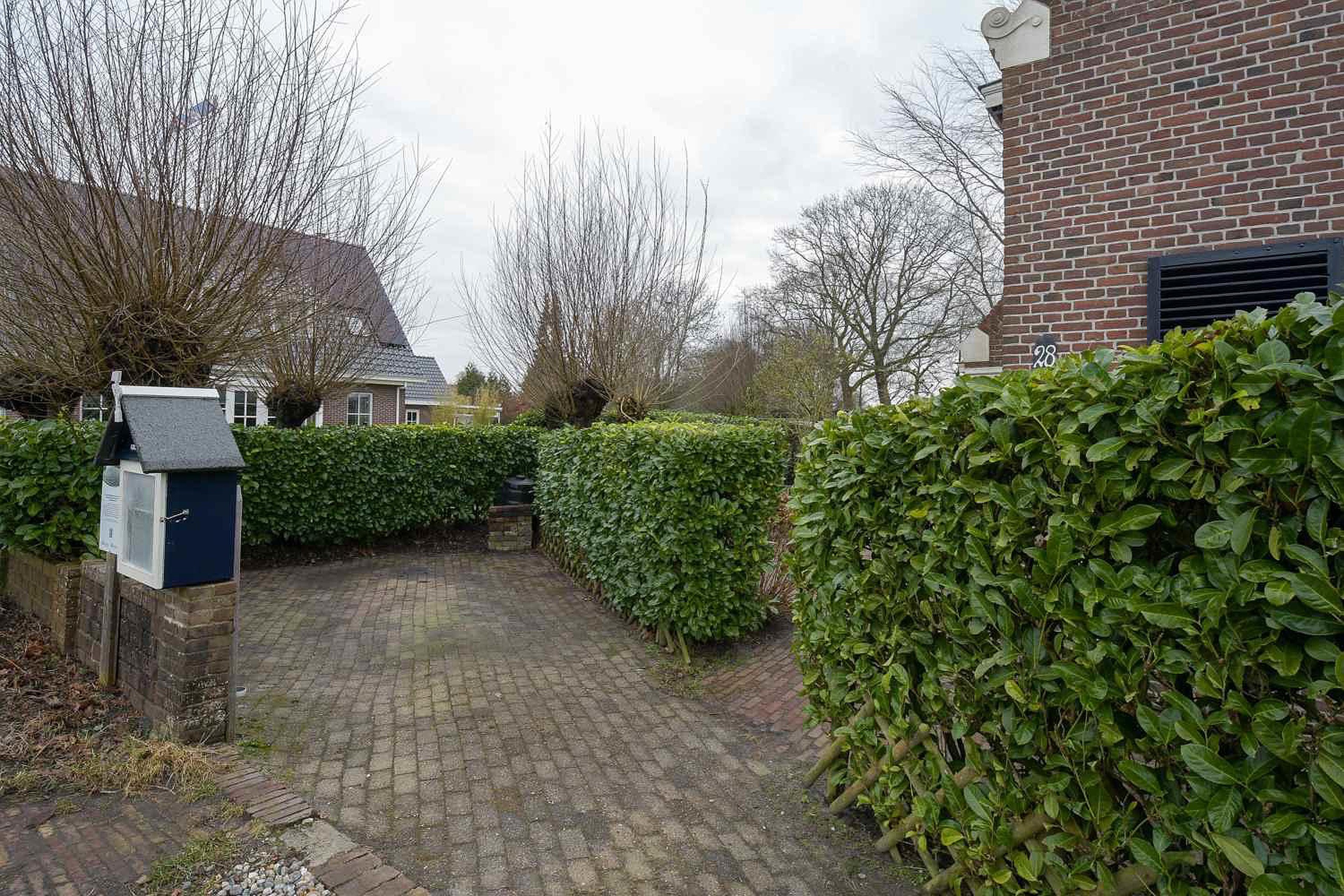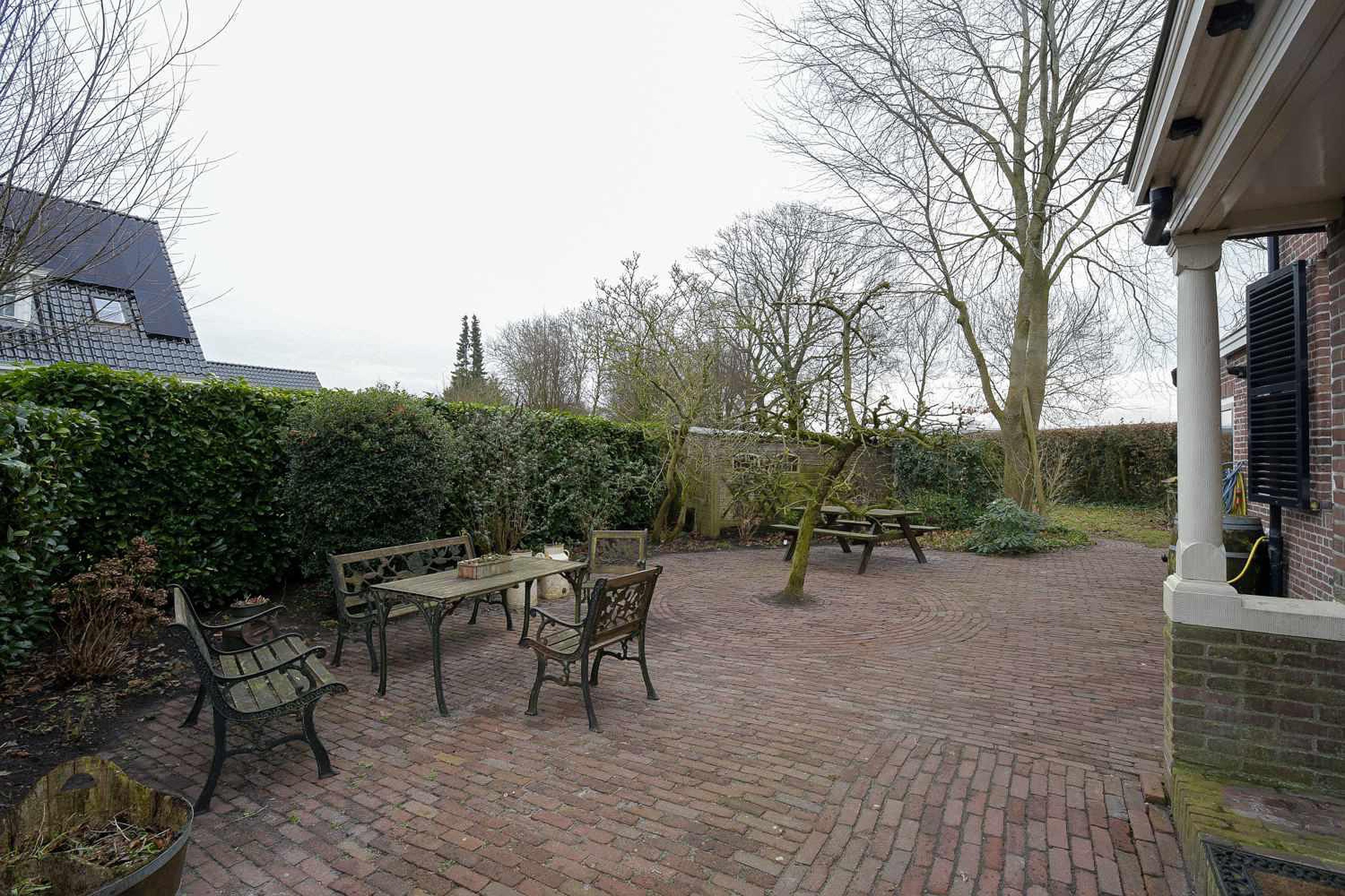 Tuin De groene tuin biedt veel privacy door de fraaie heg en de bomen/struiken. De achterzijde van de tuin is gelegen op het zuiden, heeft een driehoekige vorm met een afstand van 25 meter naar het diepste punt. De voortuin is 5 meter diep en 25 meter breed. De tuin aan de zijkant van de woning is grotendeels bestraat met oude klinkers en heeft diverse terrassen. Hier staat een ruime vrijstaande houten schuur, geschikt voor stalling van fietsen en als opbergruimte. Op het terrein is ook een ruime eigen parkeerplaats.