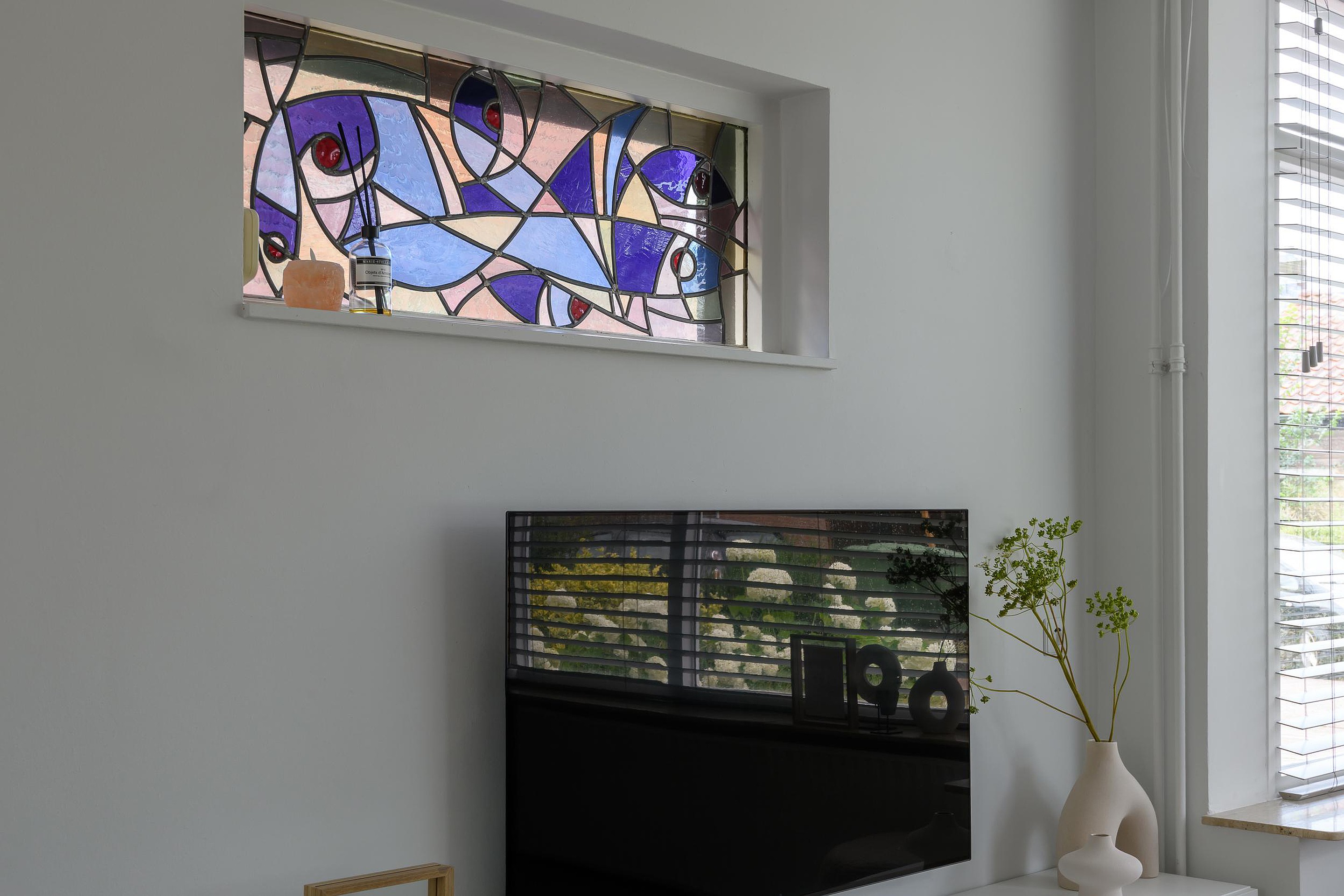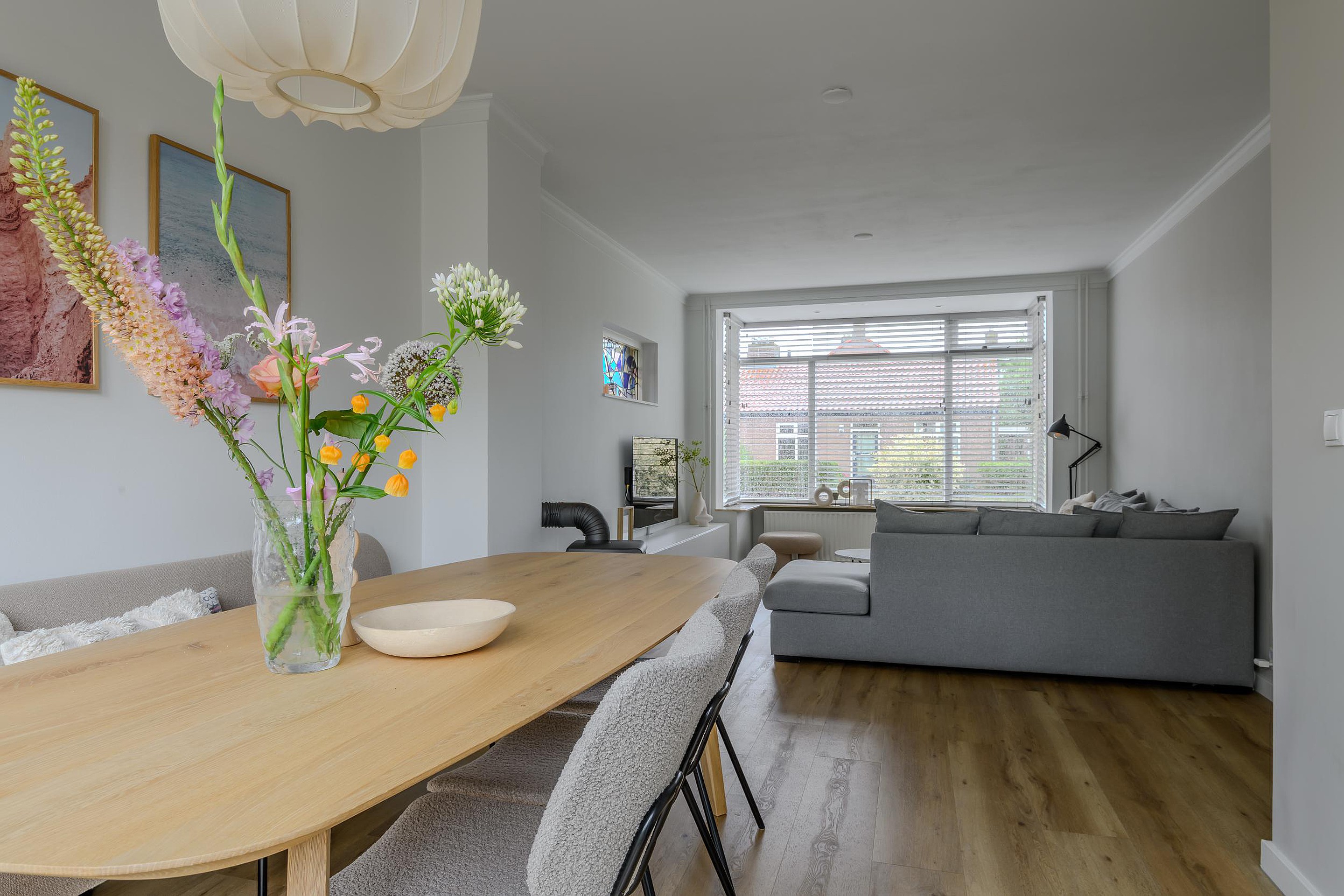 De lichte woonkamer met erker is voorzien van een mooi en bijzonder glas -in loodwerk, ruimte voor een eet- en zithoek en openslaande tuindeuren naar de sfeervolle achtertuin. Tevens staat er een gezellige houtkachel. Ook vanuit de moderne keuken kunt u naar de achtertuin. De prachtige keuken zit in een aparte ruimte en met het open raam is er een gezellige connectie met de eetkamer. De keuken is van alle gemakken voorzien: