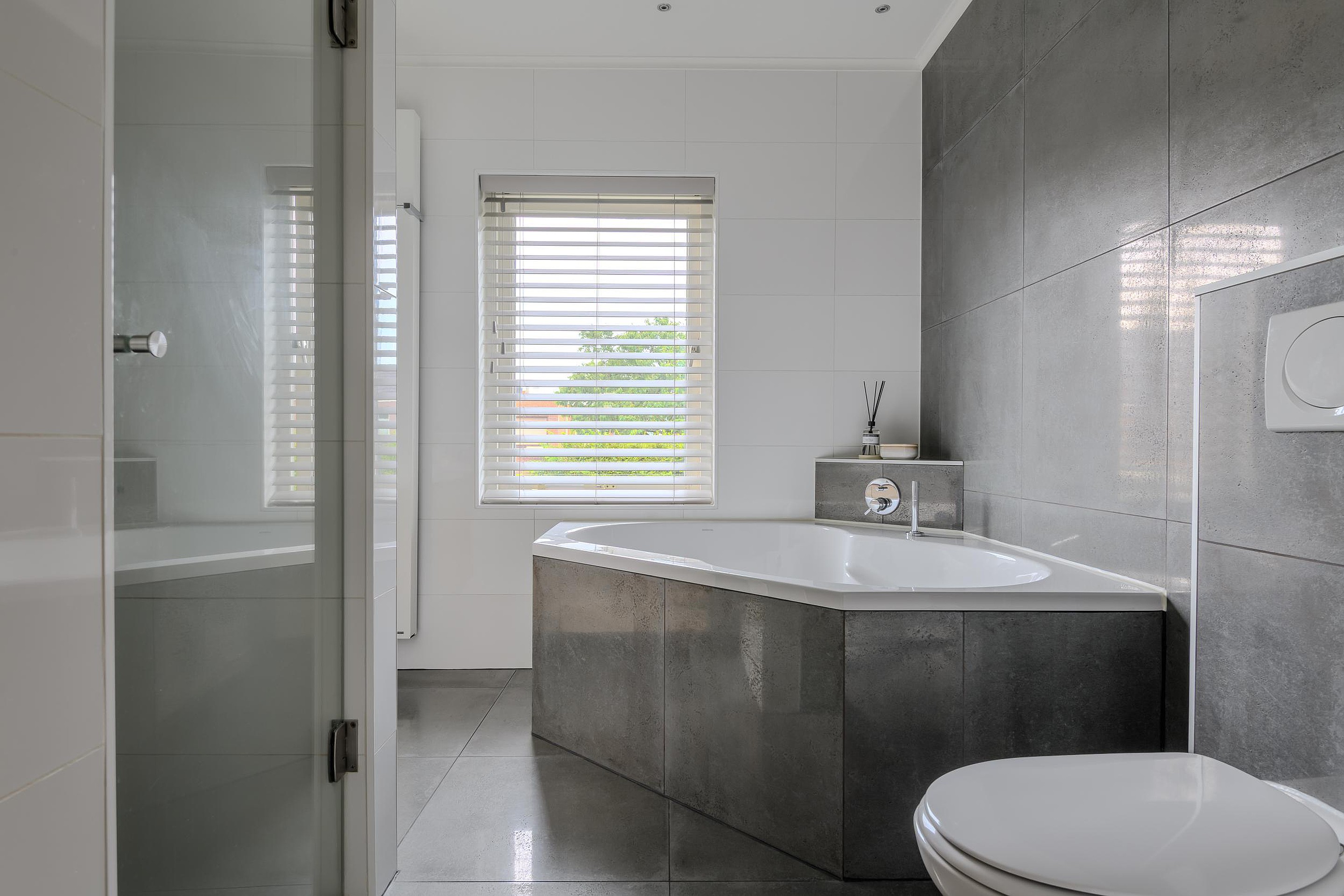 Eerste verdieping Op de eerste verdieping liggen 2 zeer ruime slaapkamers en 1 kleinere slaapkamer. De master bedroom is voorzien van airco met extra veel capaciteit, waardoor deze de in de zomer de gehele benedenverdieping verkoelt. De ruime badkamer is voorzien van een hoekligbad, inloopdouche, modern wastafel meubel, design radiator, vloerverwarming en een zwevend toilet.