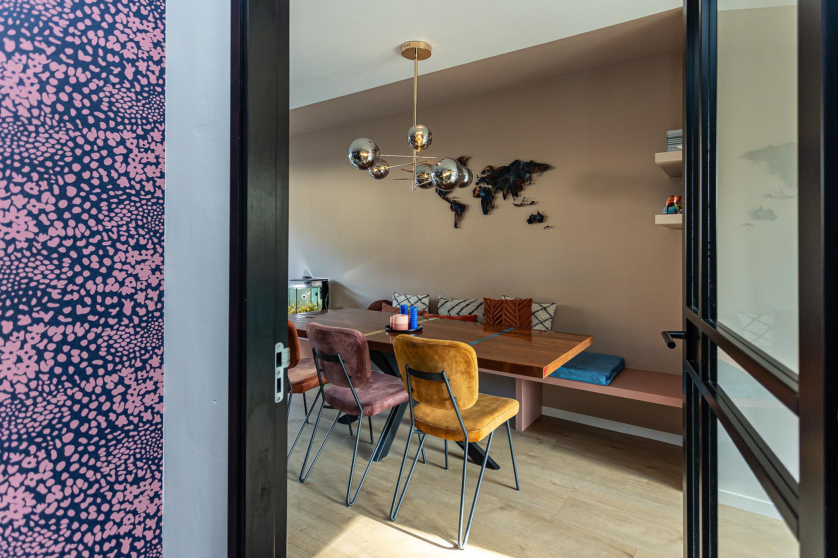 hal/entree, luxe toilet met fontein, ruime eet-/woonkamer met bergkast en toegang tot terras en tuin middels openslaande deuren, halfopen luxe moderne keuken in