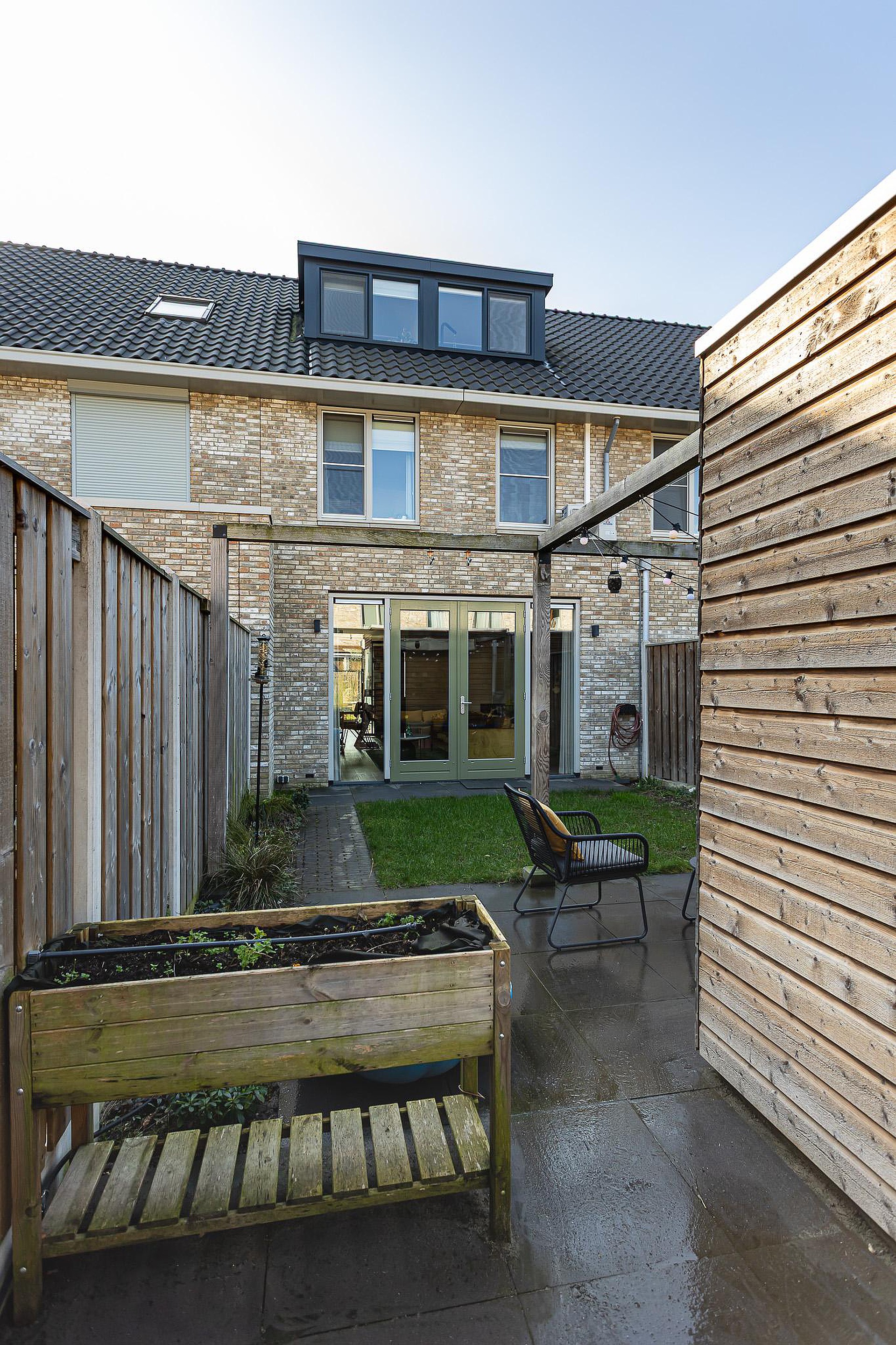 Rustig aan groenvoorziening gelegen instapklare luxe uitgevoerde ruime TUSSENWONING met houten TUINBERGING en verzorgde achtertuin met achterom in een jonge moderne nieuwbouwwijk