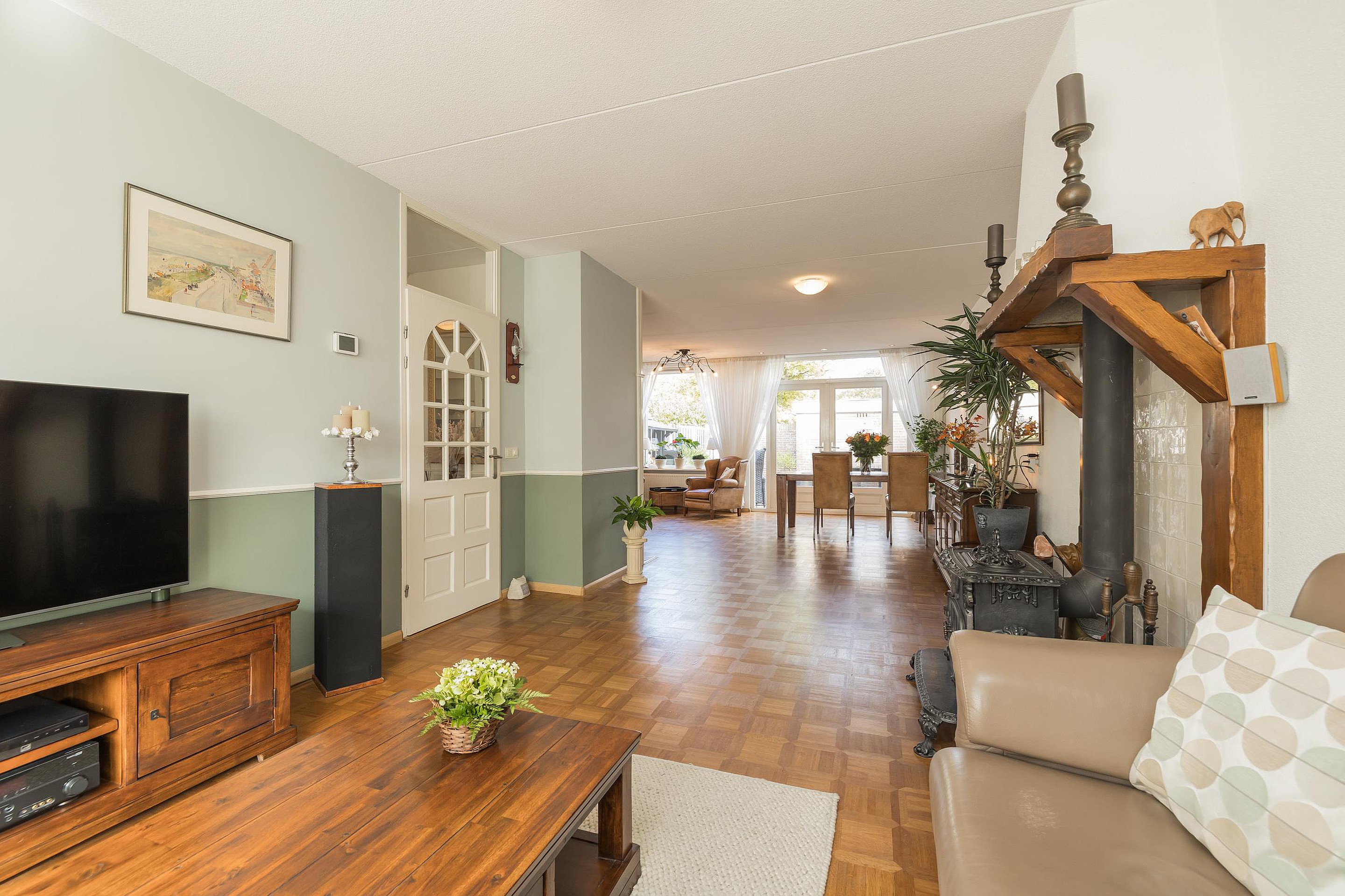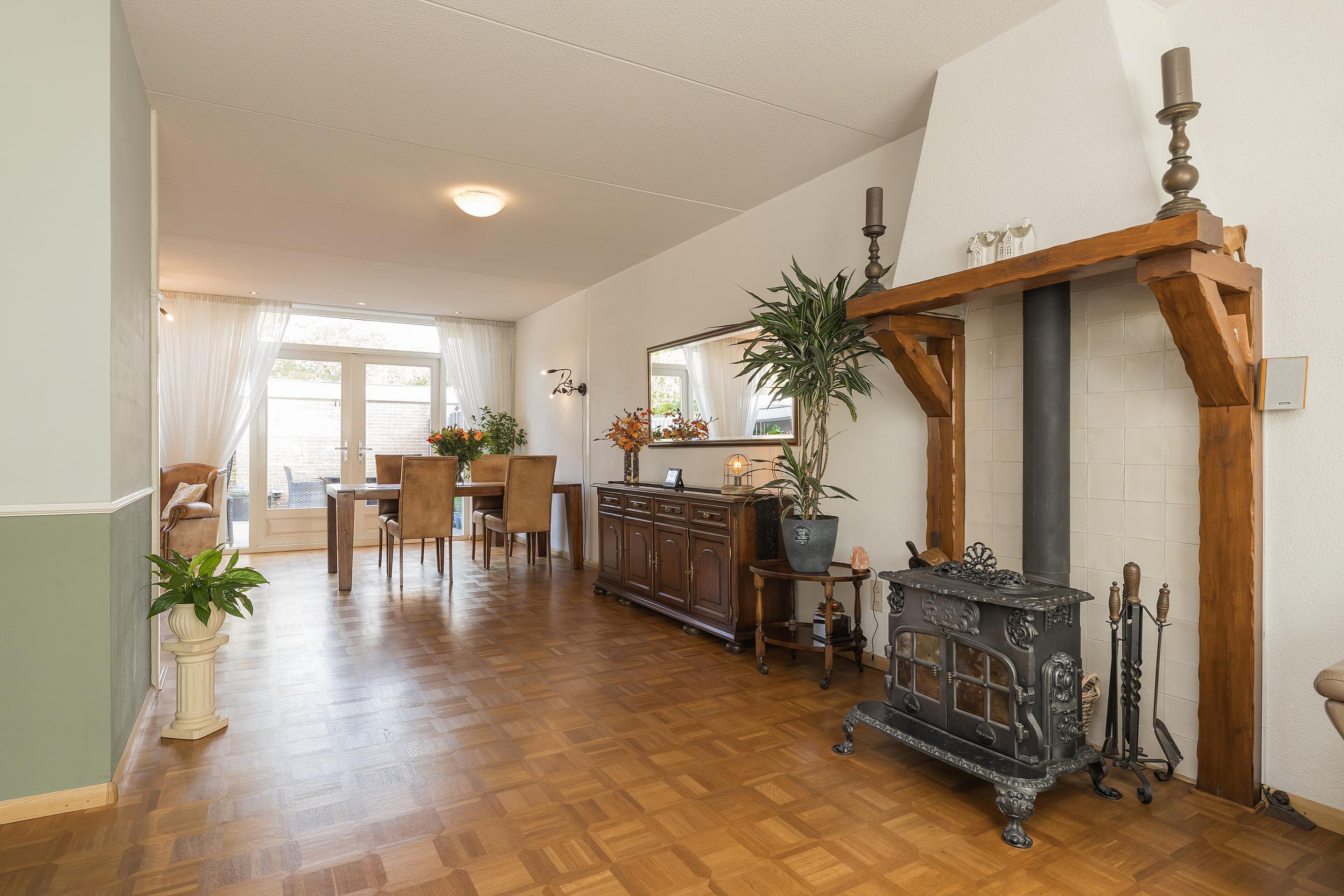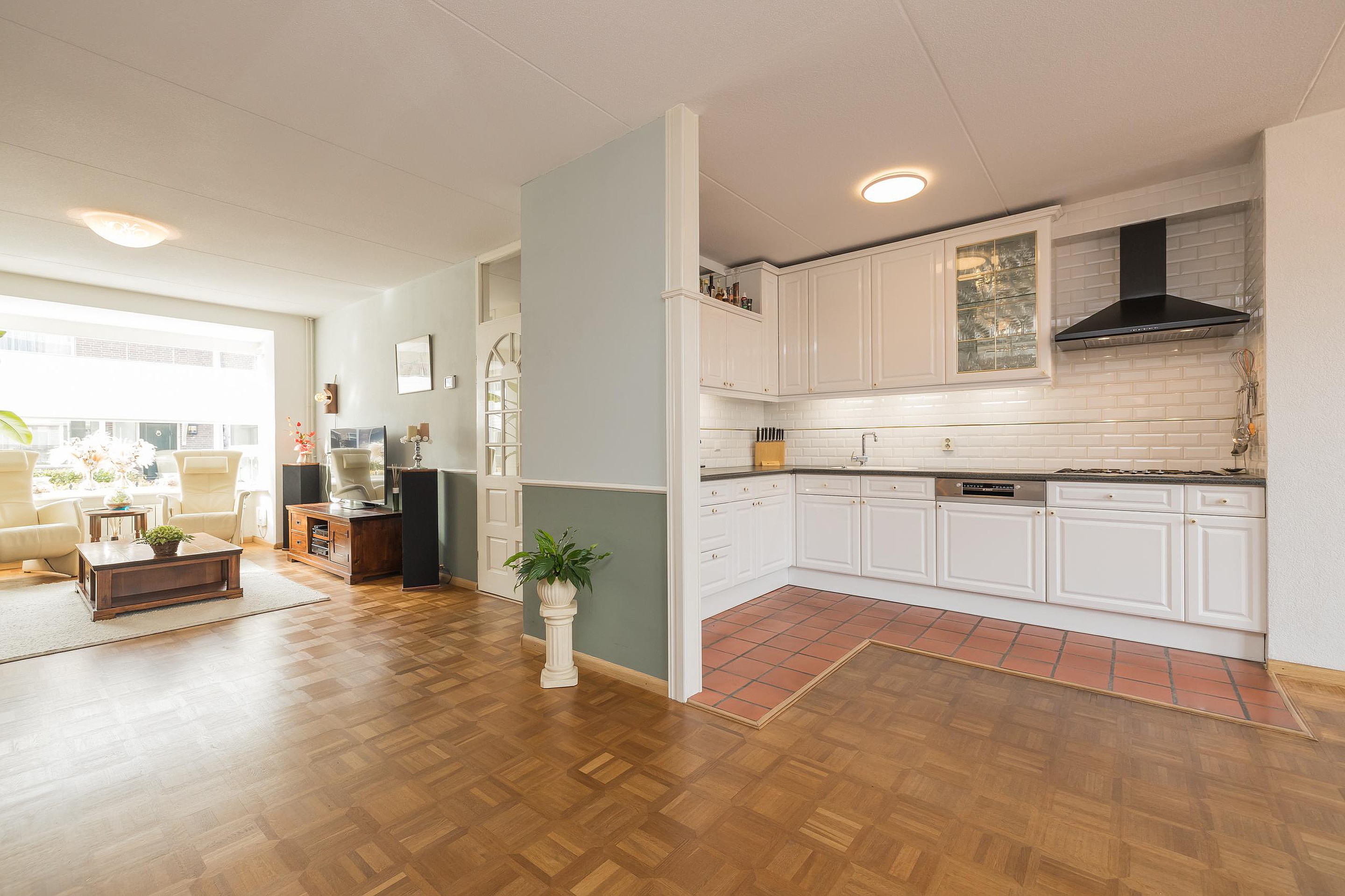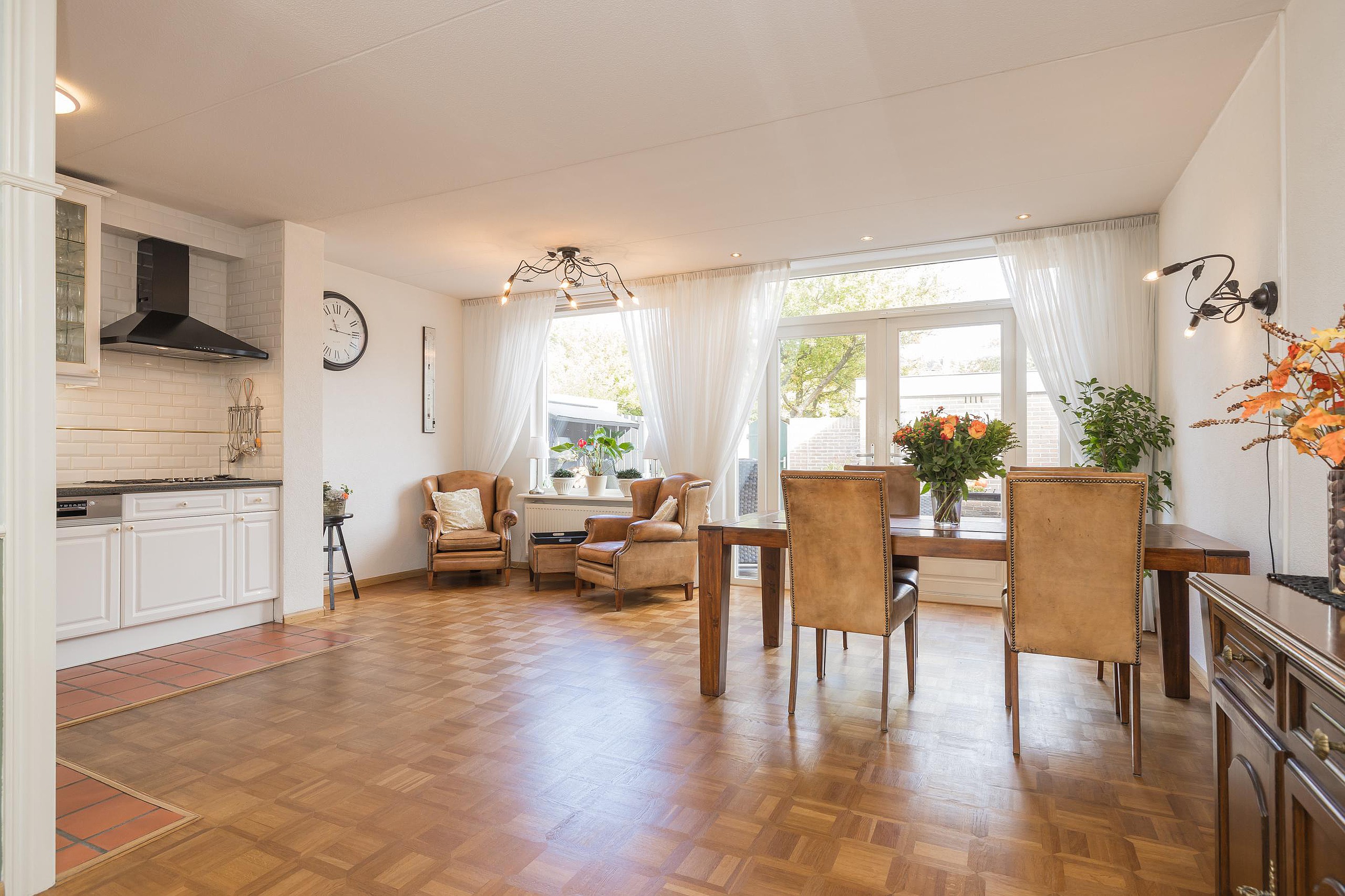 Entree, de hal met de meterkast, de keurig betegelde toiletruimte en de garderobe onder de trap. Een meer dan riante woonkamer die aan de achterzijde over de gehele breedte is uitgebouwd. De woonkamer heeft een Bruynzeel eiken parketvloer en een erker aan de voorzijde, deze is voorzien van een elektrisch bedienbaar sunscreen. De woonkamer heeft een open keuken die is voorzien van diverse inbouwapparatuur zoals een hete lucht oven, een koelkast, een gaskookplaat met een wok brander, een vaatwasser en een afzuigkap. Via de openslaande deuren is de fraai betegelde achtertuin bereikbaar met een stenen berging. Via de tuindeur komt u op het speelveld, een ideale speelplek voor de kinderen!