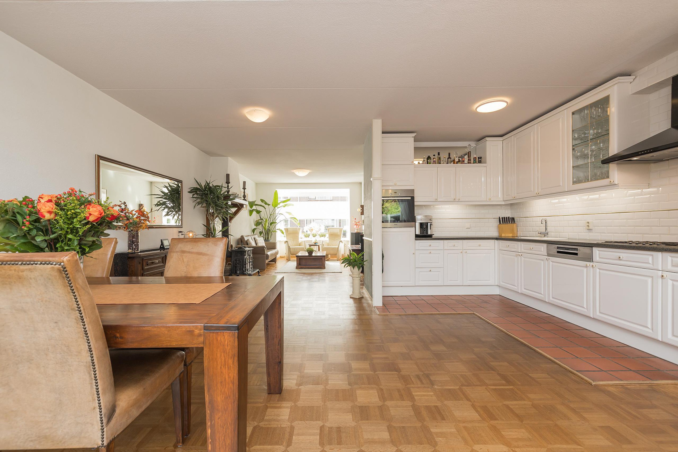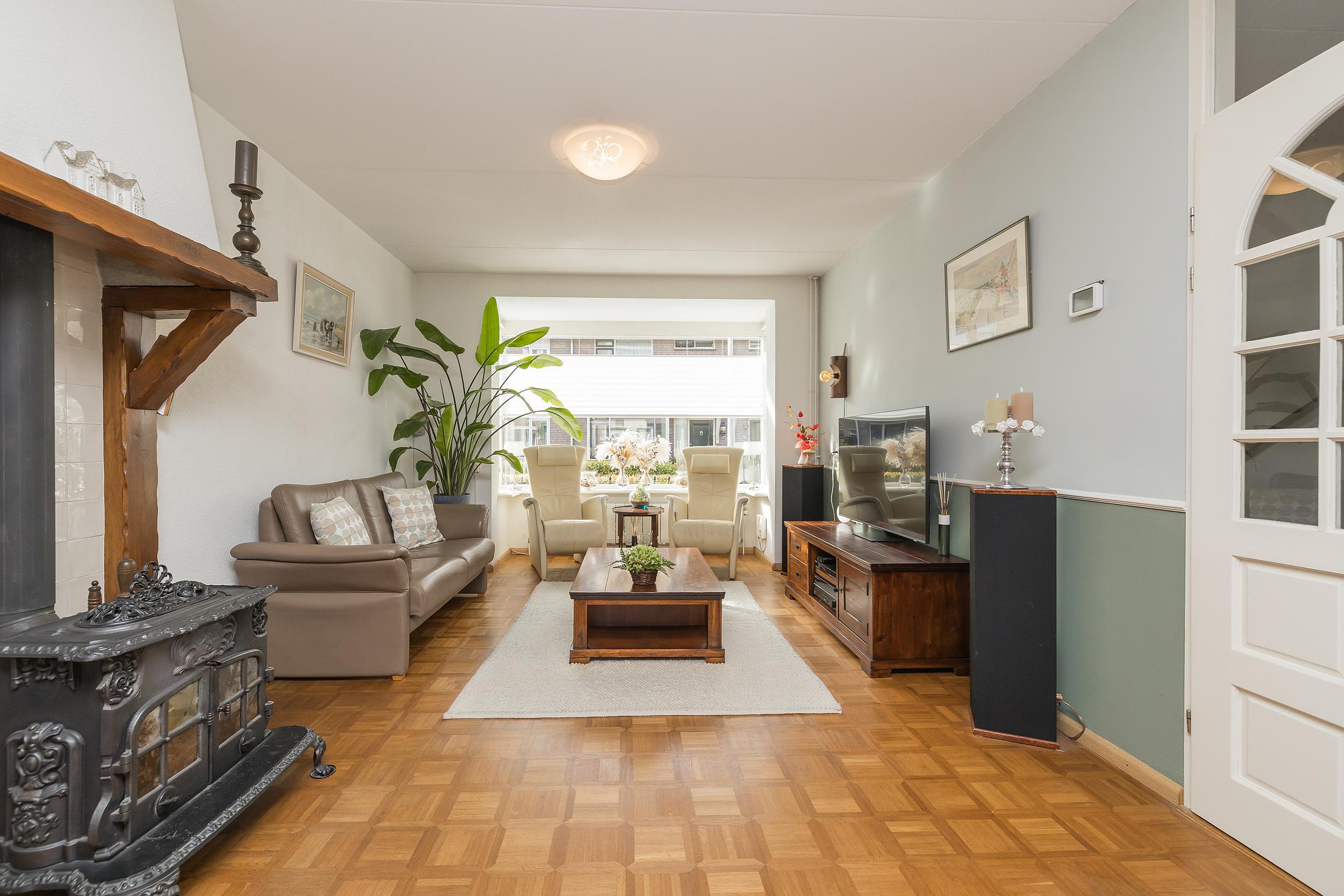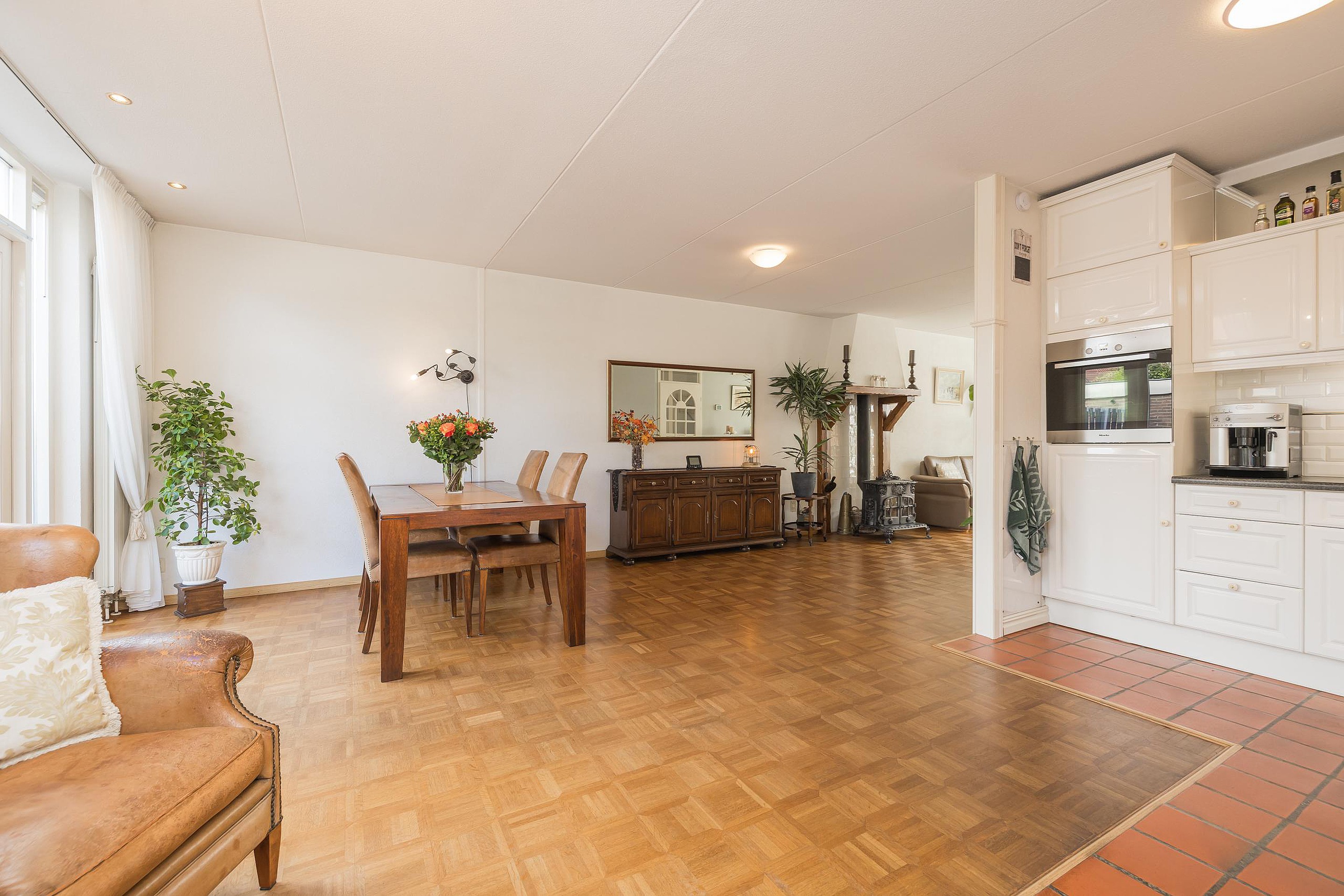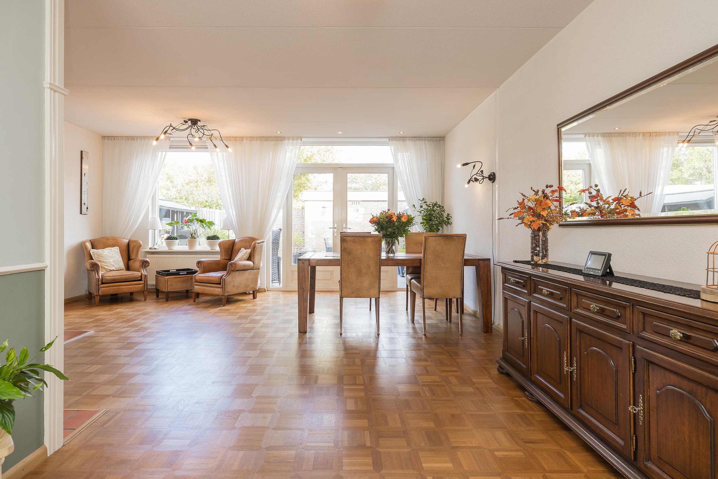 Entree, de hal met de meterkast, de keurig betegelde toiletruimte en de garderobe onder de trap. Een meer dan riante woonkamer die aan de achterzijde over de gehele breedte is uitgebouwd. De woonkamer heeft een Bruynzeel eiken parketvloer en een erker aan de voorzijde, deze is voorzien van een elektrisch bedienbaar sunscreen. De woonkamer heeft een open keuken die is voorzien van diverse inbouwapparatuur zoals een hete lucht oven, een koelkast, een gaskookplaat met een wok brander, een vaatwasser en een afzuigkap. Via de openslaande deuren is de fraai betegelde achtertuin bereikbaar met een stenen berging. Via de tuindeur komt u op het speelveld, een ideale speelplek voor de kinderen!