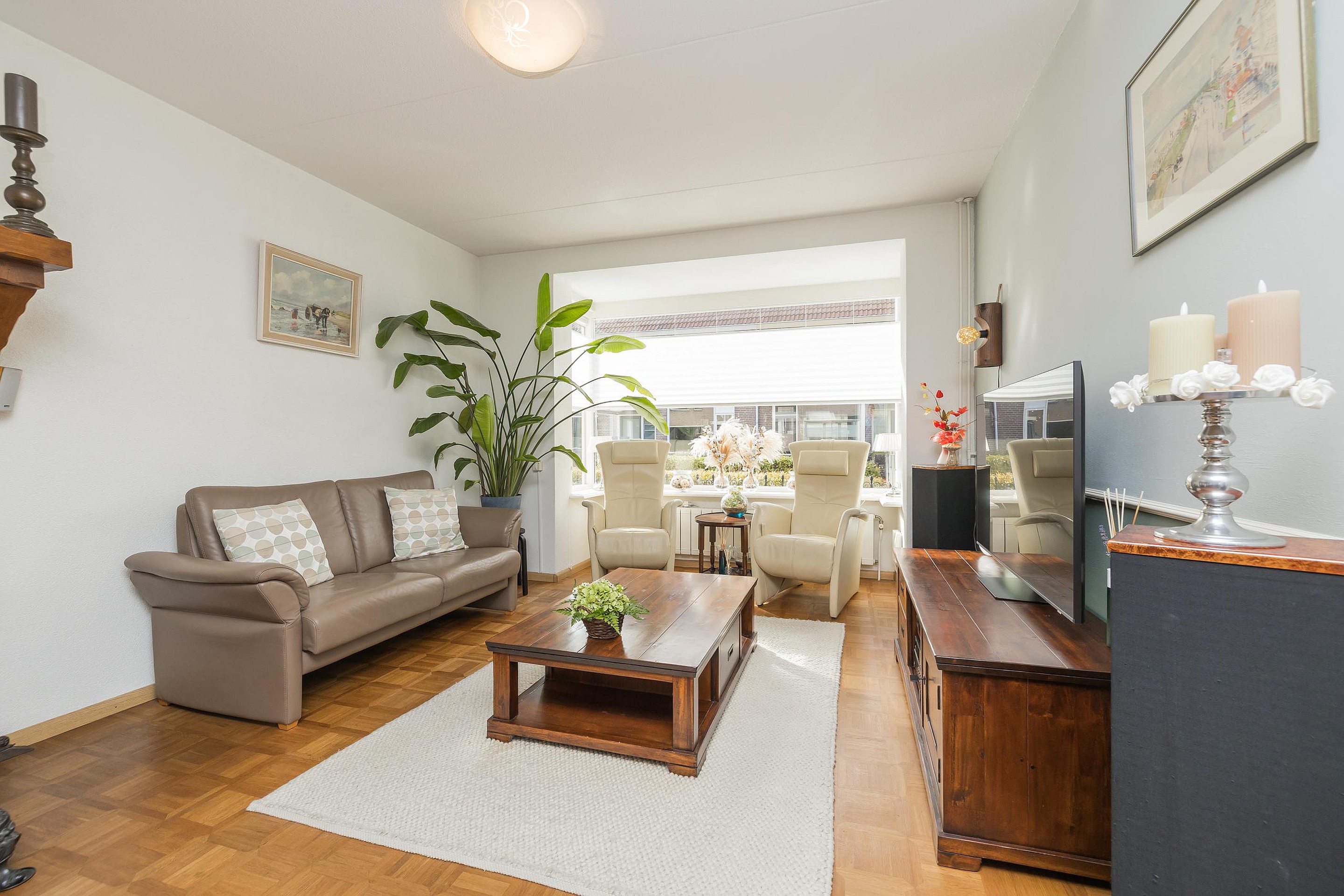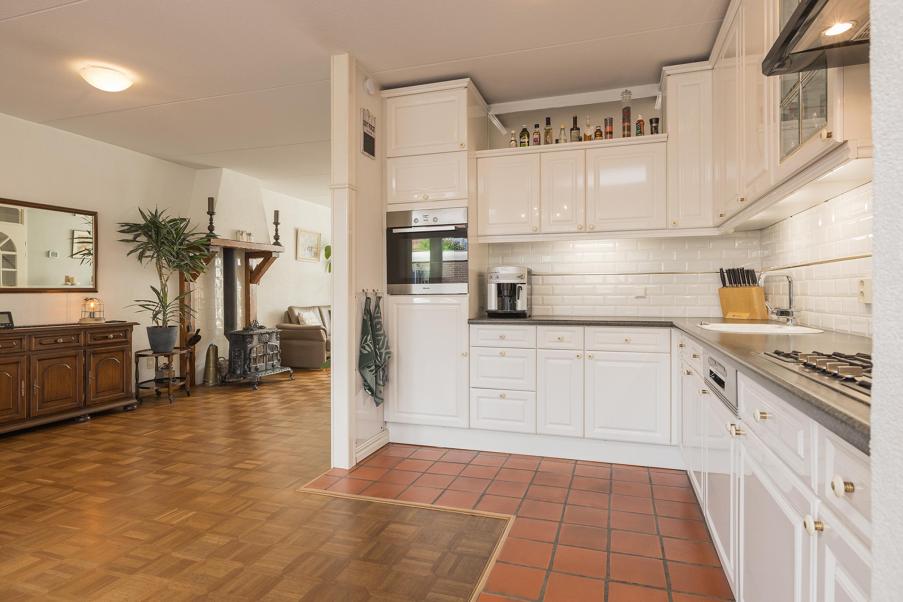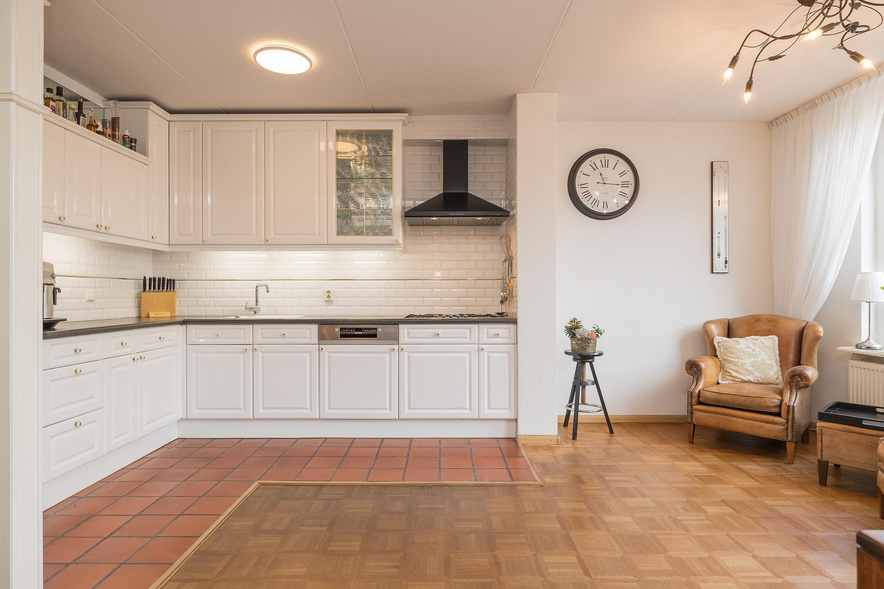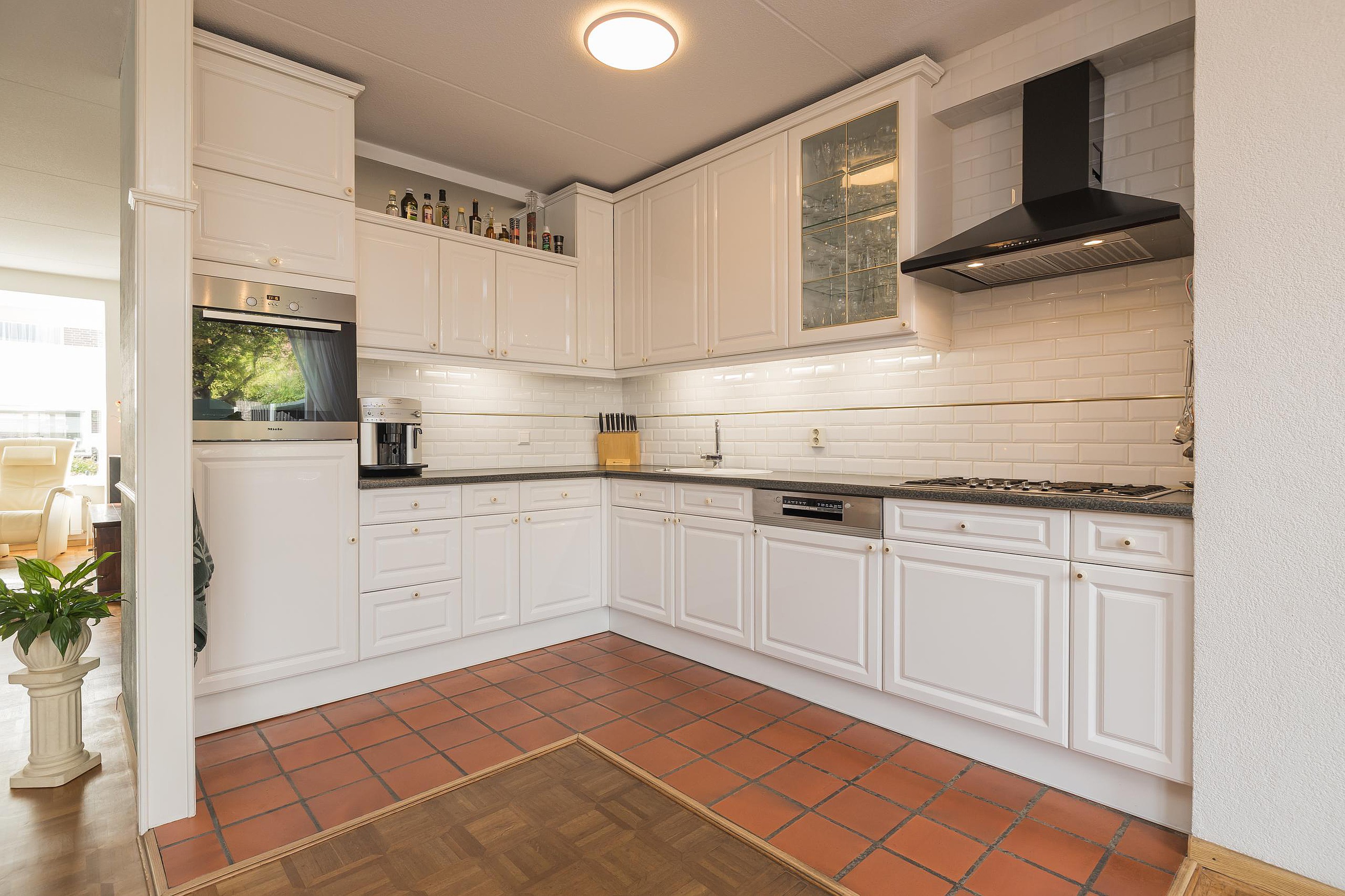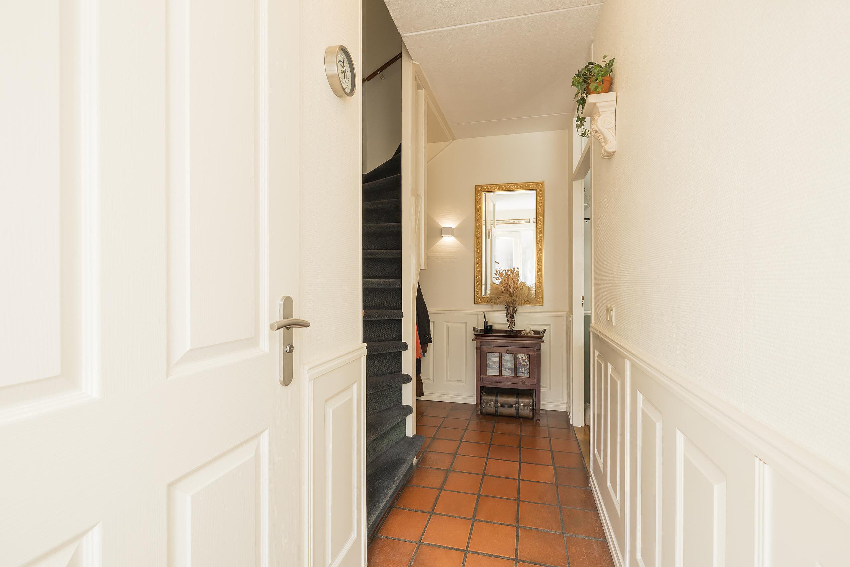 Entree, de hal met de meterkast, de keurig betegelde toiletruimte en de garderobe onder de trap. Een meer dan riante woonkamer die aan de achterzijde over de gehele breedte is uitgebouwd. De woonkamer heeft een Bruynzeel eiken parketvloer en een erker aan de voorzijde, deze is voorzien van een elektrisch bedienbaar sunscreen. De woonkamer heeft een open keuken die is voorzien van diverse inbouwapparatuur zoals een hete lucht oven, een koelkast, een gaskookplaat met een wok brander, een vaatwasser en een afzuigkap. Via de openslaande deuren is de fraai betegelde achtertuin bereikbaar met een stenen berging. Via de tuindeur komt u op het speelveld, een ideale speelplek voor de kinderen!