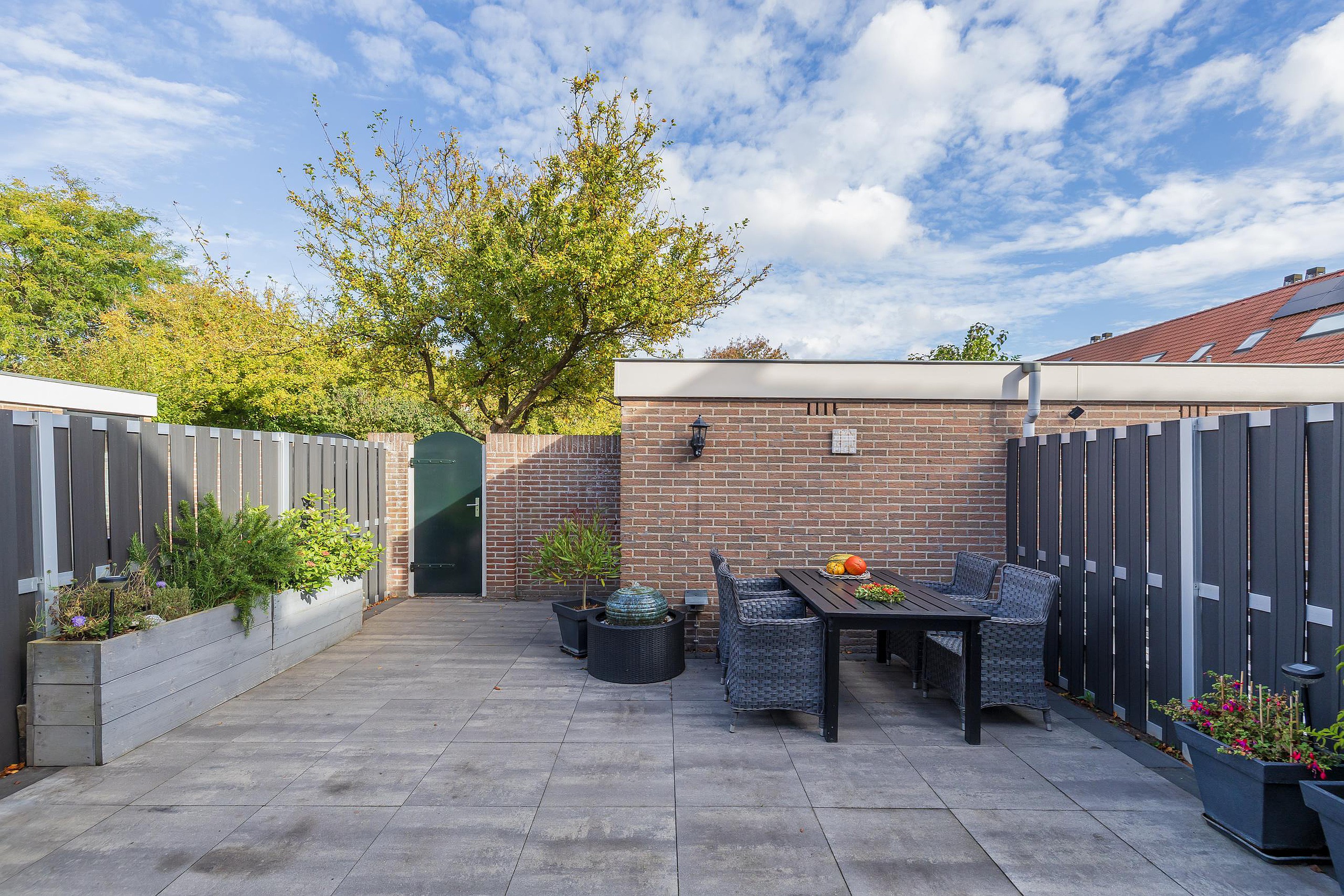 De voortuin is keurig verzorgd en dat geldt ook voor de heerlijke ruime achtertuin met schuttingen aan beide zijden, een stenen berging en een achterom naar het speelveld.