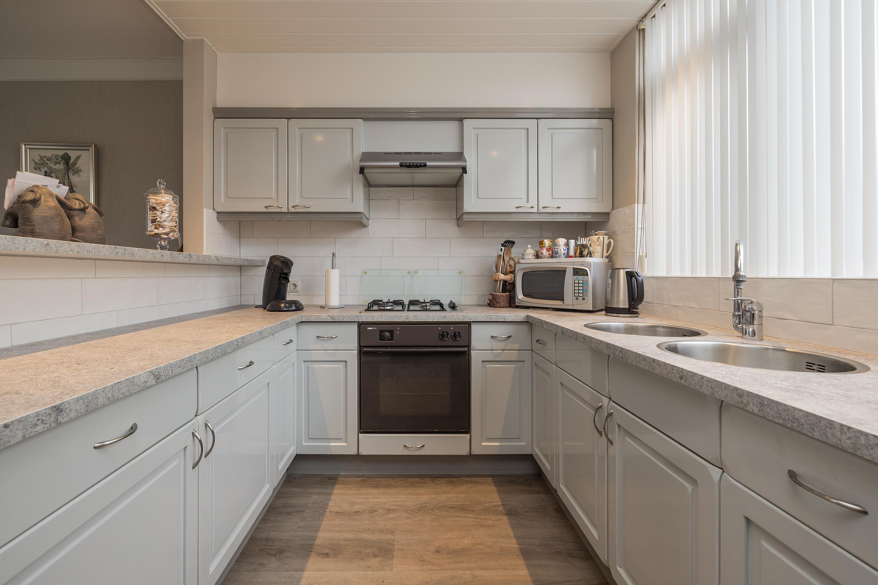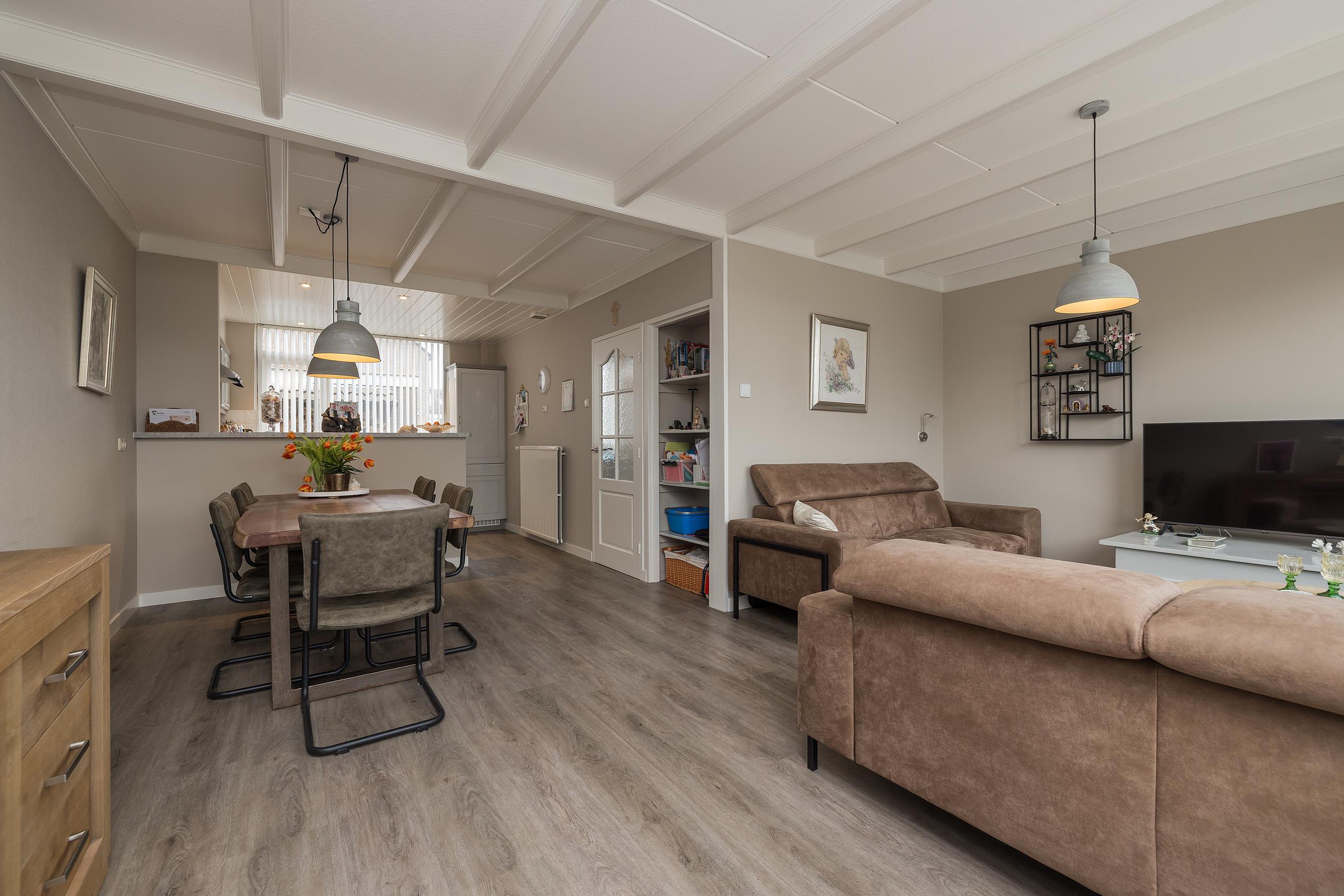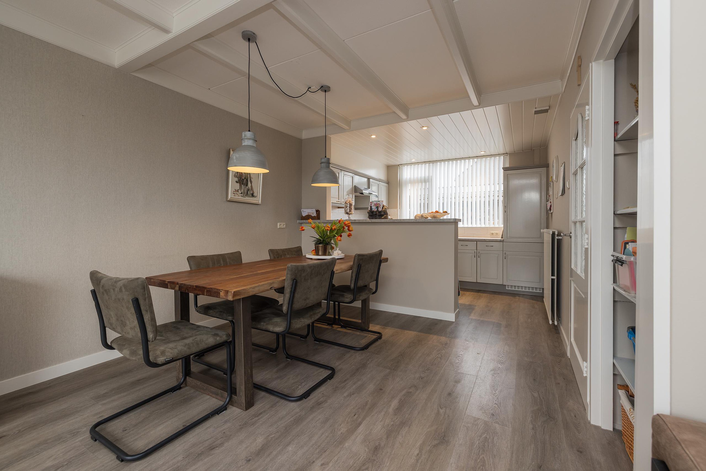 Entree, de hal met de meterkast, de garderobe en bergruimte onder de trap met de verdeler voor de vloerverwarming. De toiletruimte is met smaak vernieuwd en voorzien van een wandcloset en een fonteintje. De keuken is gelegen aan de voorzijde van de woning en is uitgerust met een vriezer, een koelkast, een close-in-boiler, een dubbele spoelbak, een gaskookplaat en een afzuigkap. De woonkamer heeft een PVC-vloer met comfortabele vloerverwarming en biedt uitzicht op de verzorgde en aangenaam diepe achtertuin. Een houten schutting waarborgt de privacy, de tuin is achterom bereikbaar.