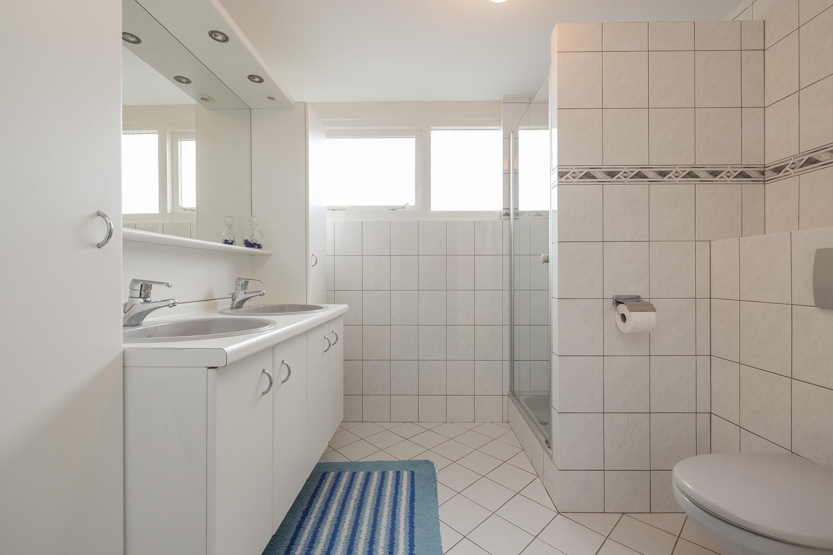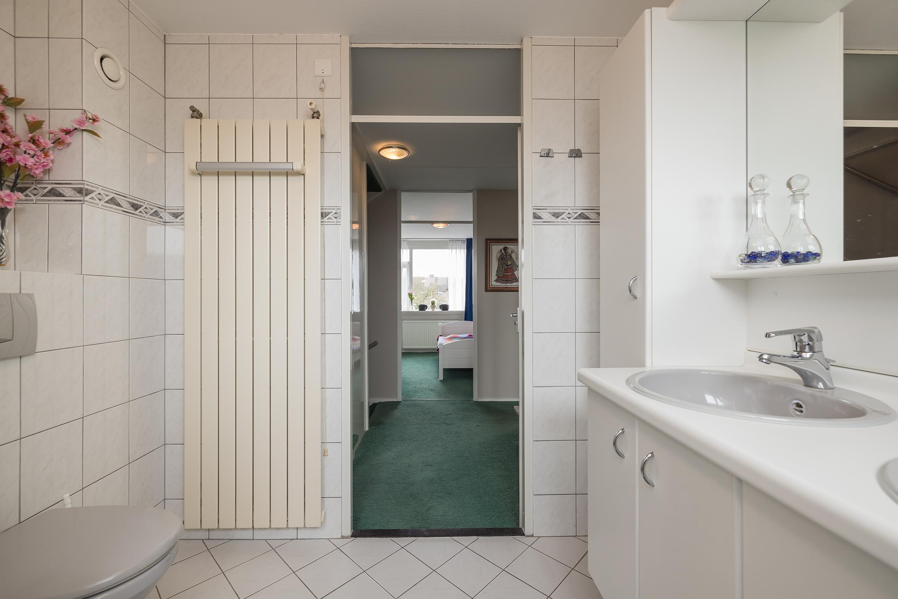 Overloop met aan de voorzijde de ruime en volledig in lichte kleur betegelde badkamer met een wandcloset, een douchecabine, een wastafelmeubel met dubbele spoelbak en een handdoekradiator. De eerste slaapkamer is gelegen aan de voorzijde en heeft ingebouwde kastruimte. Aan de achterzijde is er nog een tweede slaapkamer eveneens met ingebouwde kasteruimte en tenslotte de derde slaapkamer met uitzicht over de achtertuin.