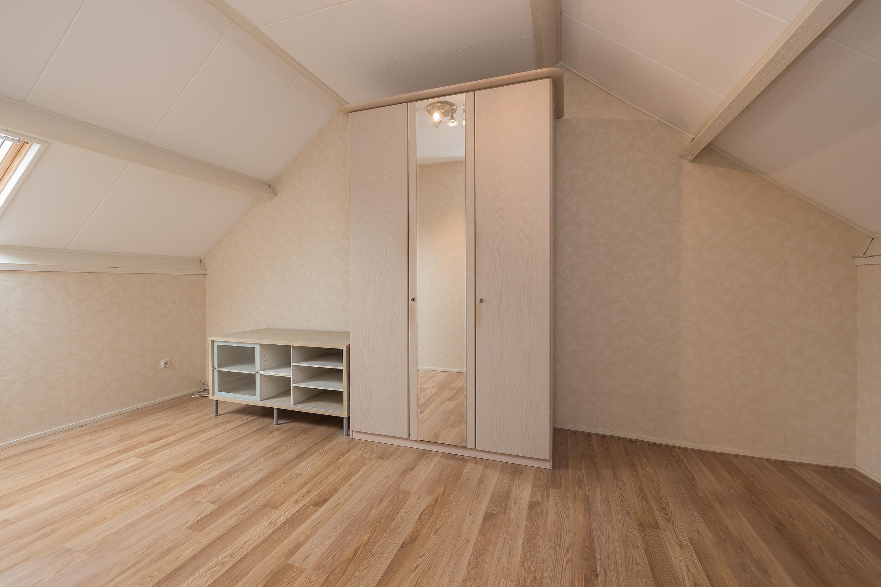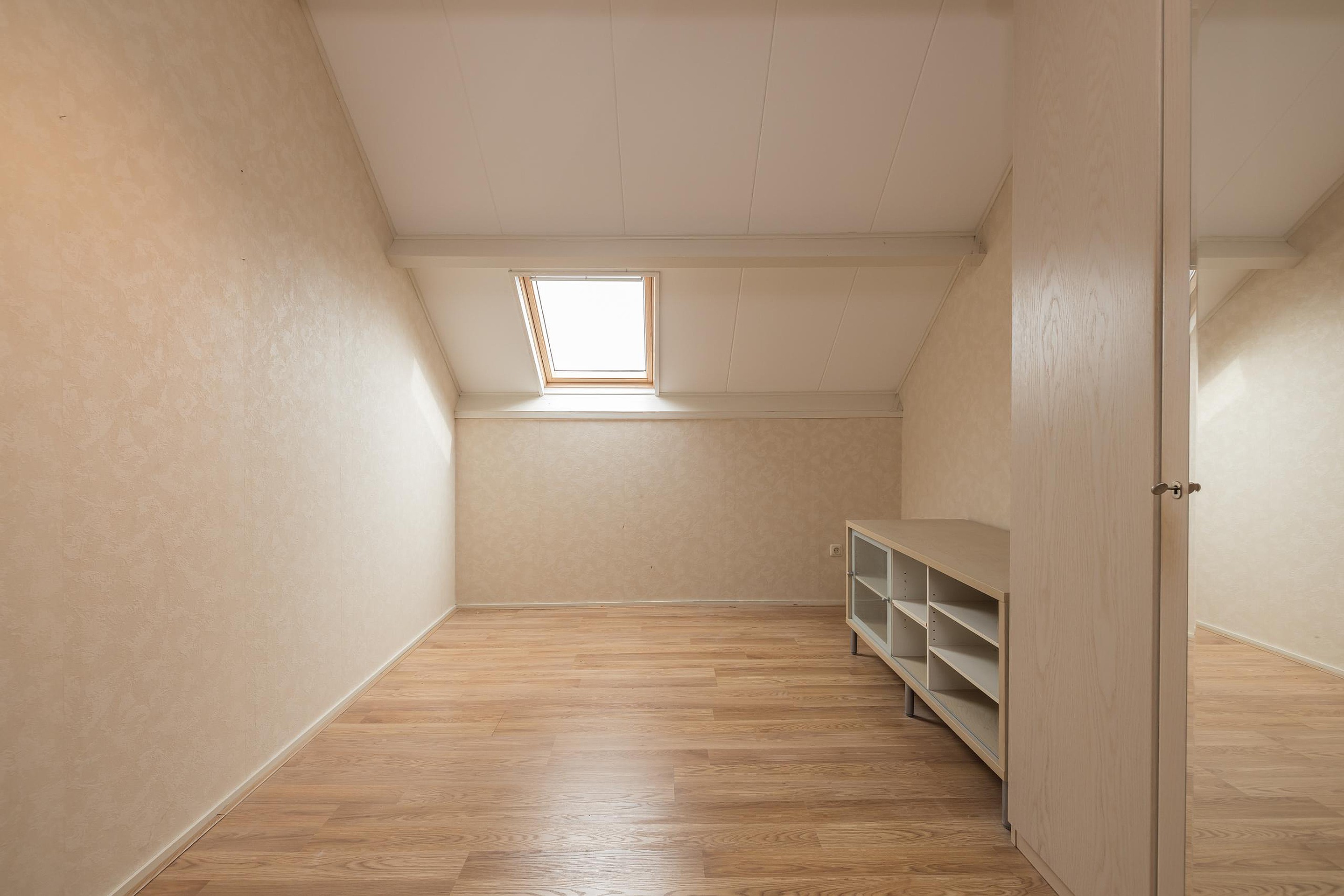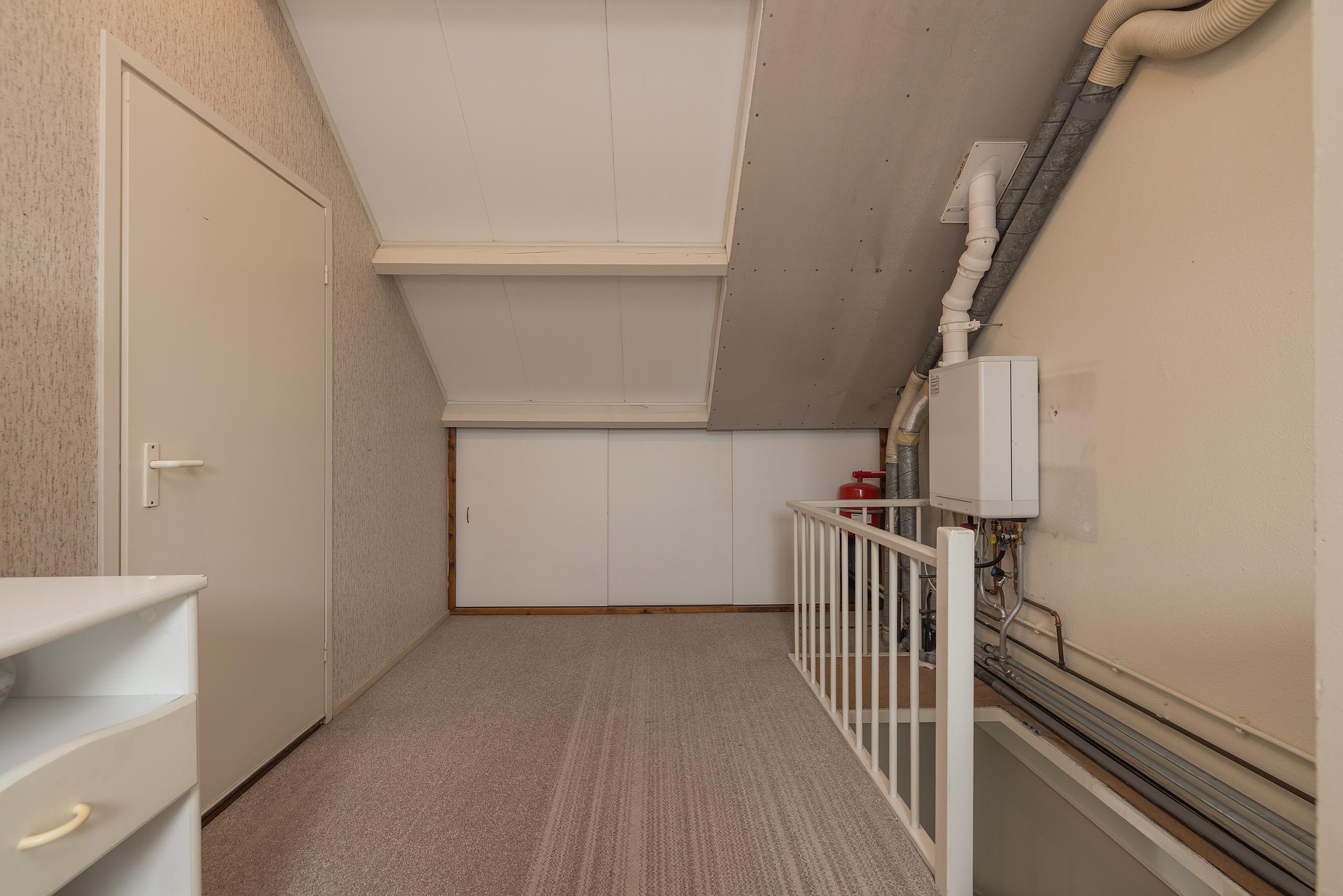De zolder heeft een grote overloop met een dakraam aan de achterzijde en veel bergruimte achter de schotten aan de voor- en achterzijde. Op de overloop hangt de CV-ketel (Intergas HRE 2021) en is er ook een aansluiting voor de wasapparatuur. De zolderkamer is aangenaam licht door het dakraam aan de achterzijde.