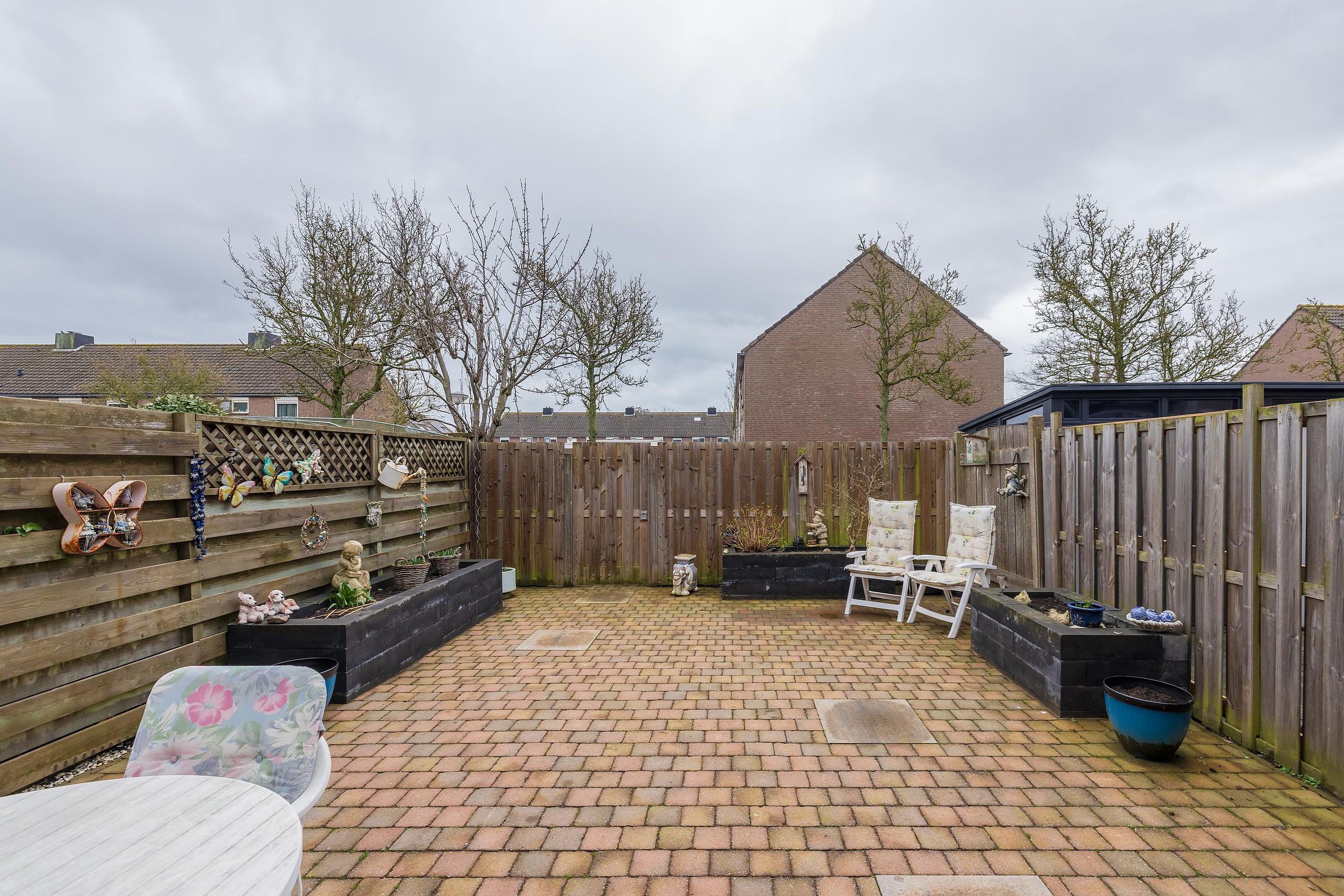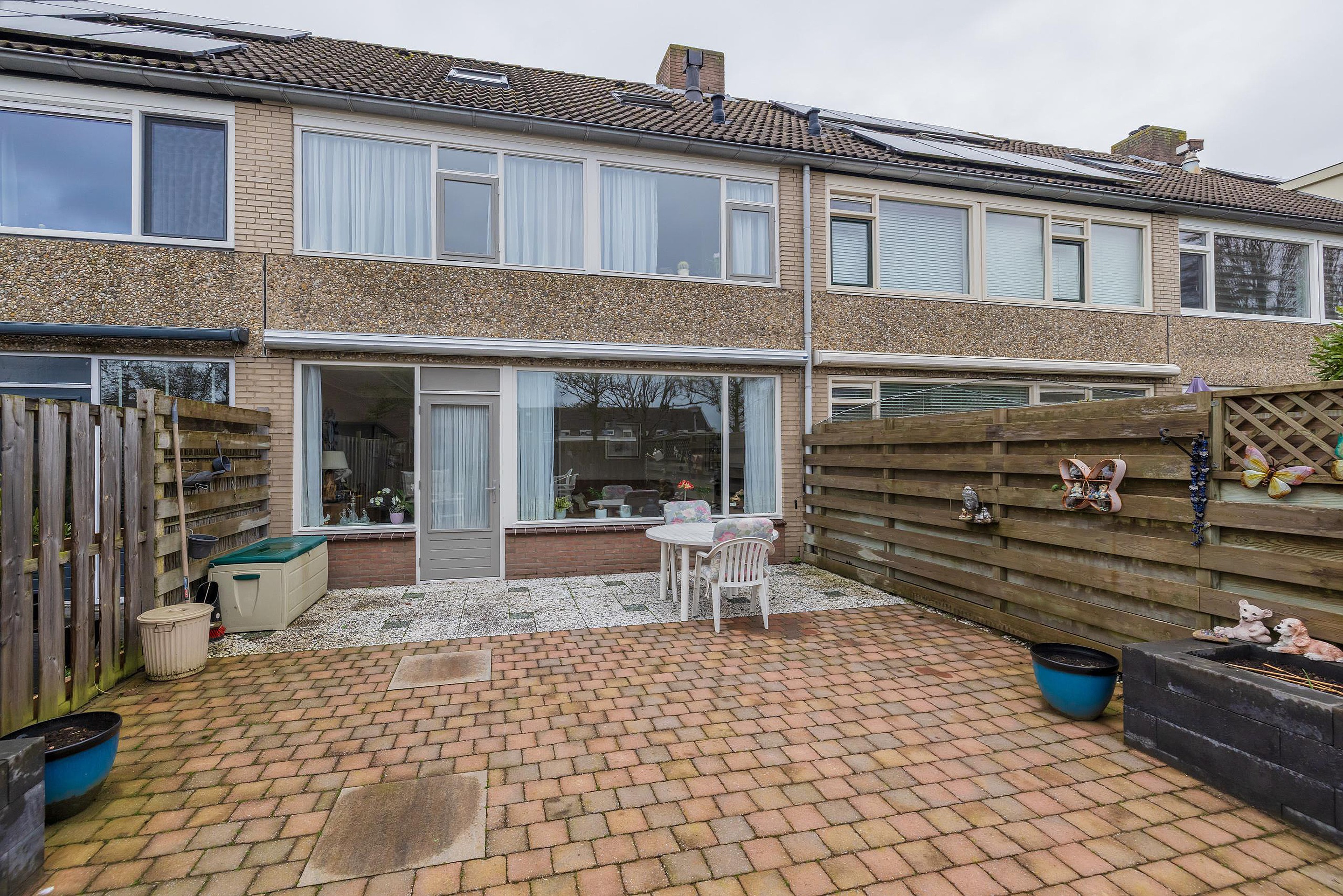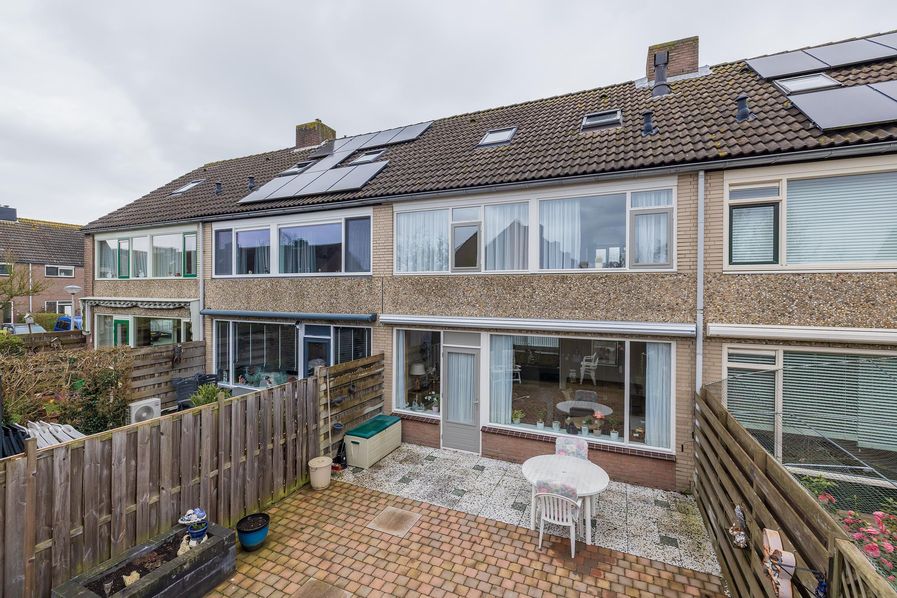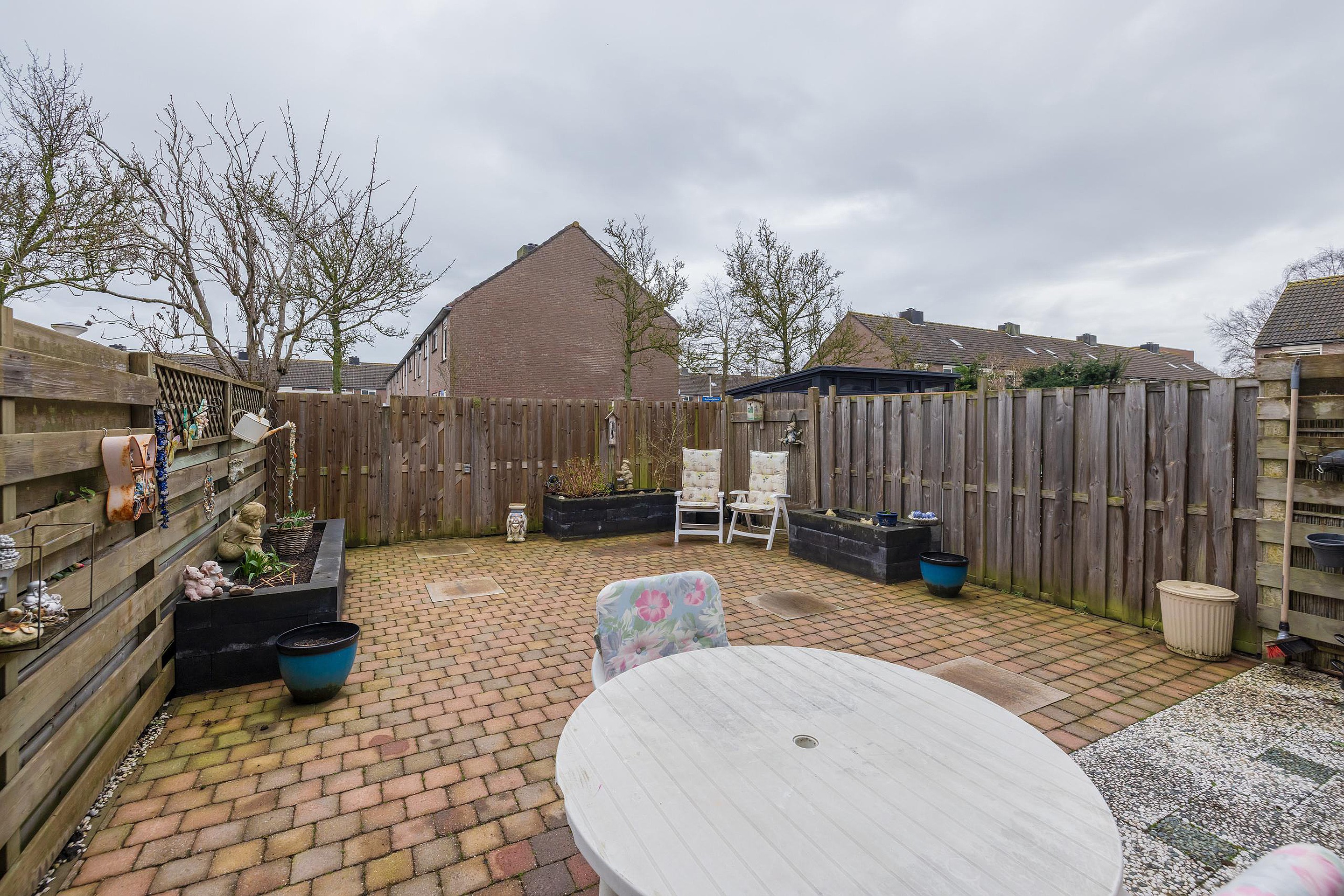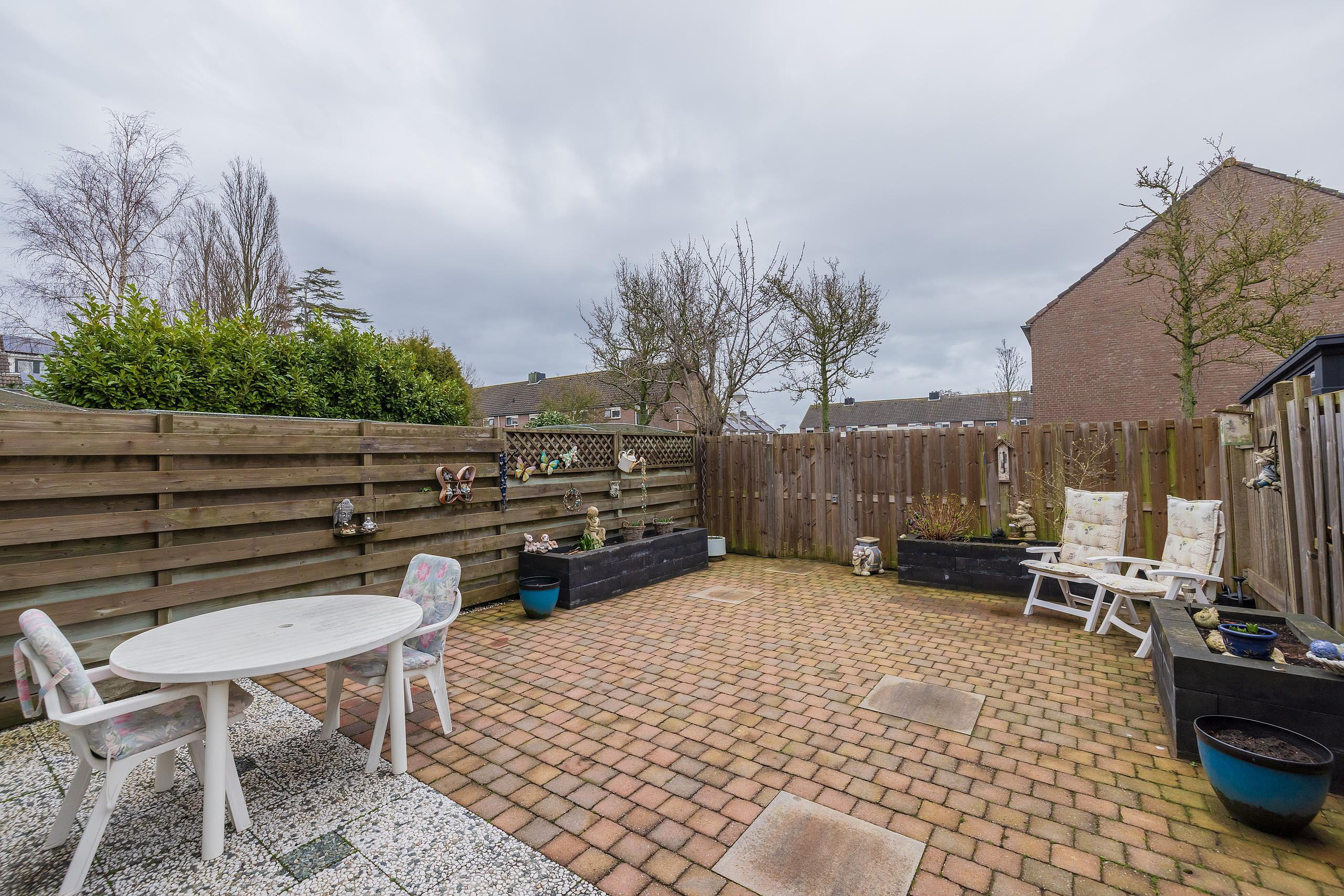 In de voortuin staat een stenen berging met elektriciteit. De diepe achtertuin is volledig betegeld en heeft een zonnescherm over de gehele breedte van de woning. De tuin is achterom bereikbaar.