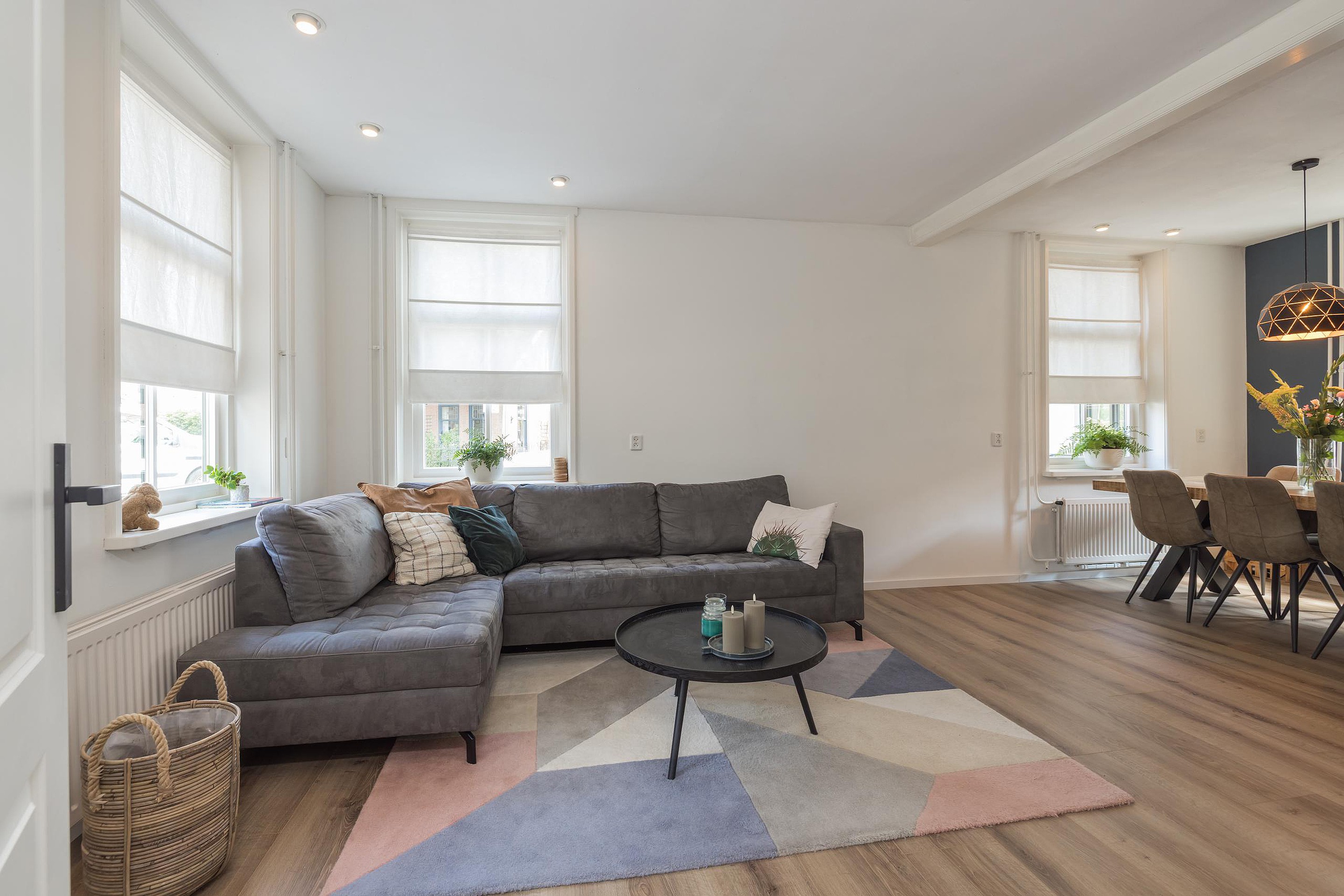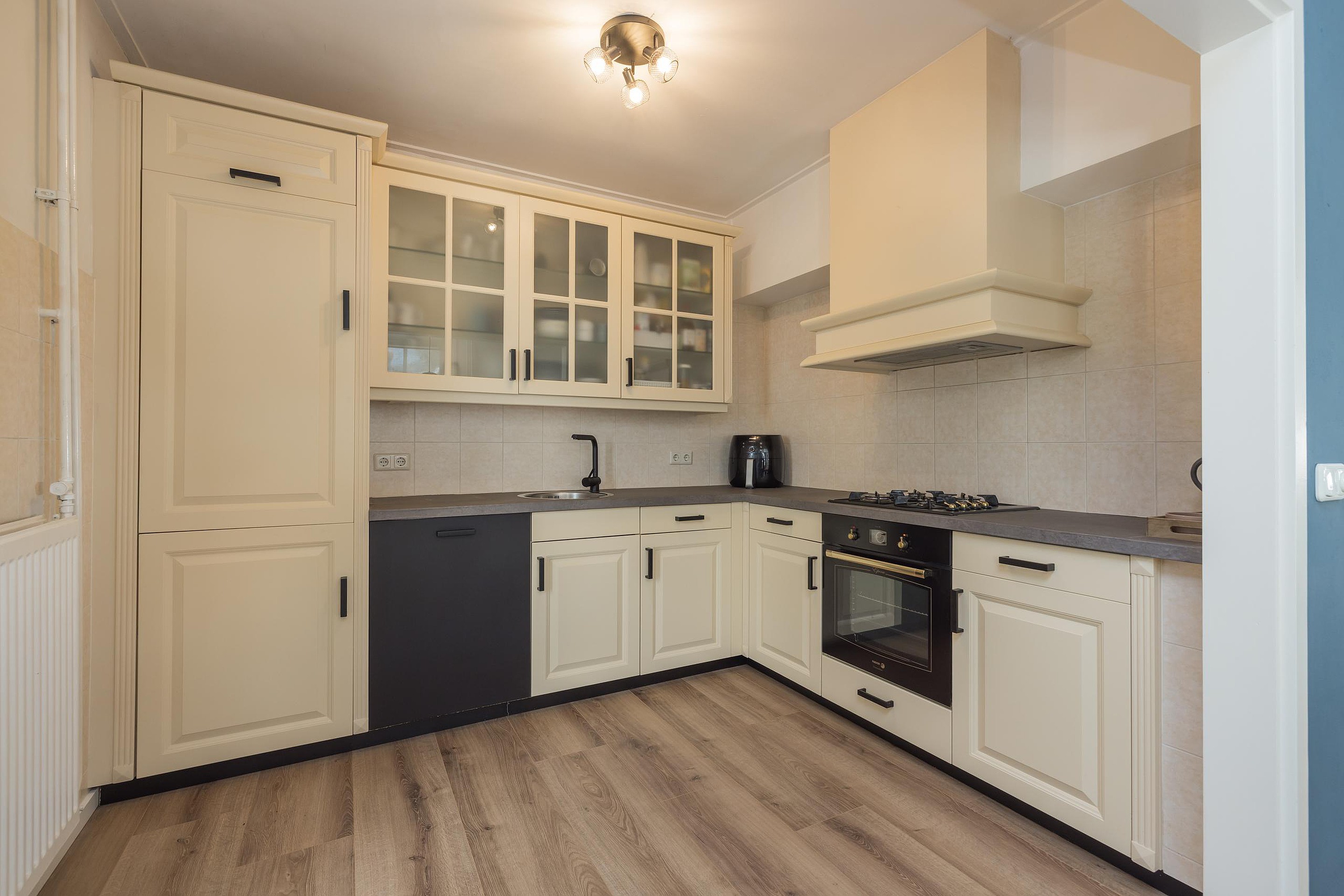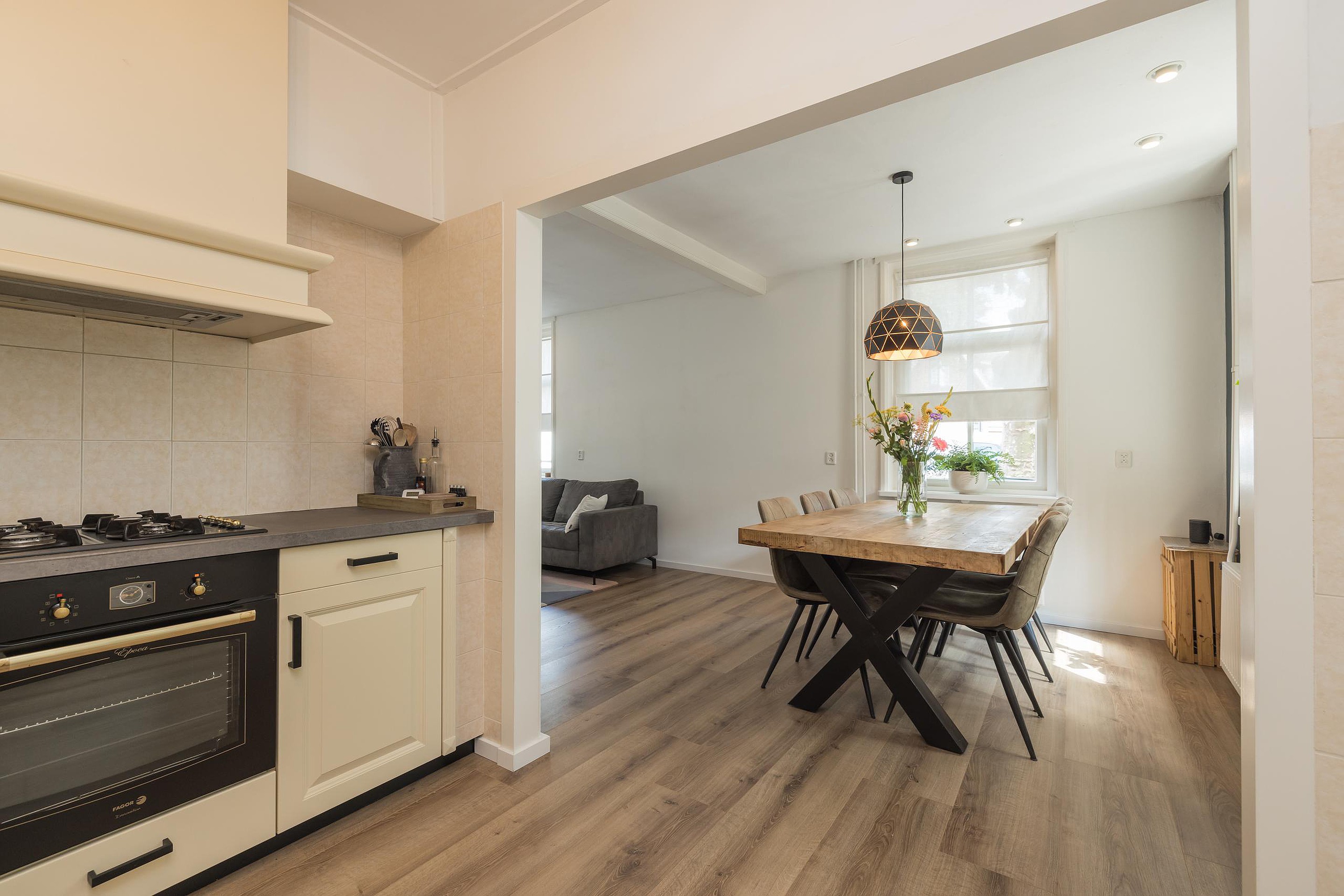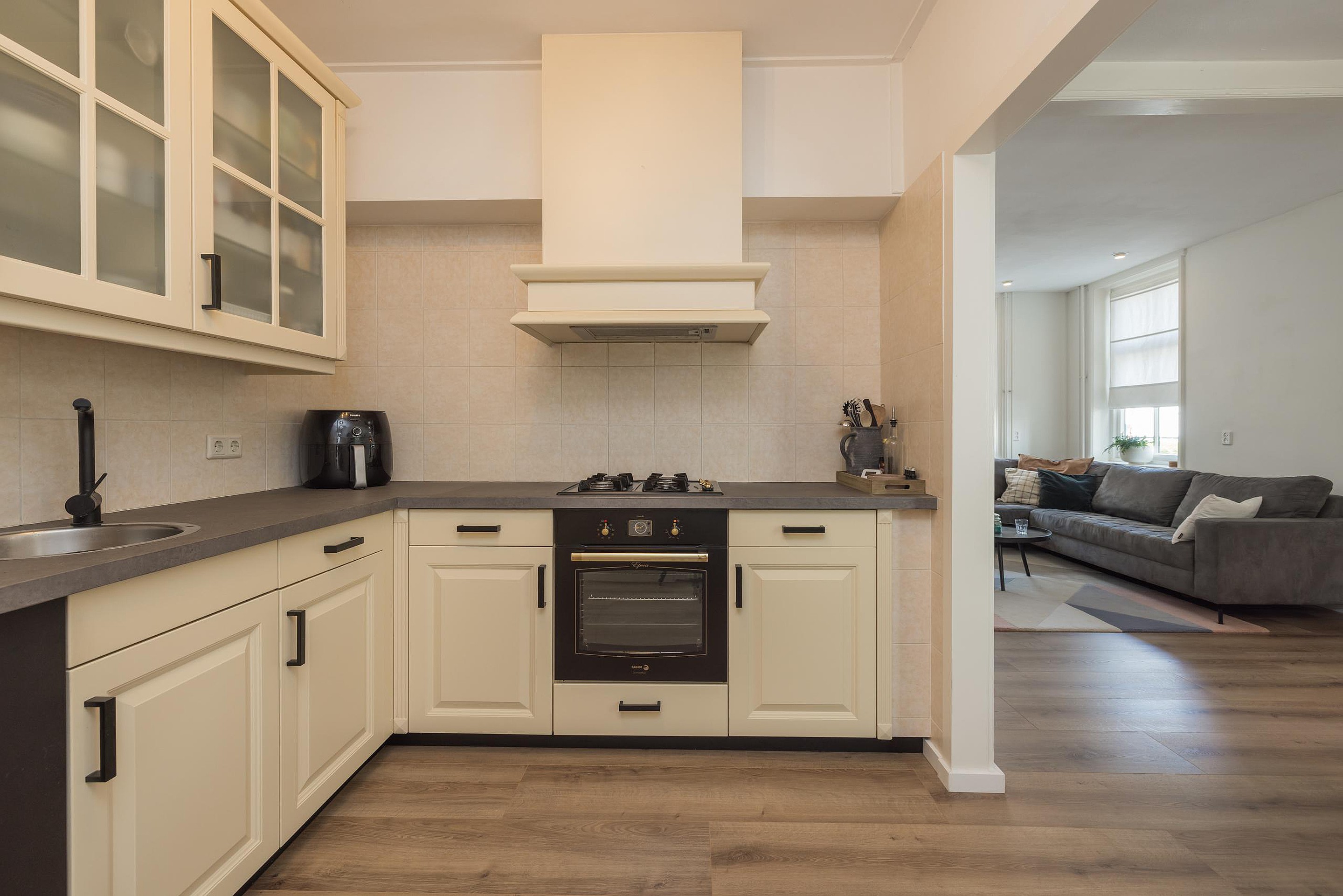 Entree, een ruime hal met de meterkast en de toiletruimte met een staand toilet, een fonteintje en mechanische ventilatie. Een bijzonder sfeervolle woonkamer met kozijnen voorzien van vlakken verdeling. De fraaie keuken is gelegen aan de achterzijde en is voorzien van 4-pits gaskookplaat, een afzuigschouw, een vaatwasser, een koelkast, een vriezer en een close-in-boiler. De achterplaats is zowel via de keuken als via de poortdeur te bereiken, hier vindt u een grote berging met de aansluitingen voor de wasapparatuur. Het kozijn in de achtergevel is voorzien van een sunscreen.