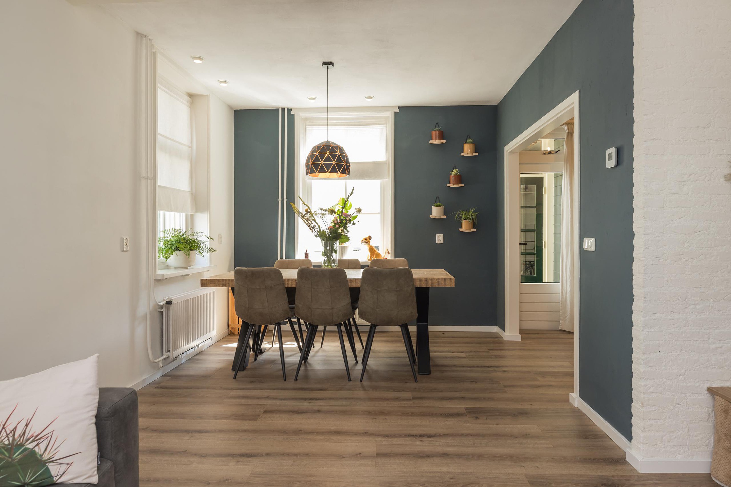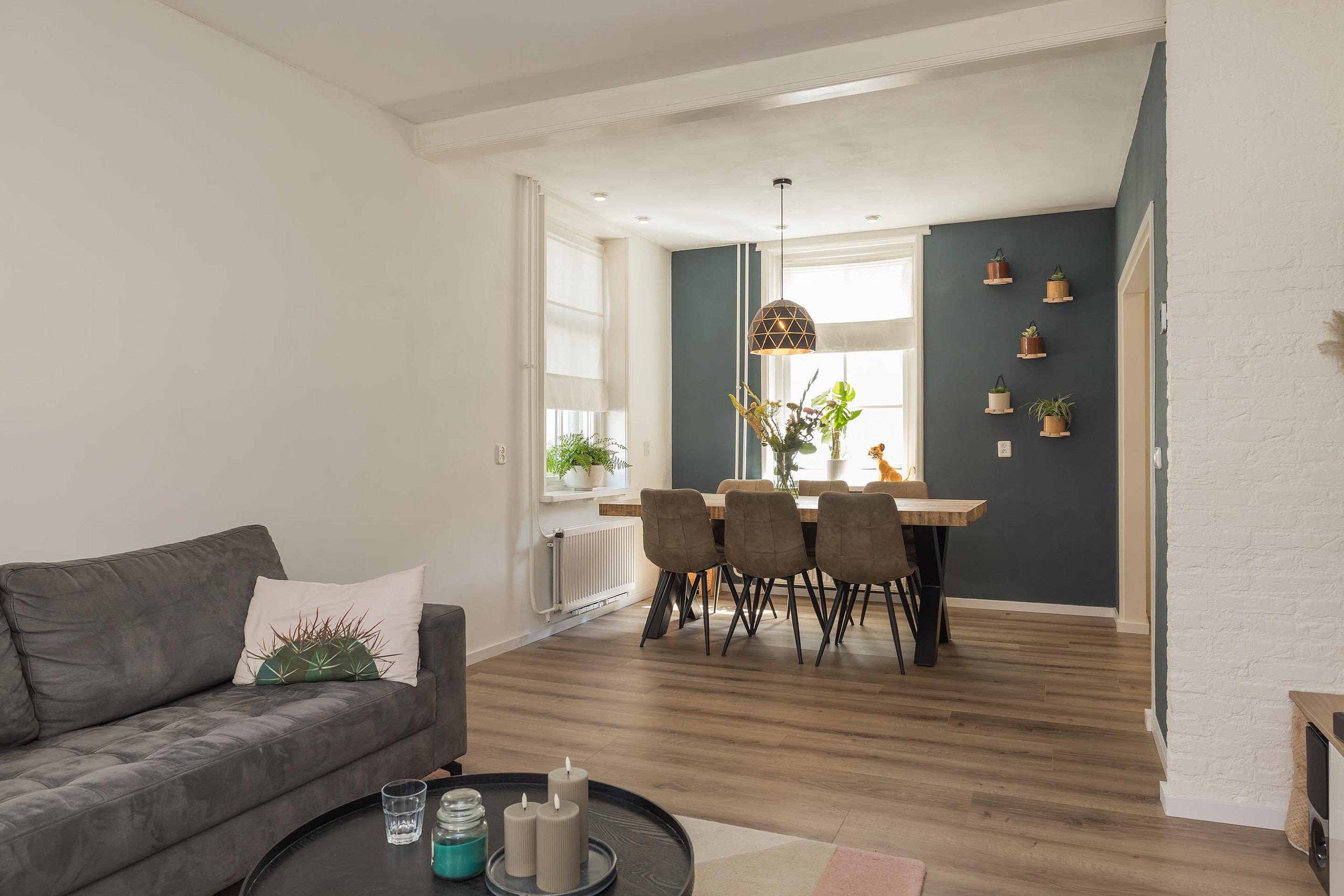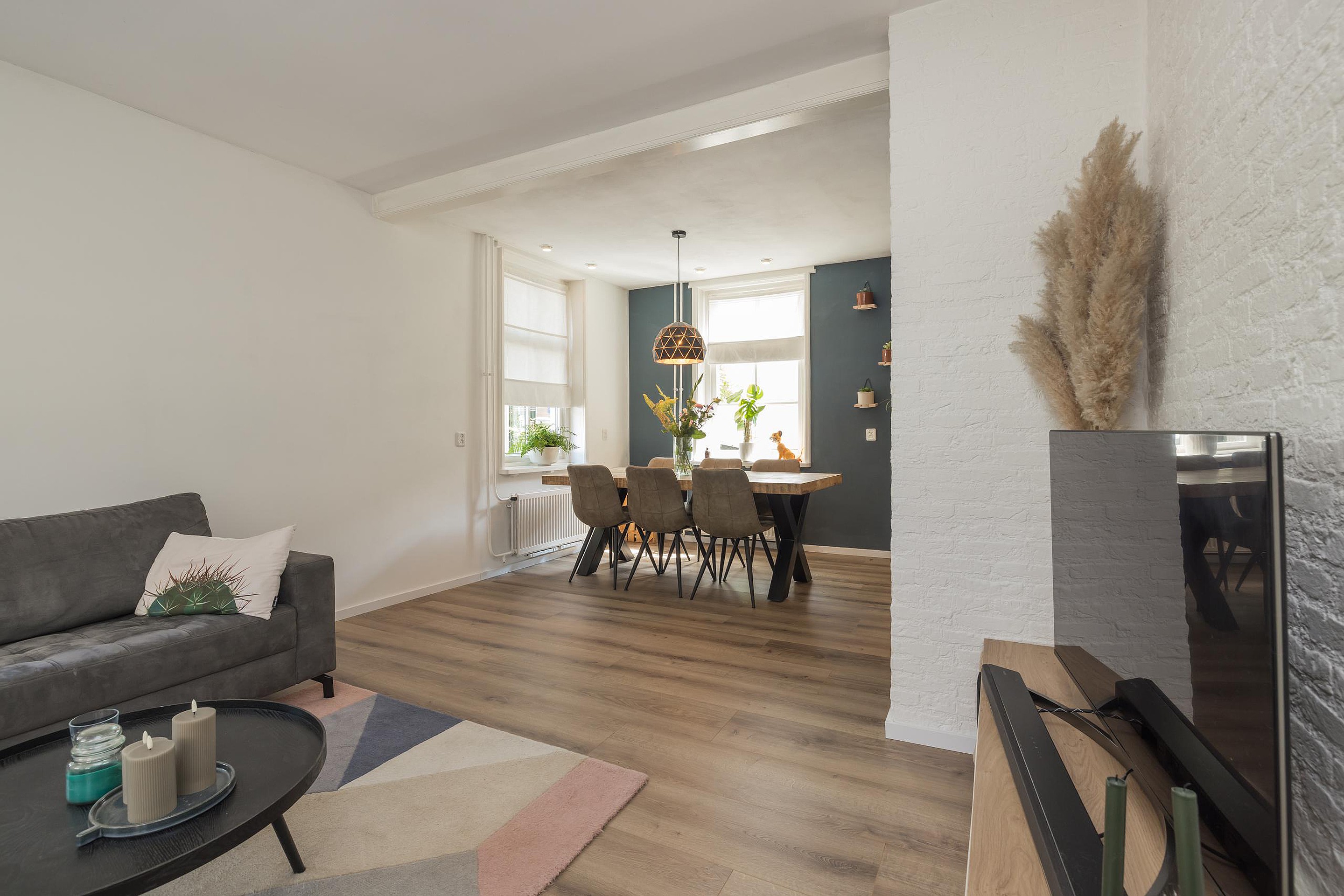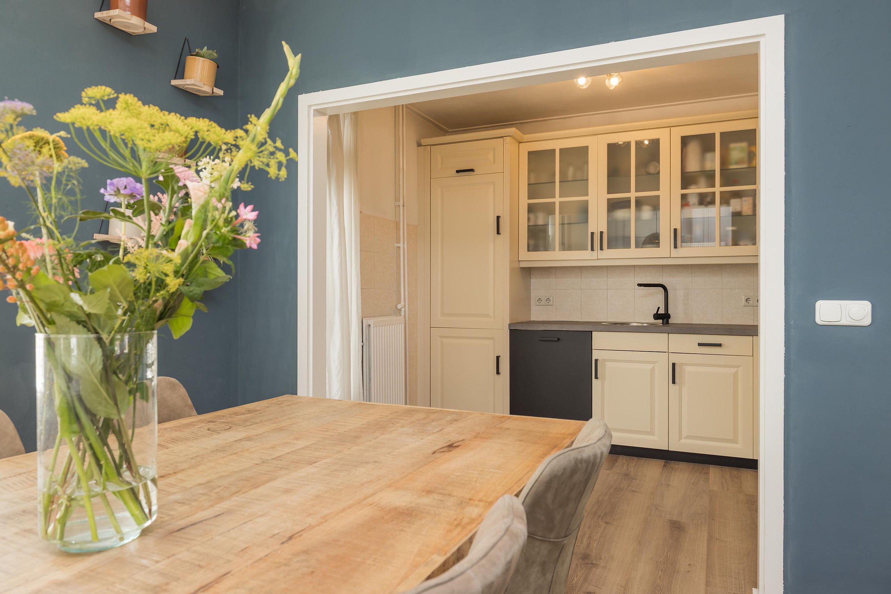 Entree, een ruime hal met de meterkast en de toiletruimte met een staand toilet, een fonteintje en mechanische ventilatie. Een bijzonder sfeervolle woonkamer met kozijnen voorzien van vlakken verdeling. De fraaie keuken is gelegen aan de achterzijde en is voorzien van 4-pits gaskookplaat, een afzuigschouw, een vaatwasser, een koelkast, een vriezer en een close-in-boiler. De achterplaats is zowel via de keuken als via de poortdeur te bereiken, hier vindt u een grote berging met de aansluitingen voor de wasapparatuur. Het kozijn in de achtergevel is voorzien van een sunscreen.