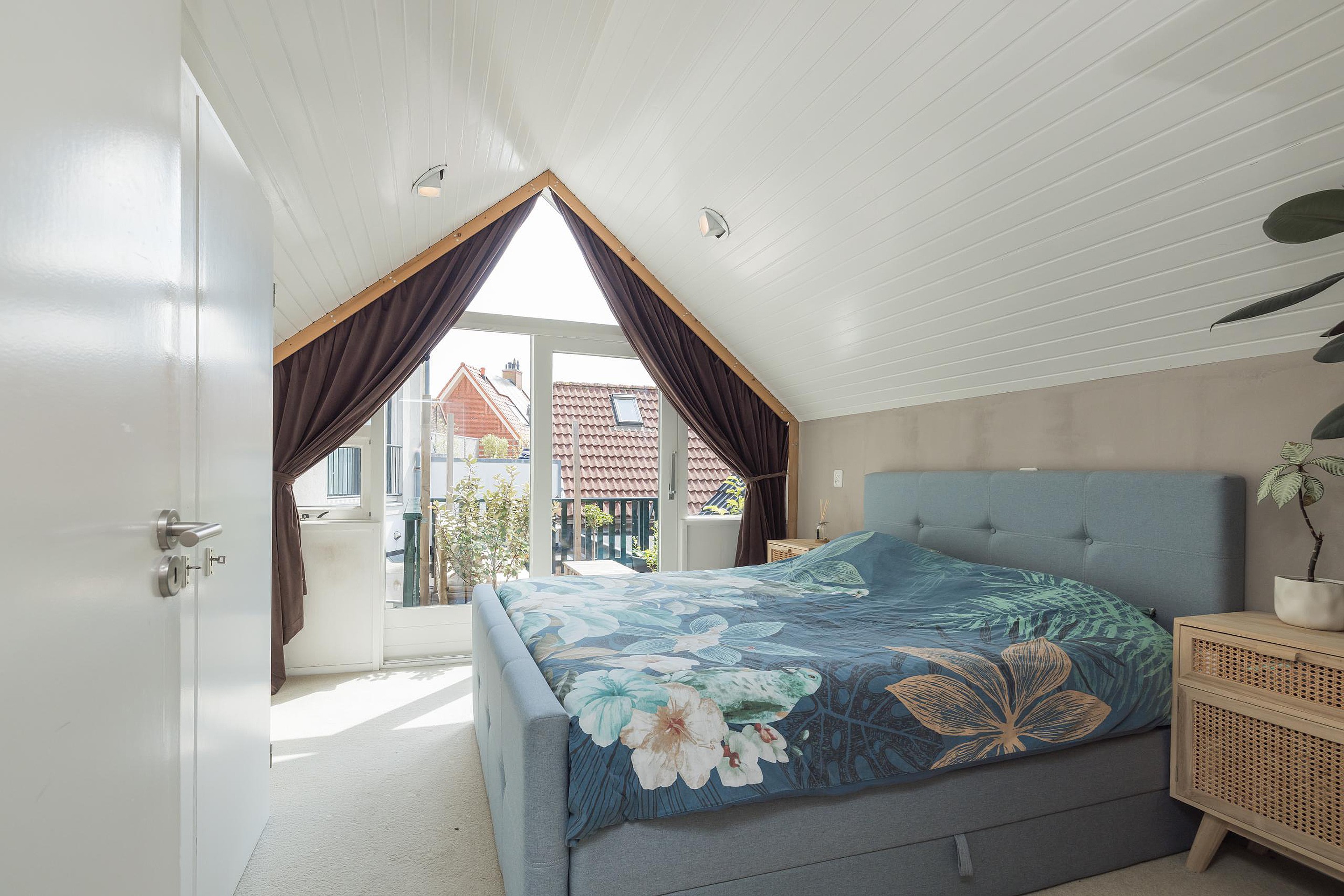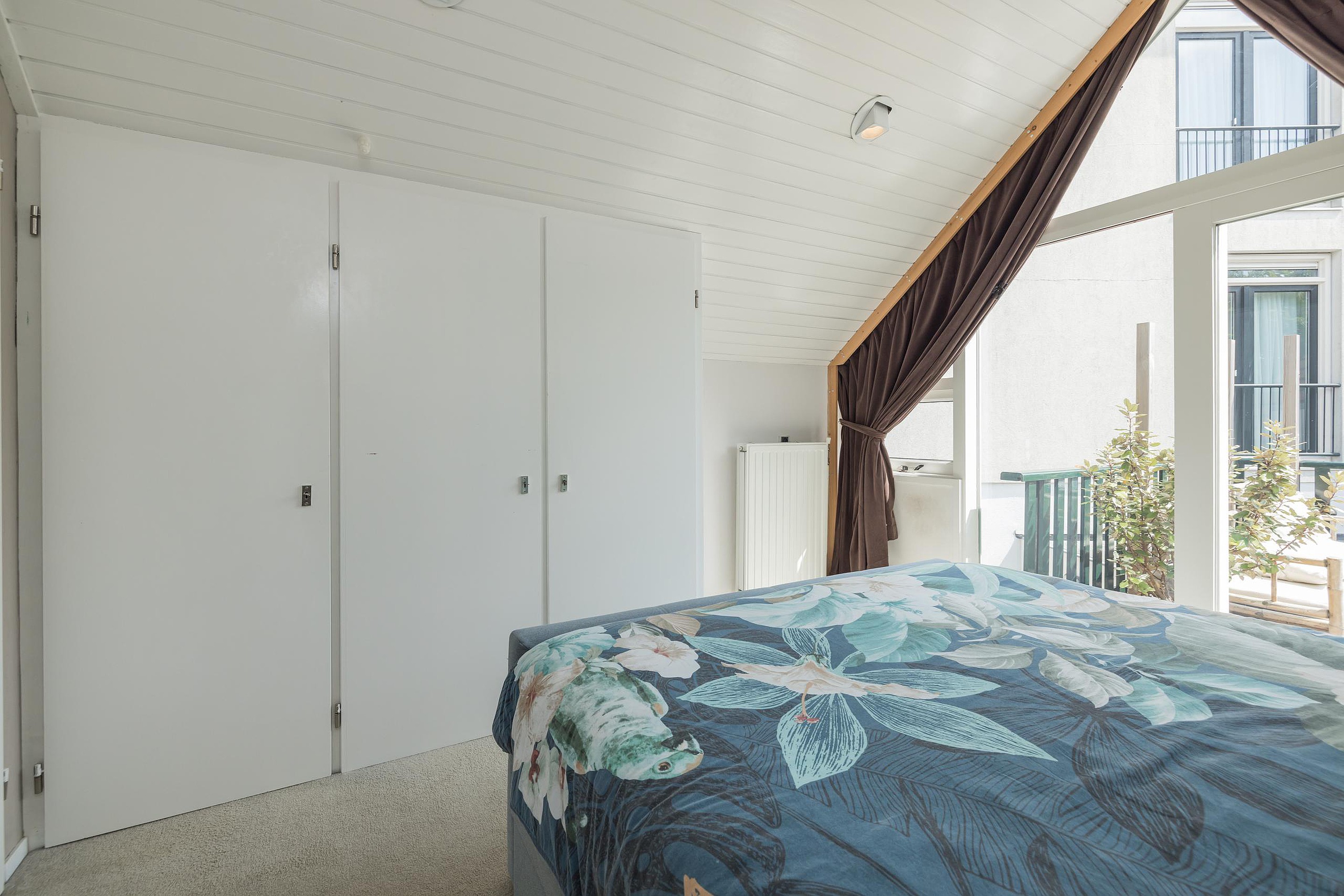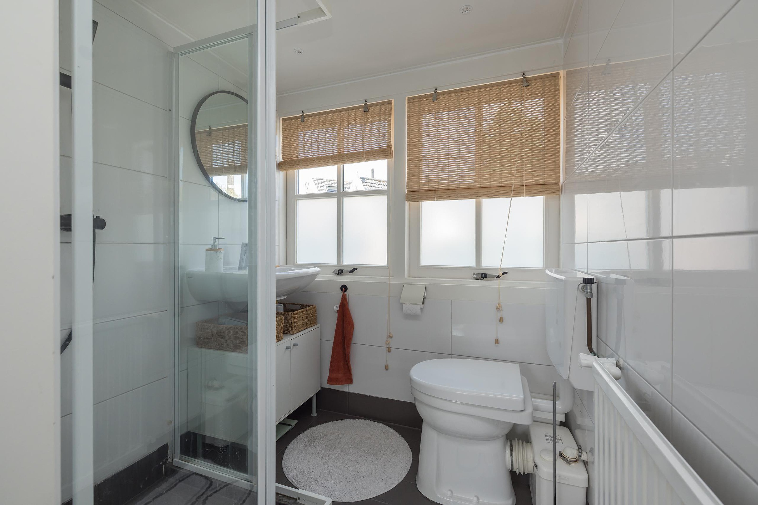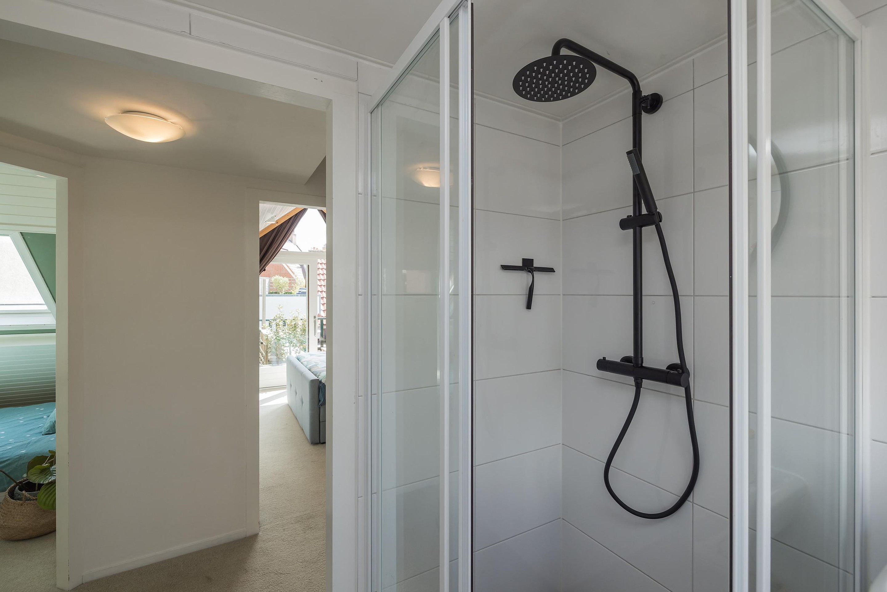 Overloop met een rookmelder en ingebouwde kastruimte. De in lichte kleuren uitgevoerde badkamer is gelegen aan de voorzijde en is voorzien van een douchecabine, een wastafel, verwarming en een staand toilet. Er is nog een ruime berging met de opstelling van de cv-ketel (ATAG 2021). Aan de achterzijde ligt de eerste ruime slaapkamer met een schuifpui naar het prachtige dakterras, hier is het werkelijk heerlijk vertoeven! Ten slotte nog een tweede slaapkamer met een groot dakraam.