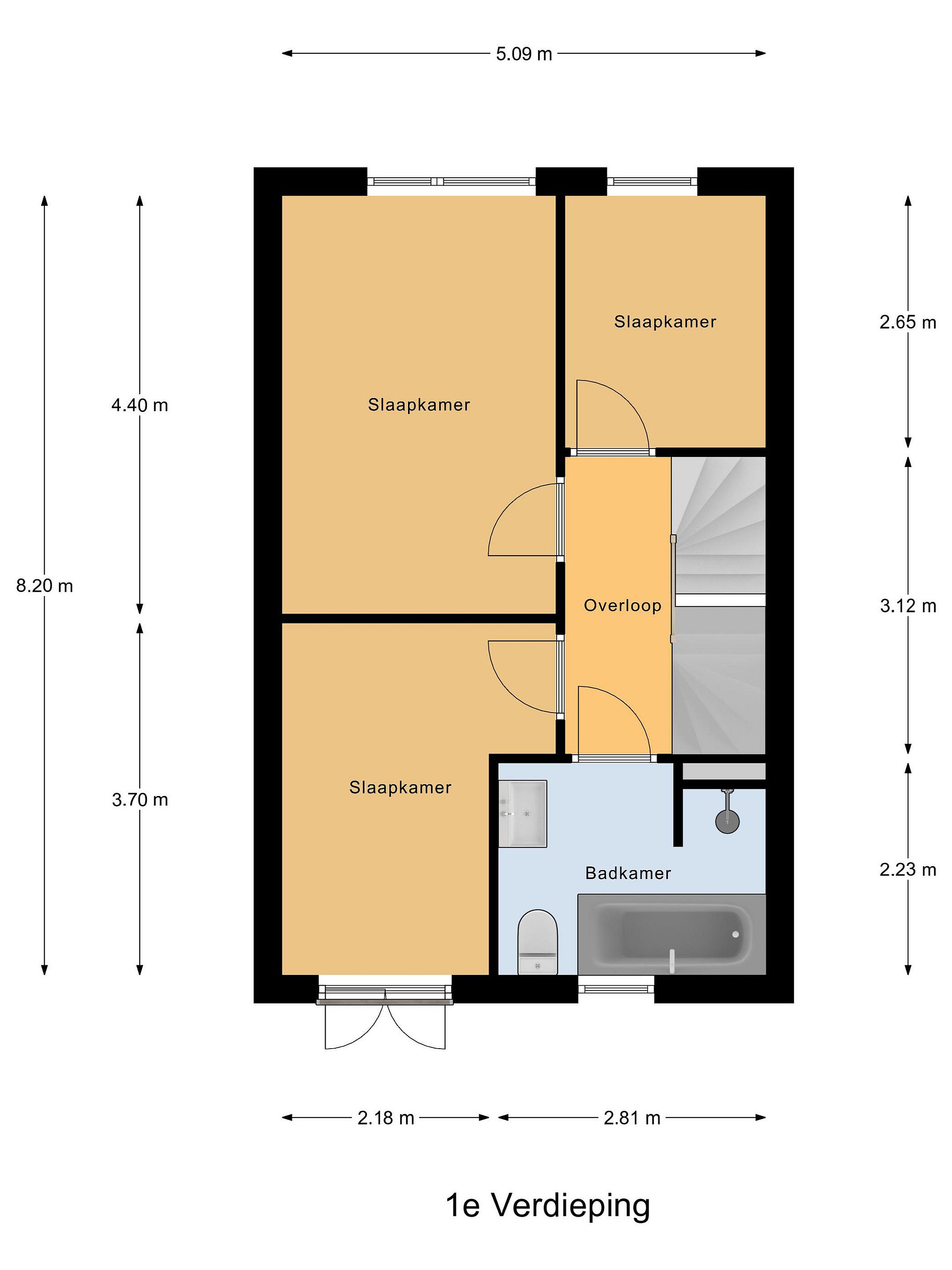 Overloop, badkamer met ligbad, douche, toilet en wastafel. Drie slaapkamers, waarvan één met Frans balkon.