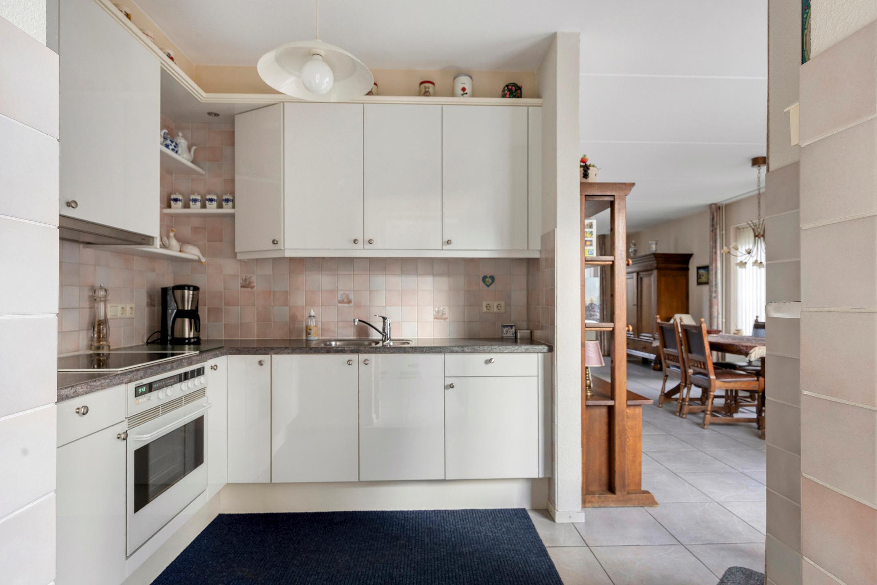 De open keuken is ook weer licht en functioneel ingericht en voorzien van diverse apparatuur waaronder een keramische kookplaat, afzuigkap en koelkast. Aansluitend bevindt zich de bijkeuken met witgoedaansluitingen en toegang tot de inpandige garage. De garage beschikt over een praktische bergzolder en is uitgerust met een elektrische garagedeur.