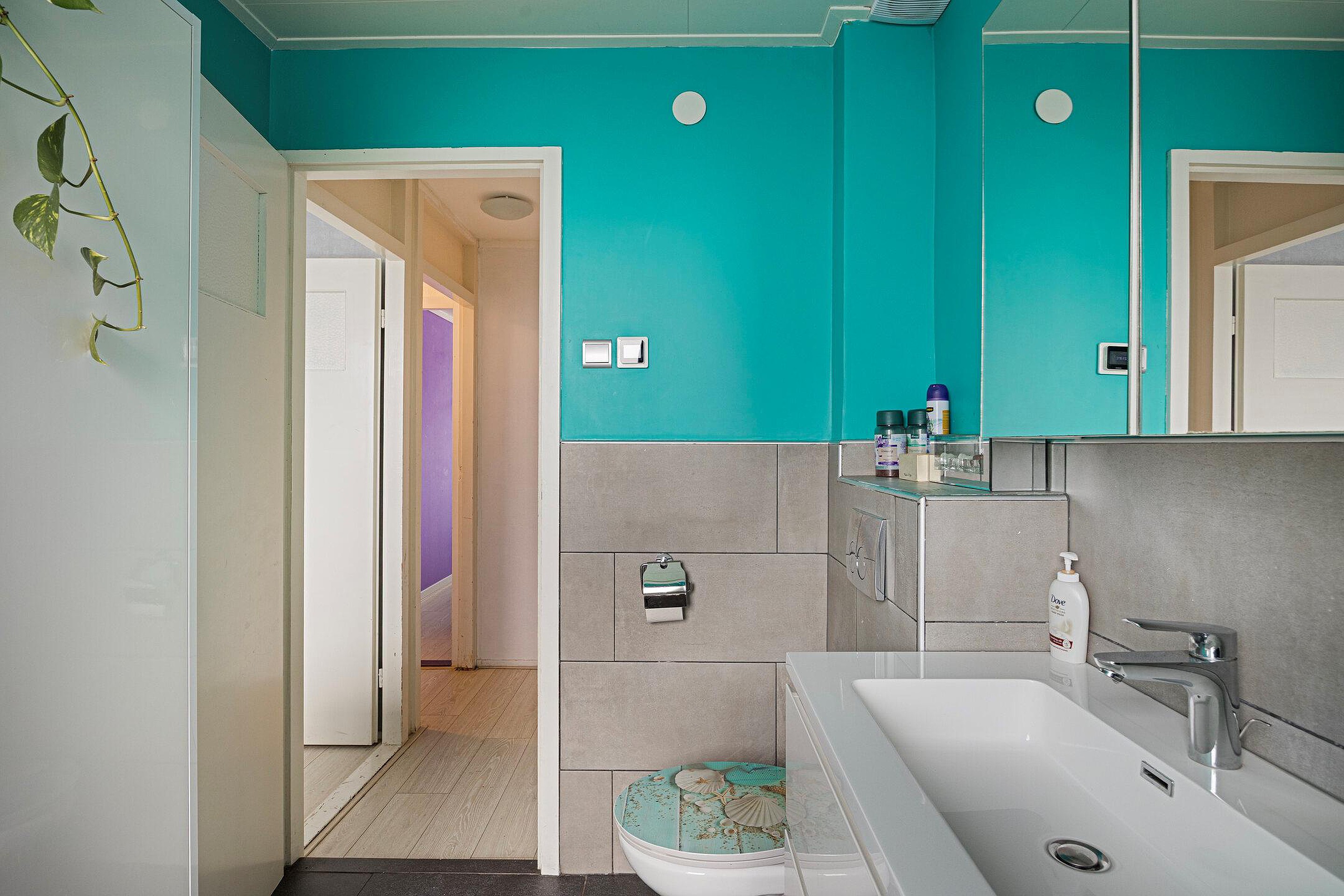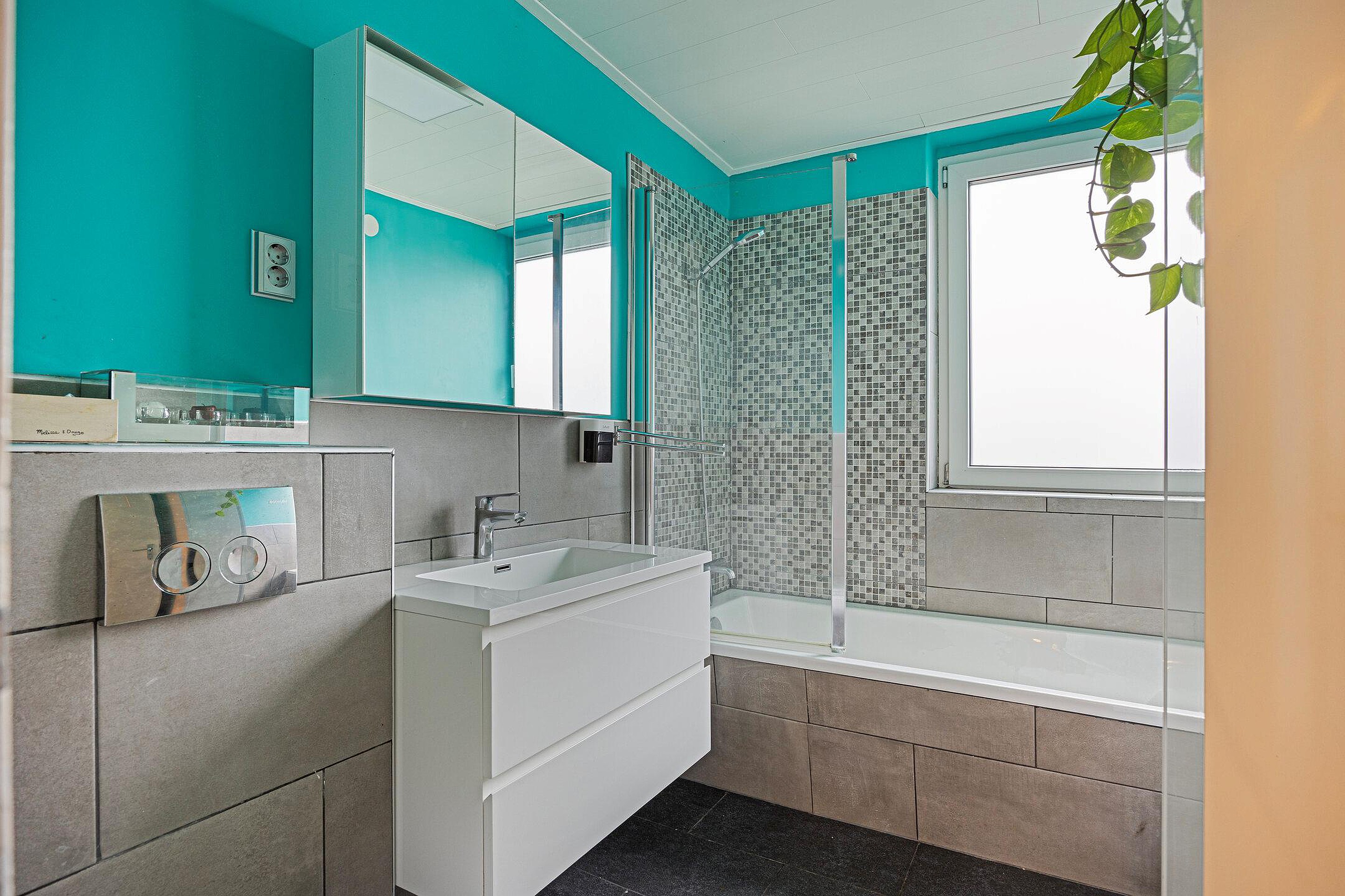 Overloop met trapopgang, 3 slaapkamers en de moderne badkamer voorzien van een toilet, wastafel in meubel en een ligbad met douche.