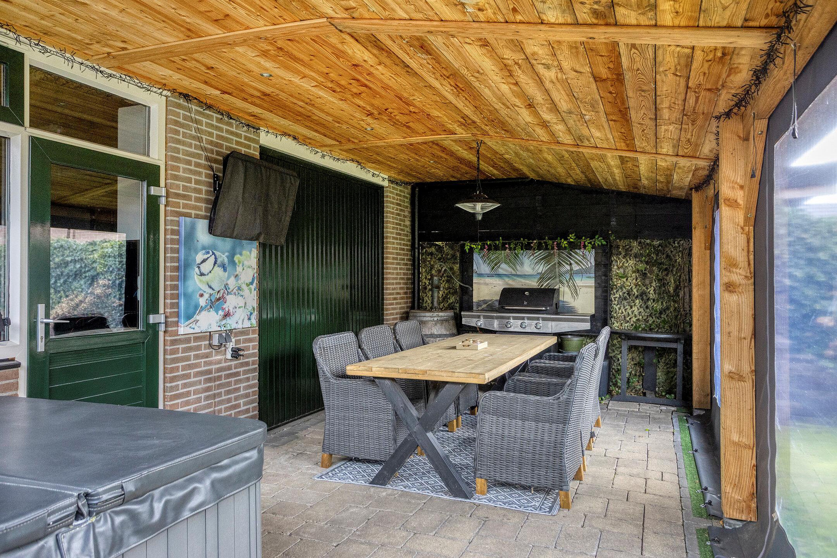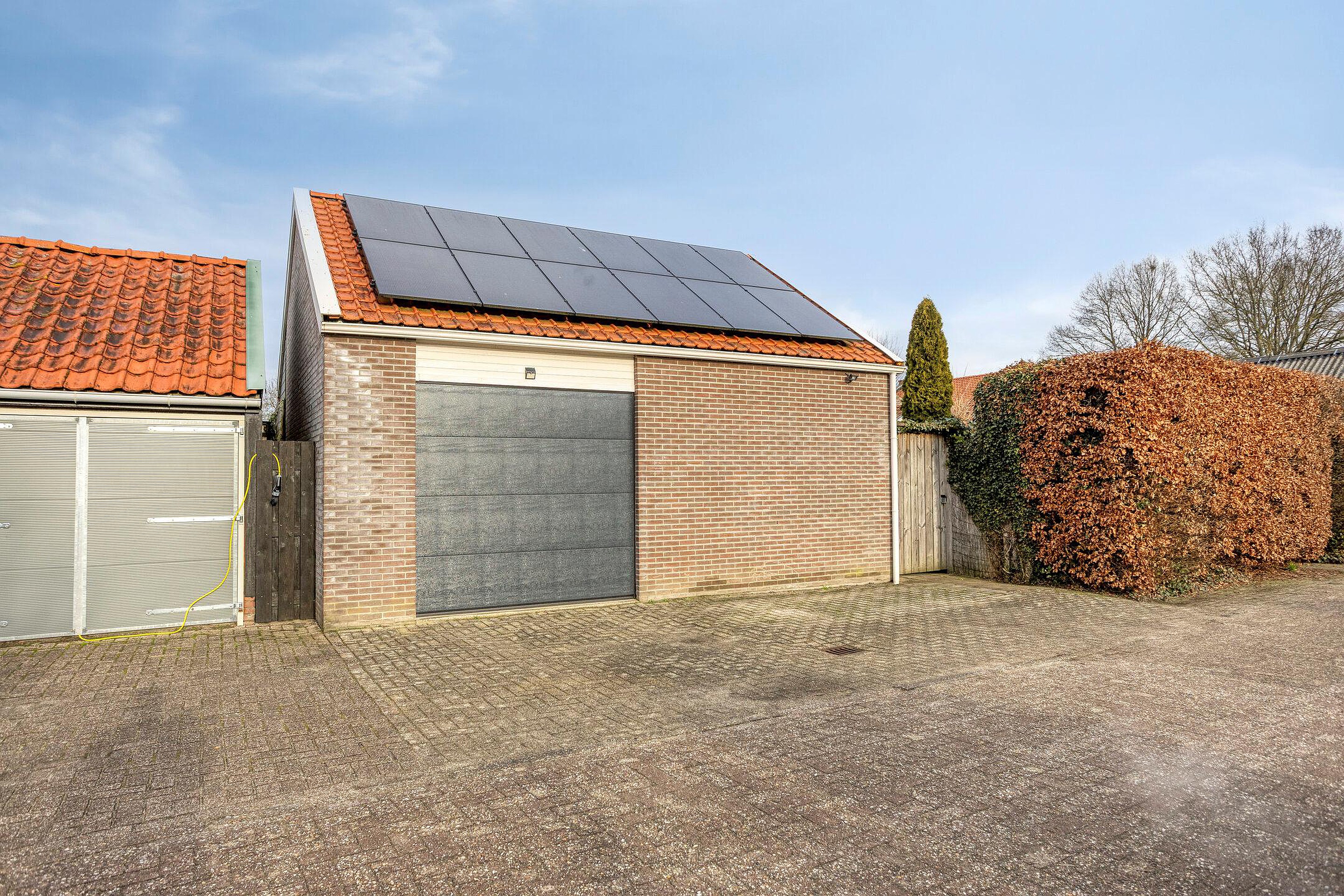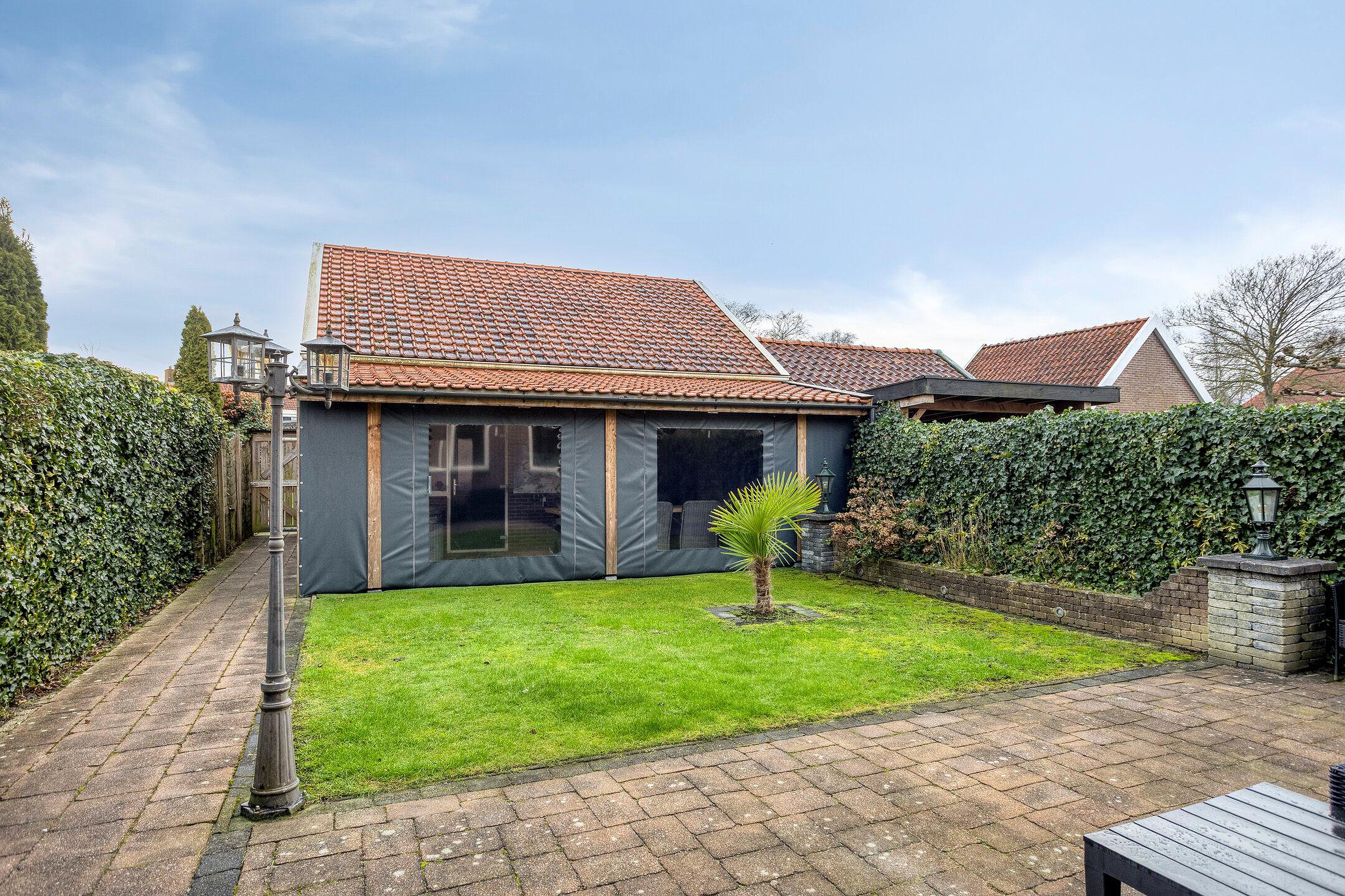 Tuin De achtertuin, gelegen op het zuidoosten, is o.a. voorzien van een terras, een overdekt terras, een achterom en een vrijstaande garage met zolder.