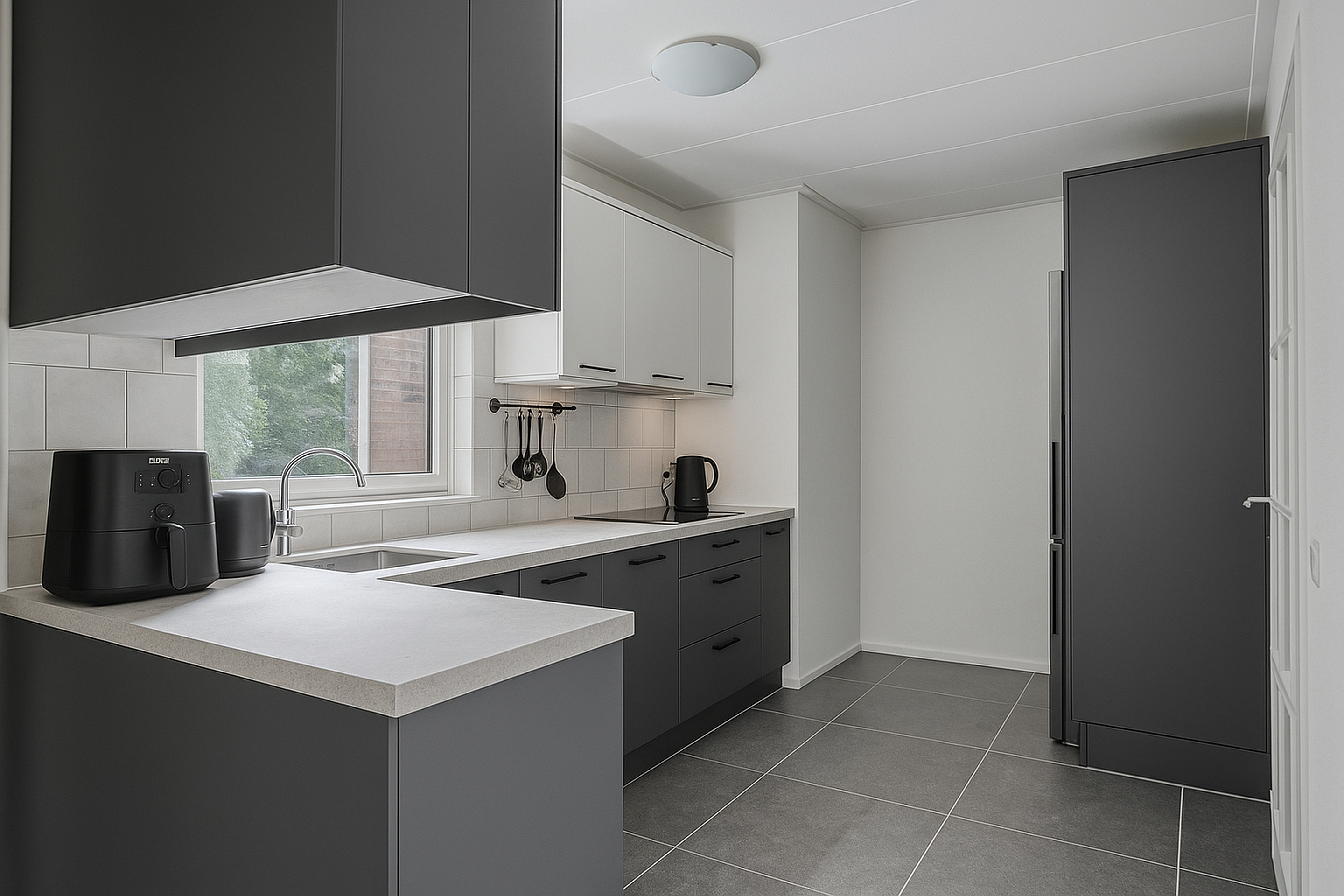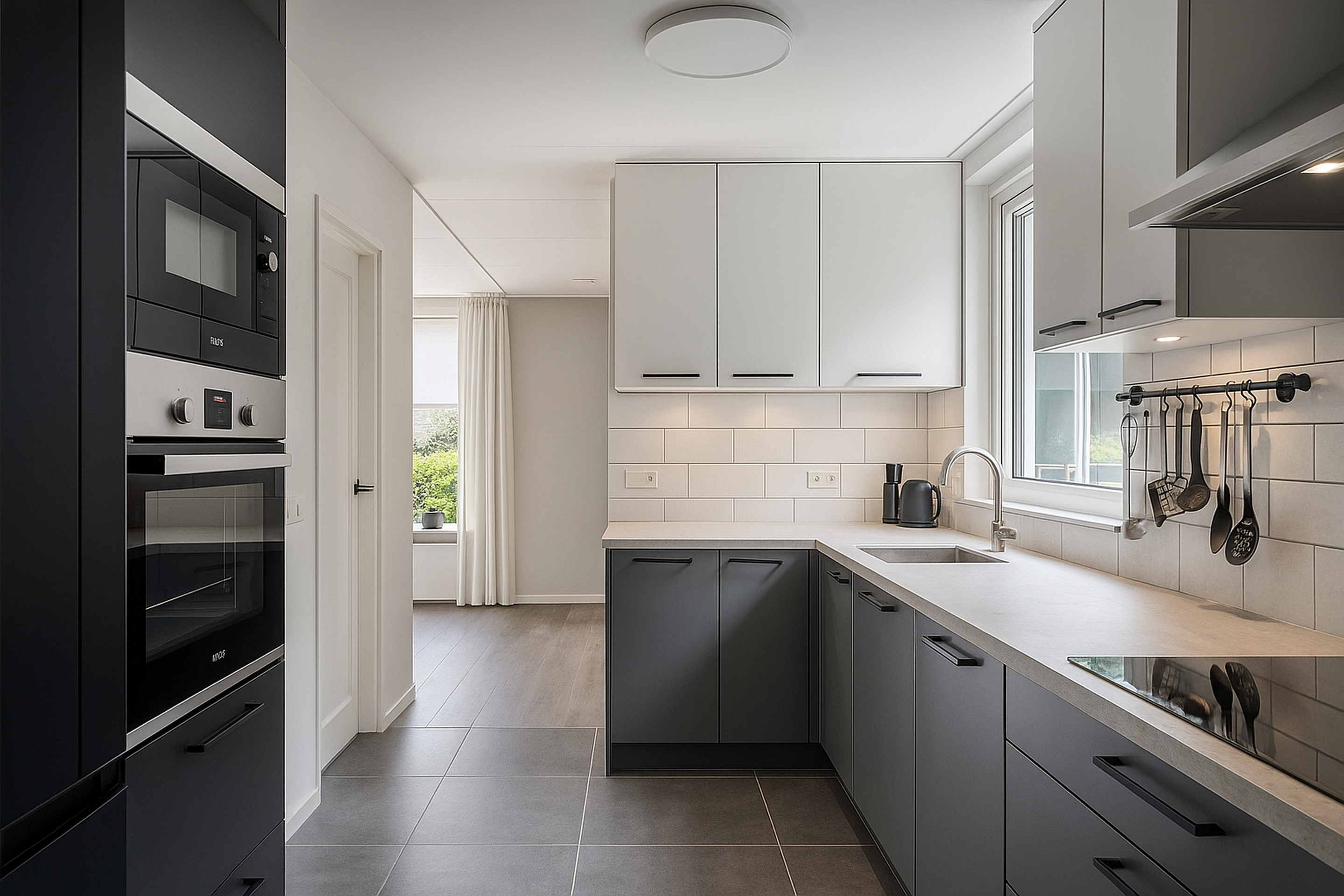 De keuken is praktisch en compleet ingericht met diverse inbouwapparatuur, waaronder een inductiekookplaat, oven, magnetron, vaatwasser en close-in boiler. Vanuit de keuken bereikt u de kelder en de bijkeuken. Hier vindt u de koelkast, een extra wasbak, ruimte voor de was-droogopstelling en toegang tot zowel de tuin als de inpandige garage.