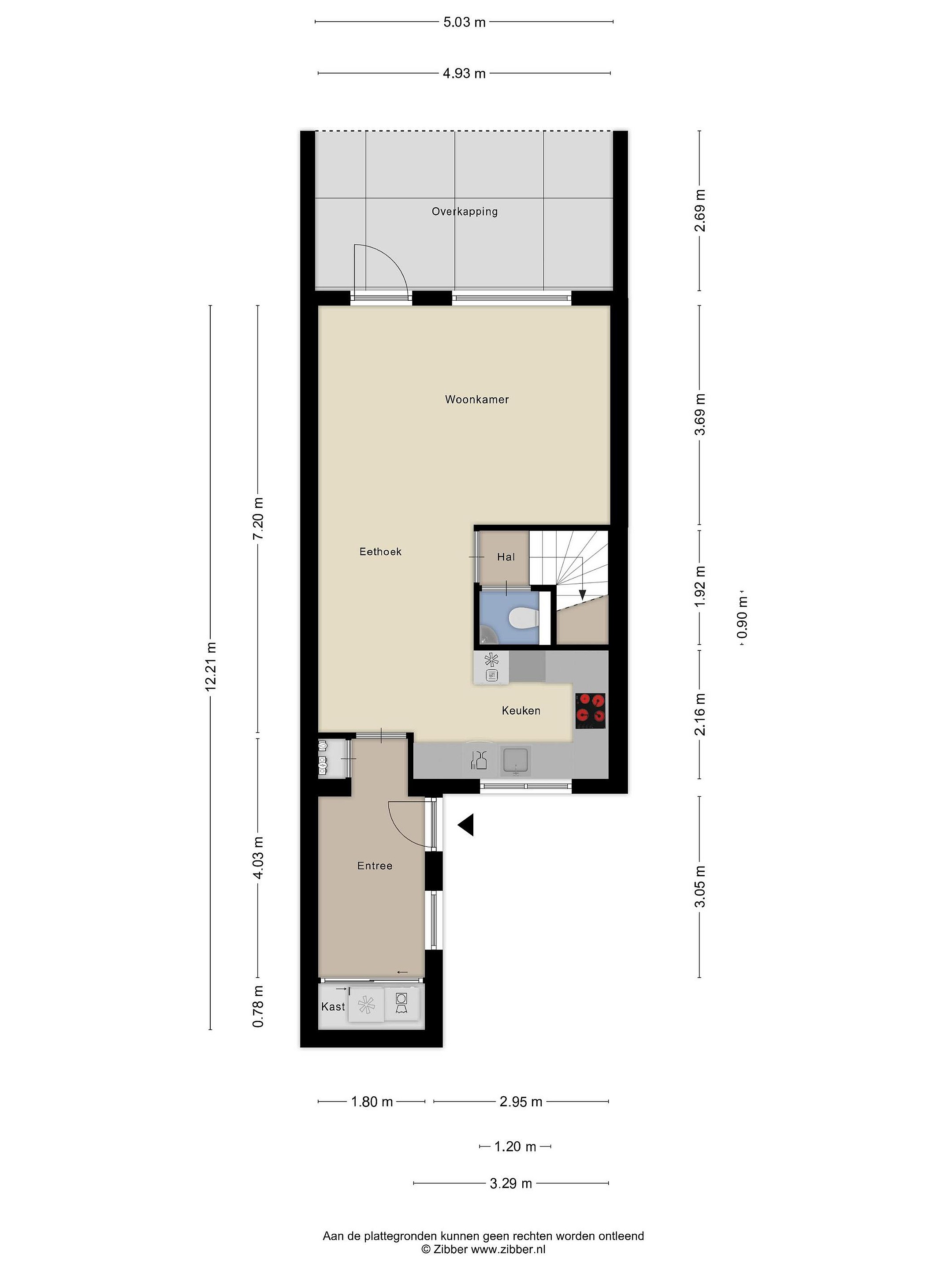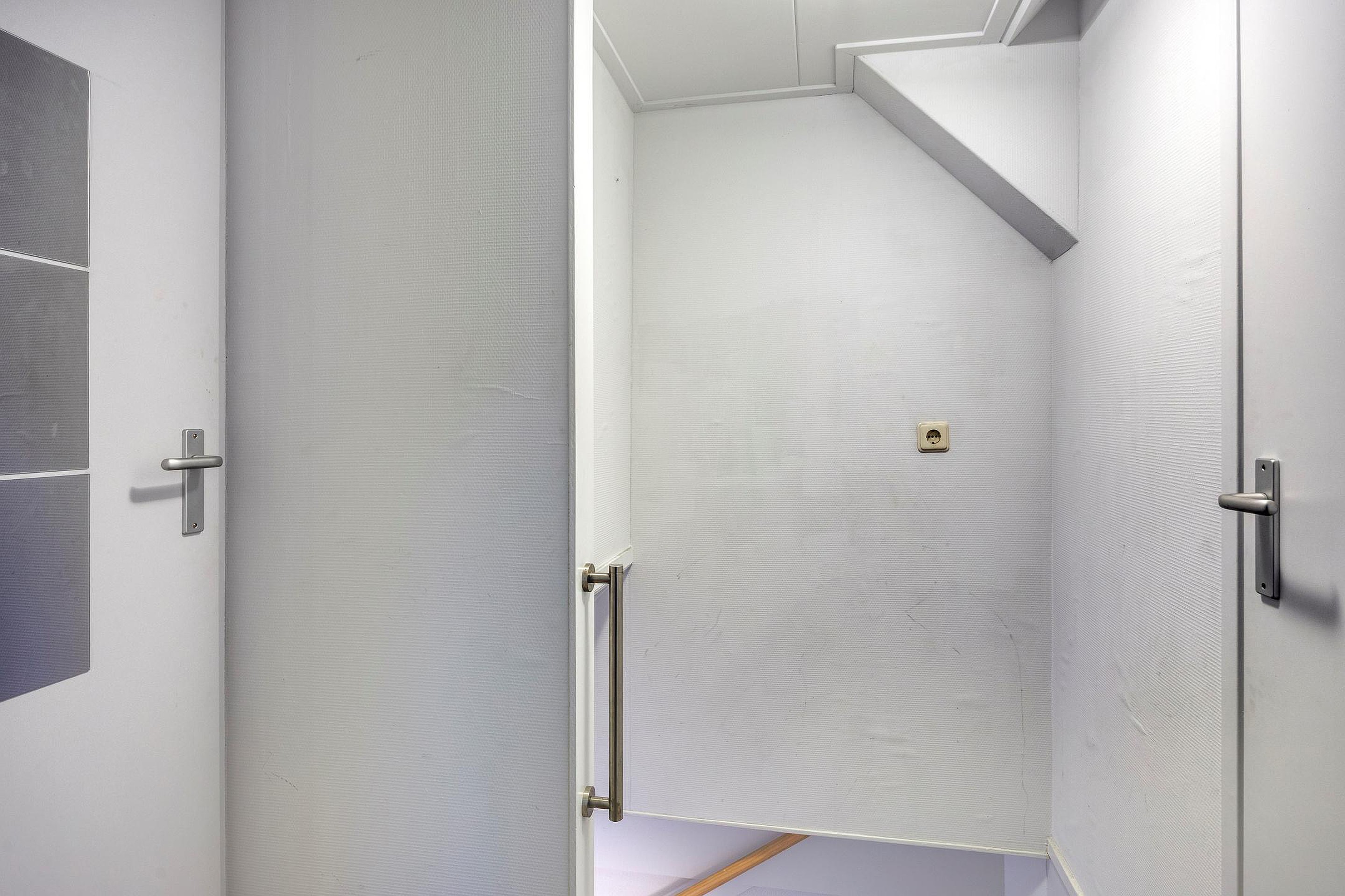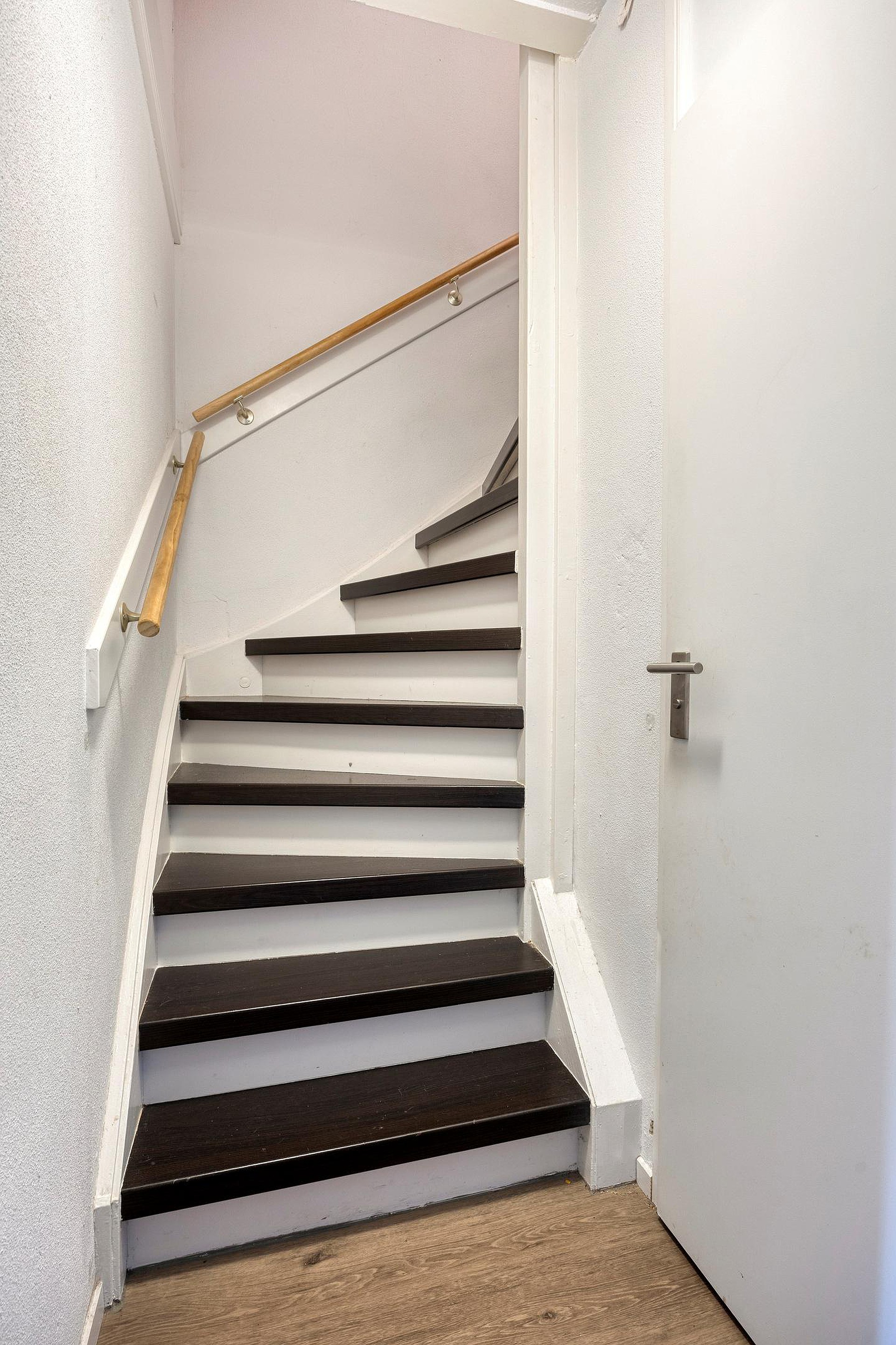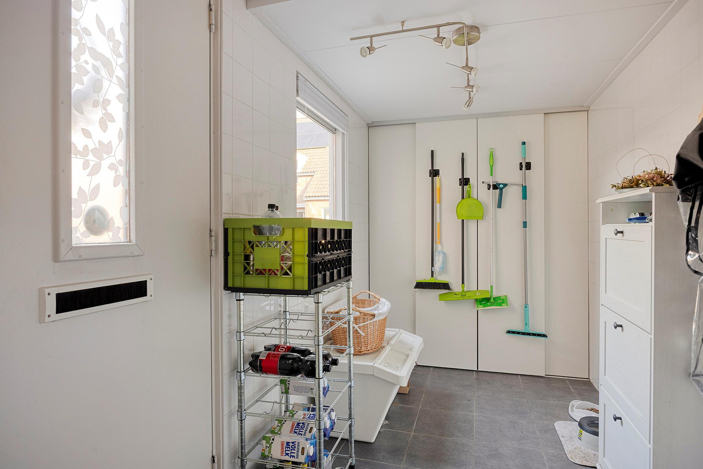 Entree/ruime hal met meterkast. De woonkamer beschikt over een deur naar het overdekte terras en de keukenopstelling met diverse inbouwapparatuur, o.a. een inductiekookplaat, afzuigkap, oven, vaatwasser, koelkast en een vrieskast. De tussenhal, bereikbaar via de woonkamer, is voorzien van het toilet en de trapopgang.