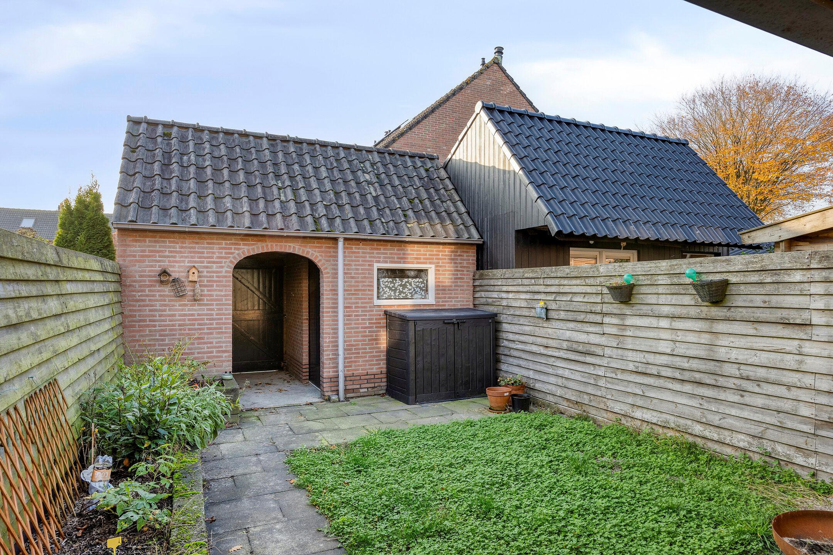 De achtertuin, gelegen op het zuidwesten, beschikt over een overdekt terras en een stenen berging met een achterom. In de voortuin is er parkeergelegenheid.