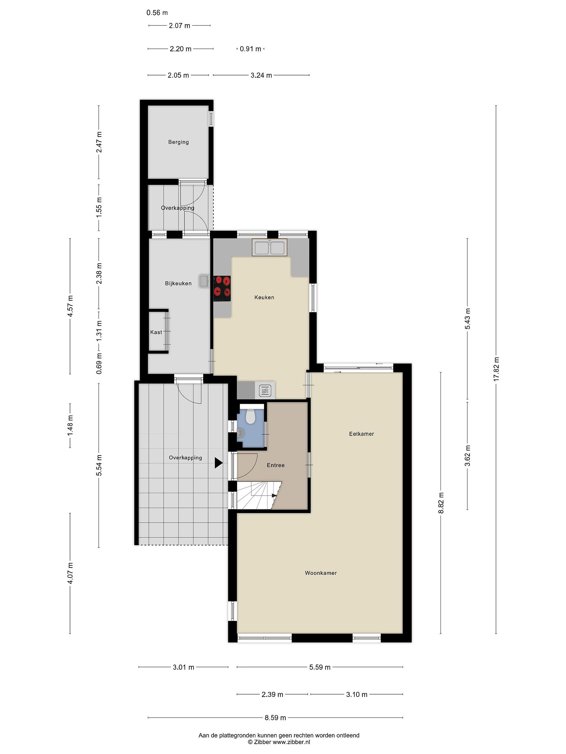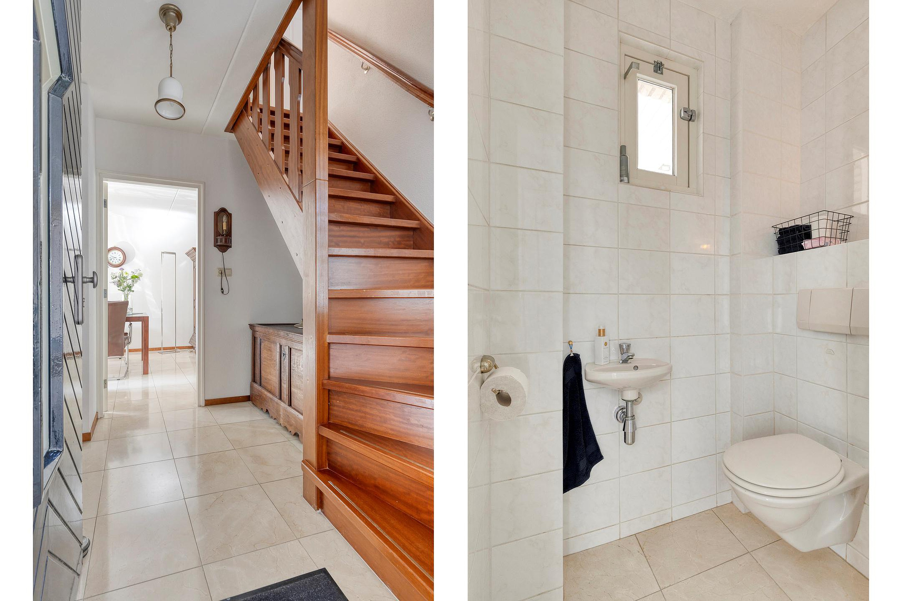 Entree/hal; meterkast; vrijdragend toilet; trapopgang naar de eerste verdieping; toegang tot de eetkamer welke naadloos overloopt in de woonkamer. De gehele begane grond is voorzien van een gave plavuizen vloer wat een warme uitstraling geeft. De moderne leefkeuken is aan de achterzijde gesitueerd, is functioneel ingericht mede door de diverse inbouwapparatuur en biedt voldoende werkruimte. Aangrenzend aan de keuken bevindt zich de praktische bijkeuken, voorzien van een vaste kast voor extra opbergruimte.
