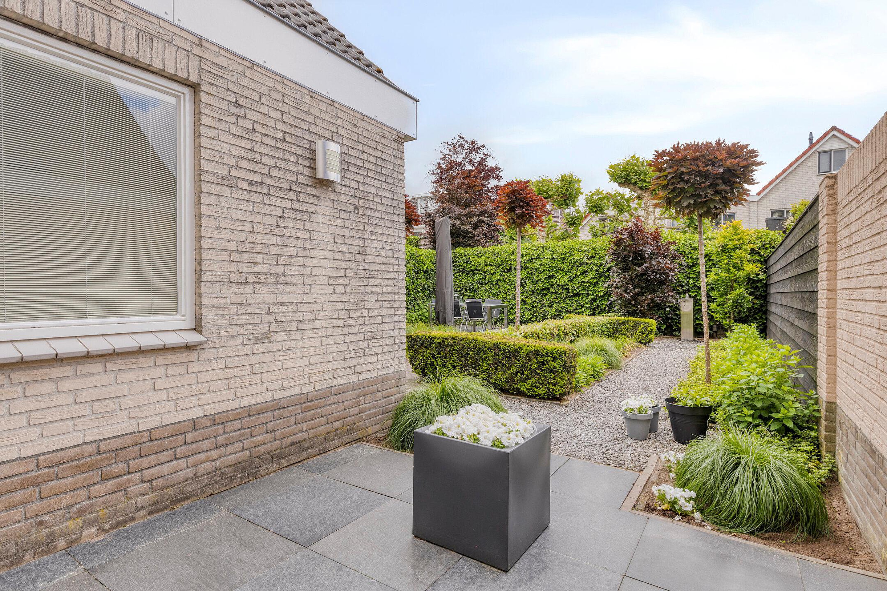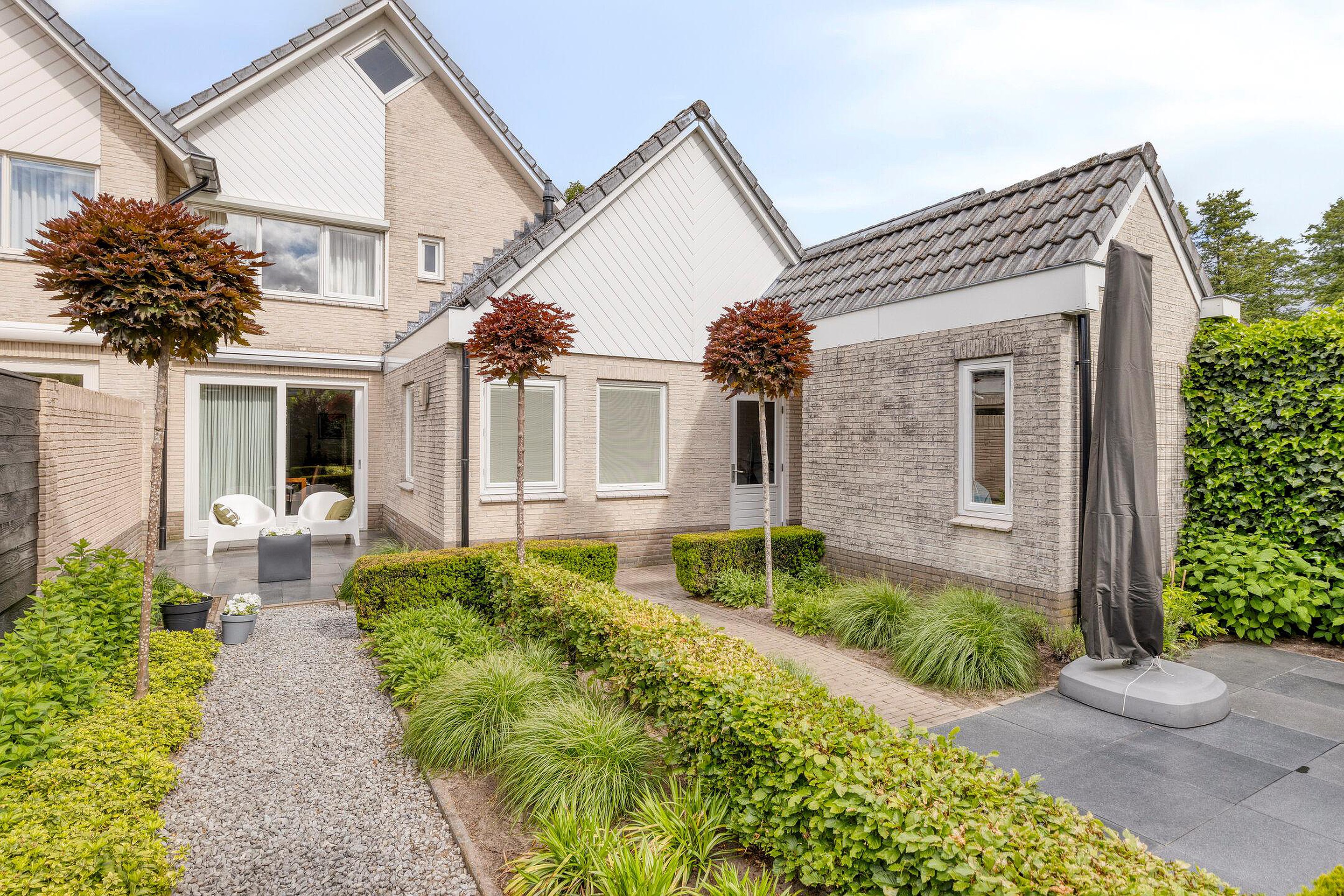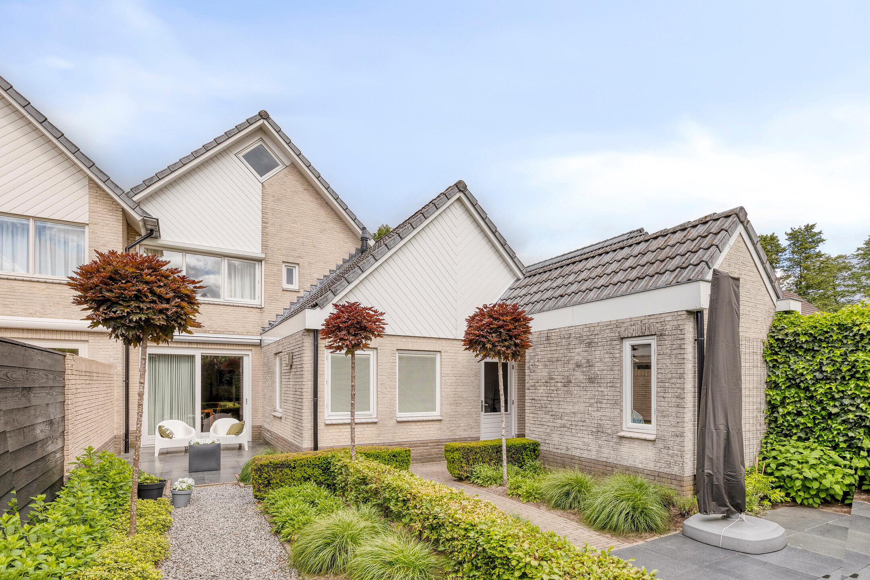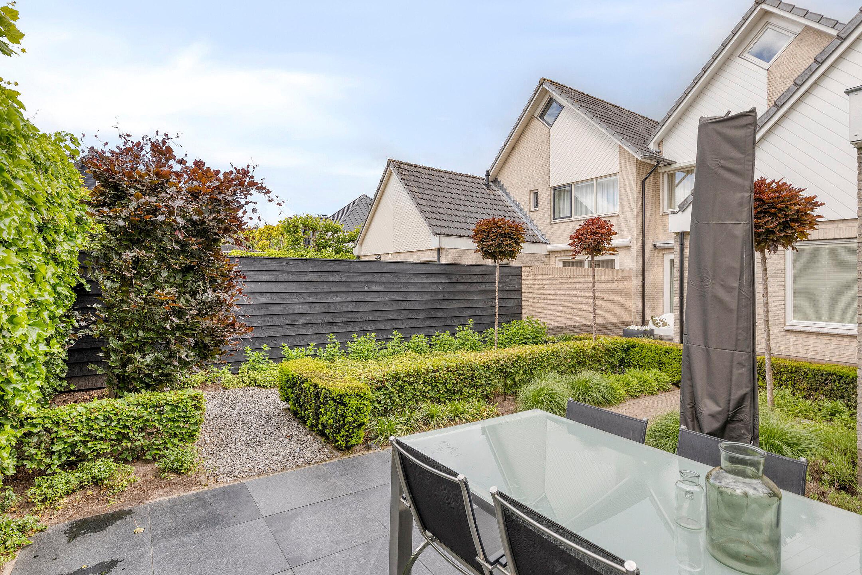 De fraaie en goed onderhouden achtertuin is gesitueerd op het zuidoosten, beschikt over twee verharde terrassen en voldoende privacy mede door het vele groen. De handige berging is ideaal voor het stallen van tuingereedschappen en diversen. Daarnaast beschikt de woning over een eigen oprit mét carport welk plek biedt voor twee auto's.