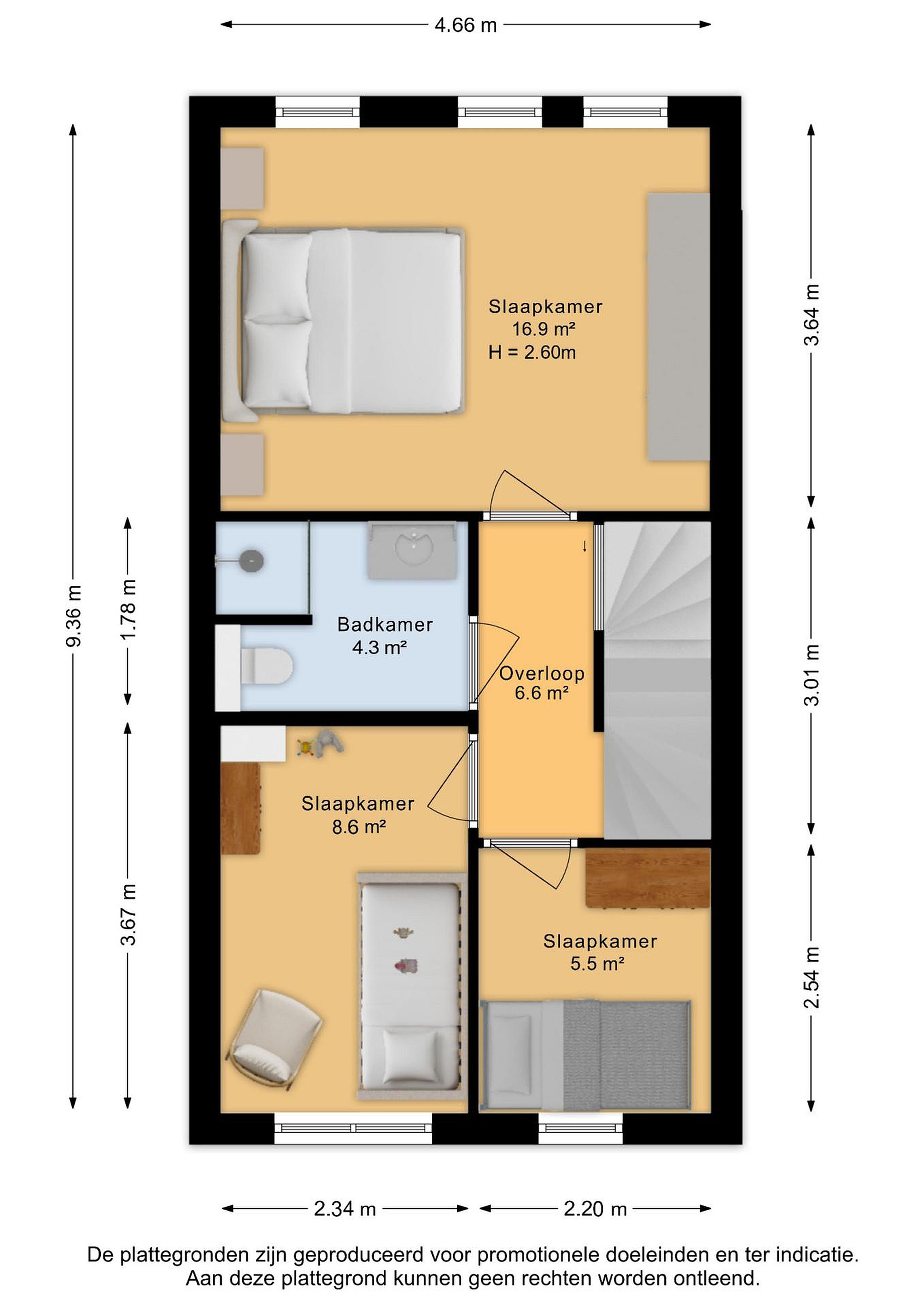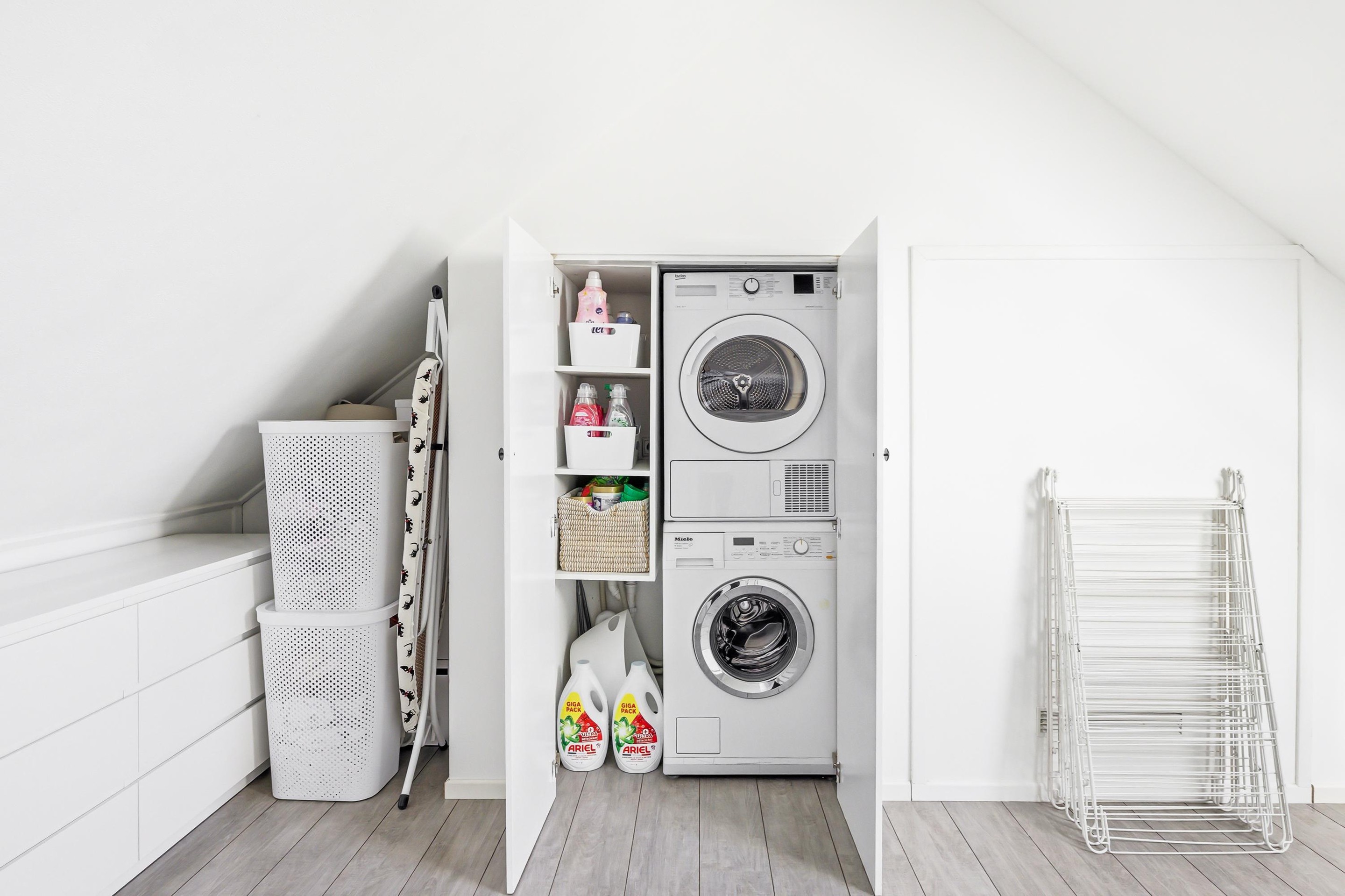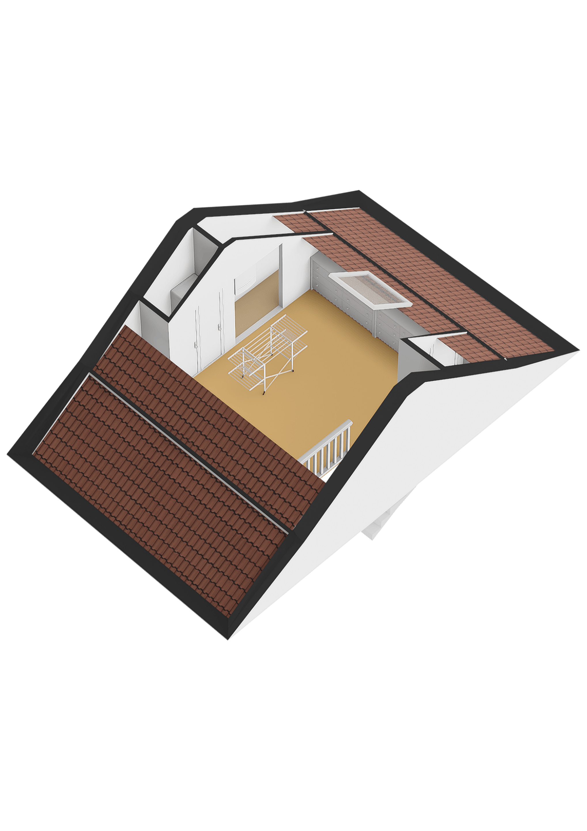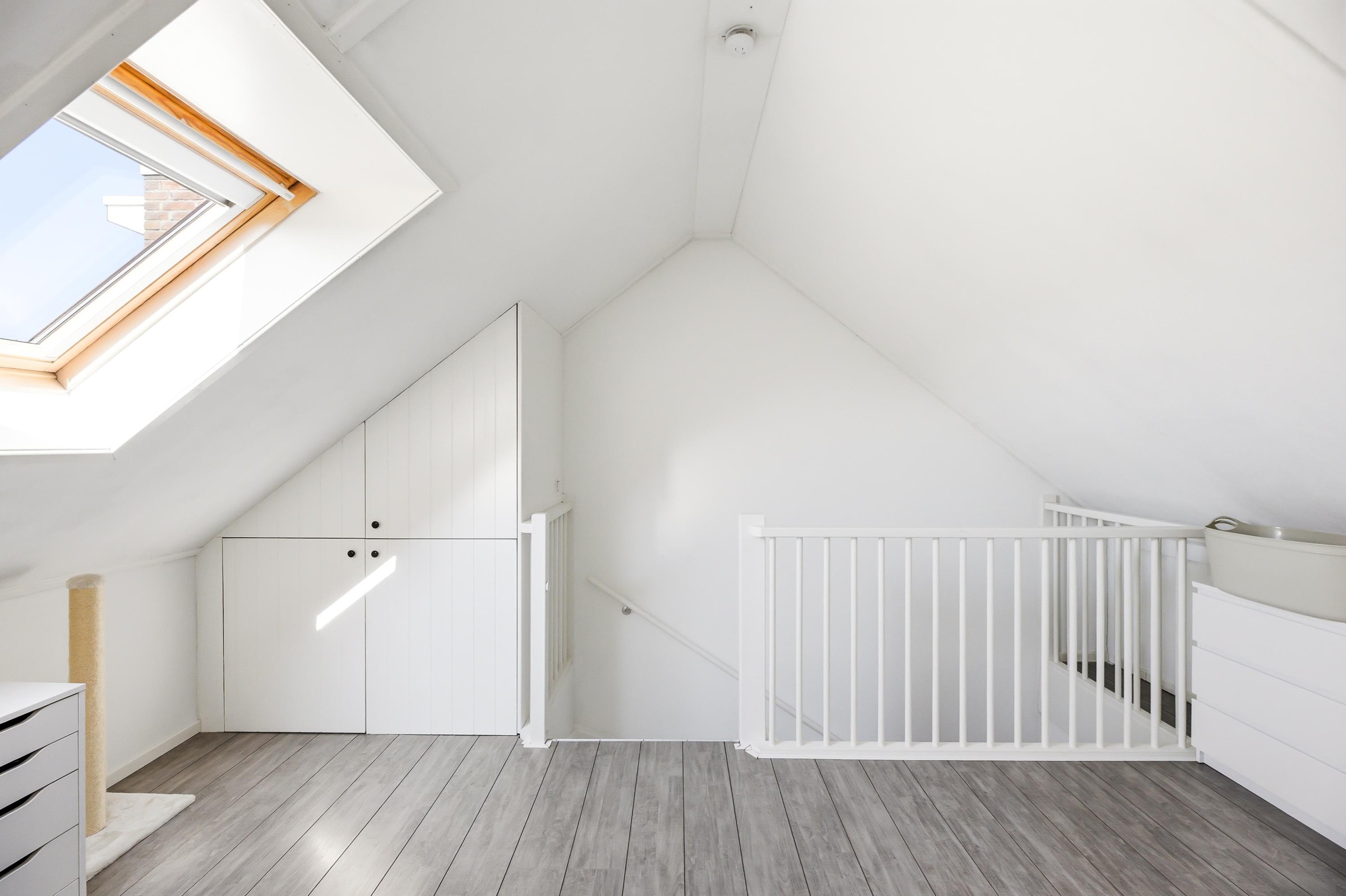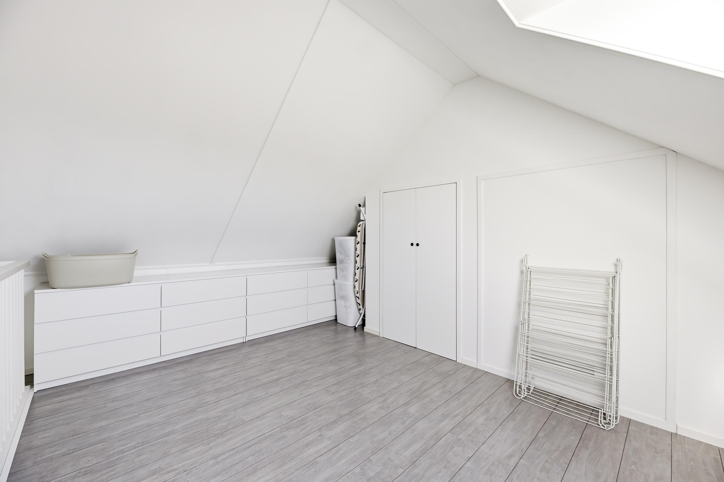 open zolder (ca.16 m2) welke met aanpassingen als slaapkamer kan fungeren. Hier bevinden zich twee vaste kasten met opstelling c.v.-combiketel, wasmachine- en drogeraansluiting, opstelling vloerverwarmingselement en opstelling mechanische ventilatie-unit.