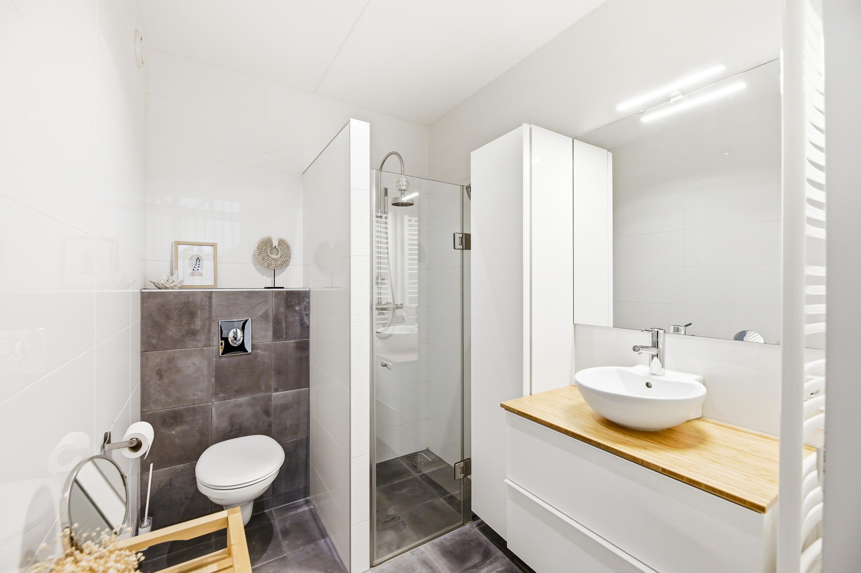 overloop met moderne schuifdeur (soft close) welke er voor zorgdraagt dat er zo weinig mogelijk warmteverlies is. Er zijn op deze verdieping 3 slaapkamers aanwezig van ca. 6 m2, ca. 9 m2 en ca. 17 m2. De grote slaapkamer is voorzien van een op maat gemaakte kast welke ter overname wordt aangeboden. De moderne badkamer is uitgevoerd met toilet, inloopdouche en een badmeubel met wastafel.