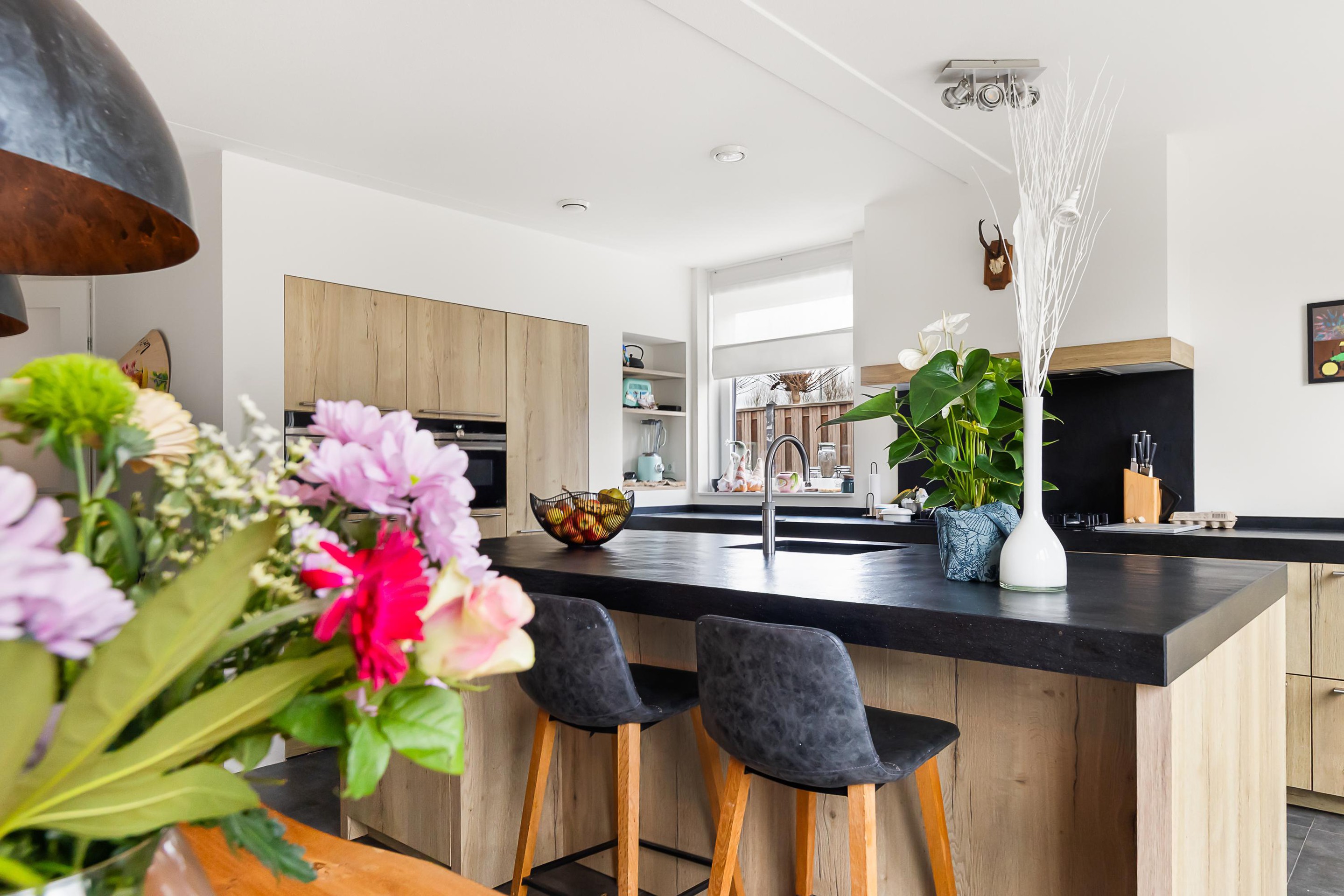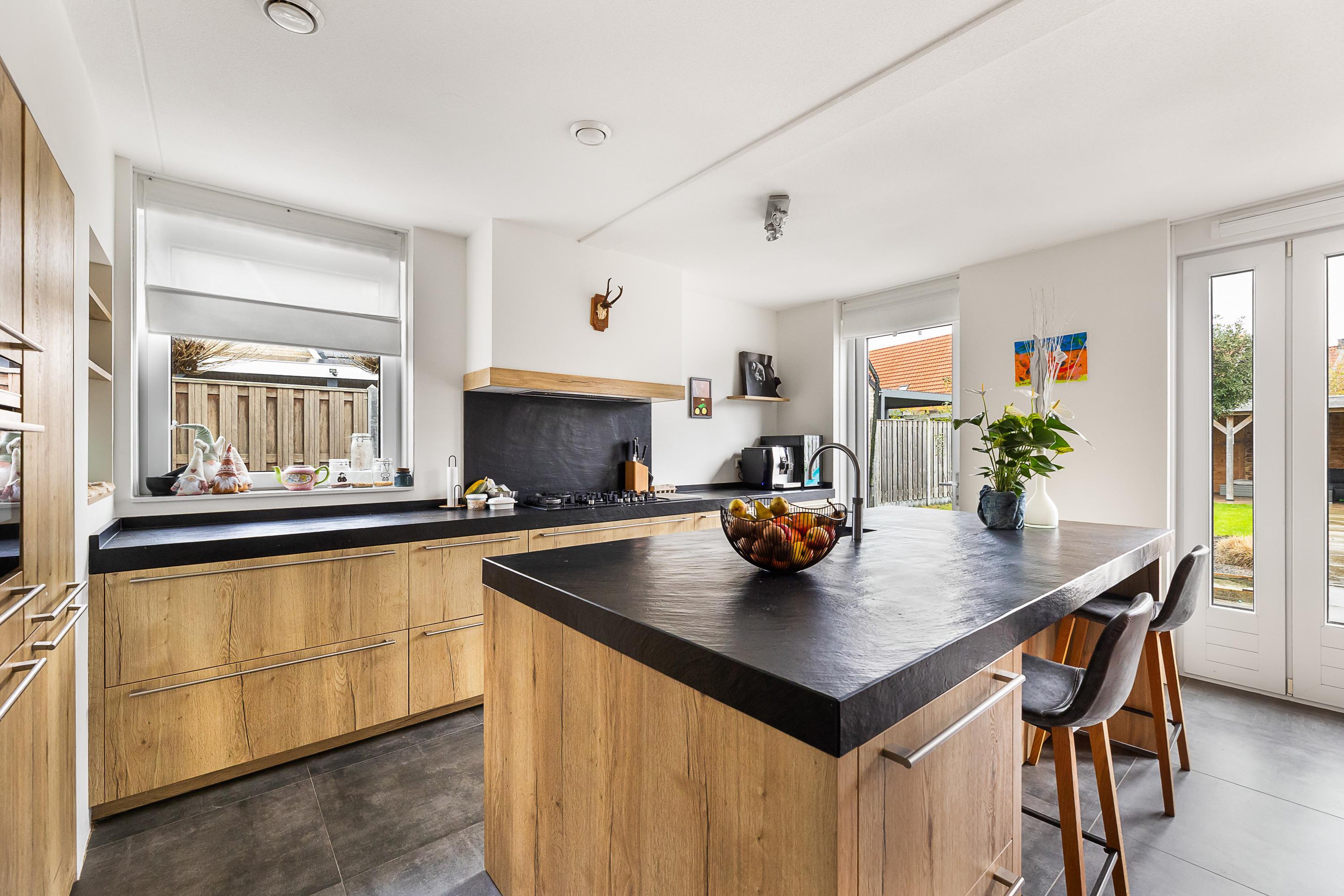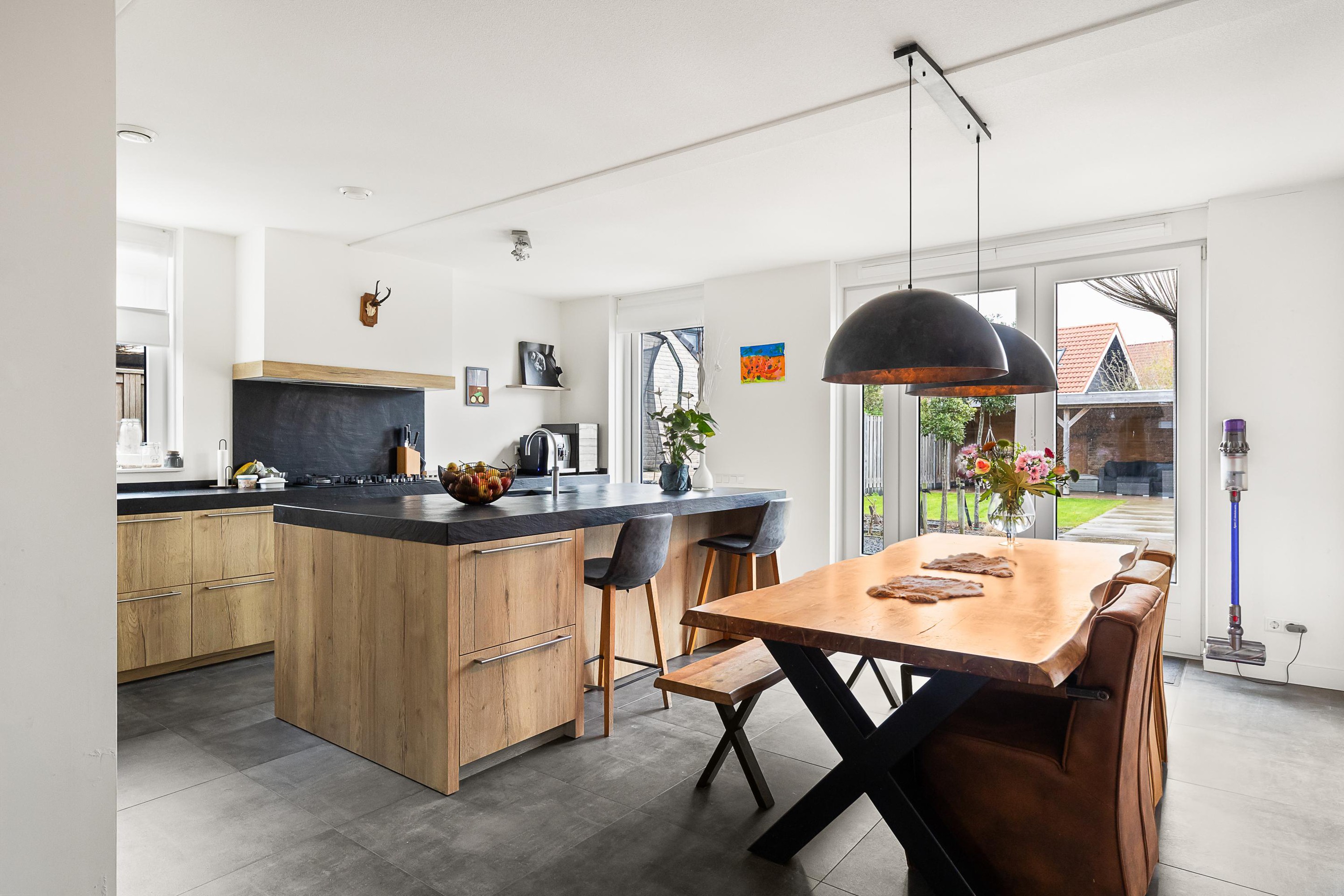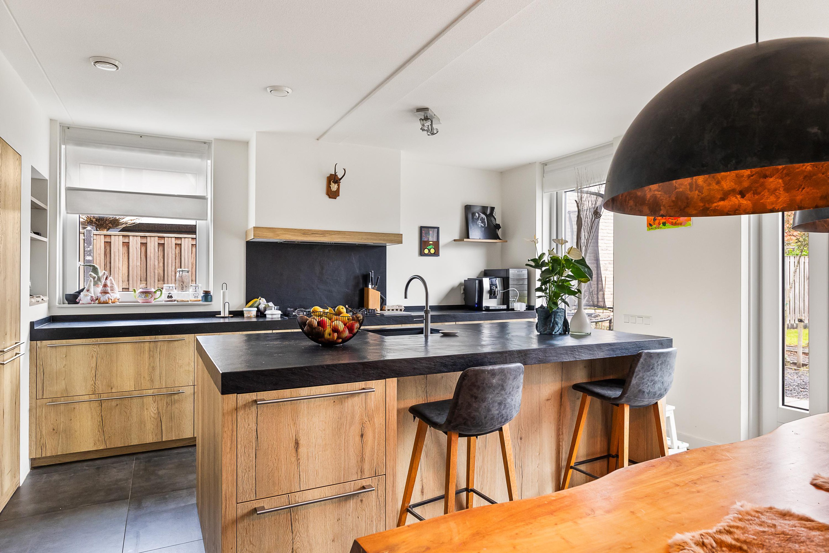 De luxe open keuken is een echte eyecatcher en compleet uitgerust met onder andere een gaskookplaat met wokbrander, combi-stoomoven, magnetron, koelkast, vaatwasser en Quooker. Het spoeleiland met barfunctie maakt deze keuken dé plek om samen te koken en te genieten. De gehele begane grond is afgewerkt met een praktische en stijlvolle tegelvloer.